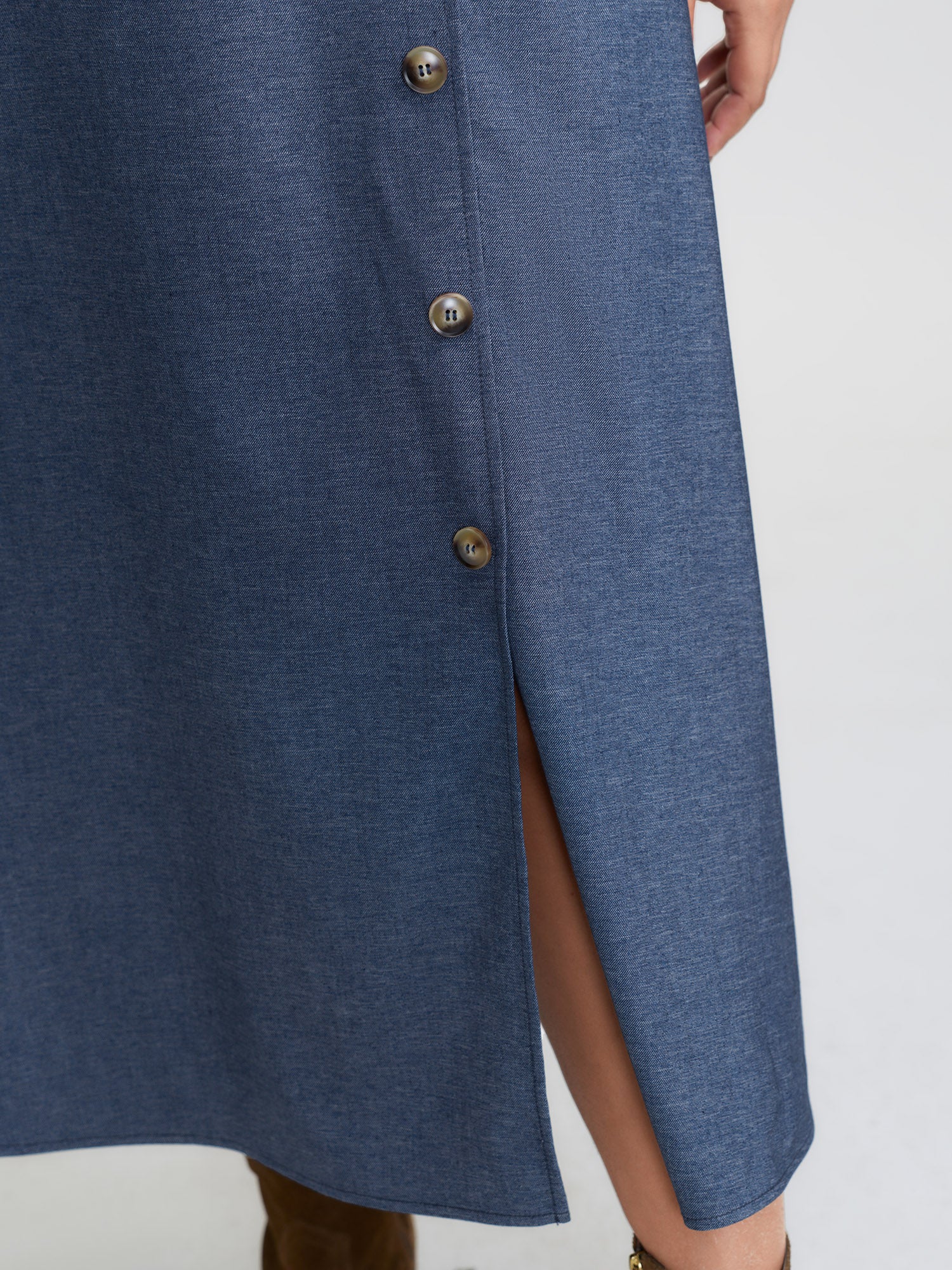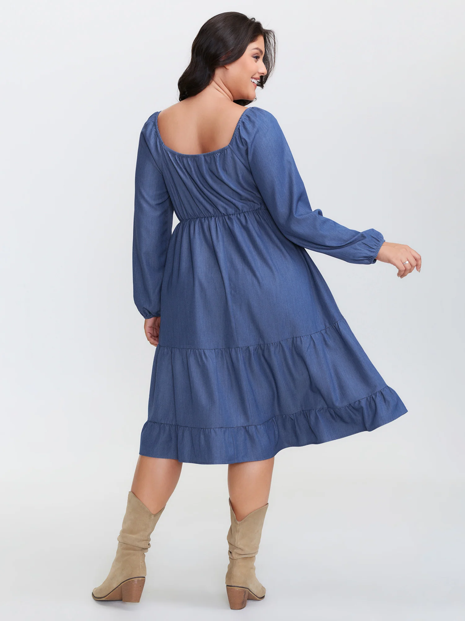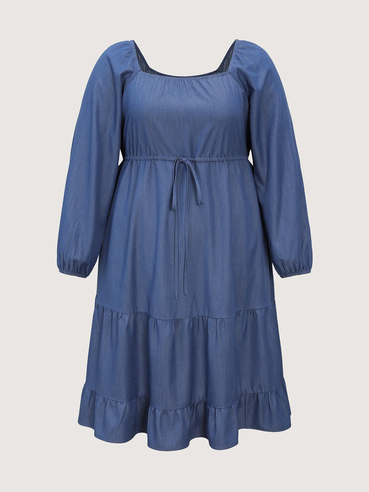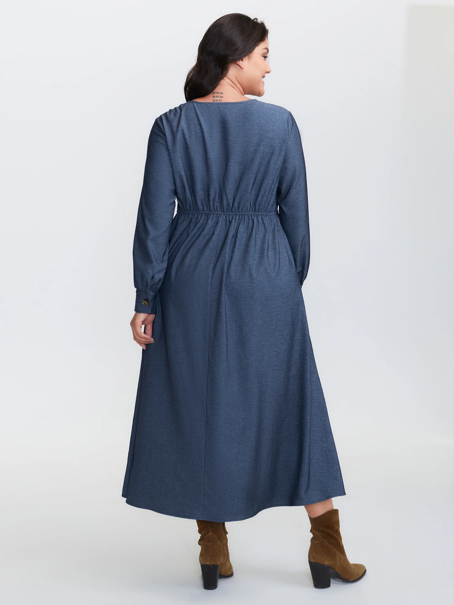 Denim-Like Cinched-Waist Pockets Midi Dress