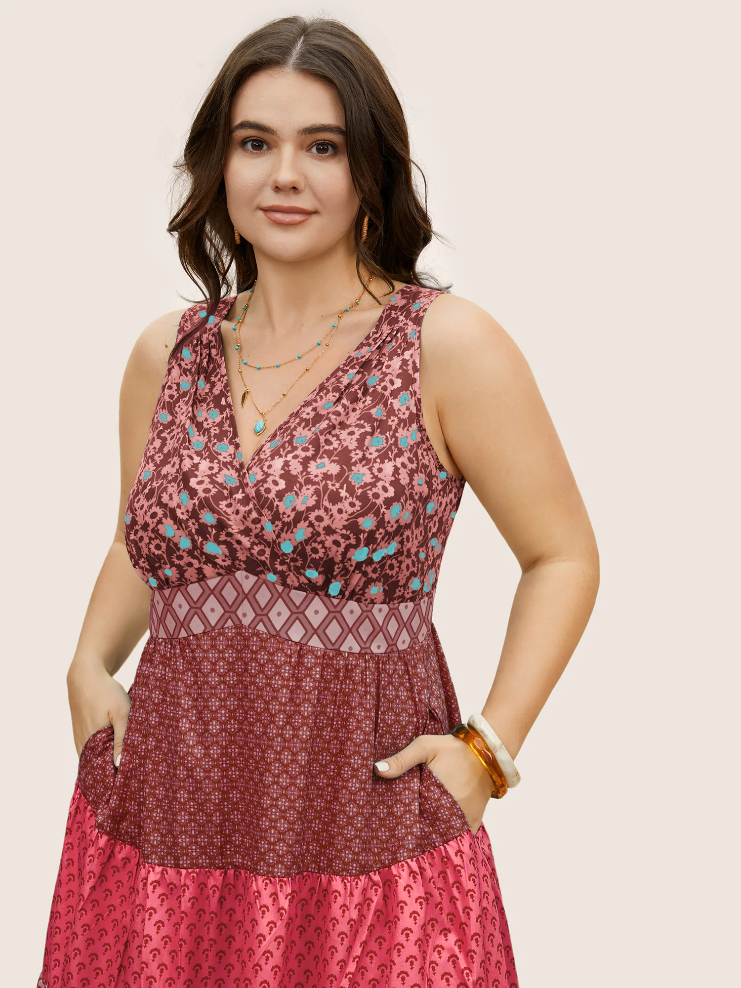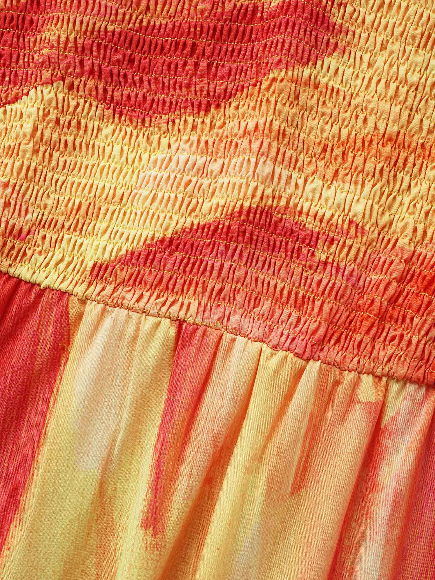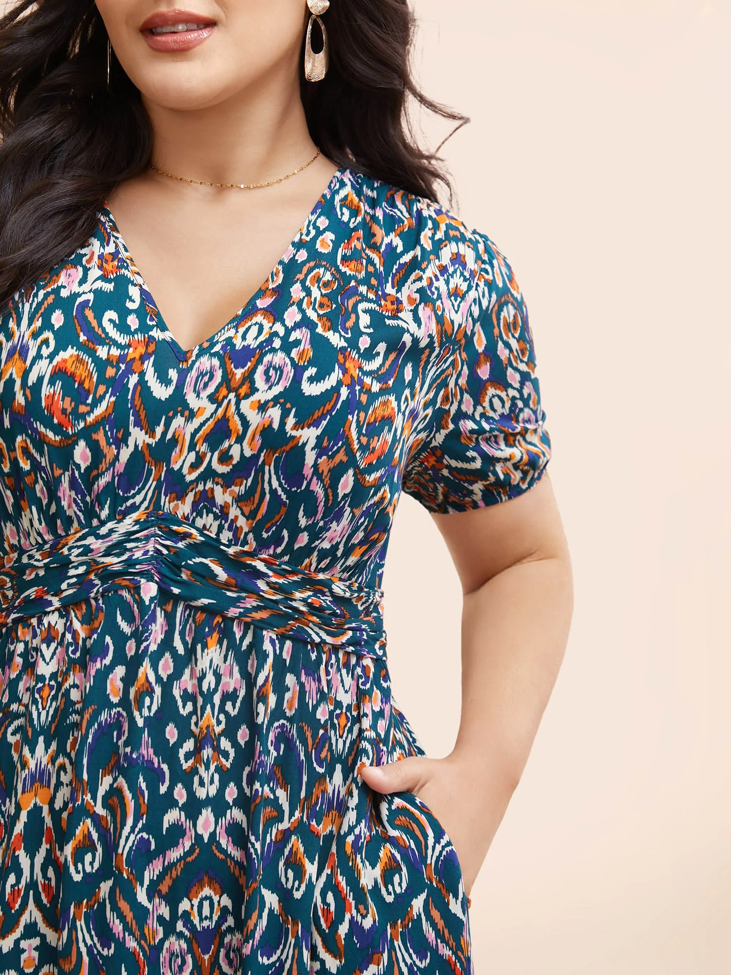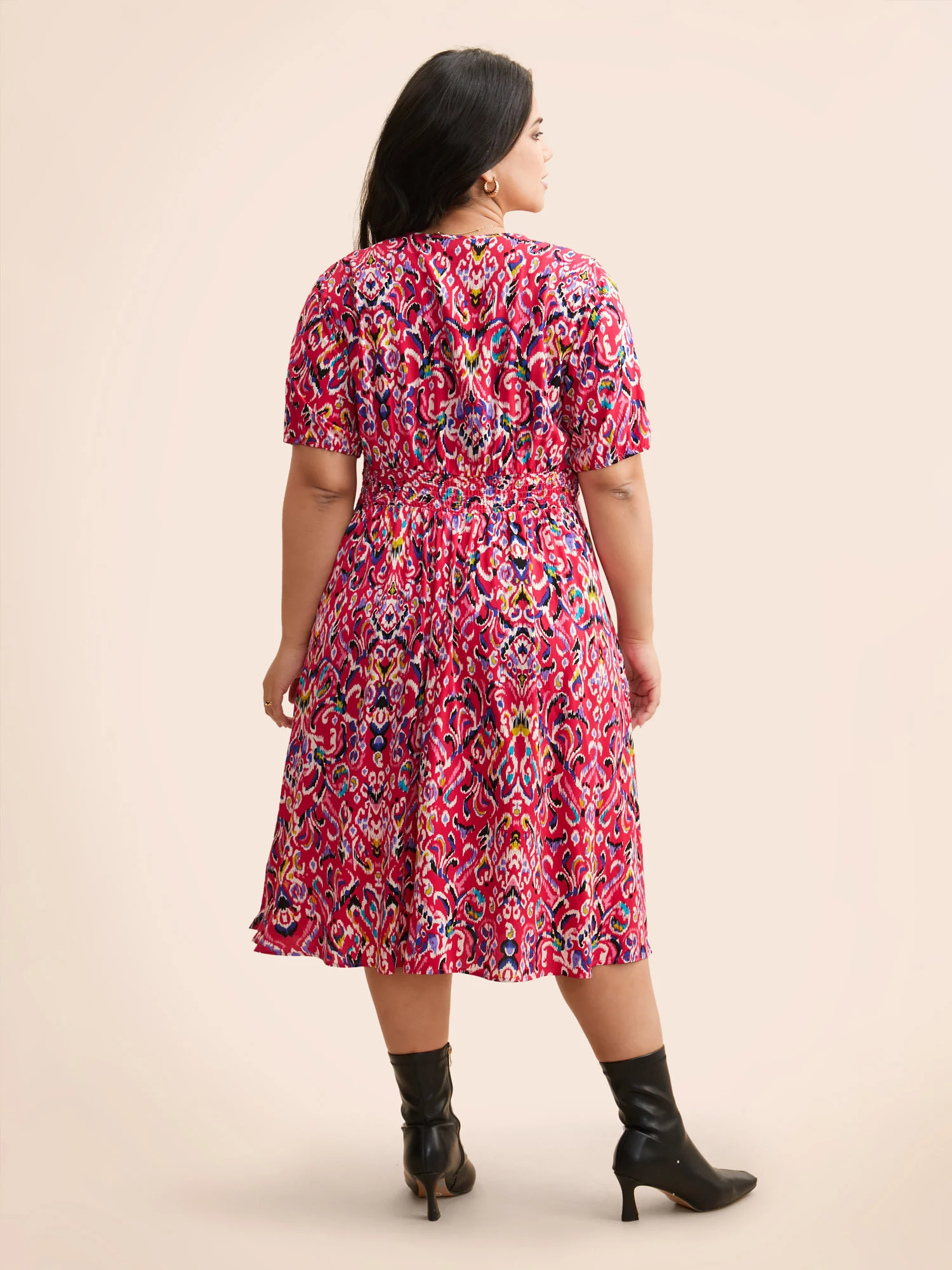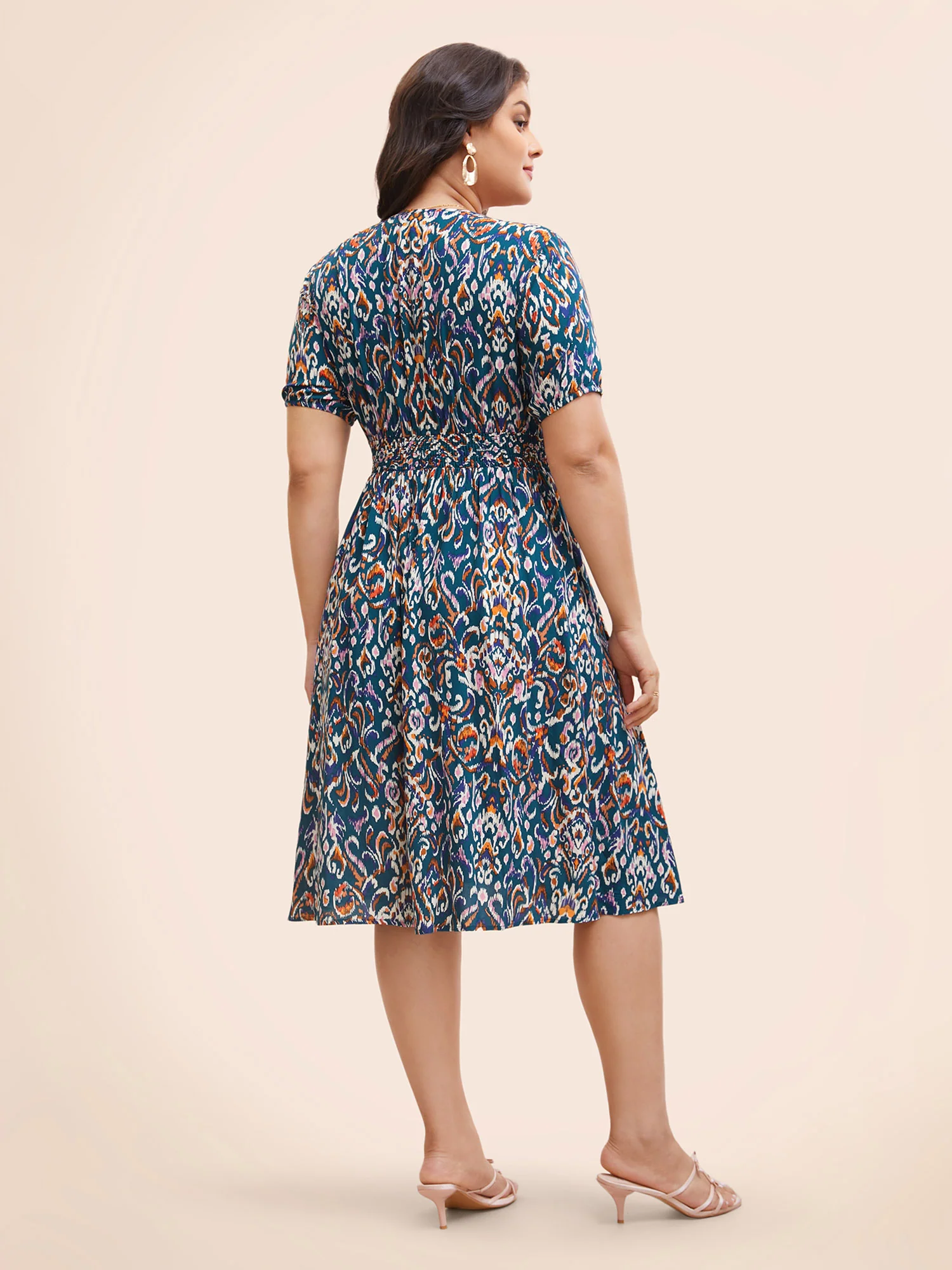 Boho Print Ruffles Shirred Pocket Elastic Waist Dress
