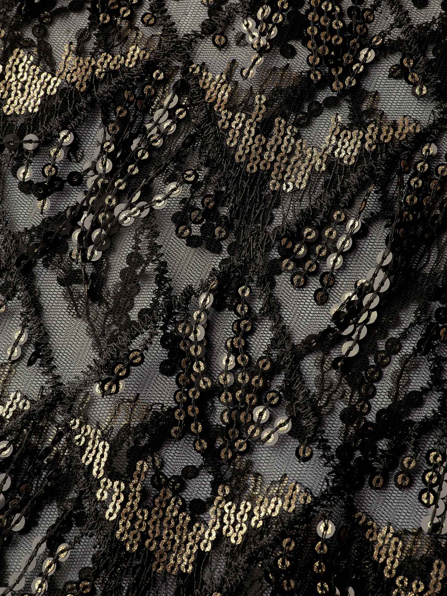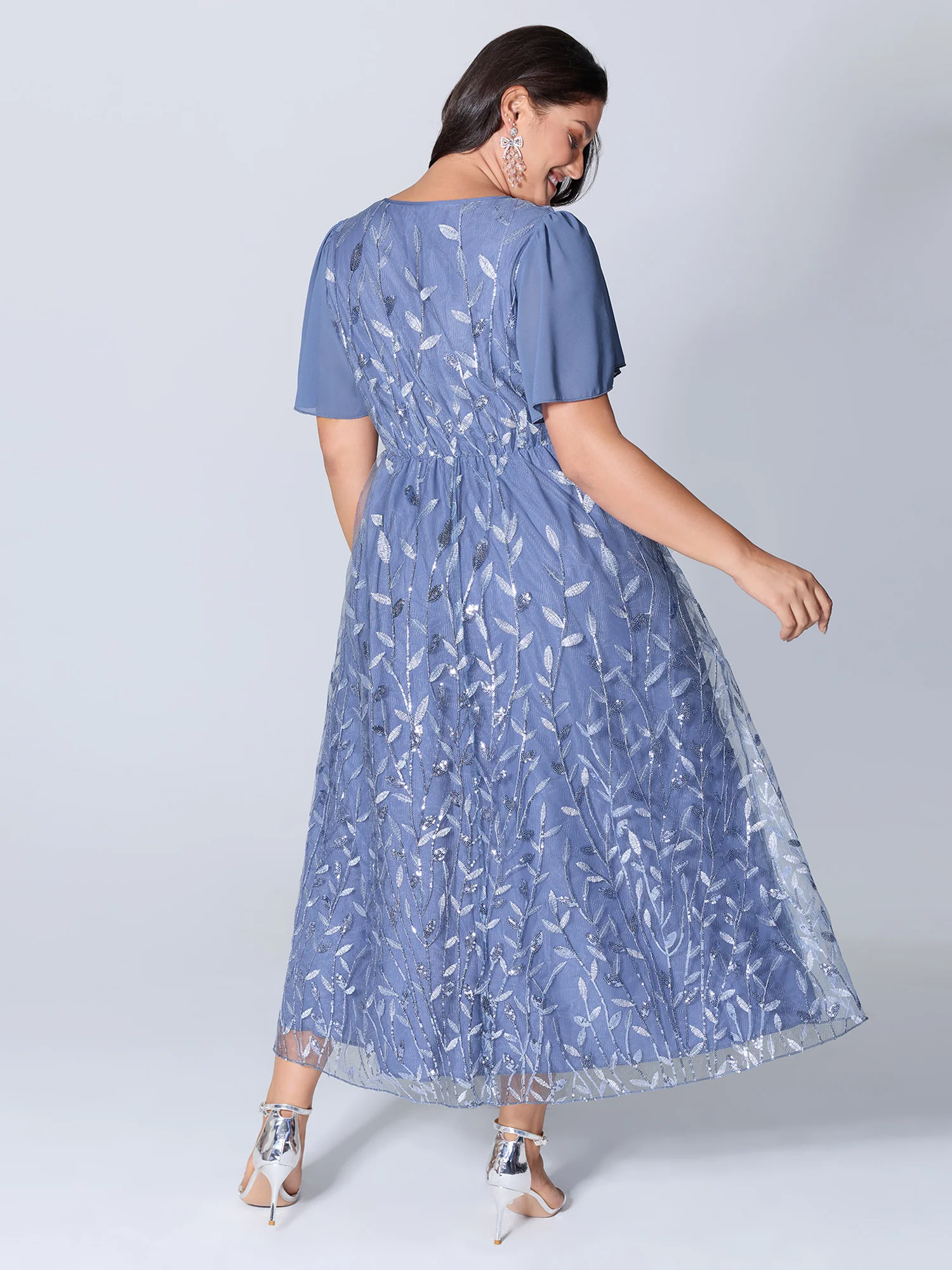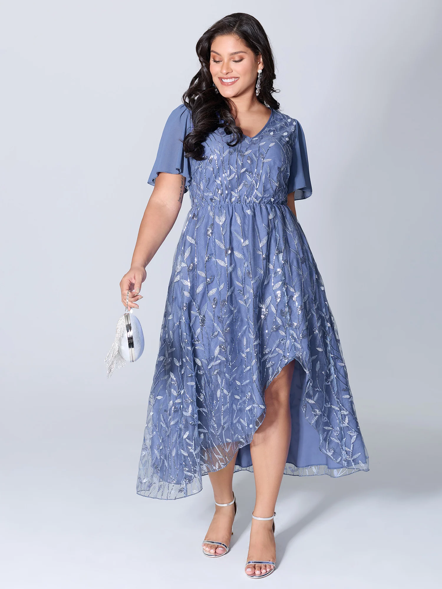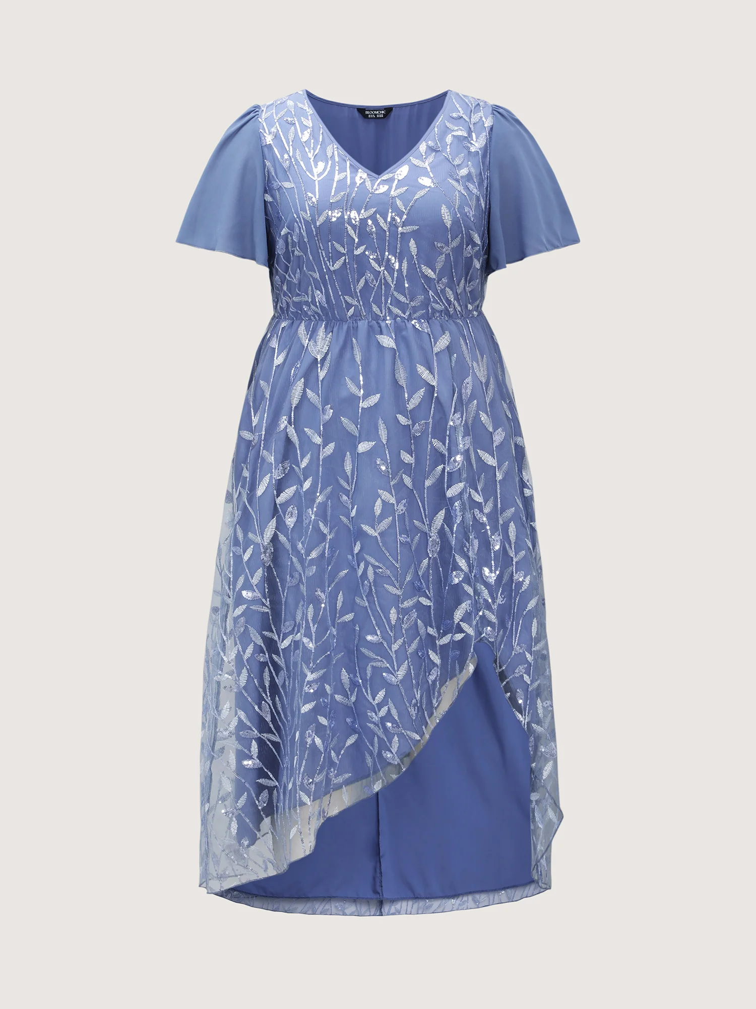 Lace Mesh Petal Hem Leaf Sequin Midi Dress