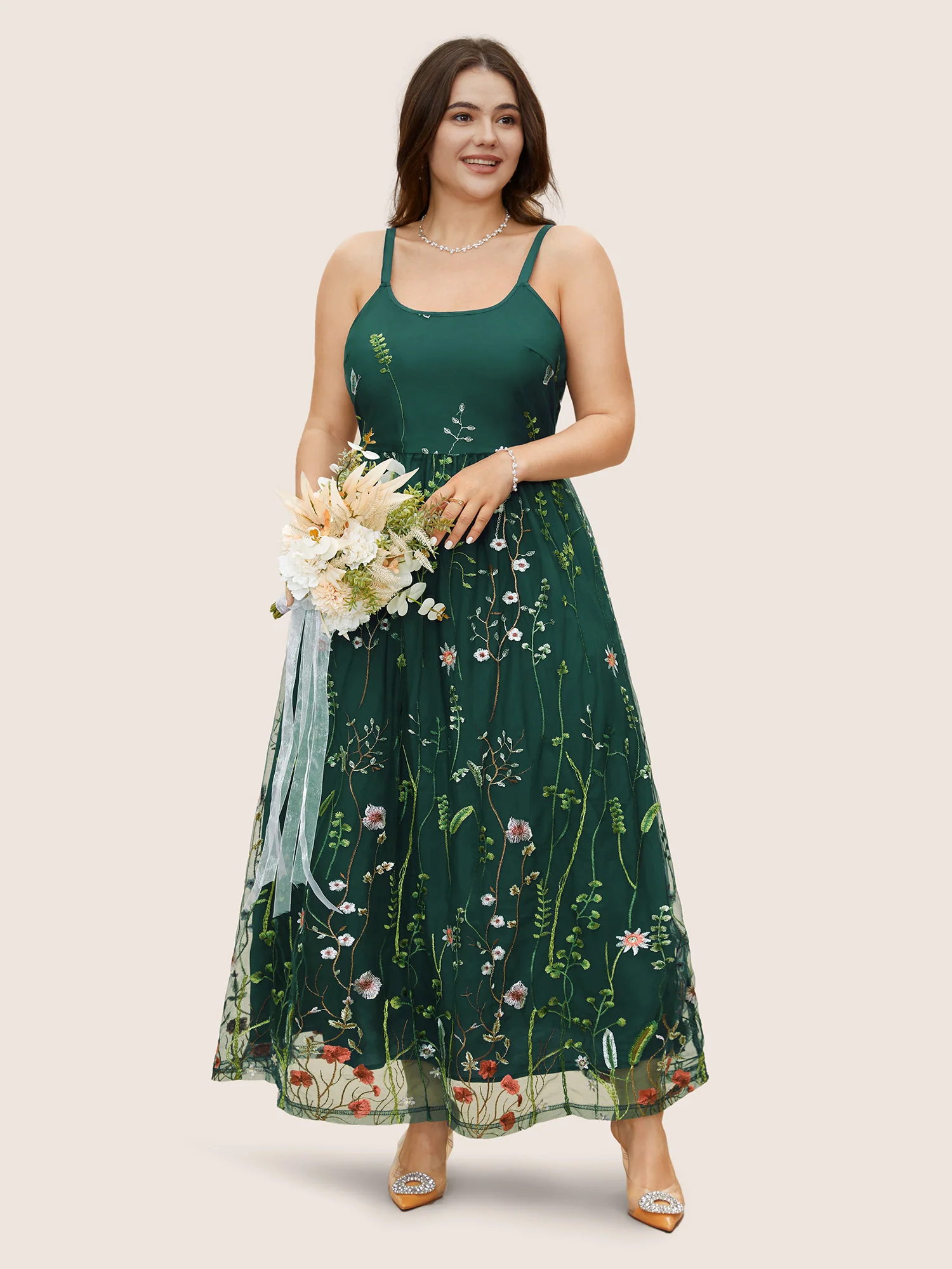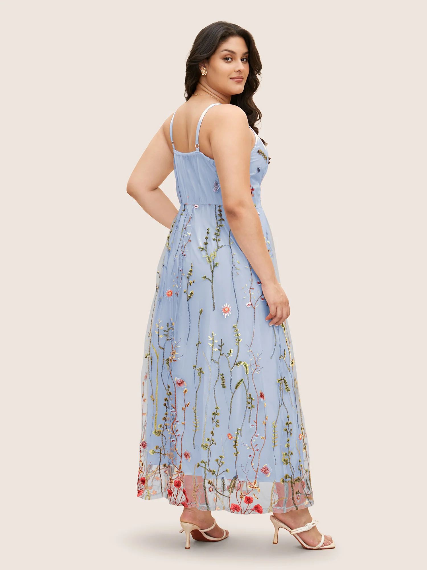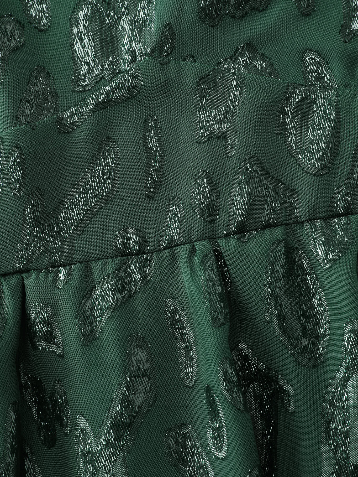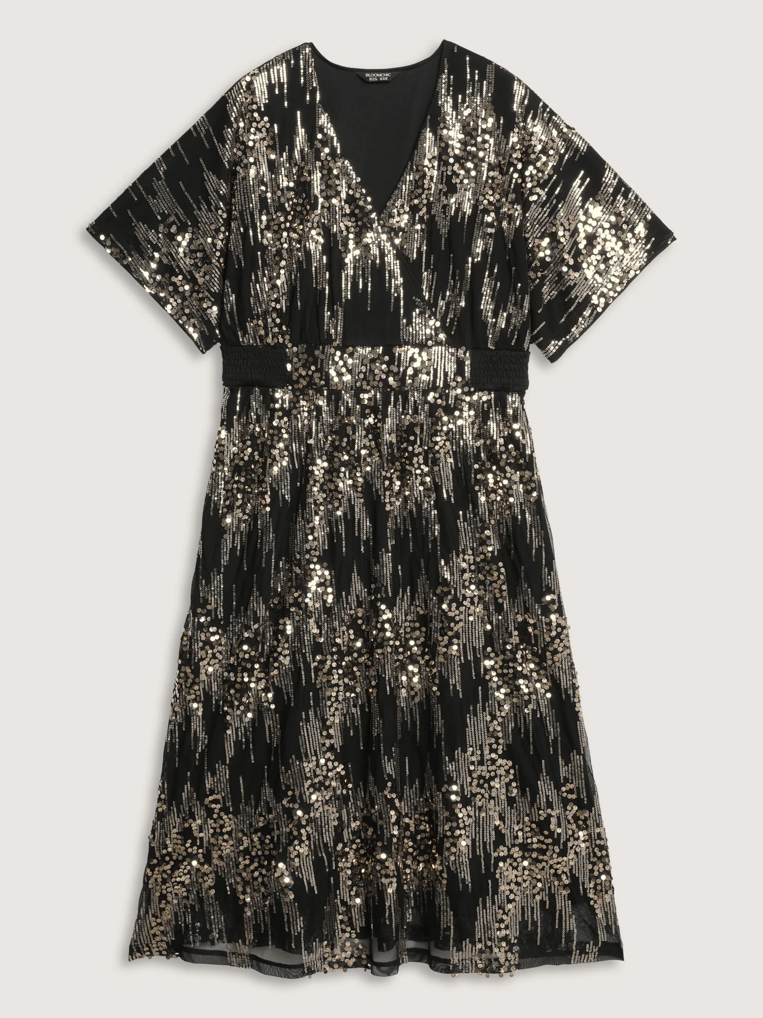 Lace Mesh Petal Hem Leaf Sequin Midi Dress