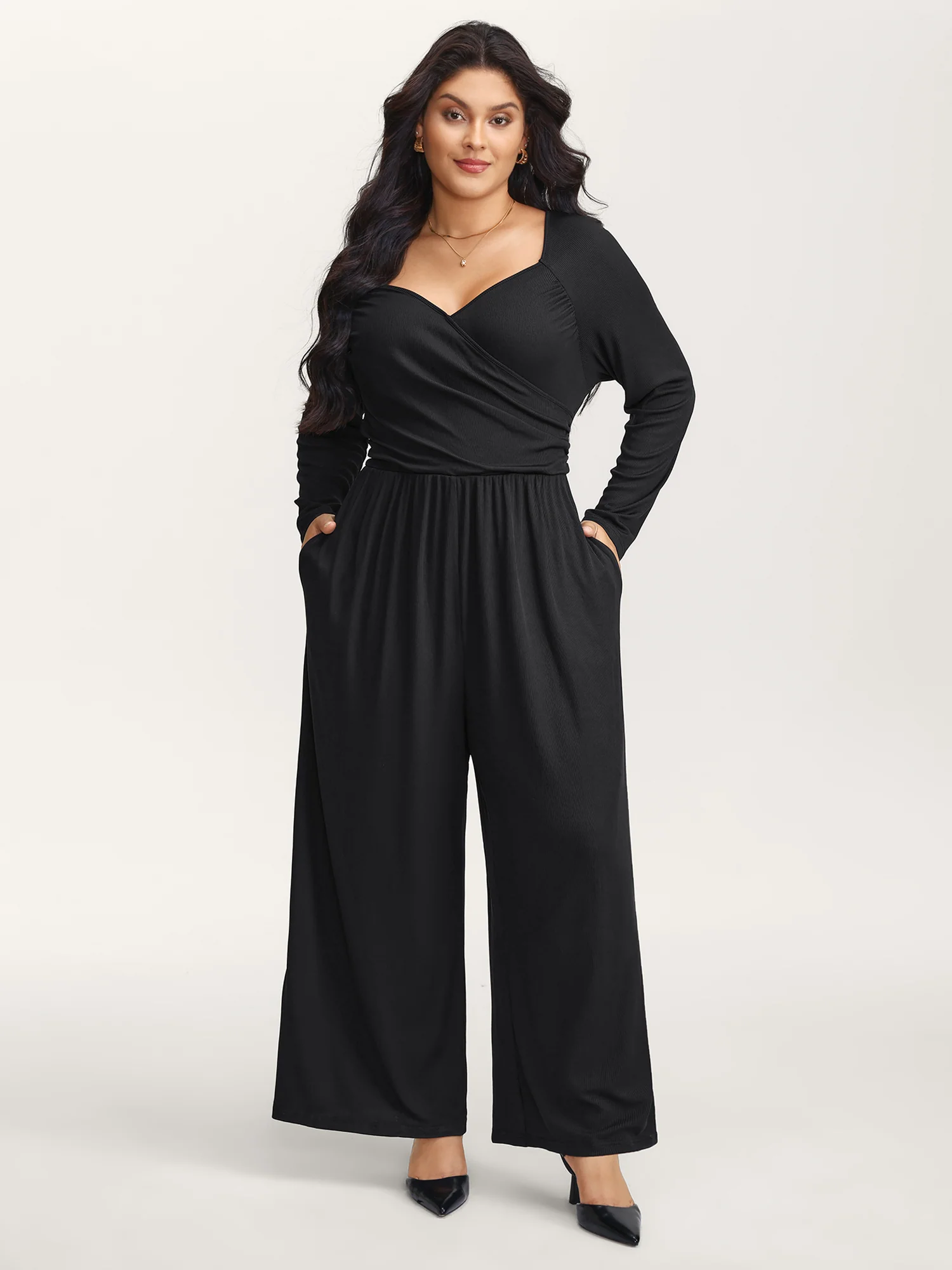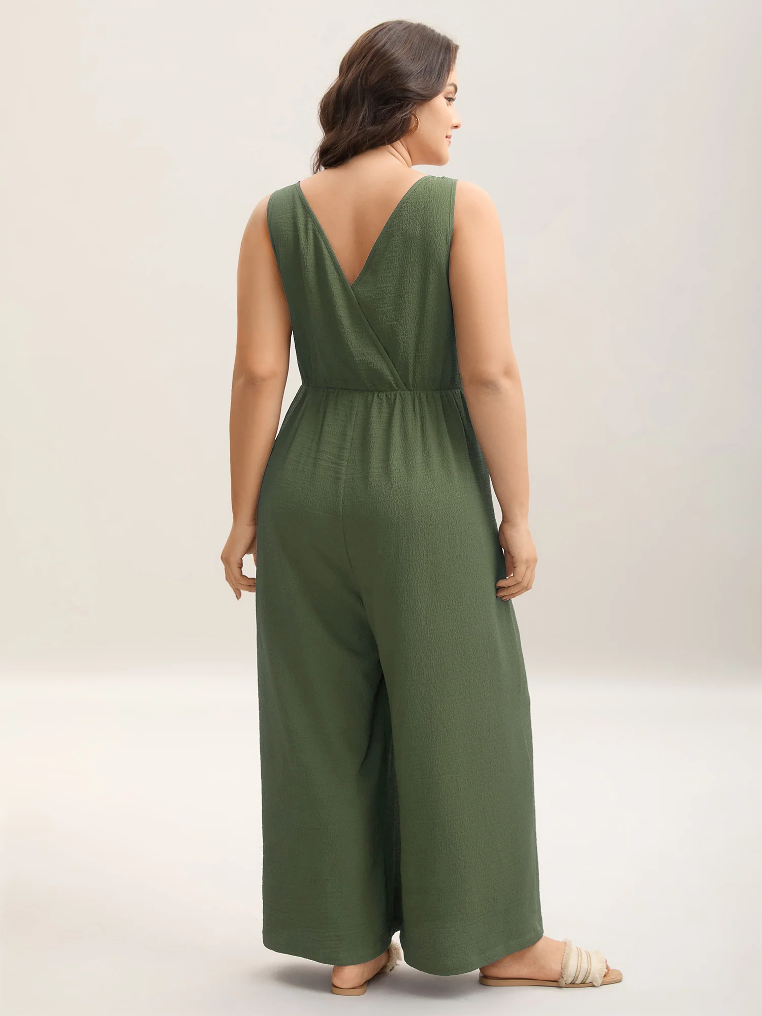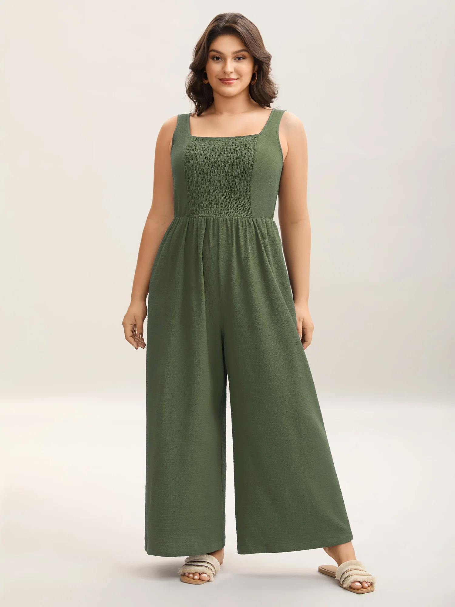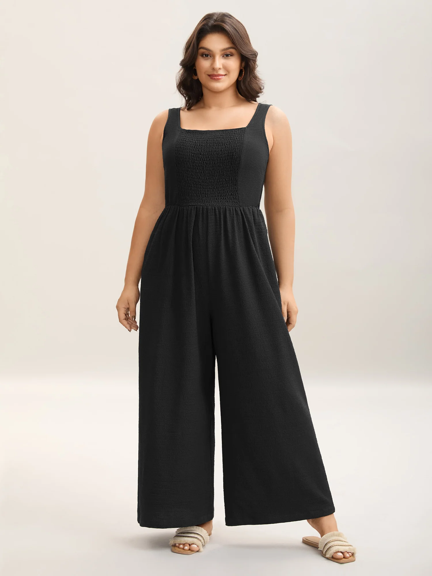 Shirred Pockets Wide-Leg Plain Jumpsuit