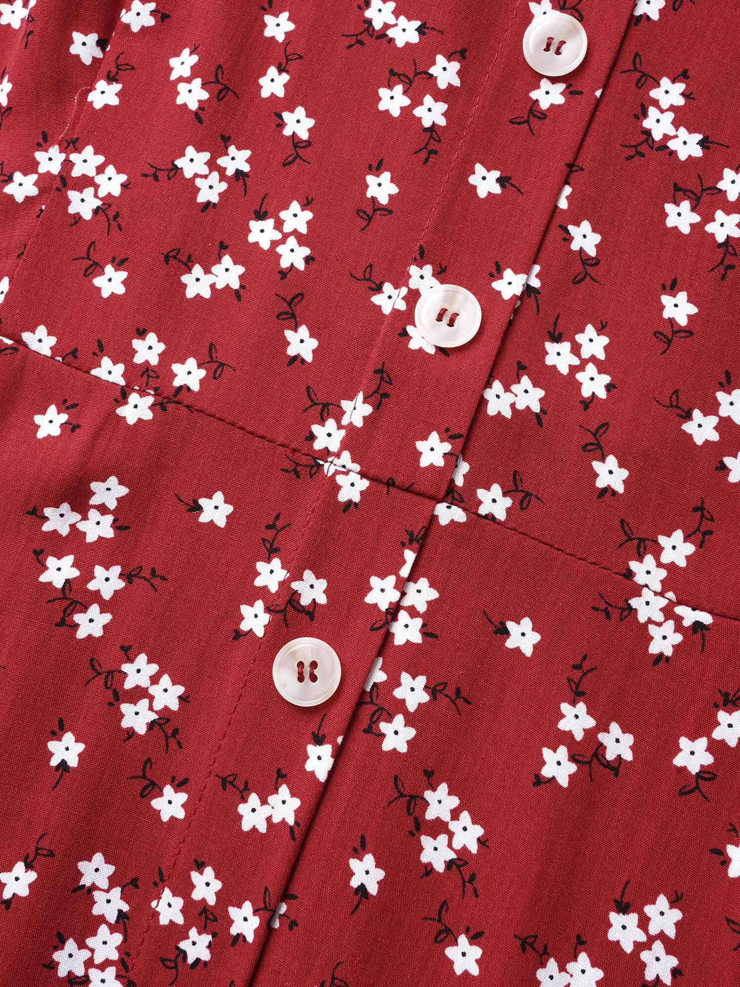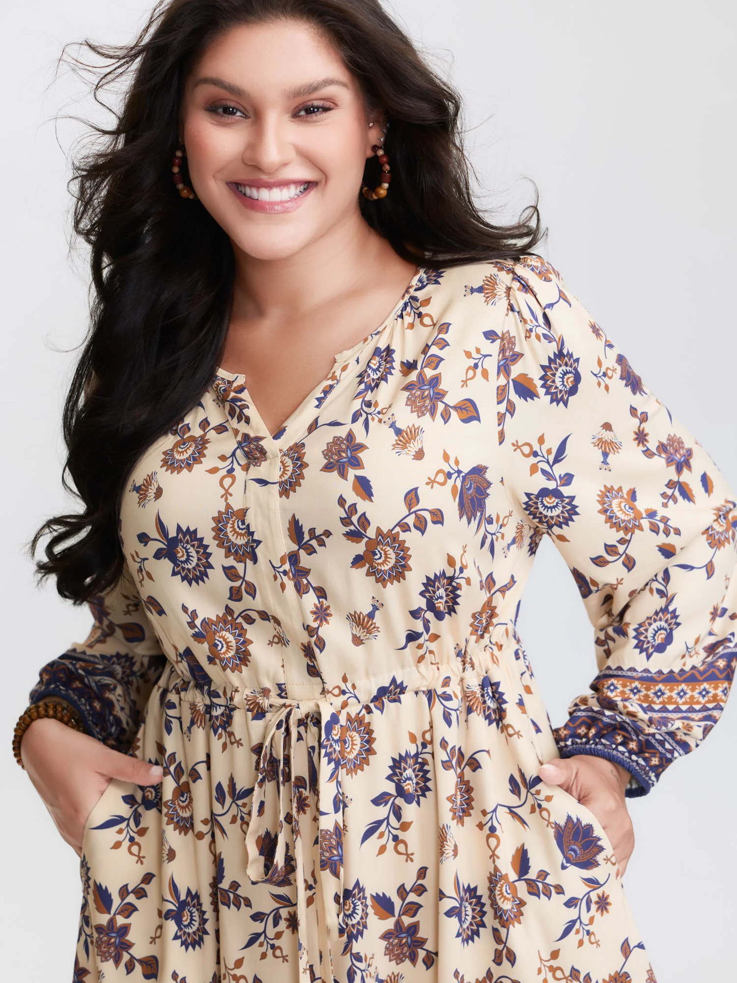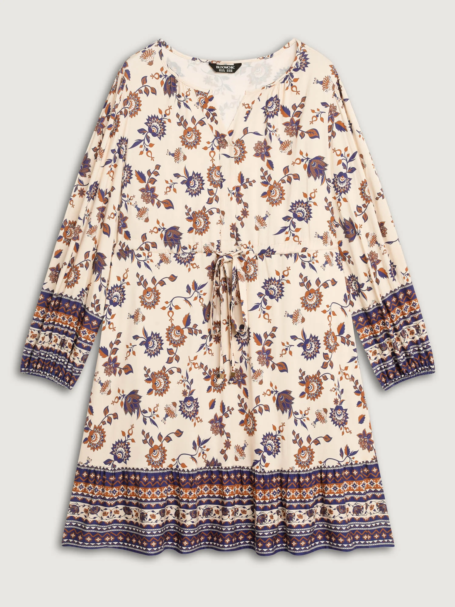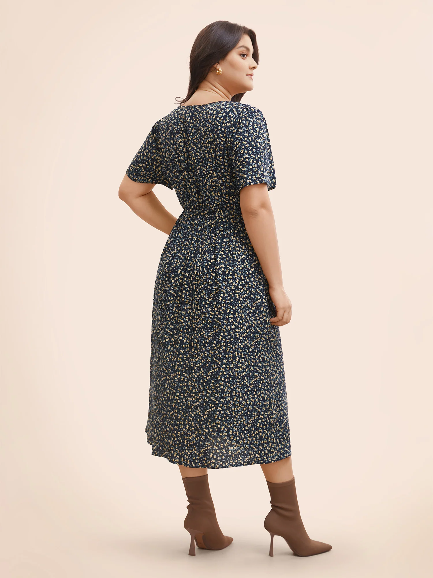 Ditsy Floral Drawstring Shirred Cuffs Dress