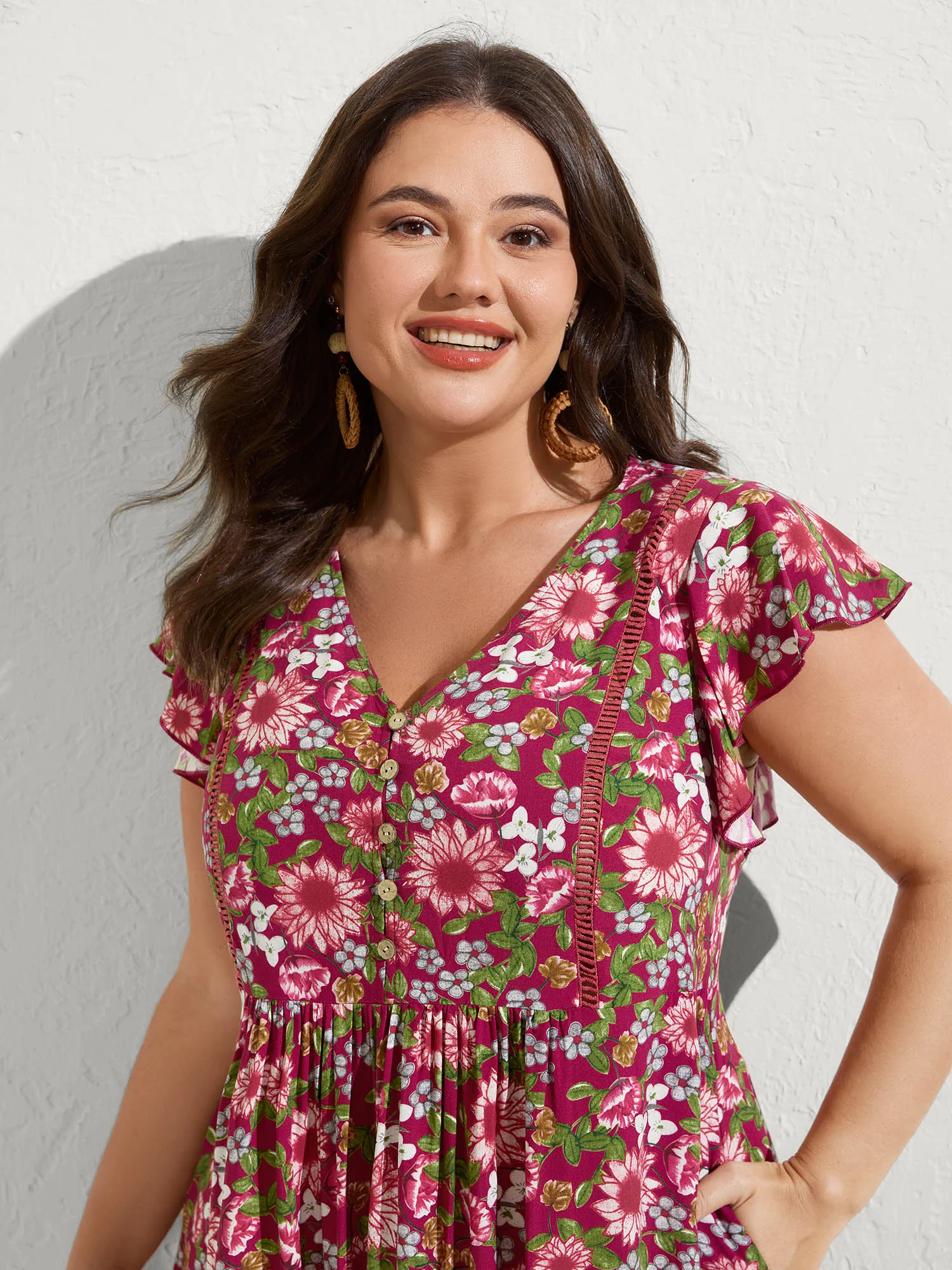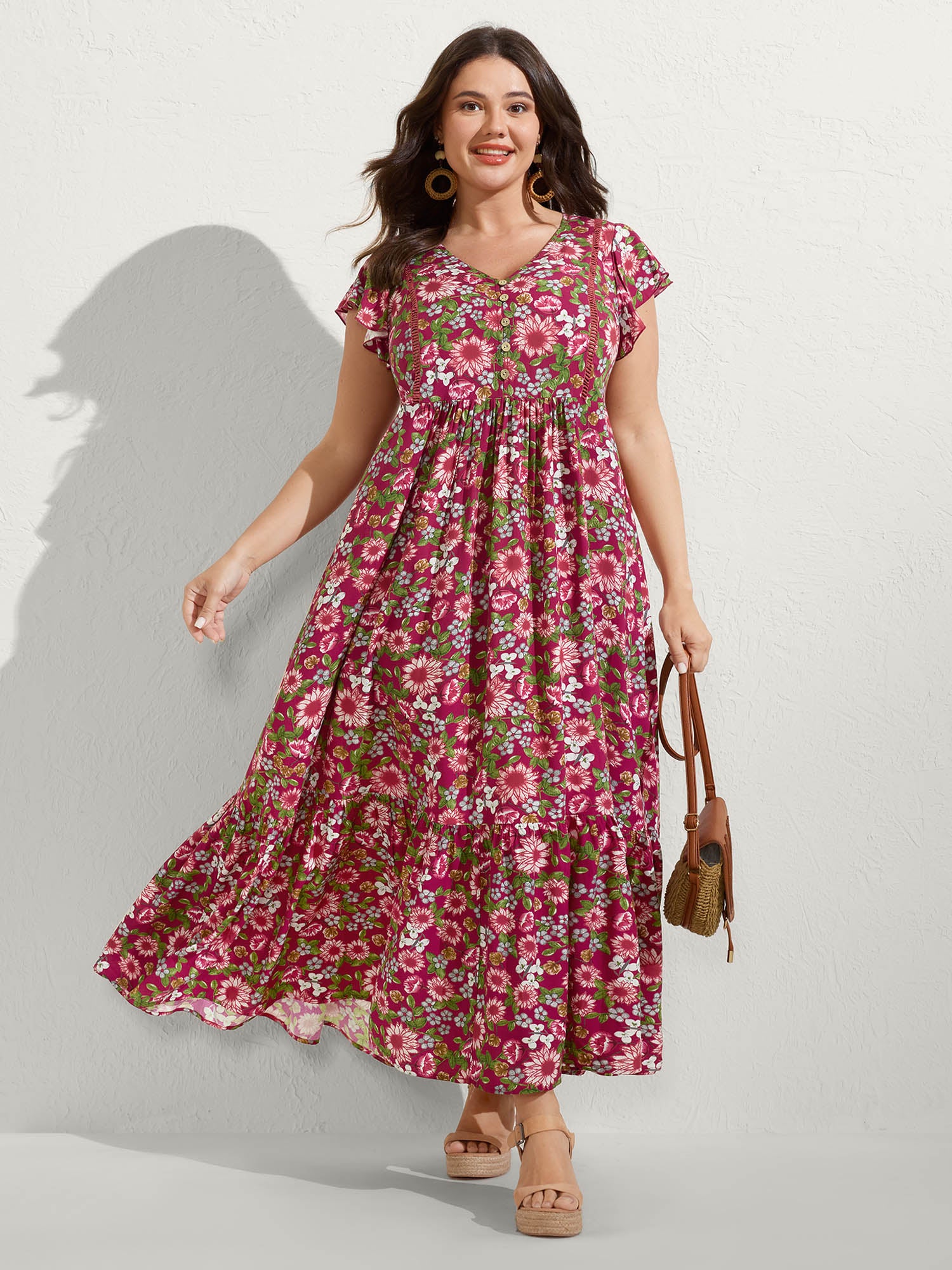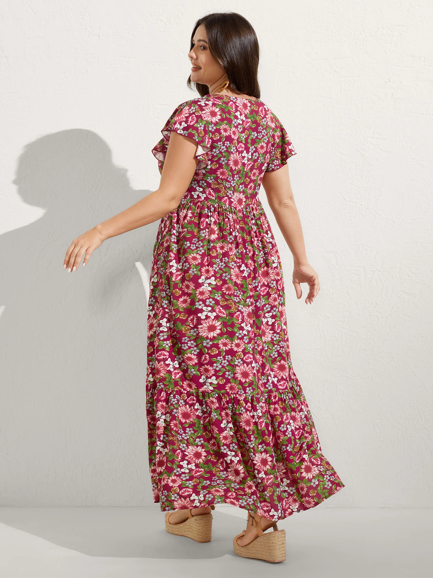 Ruffled Floral Print Stretchy-Waist Midi Dress