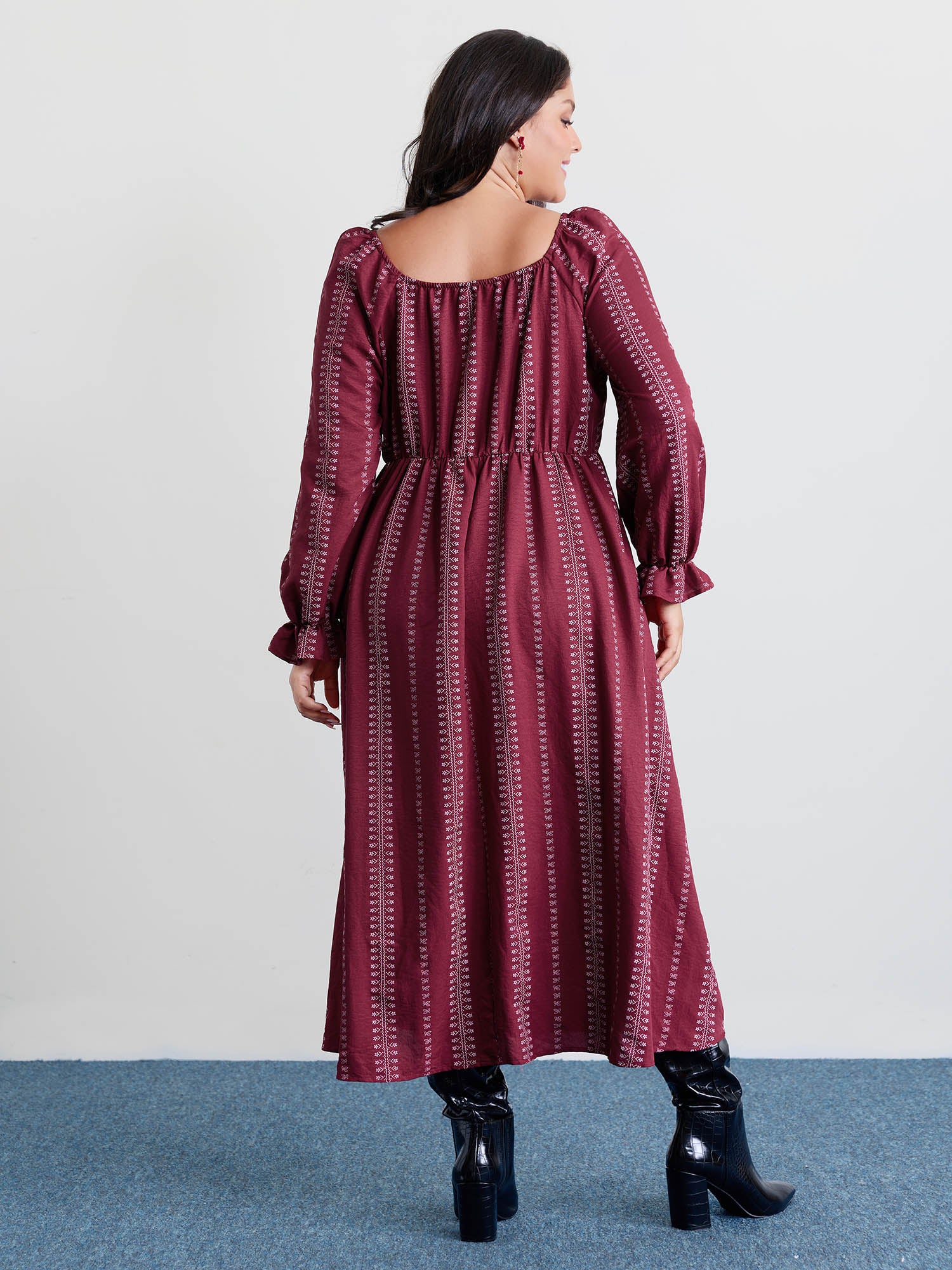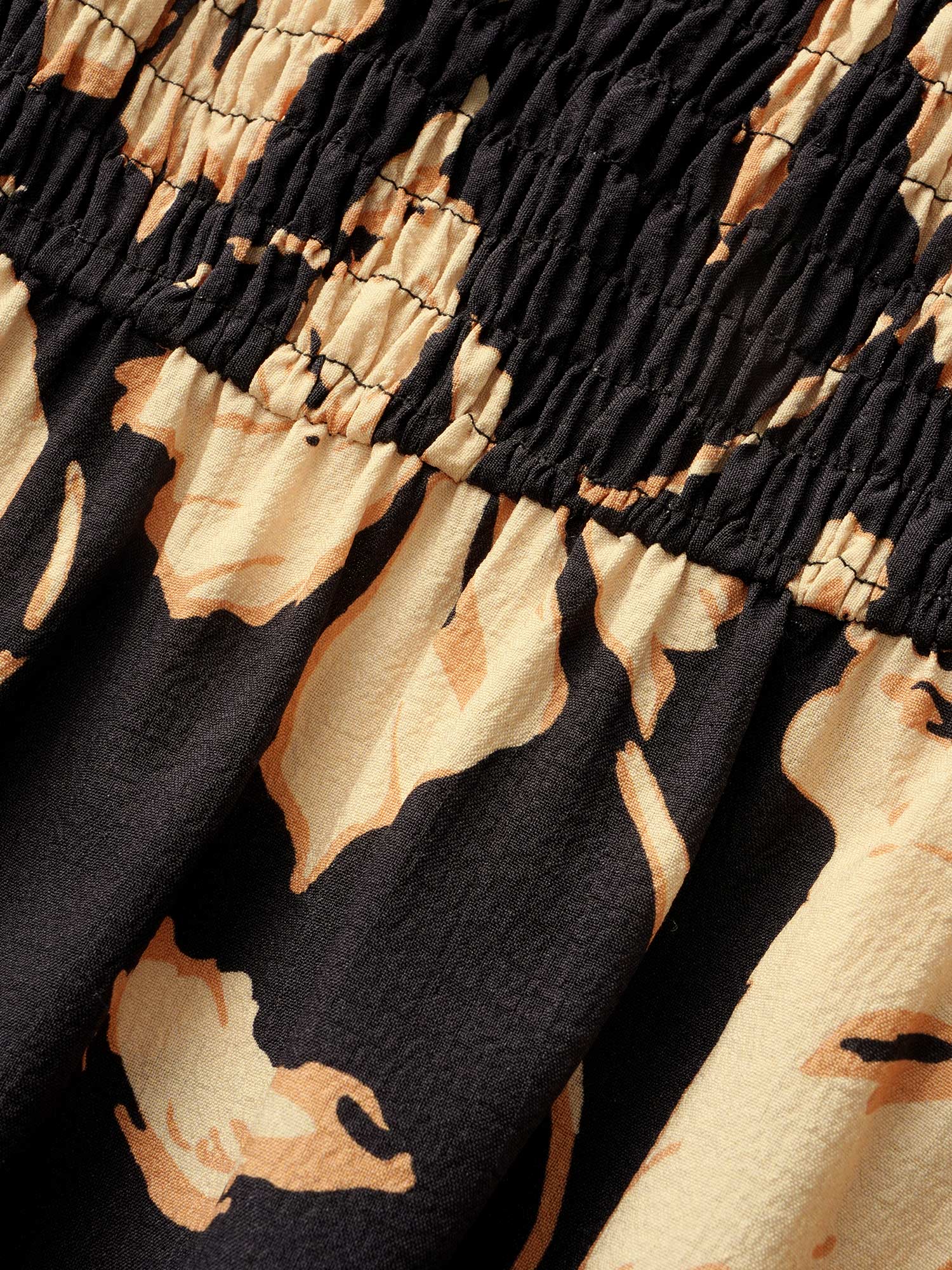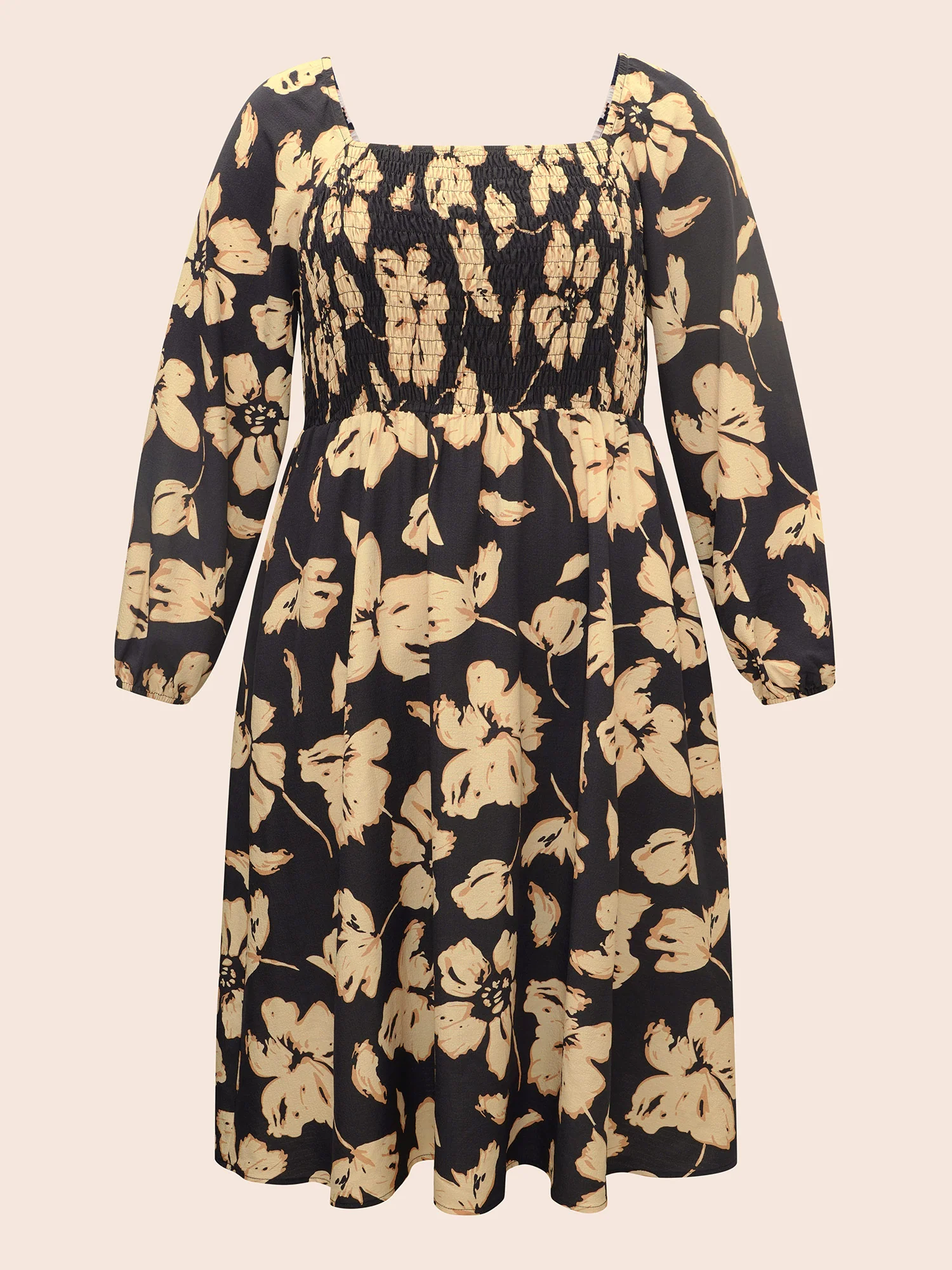 Ruffled Floral Print Stretchy-Waist Midi Dress
