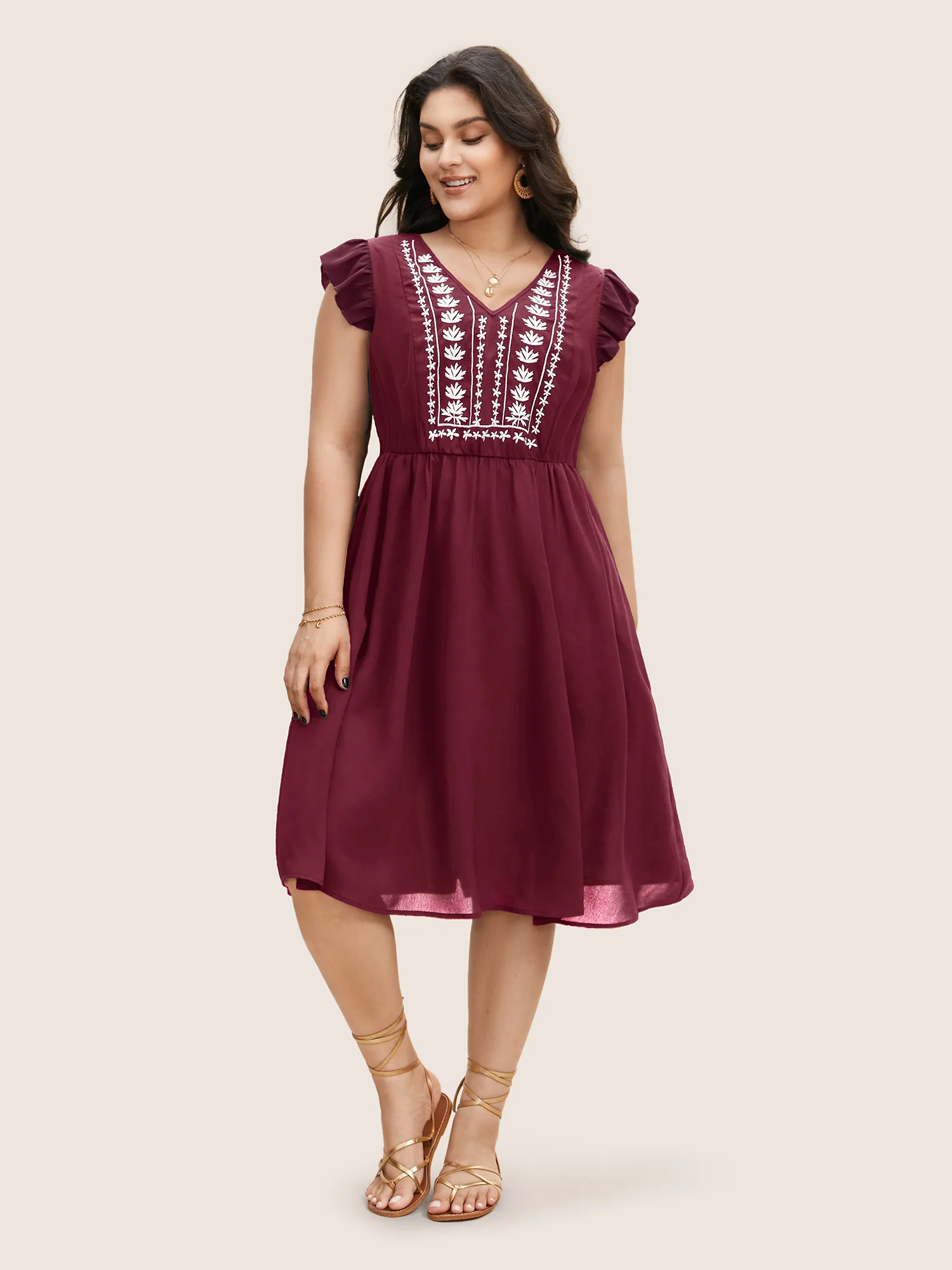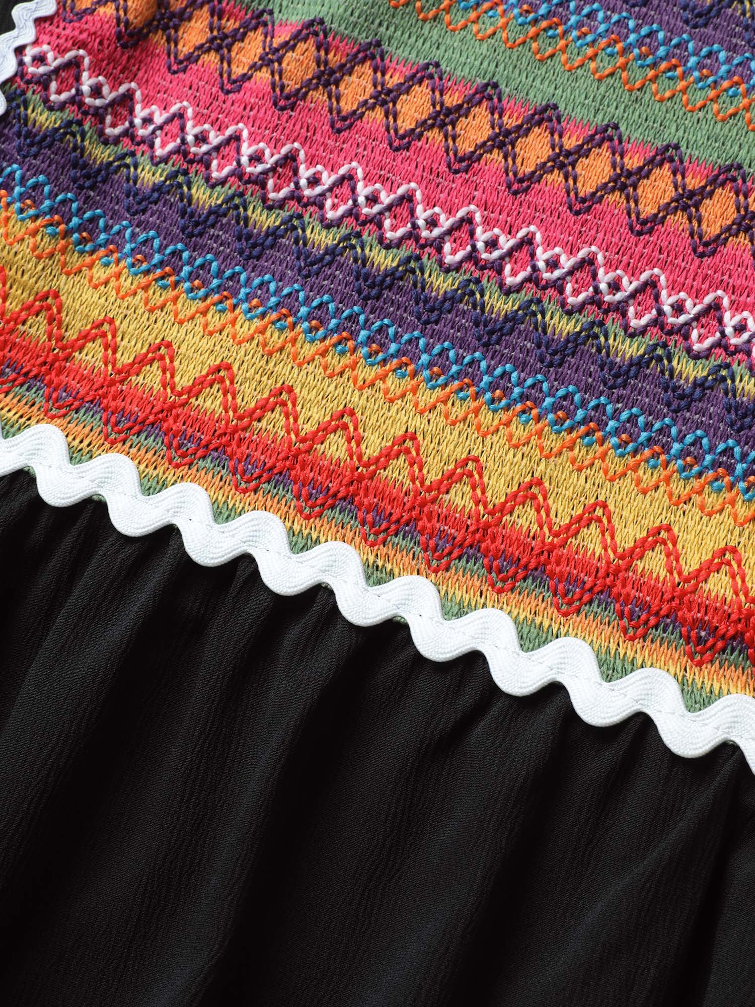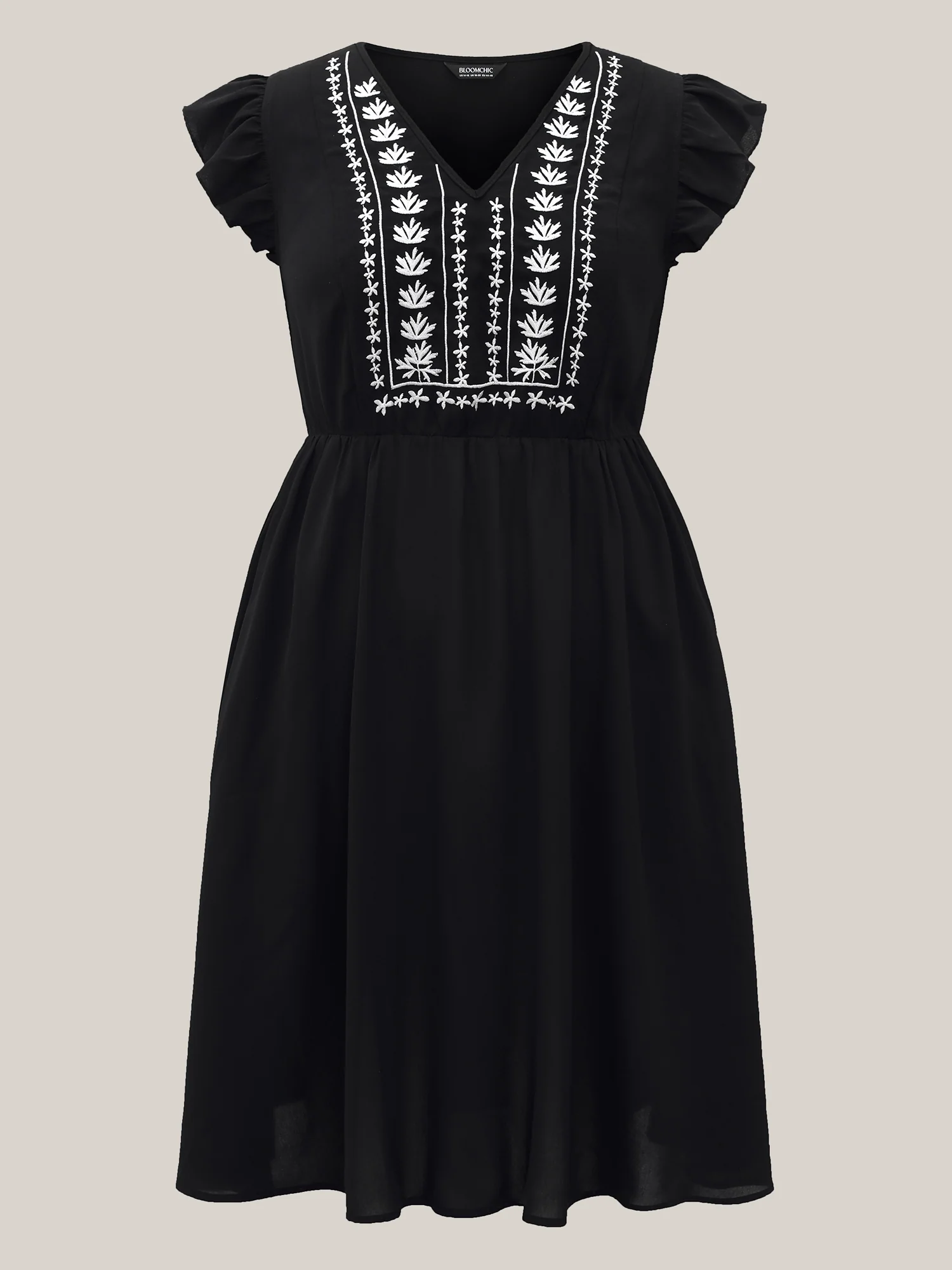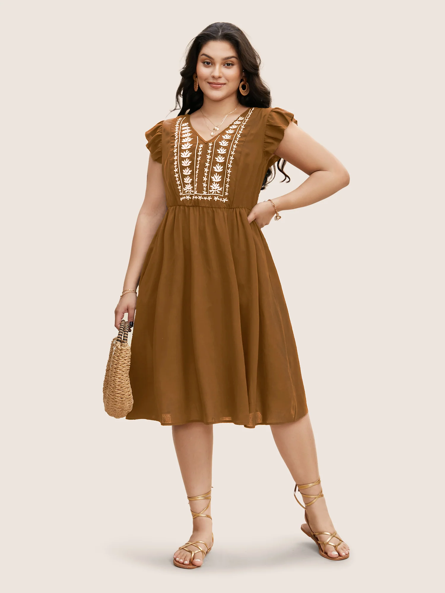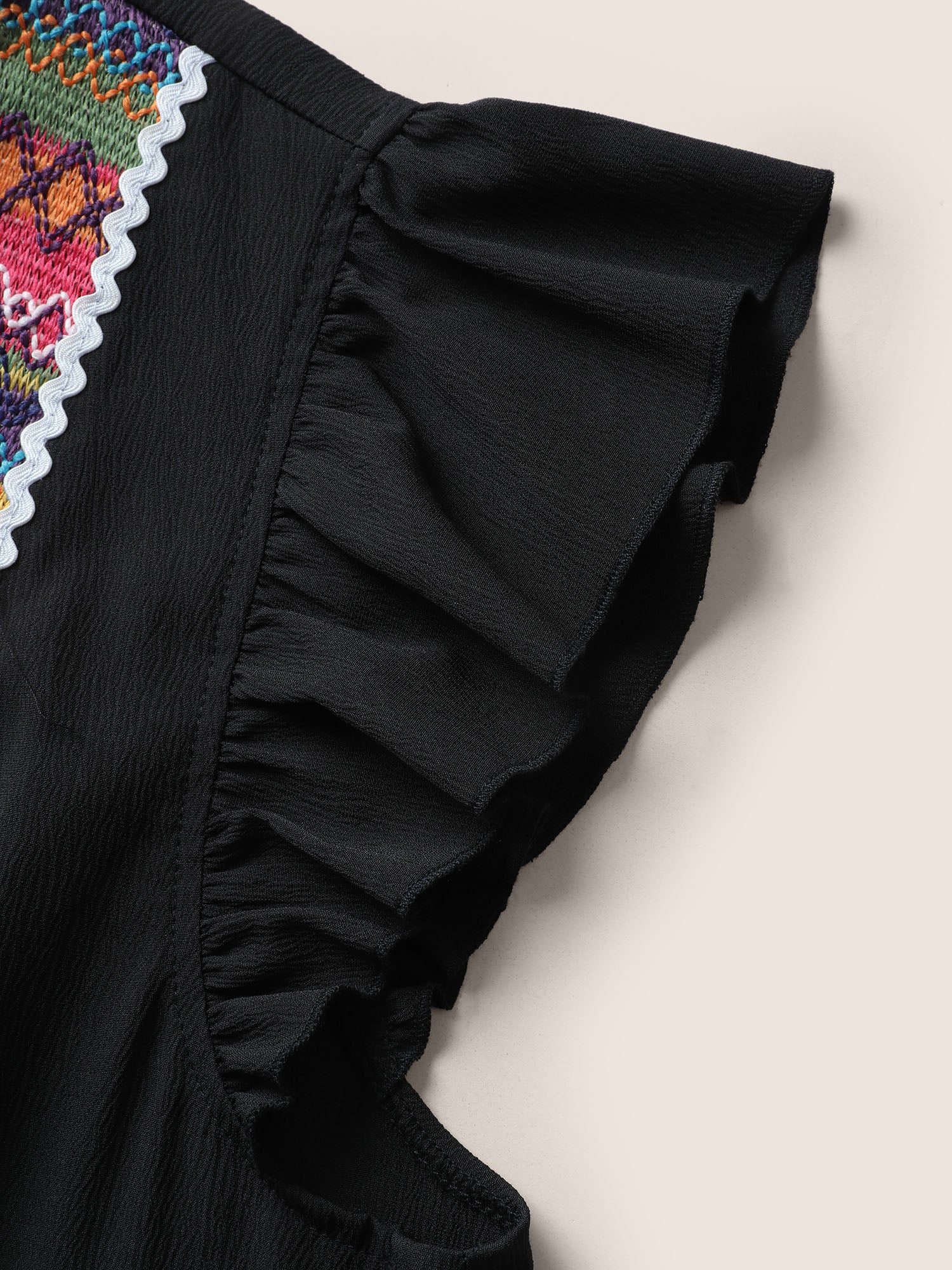Color Embroidered Patchwork Flounce Sleeve Dress
