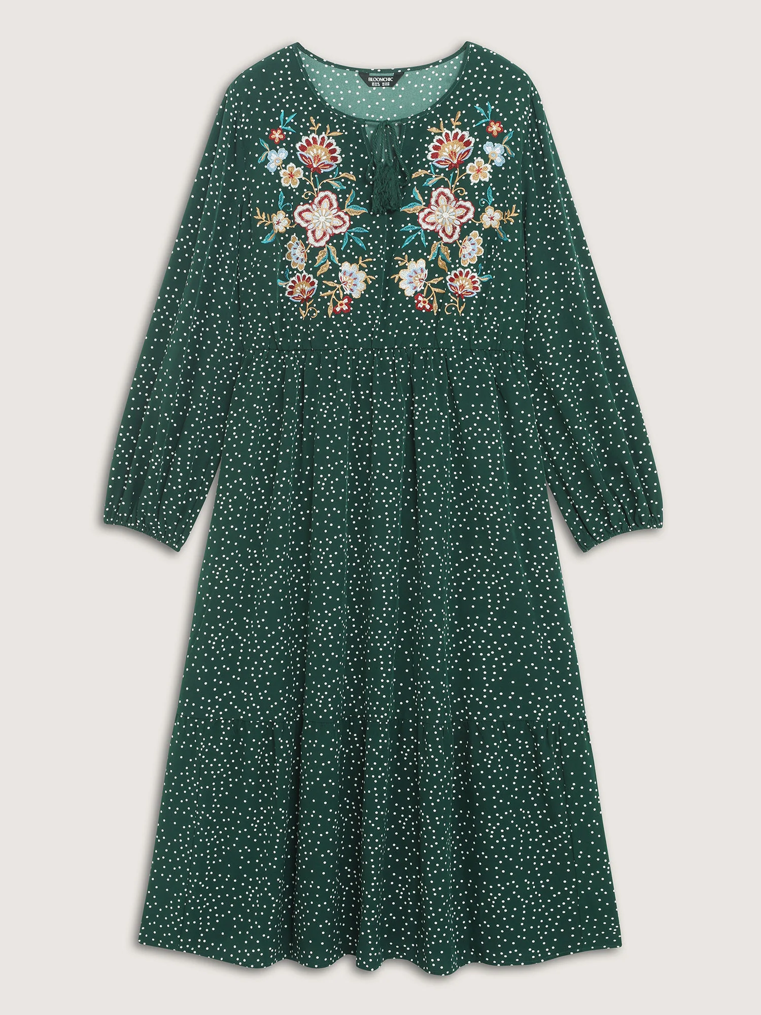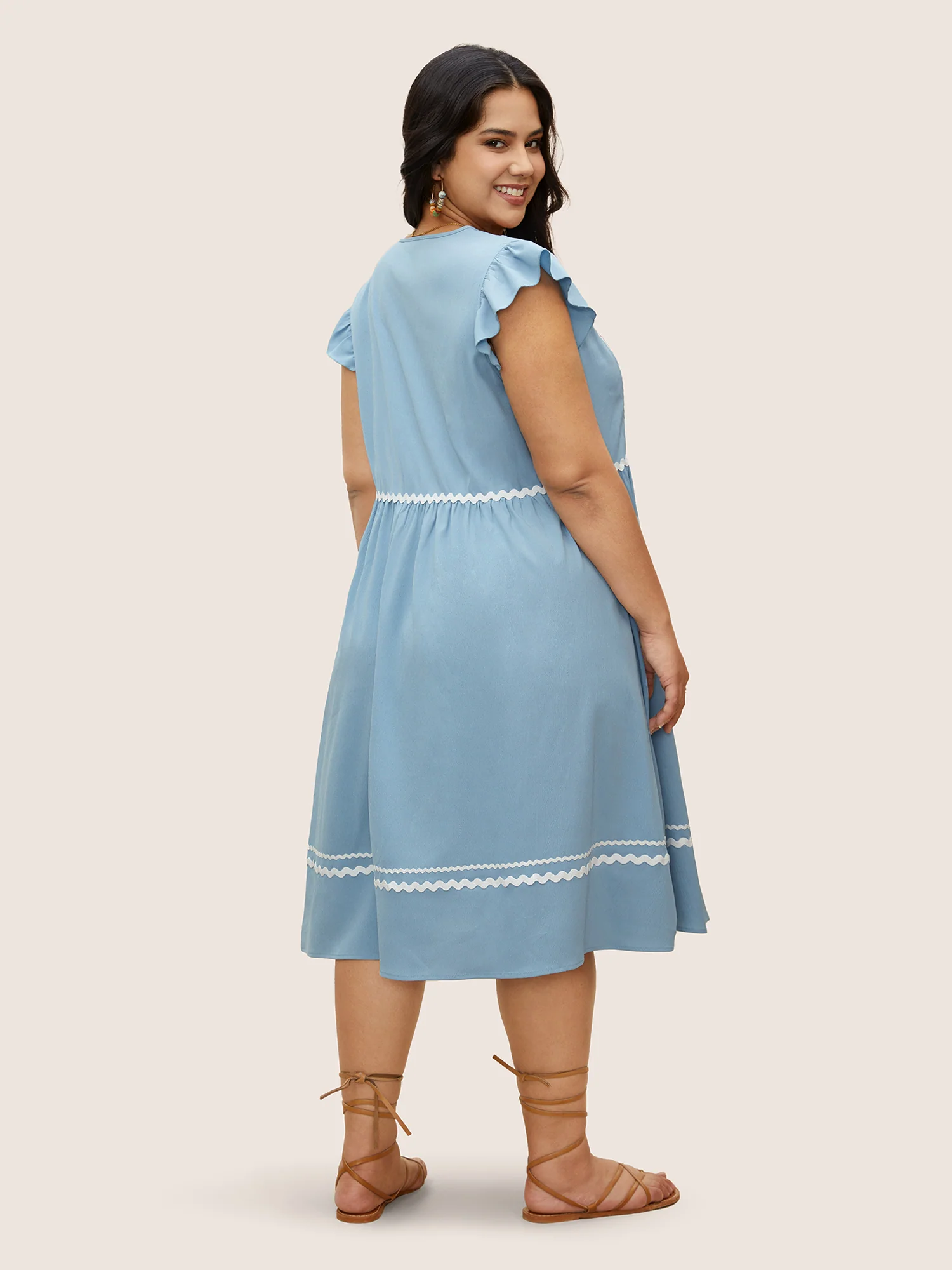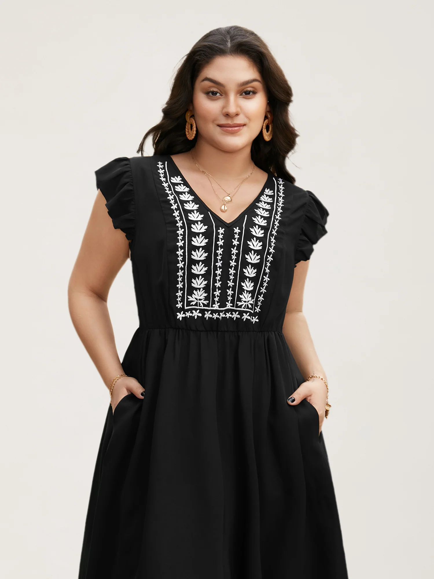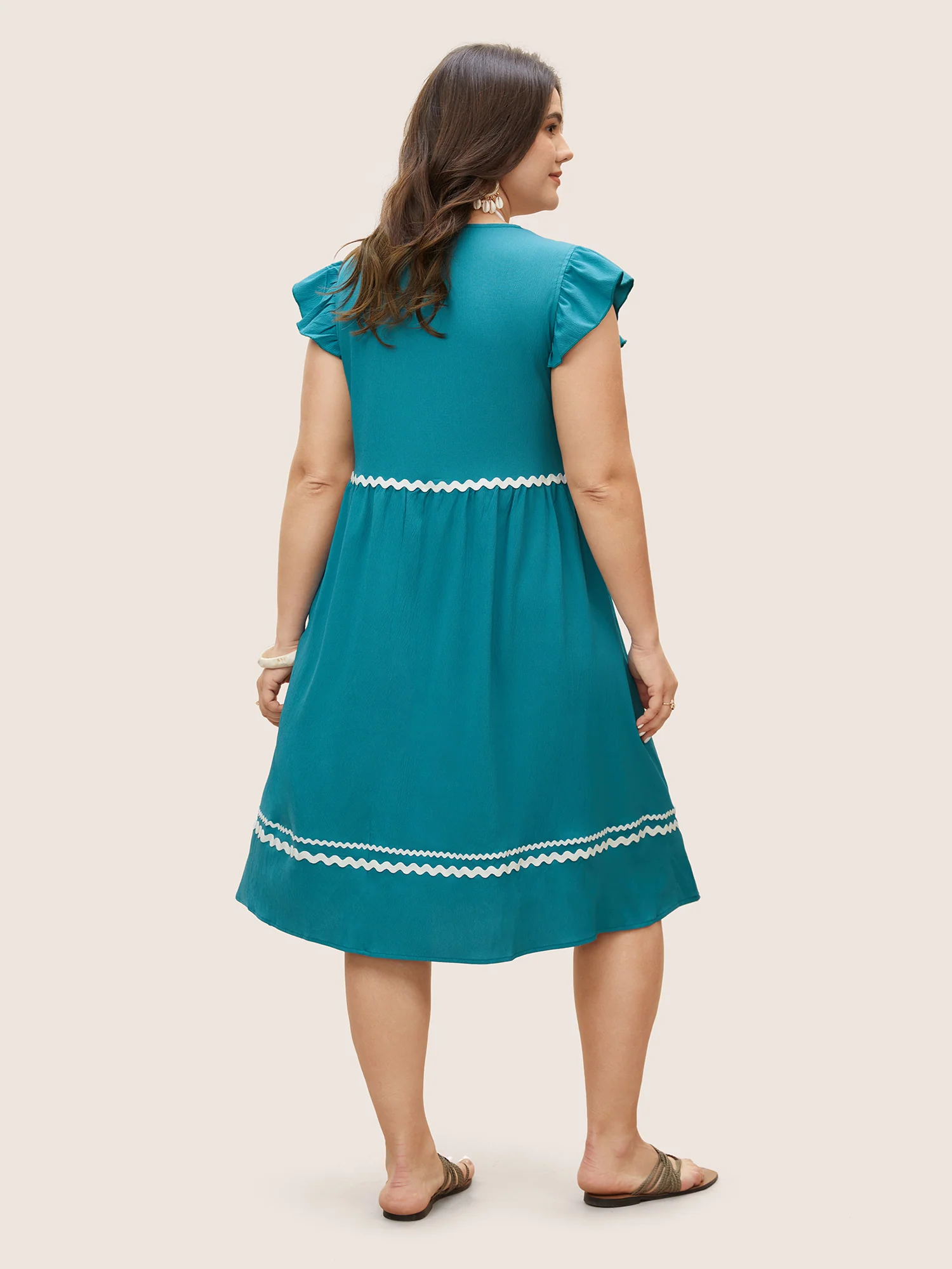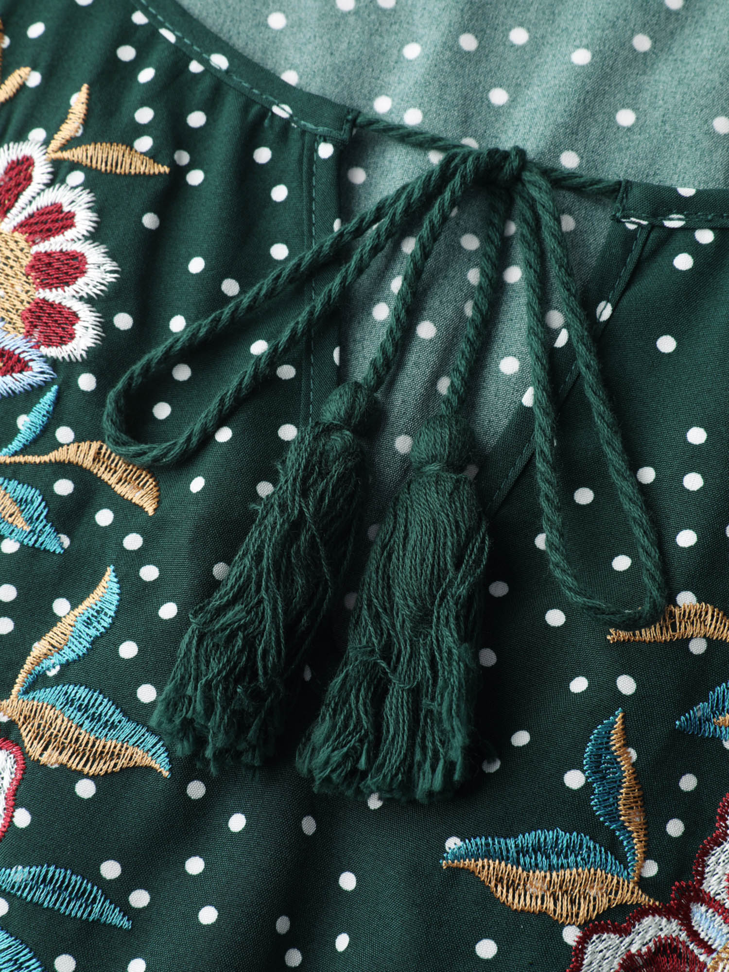Color Embroidered Patchwork Flounce Sleeve Dress