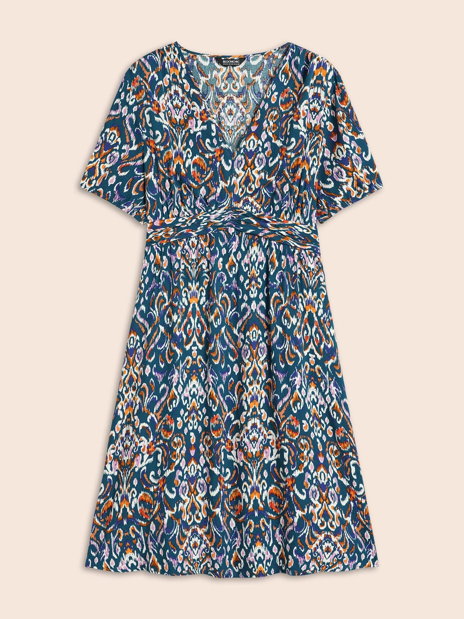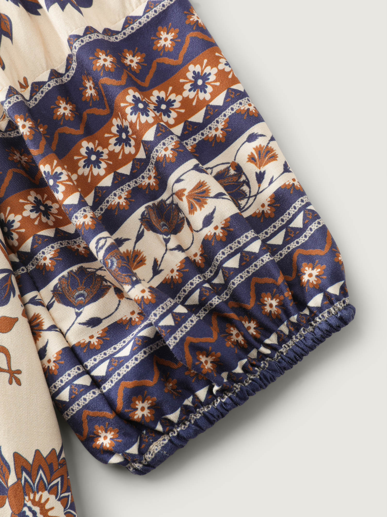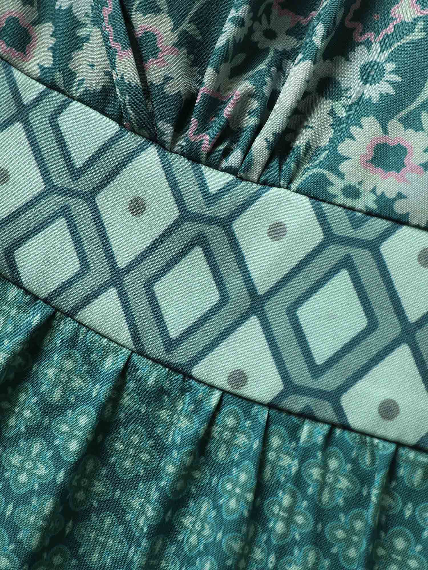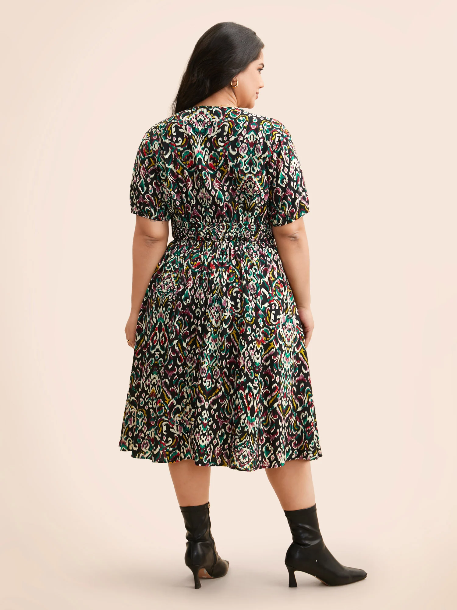 Boho Print Mock Neck Shirred Ruffle Cap Sleeve Dress