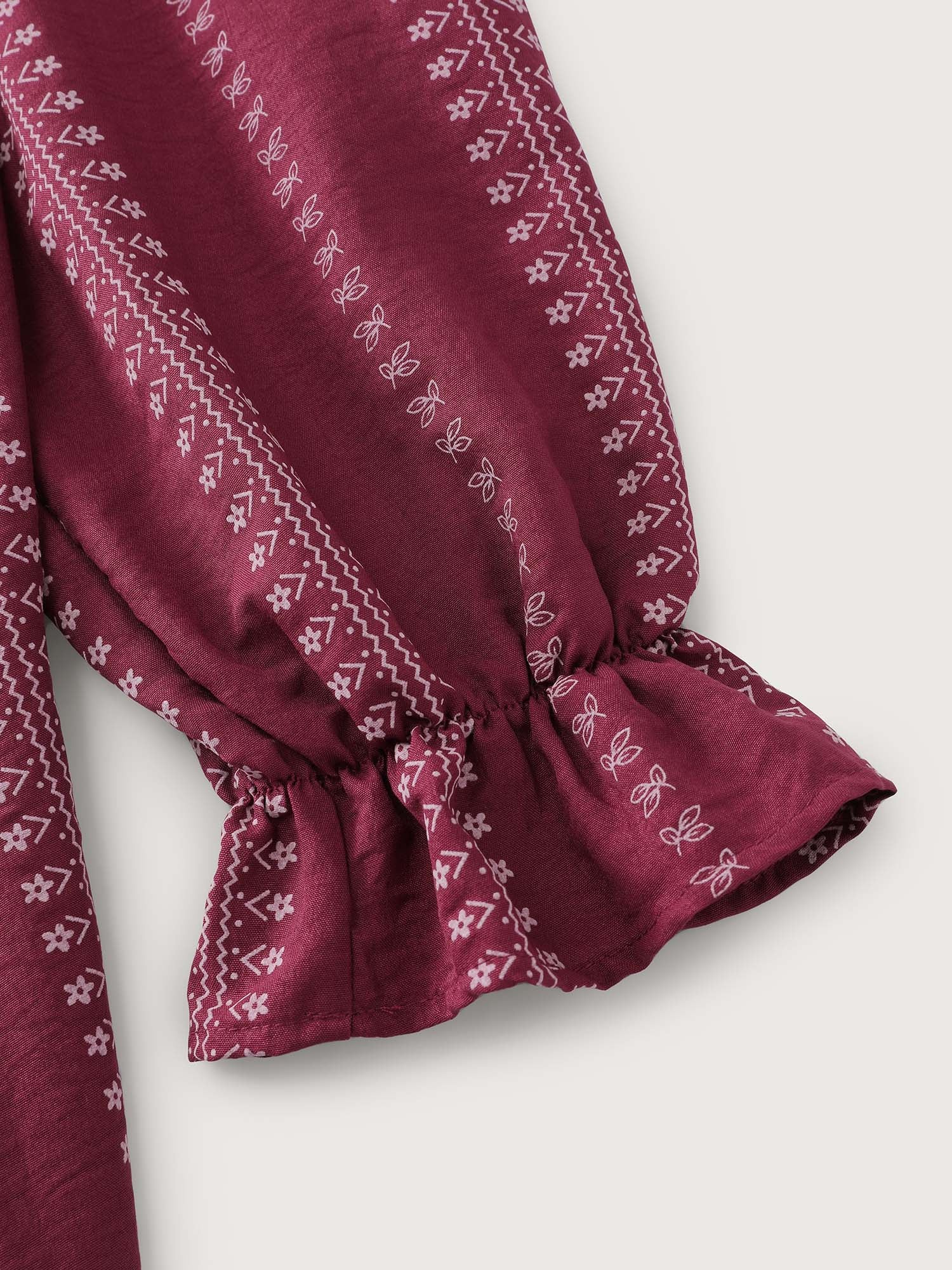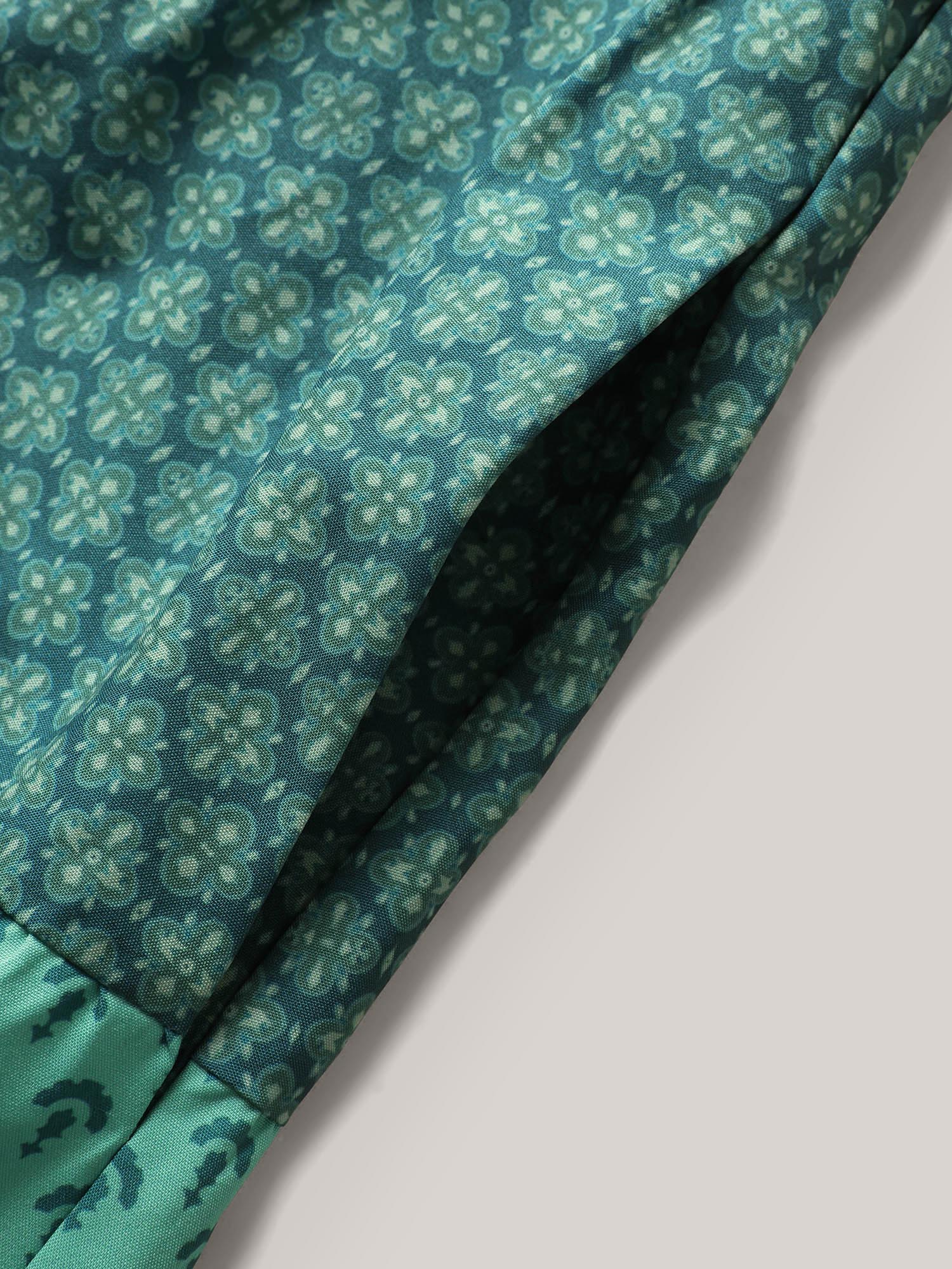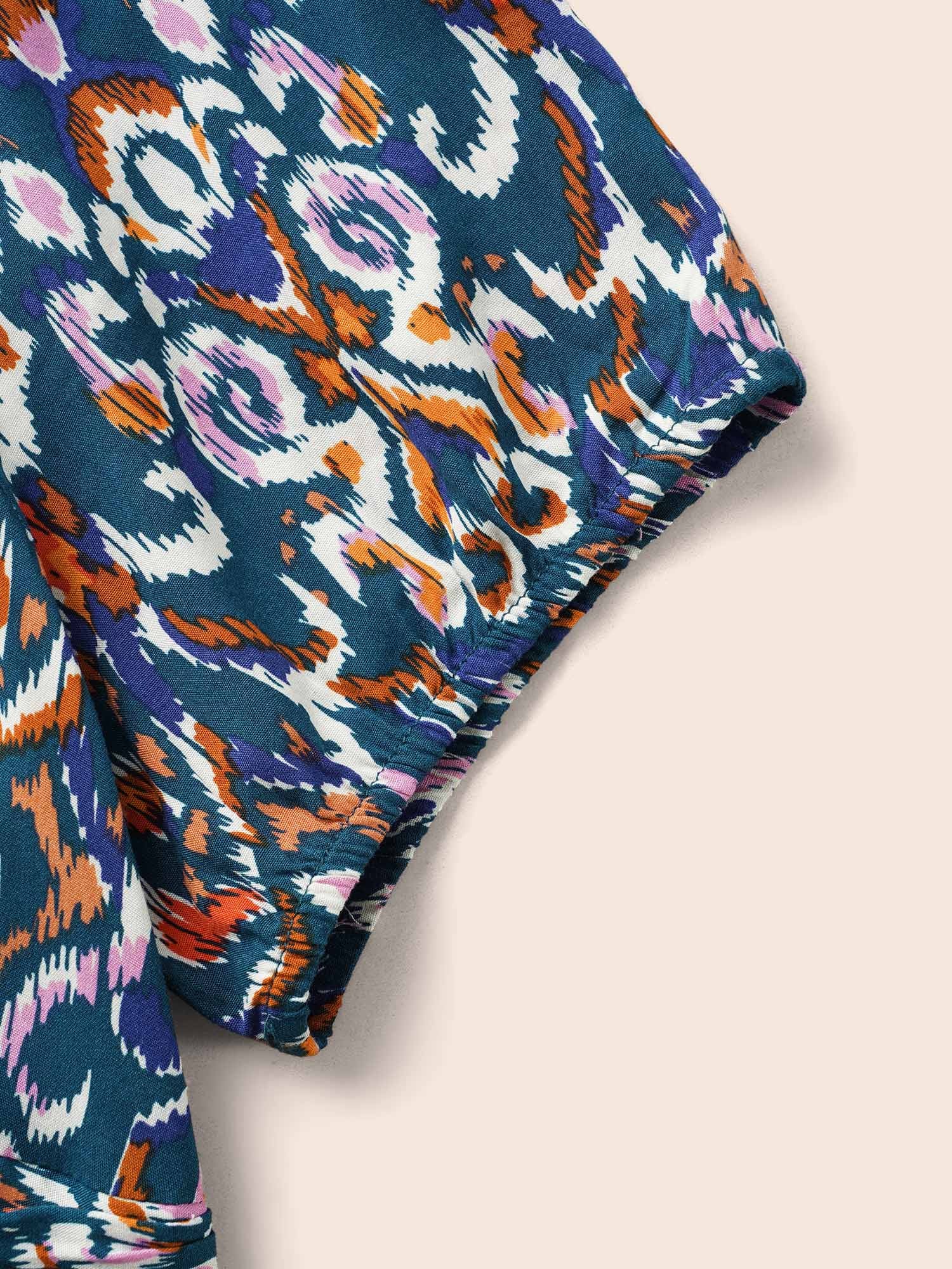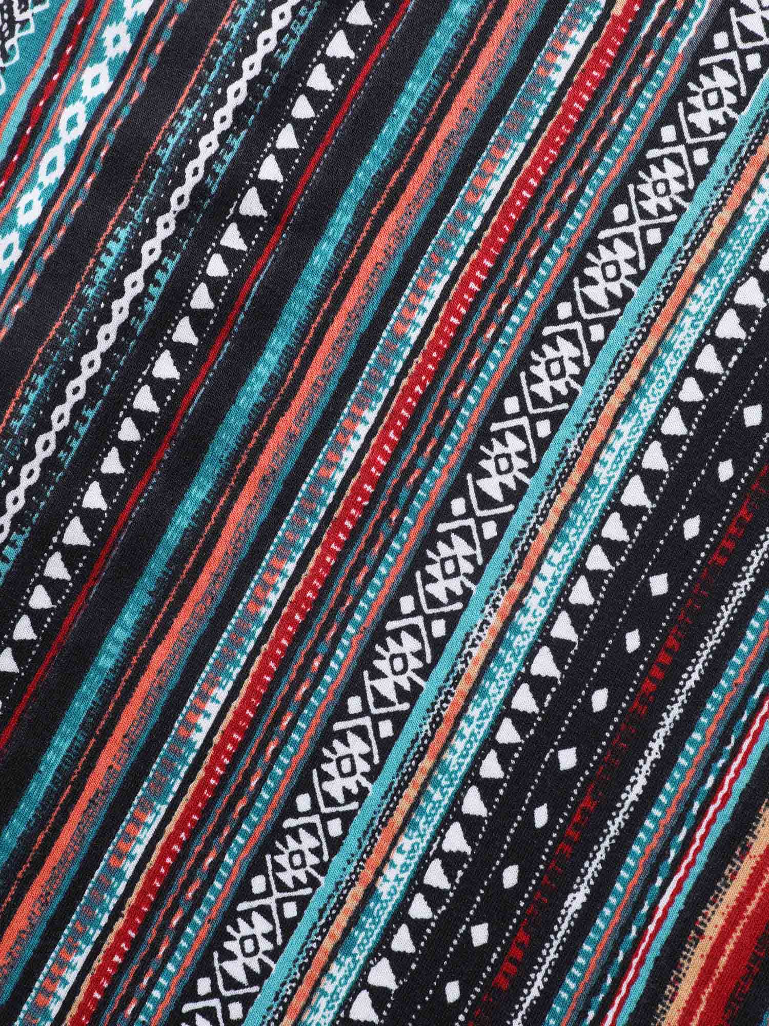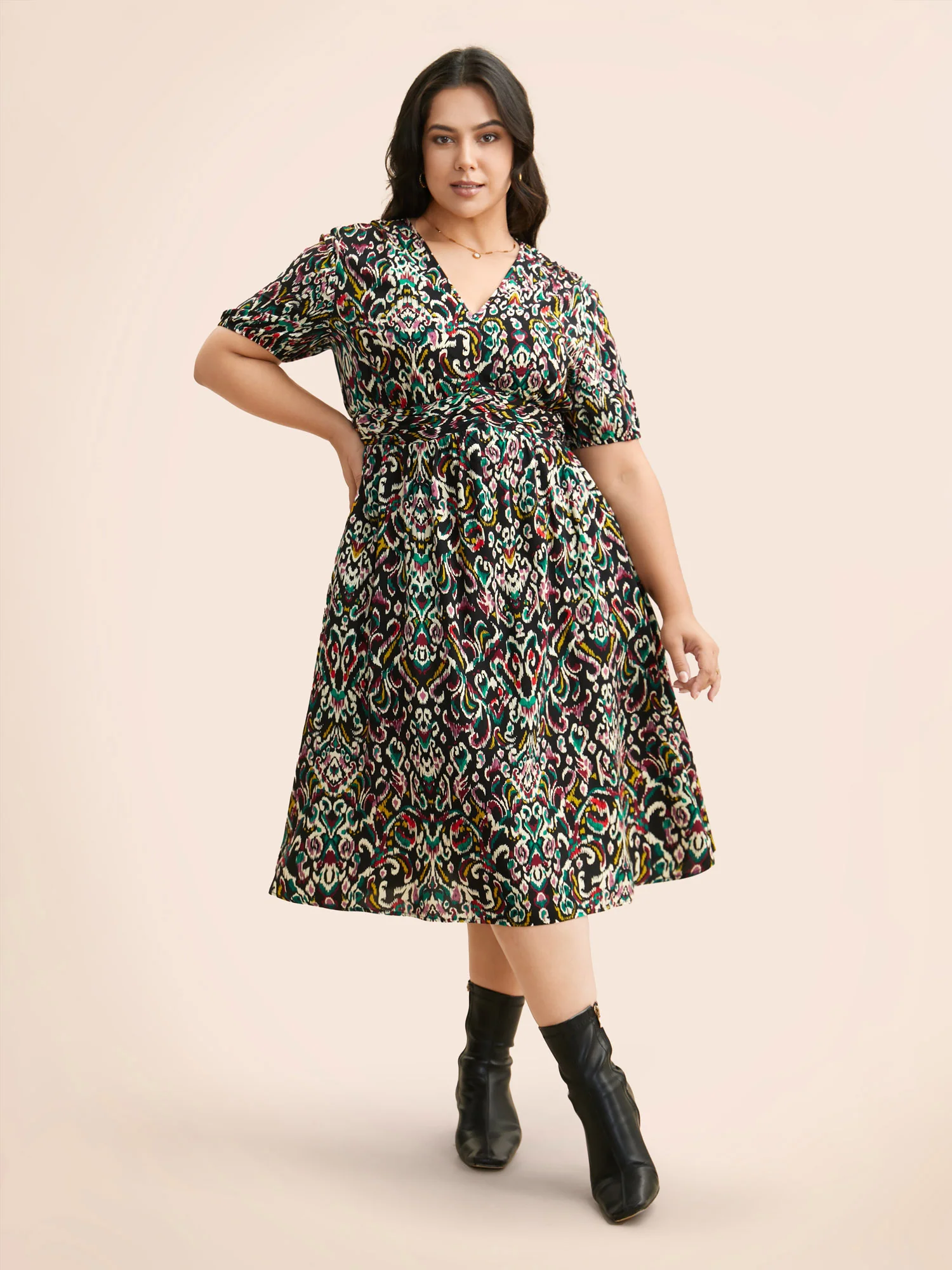 Boho Print Mock Neck Shirred Ruffle Cap Sleeve Dress