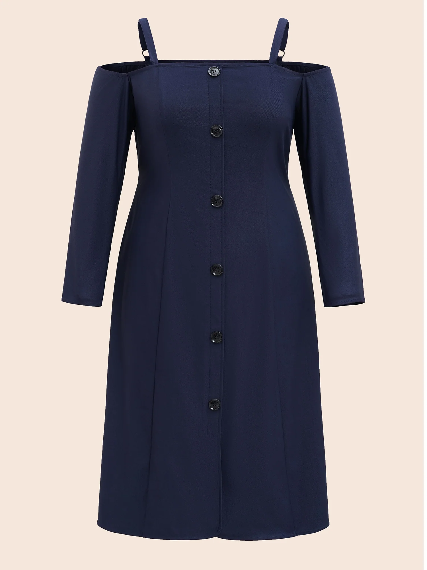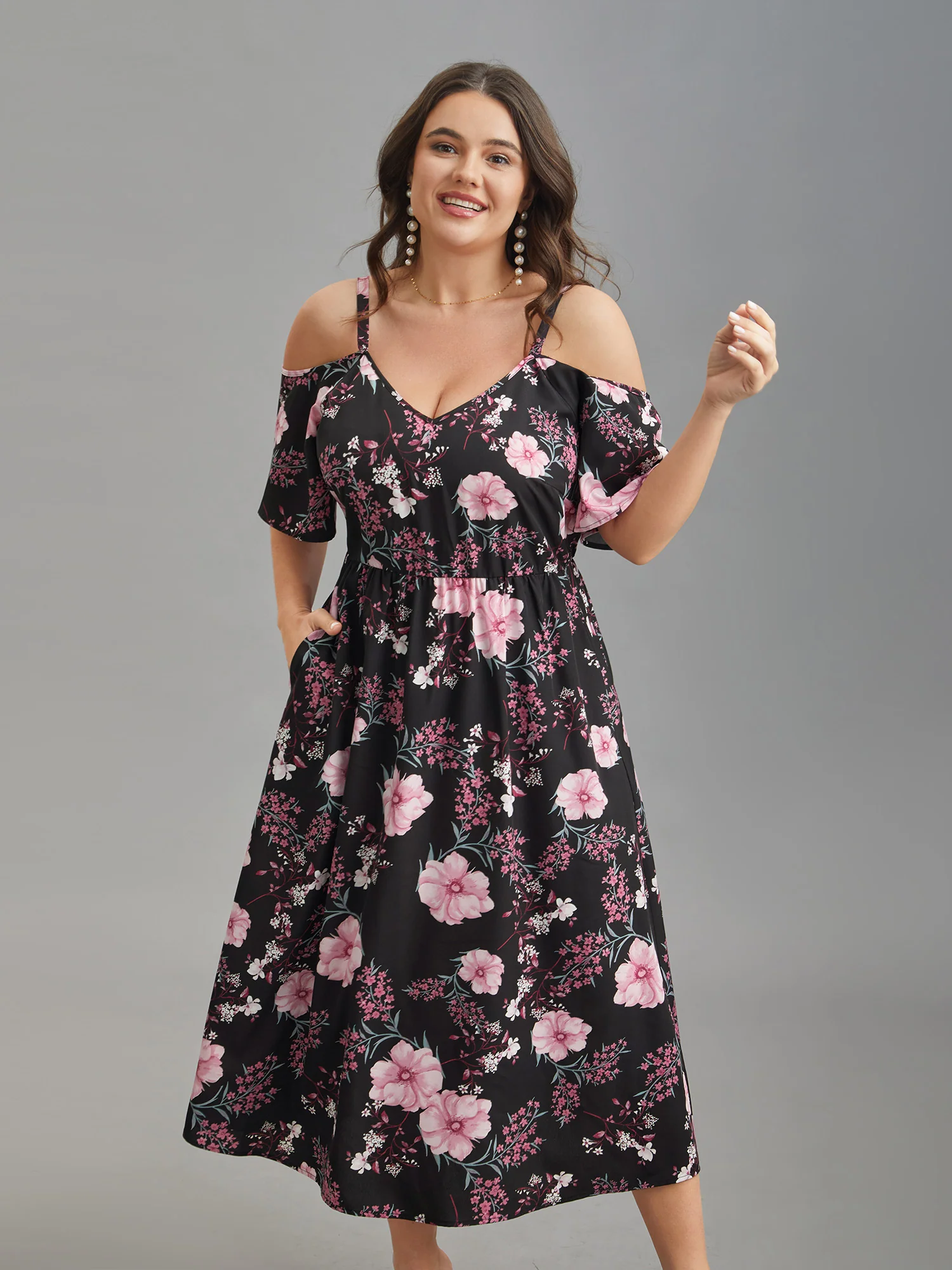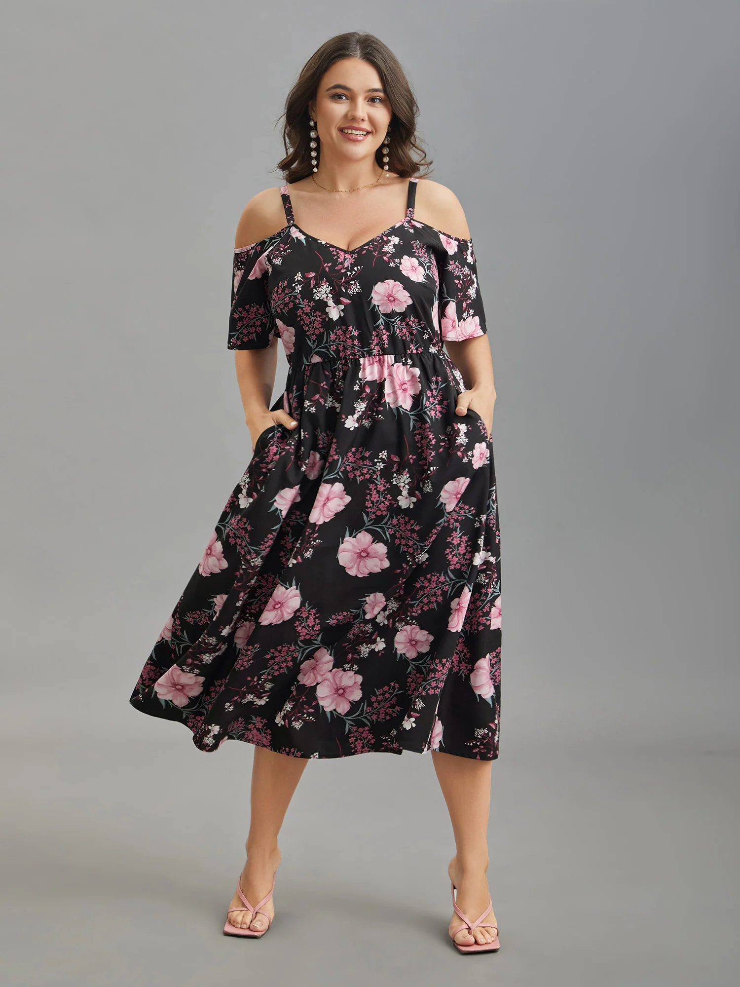 Floral Print Cold-Shoulder Pockets Midi Dress