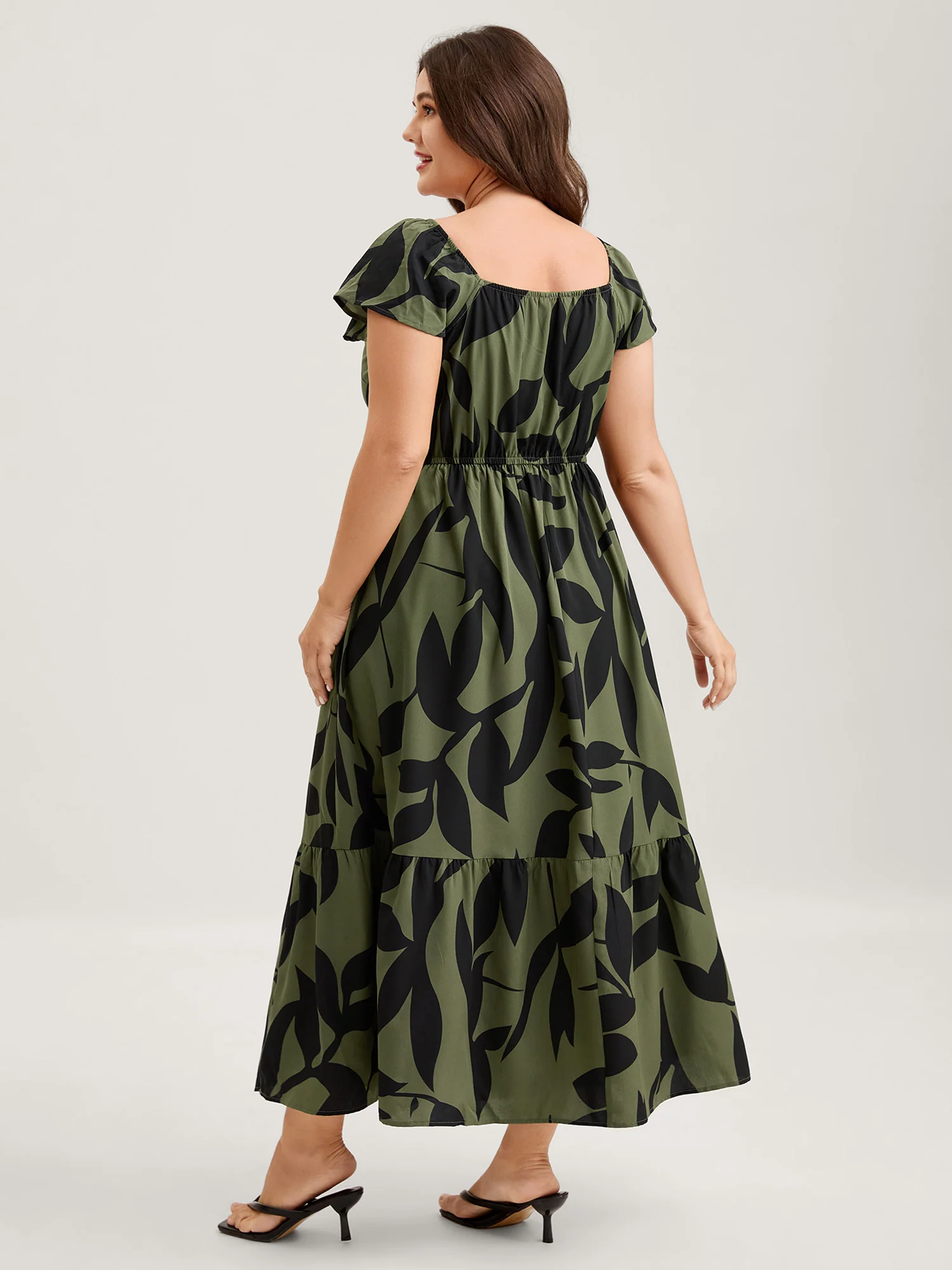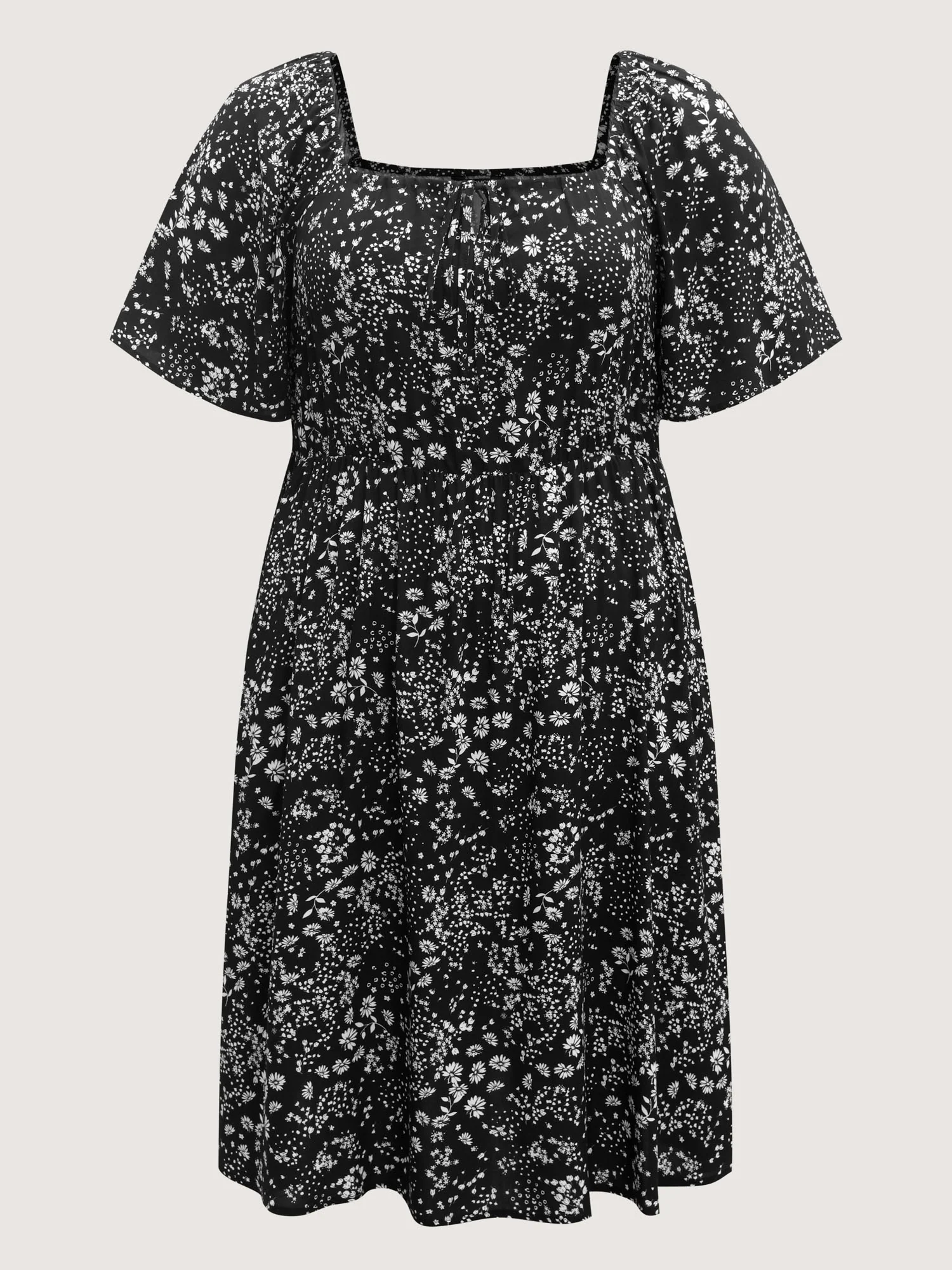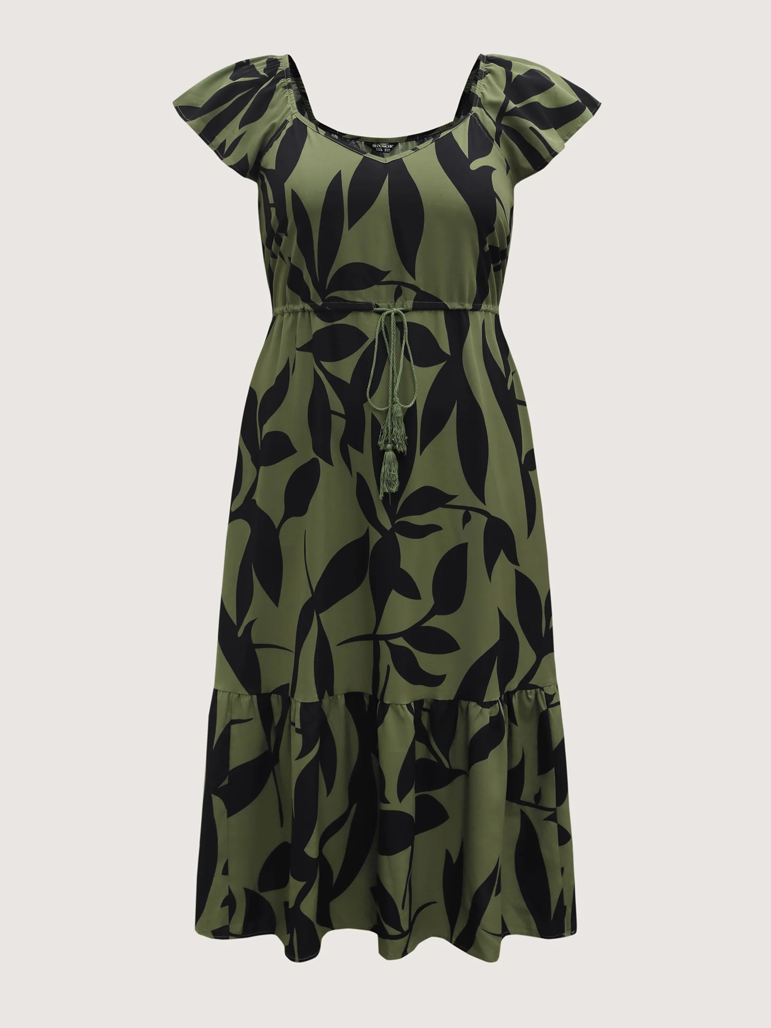 Floral Neck Drawstring Flared Sleeve Midi Dress