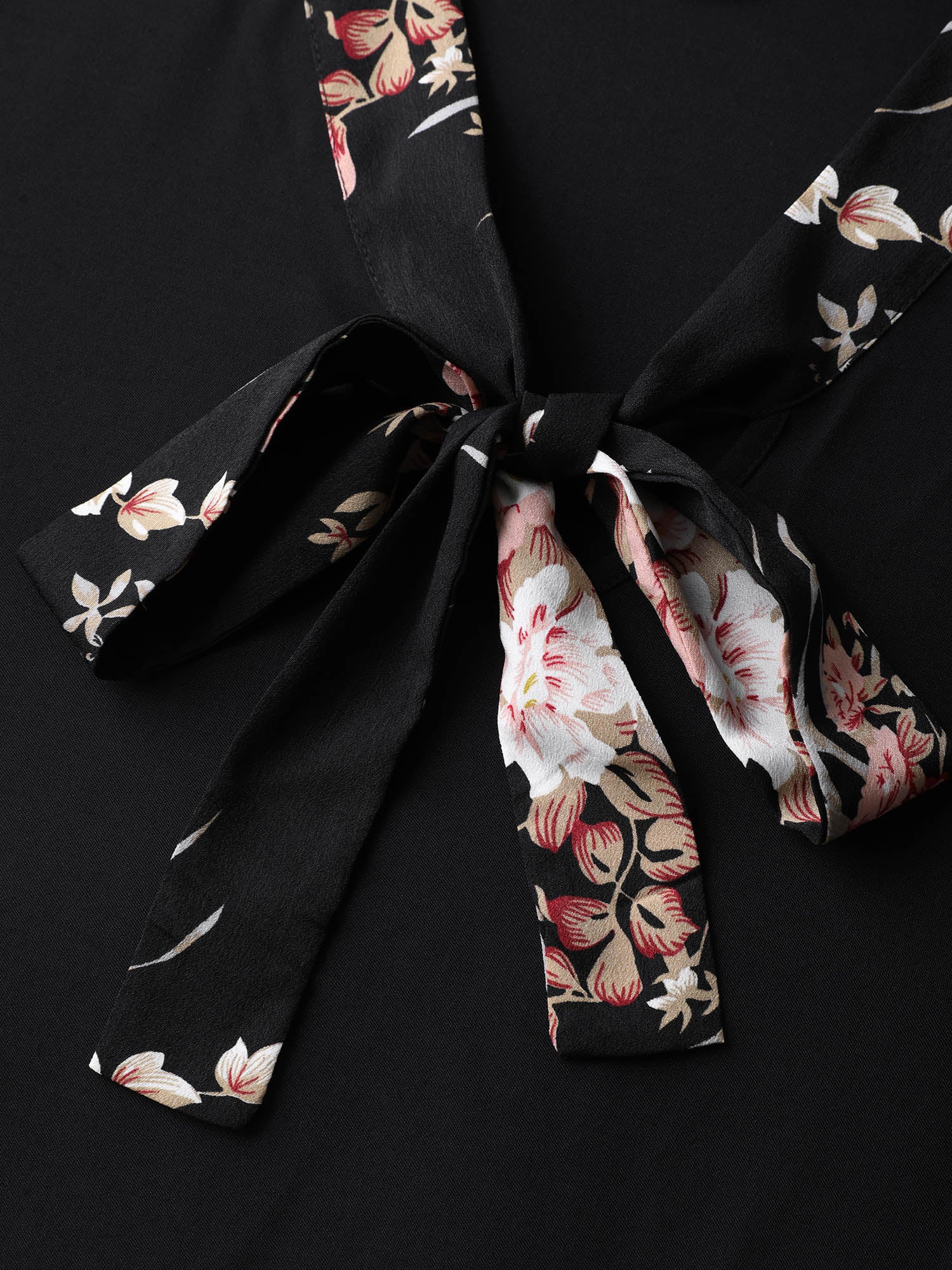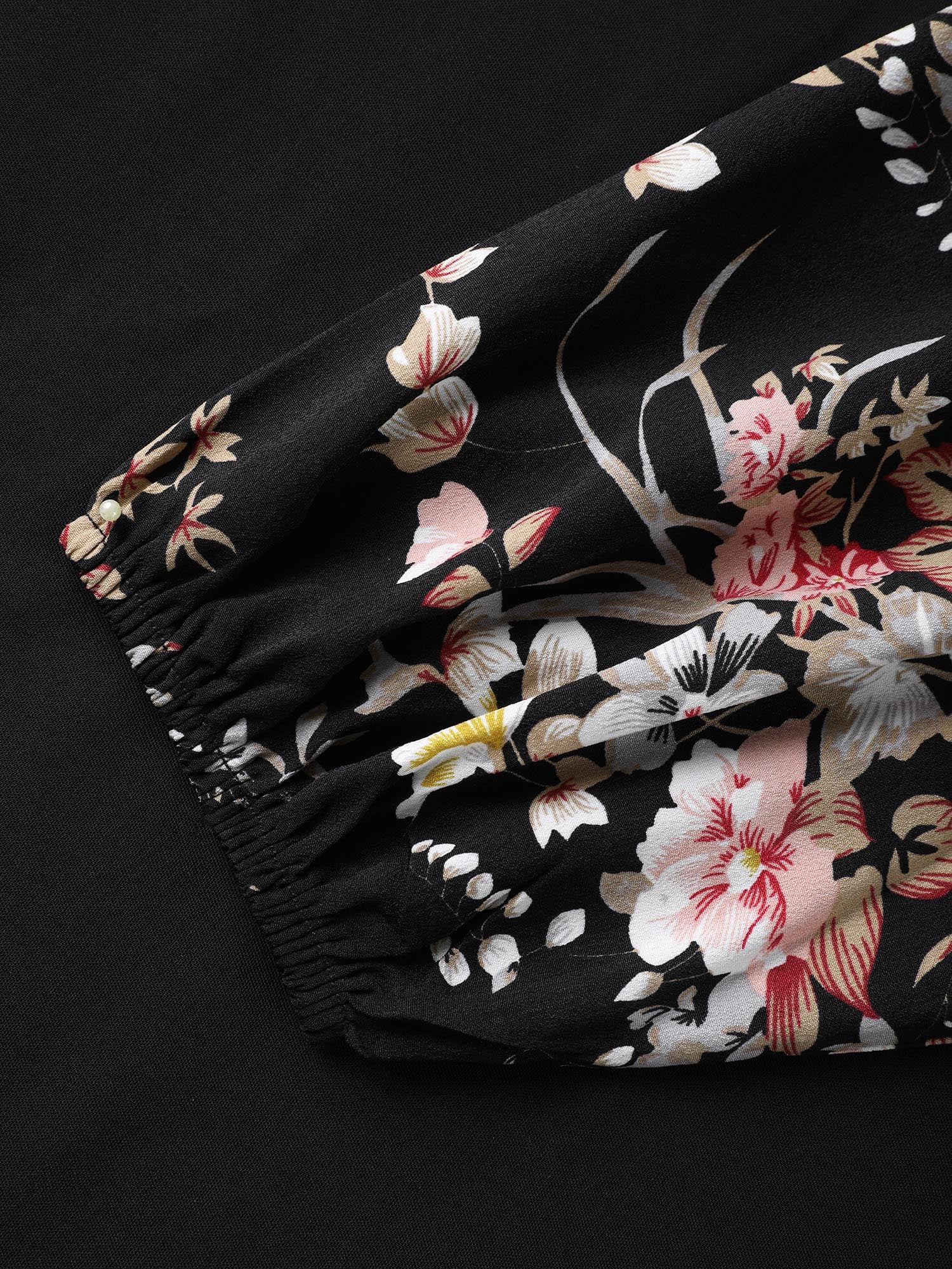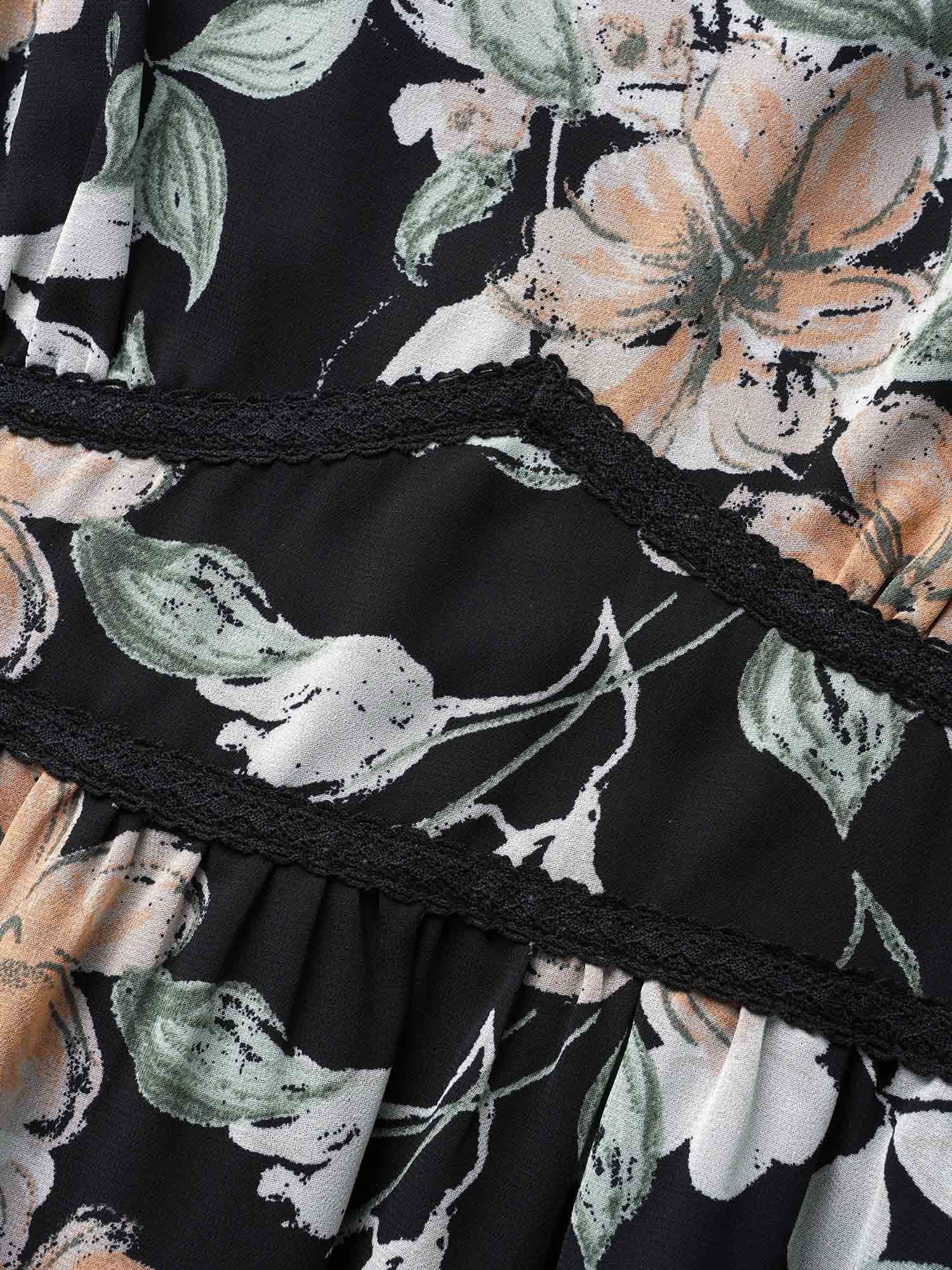 Floral Neck Drawstring Flared Sleeve Midi Dress
