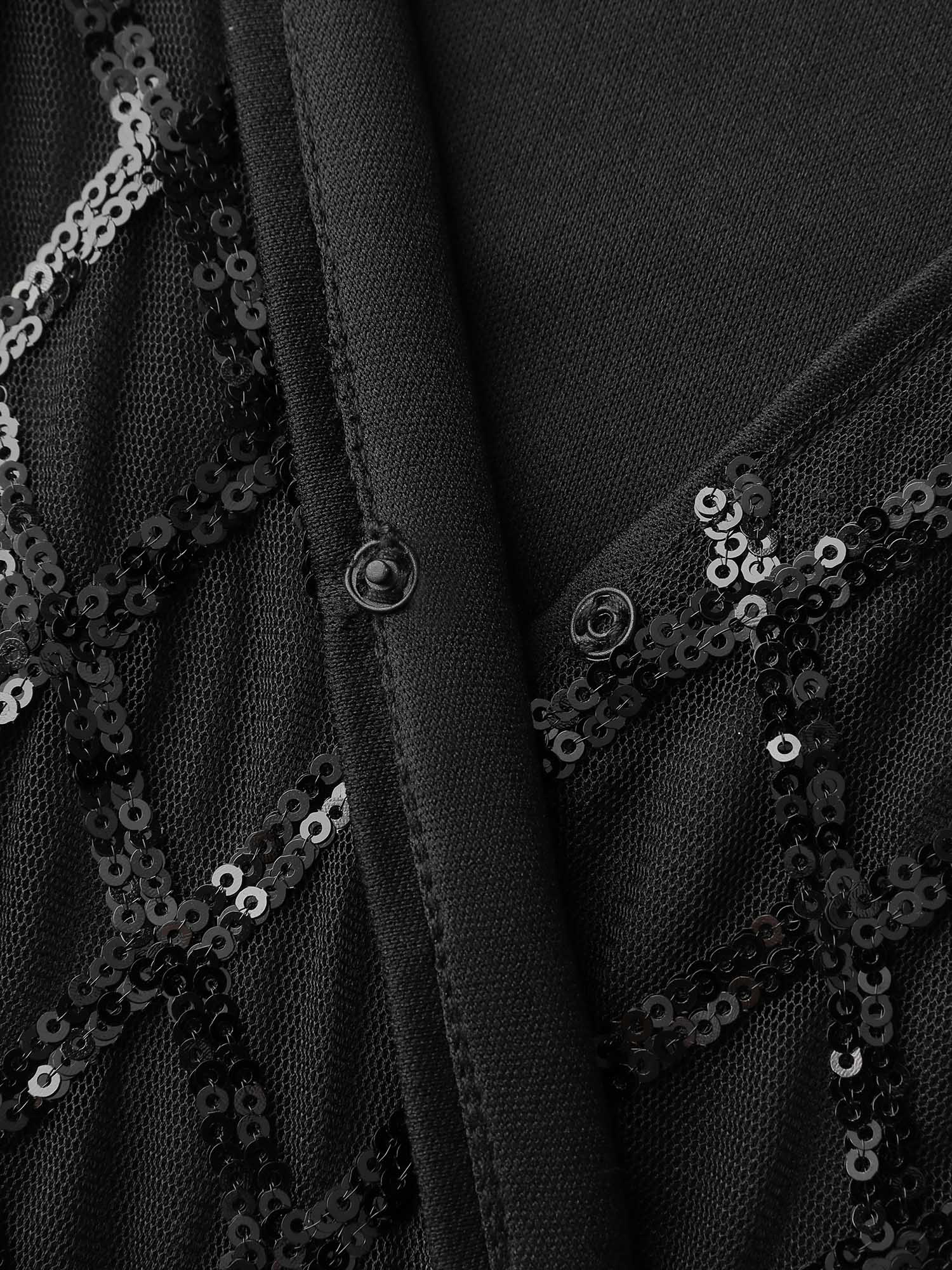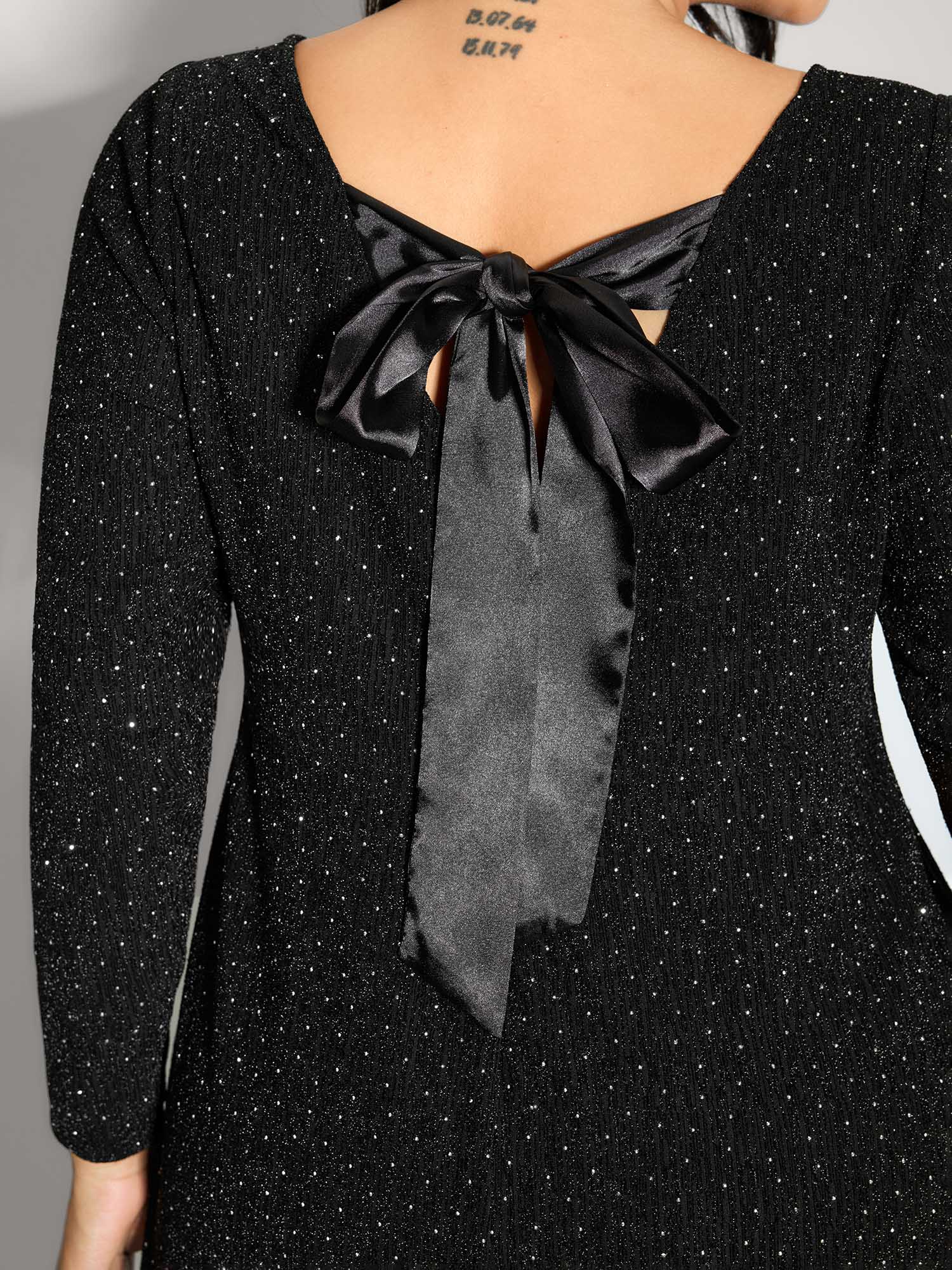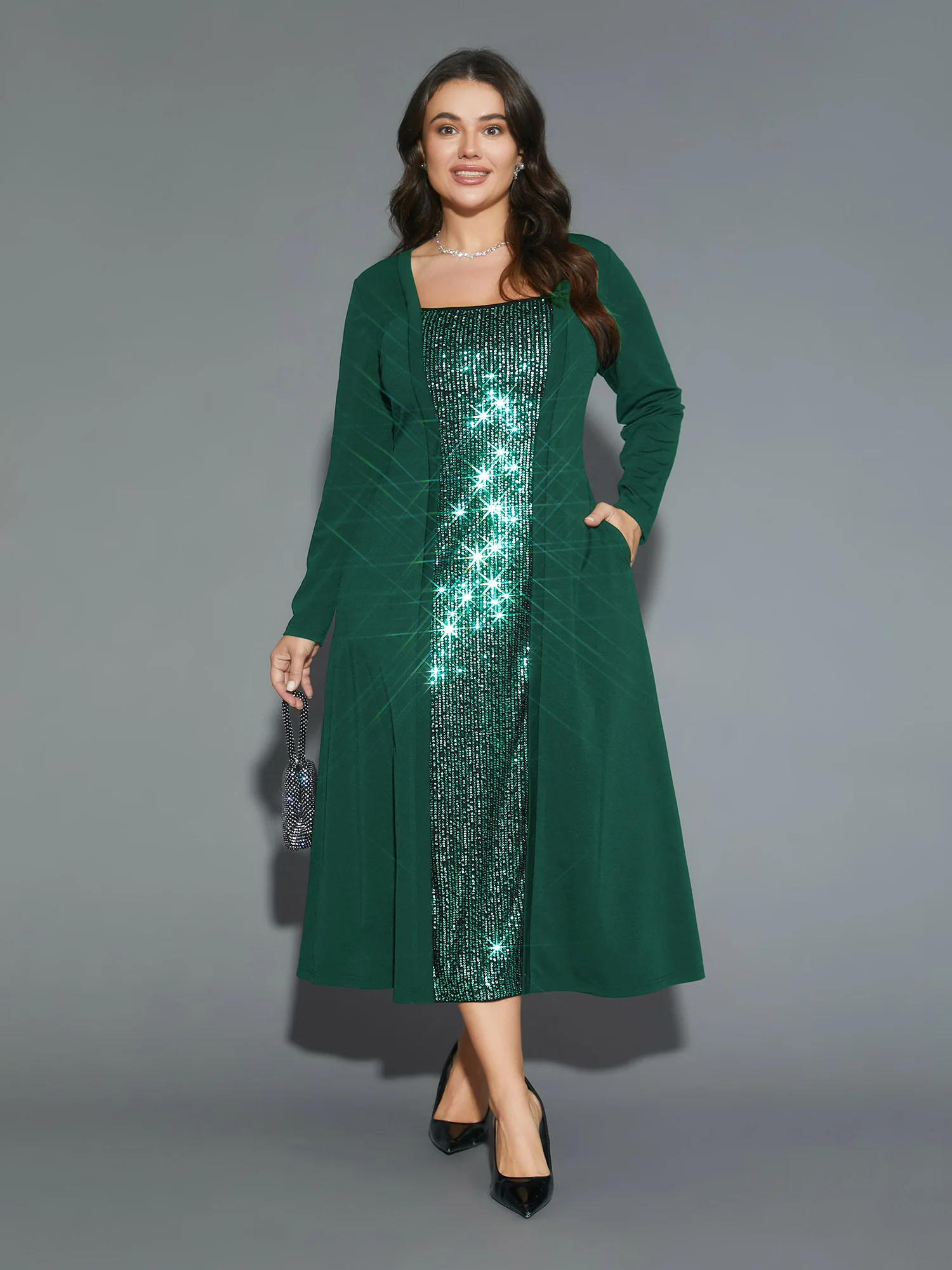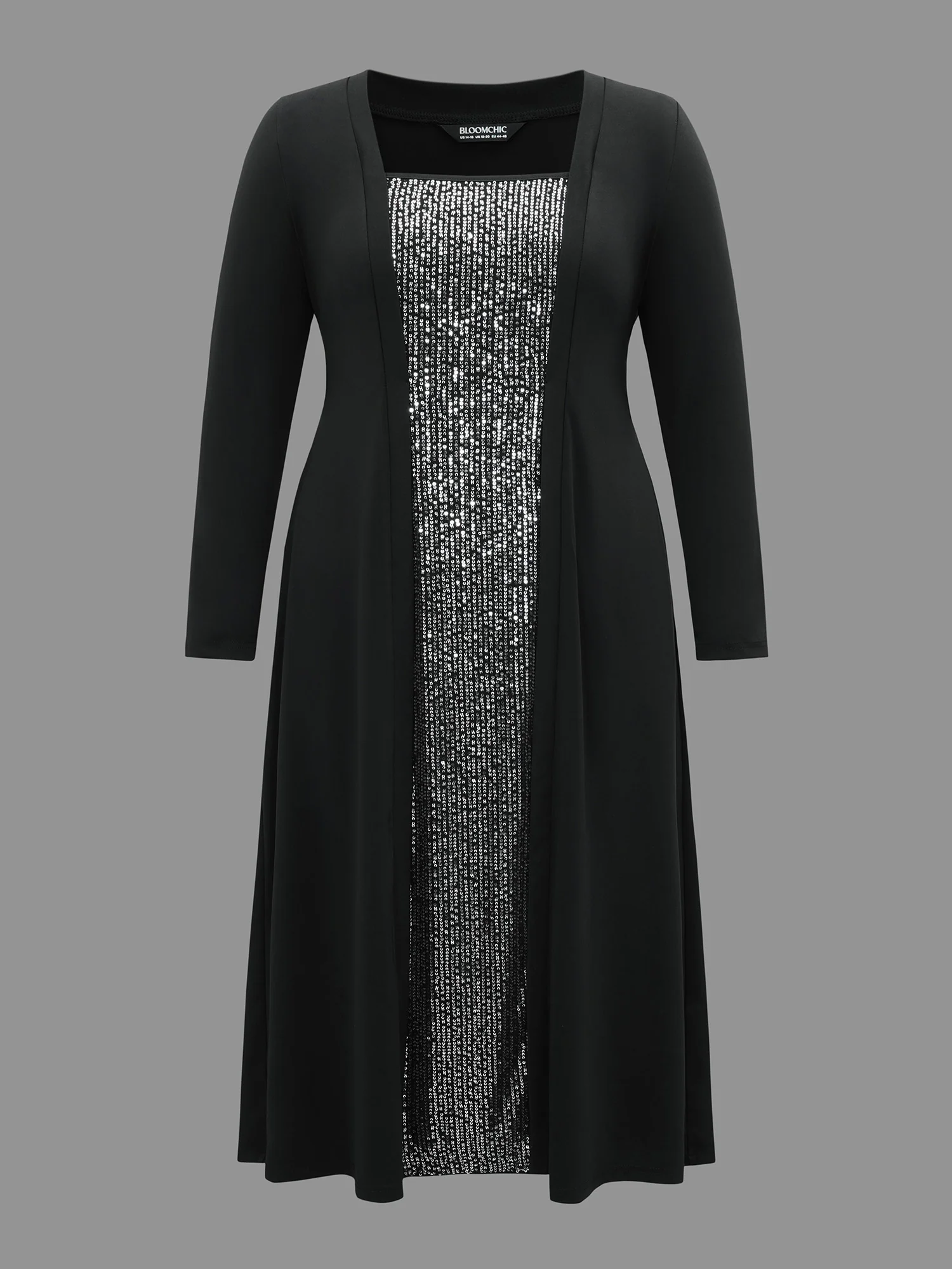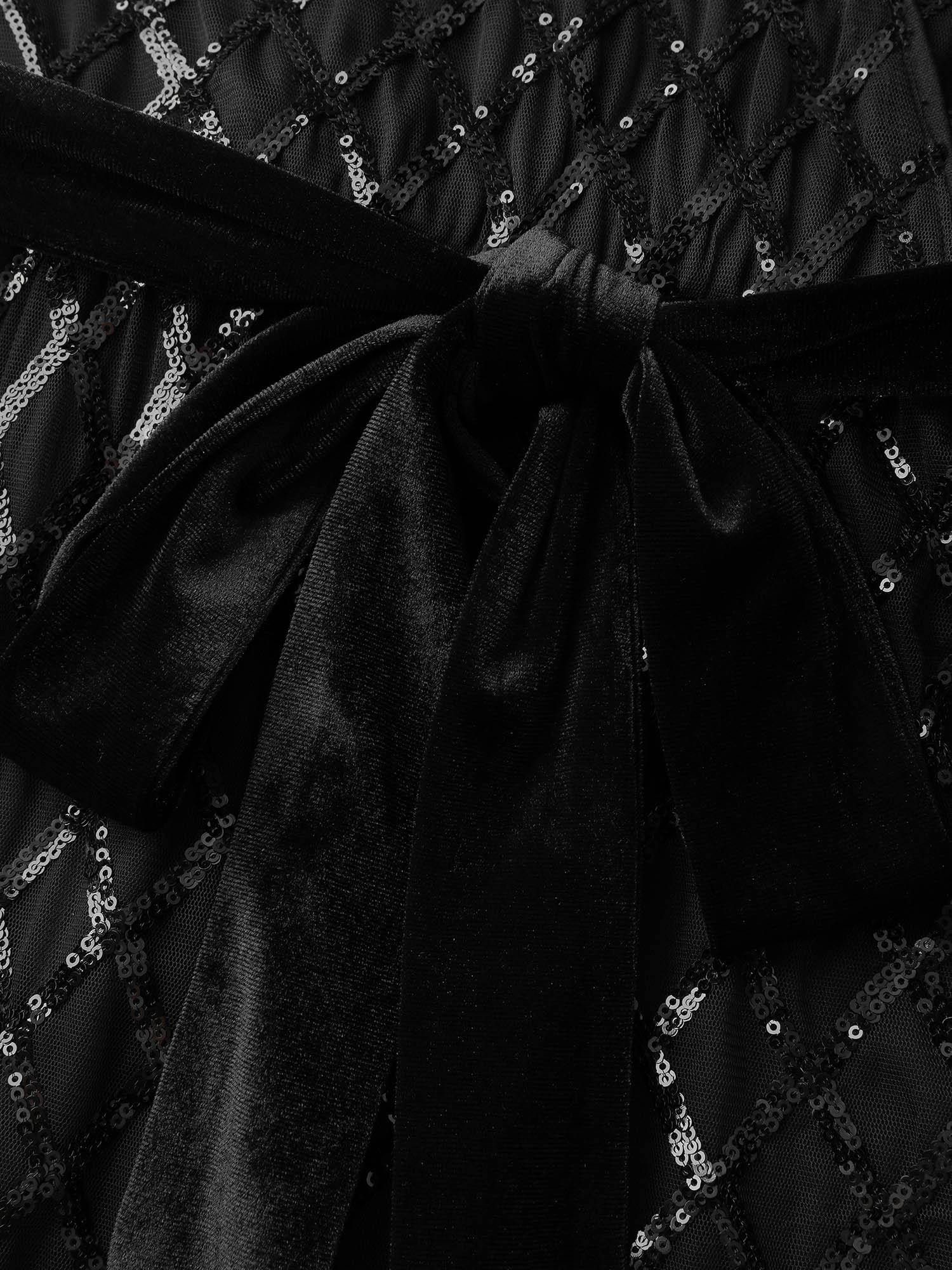 Sheer Sequin Belted Stretchy Waist Midi Dress