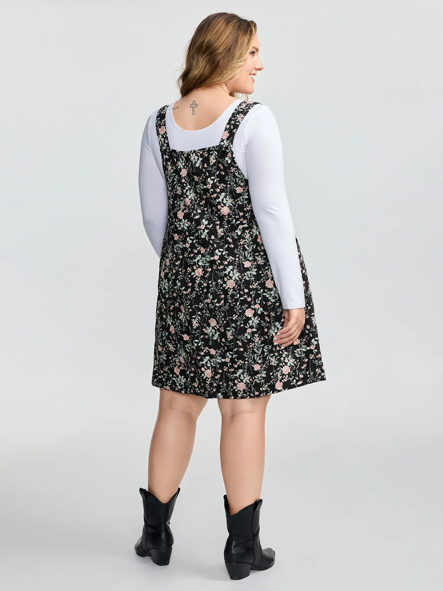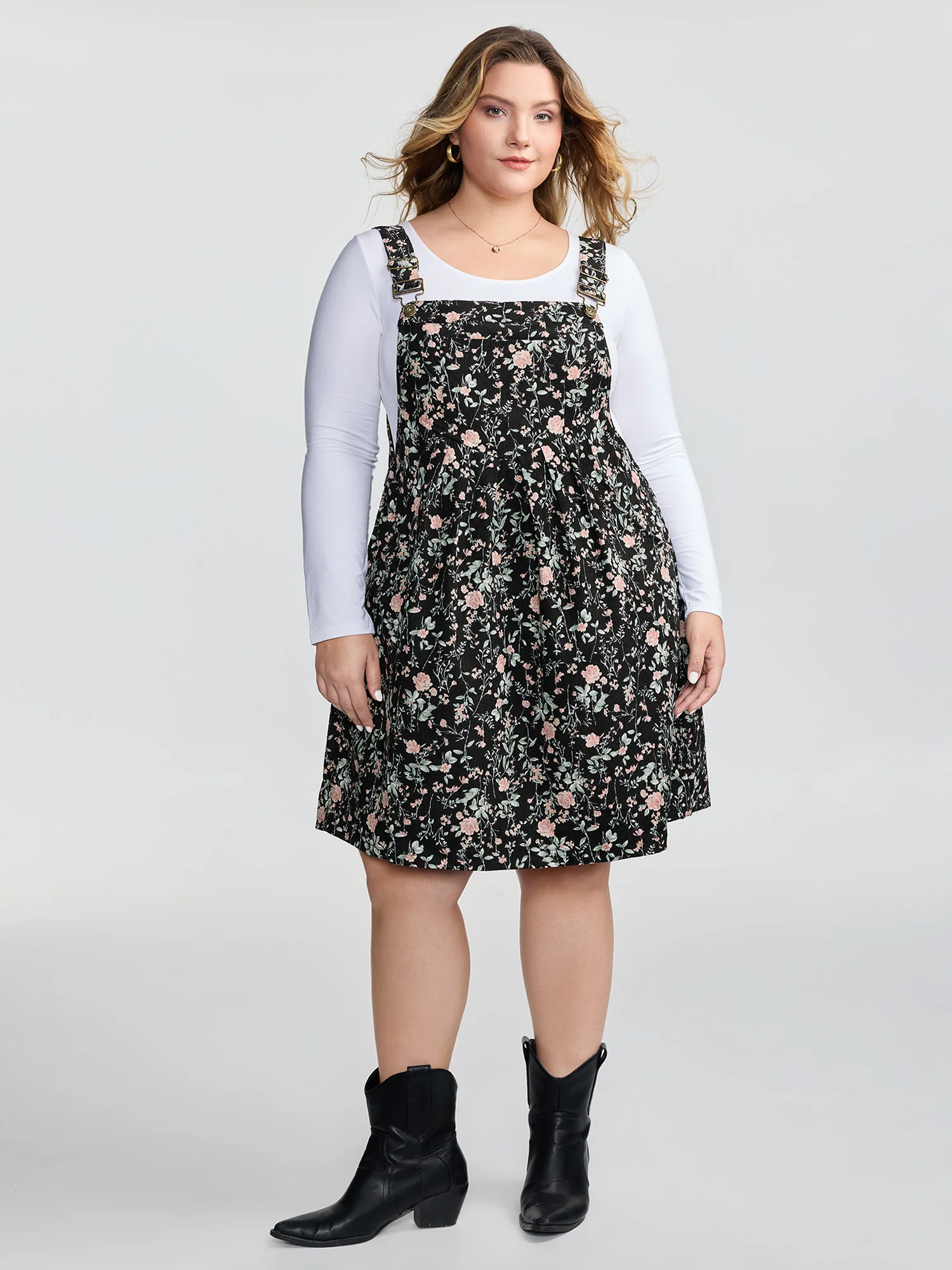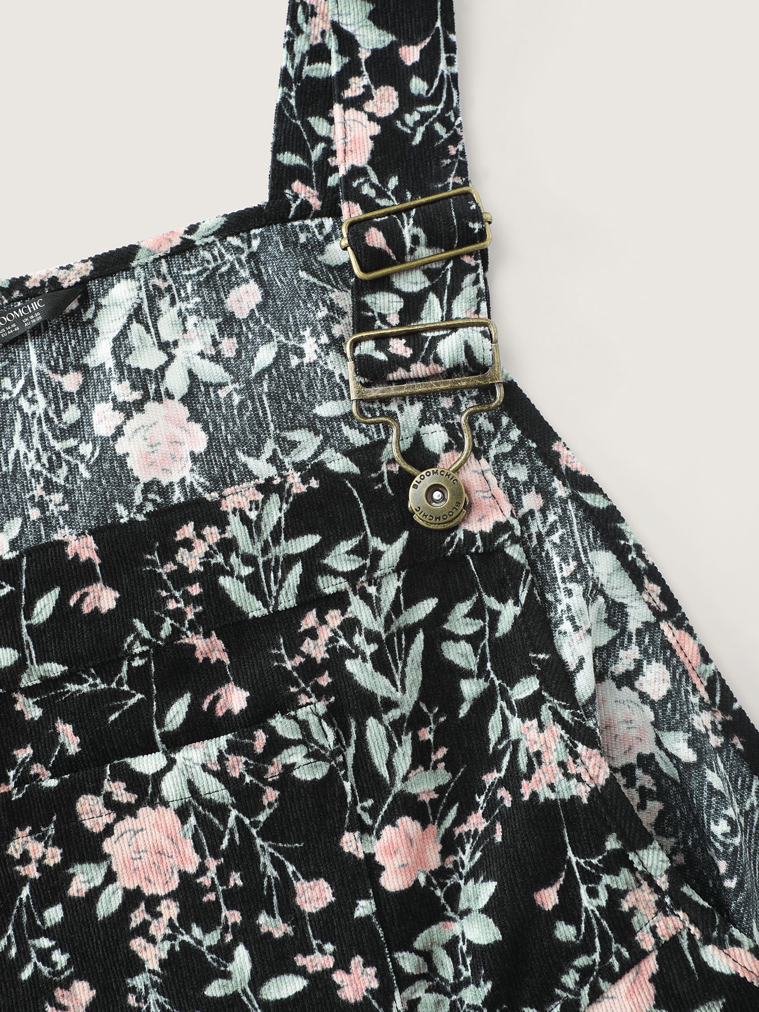 Floral Corduroy Adjustable Overall Strap Knee Dress
