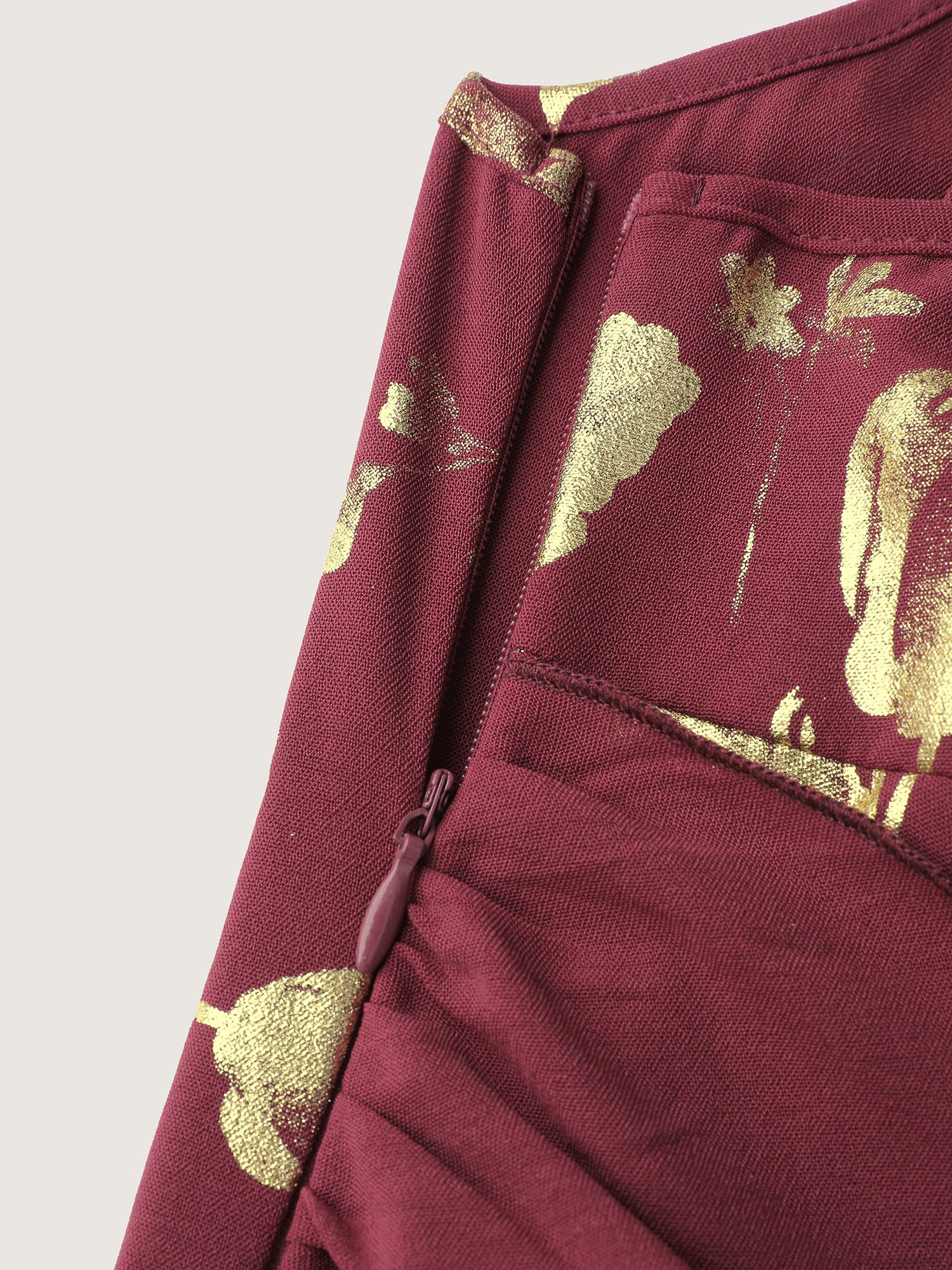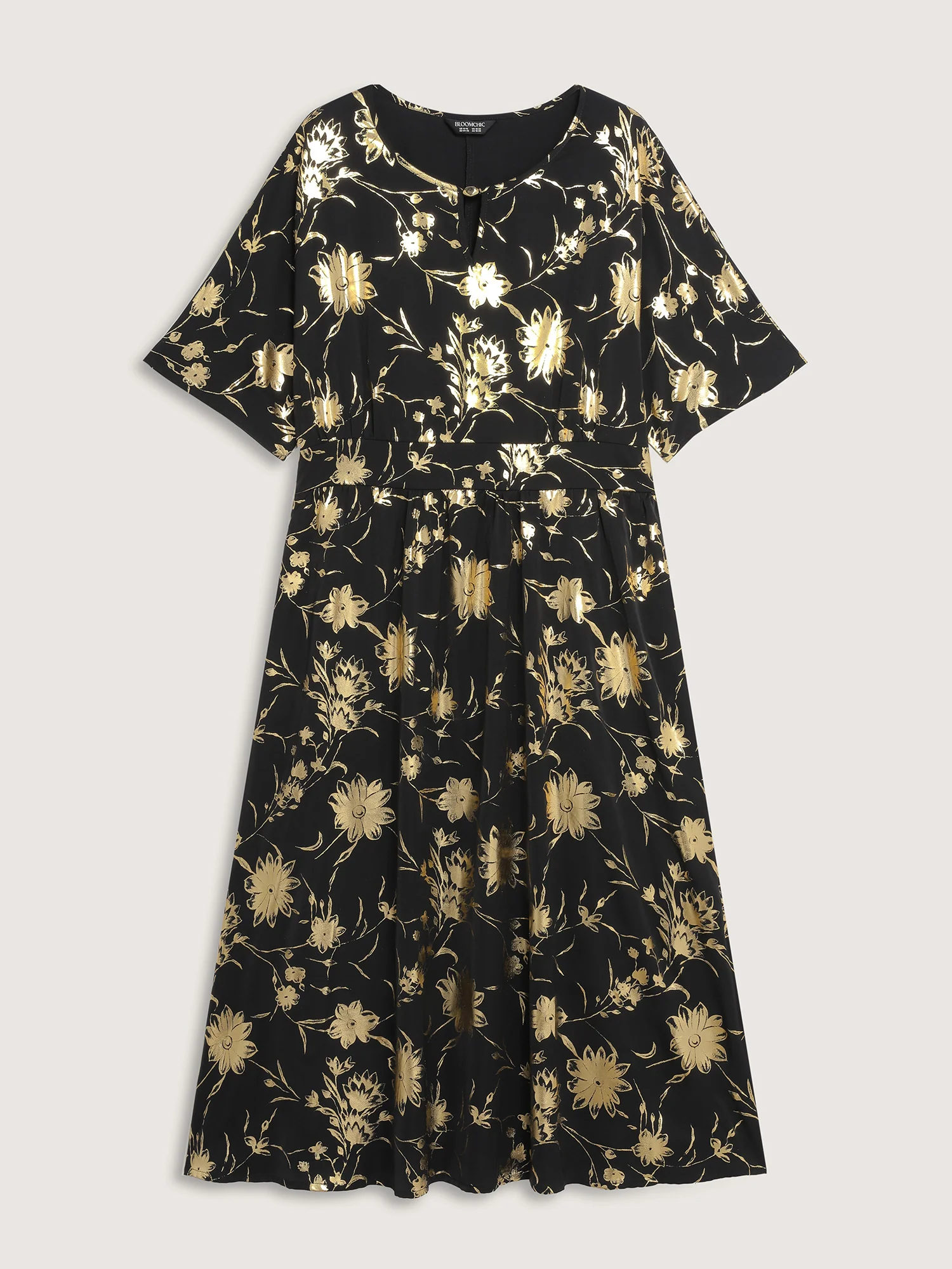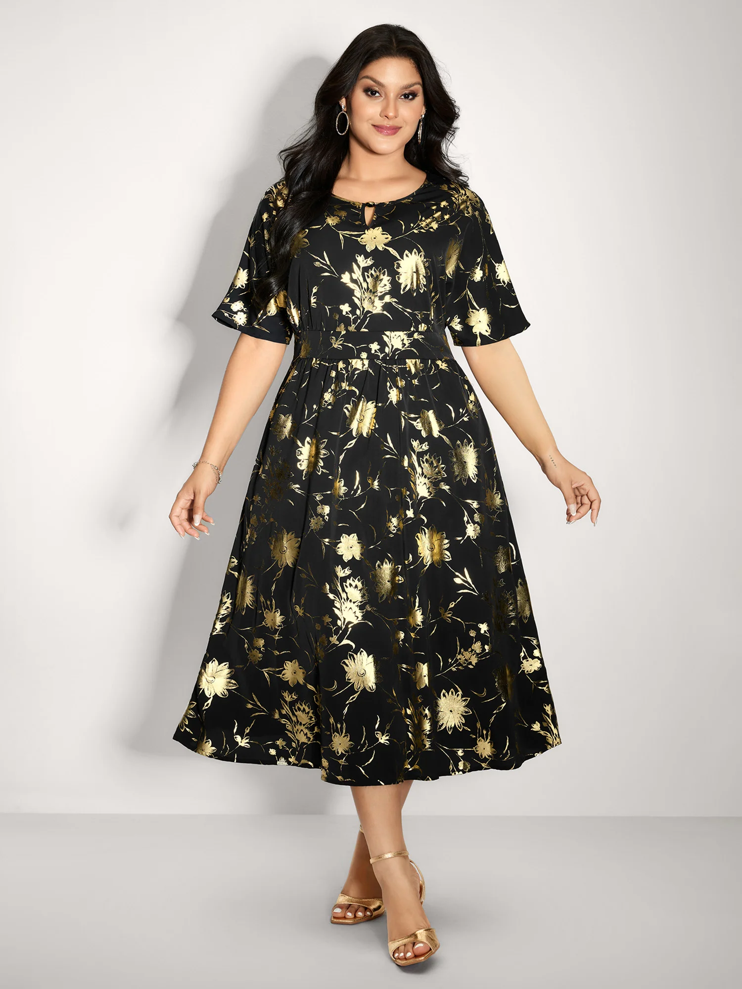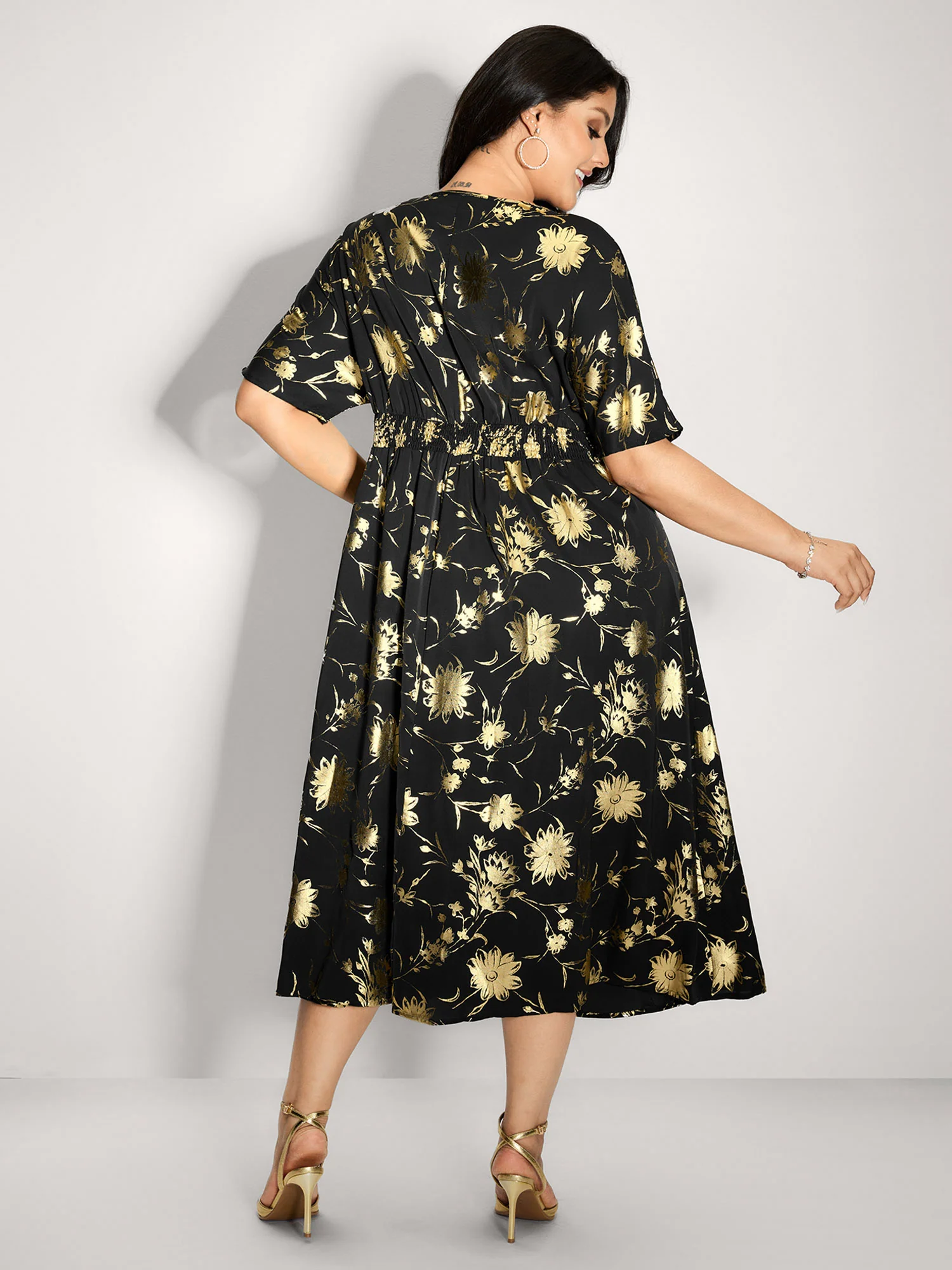 Gold Stamped Chiffon Shirred Waist Midi Dress