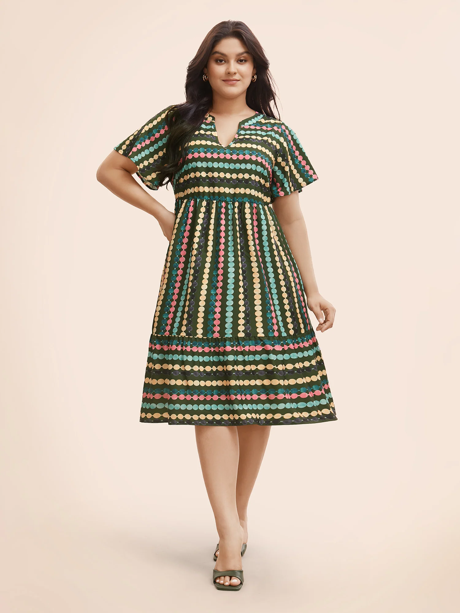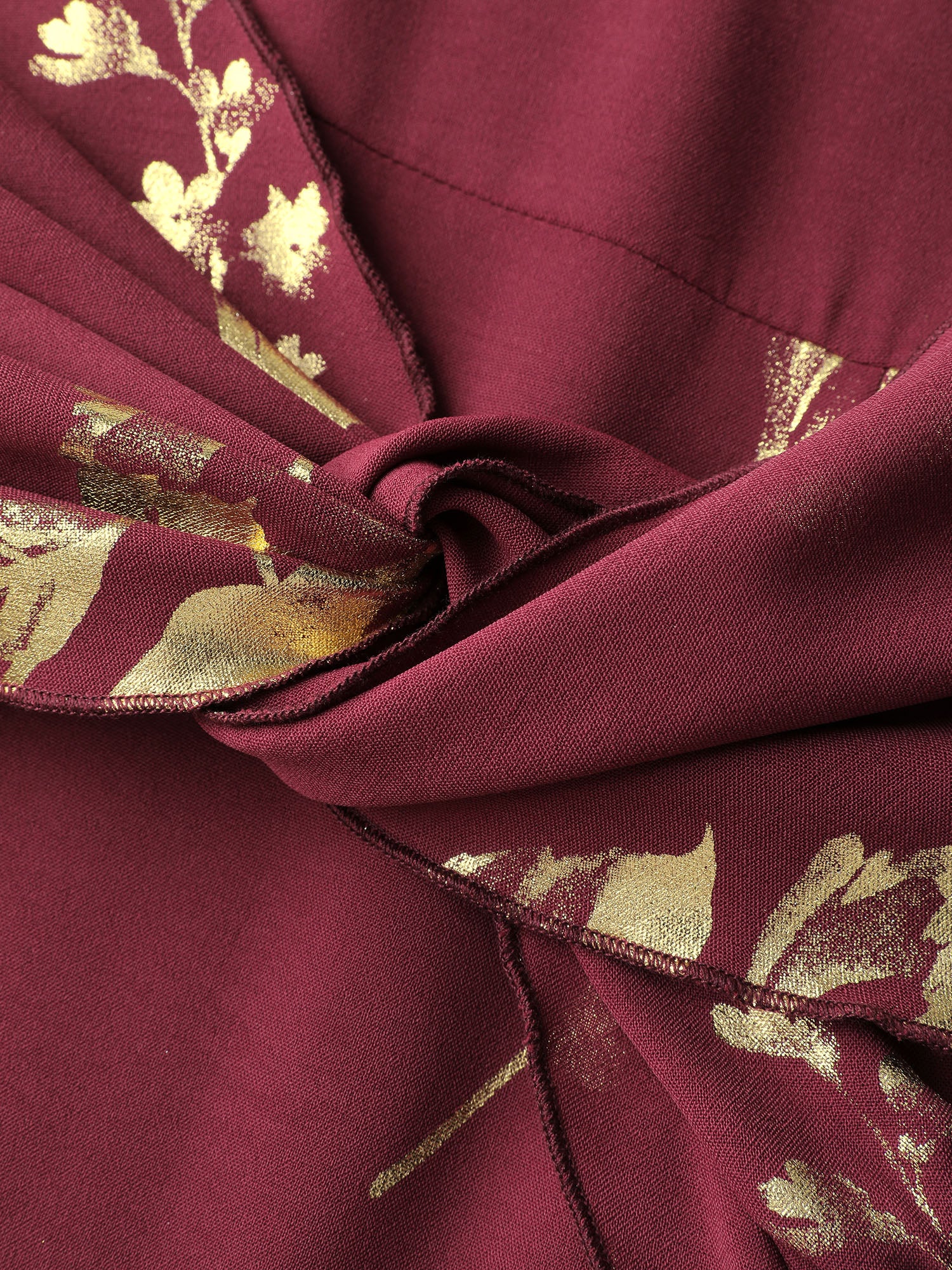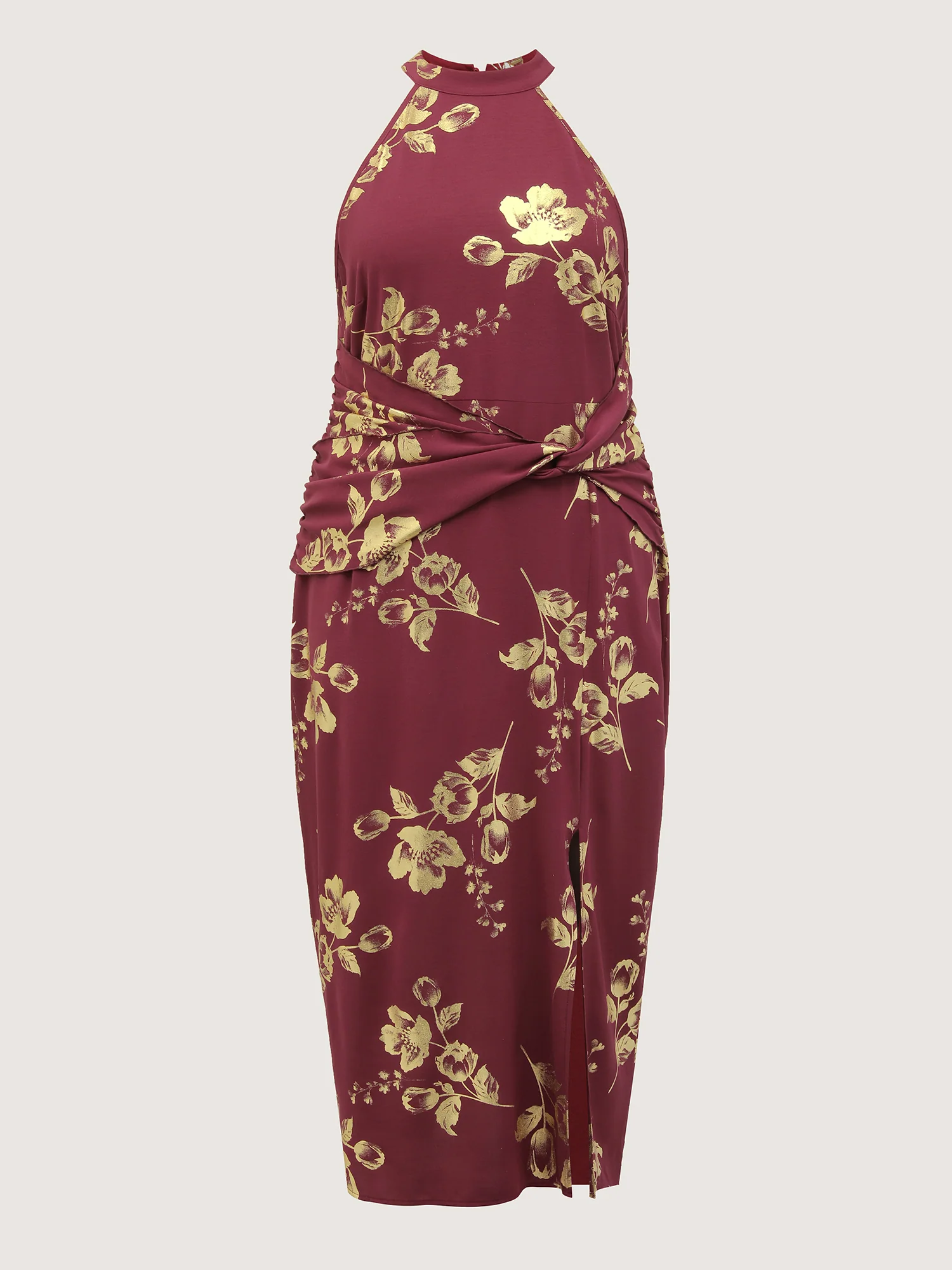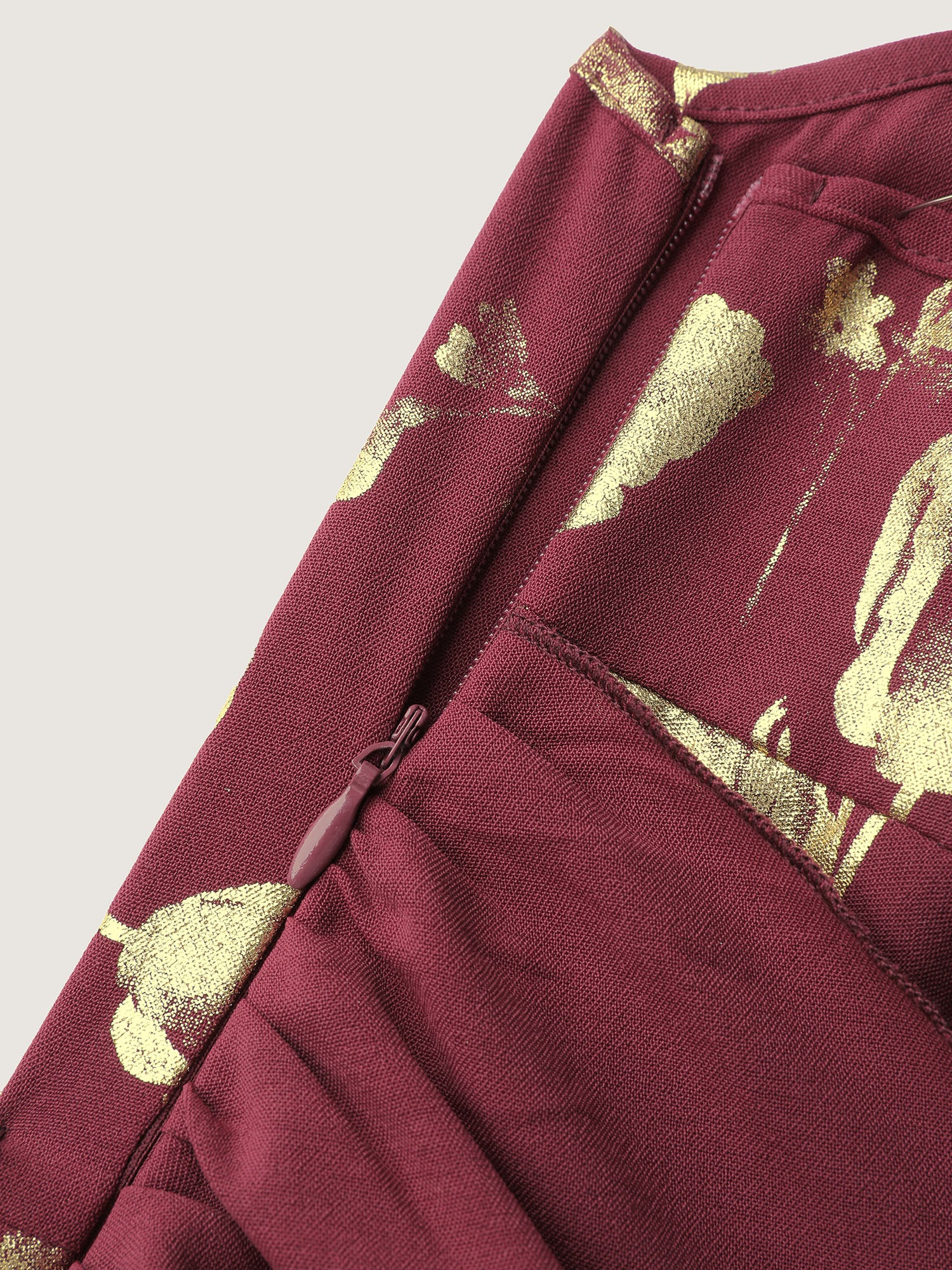 Gold Stamped Chiffon Shirred Waist Midi Dress