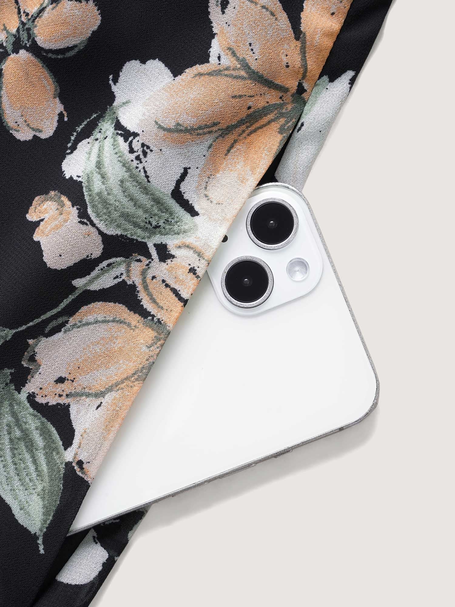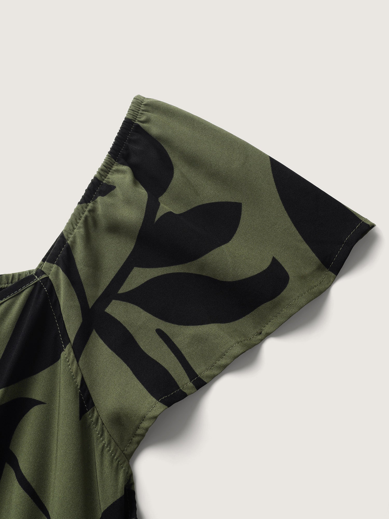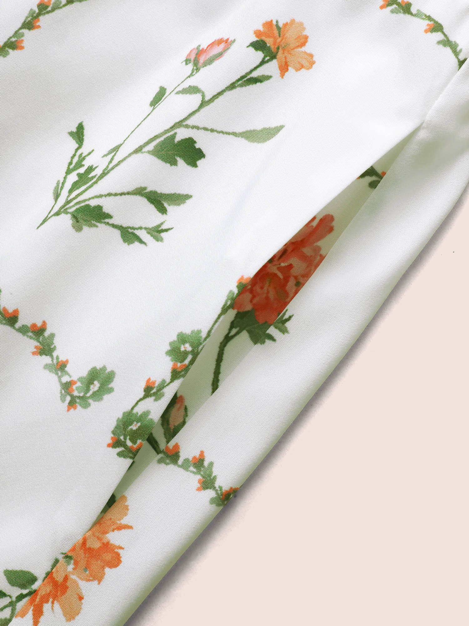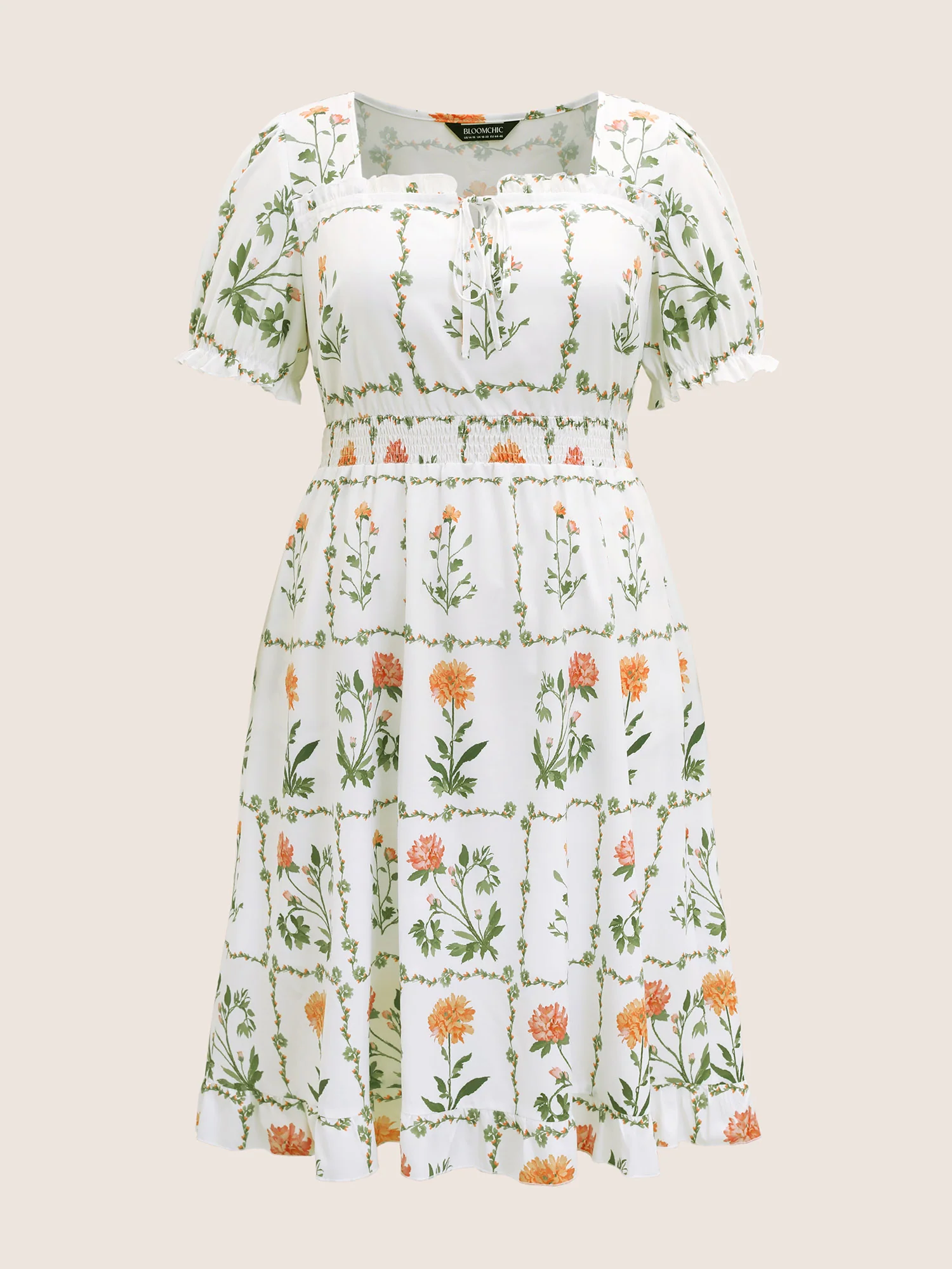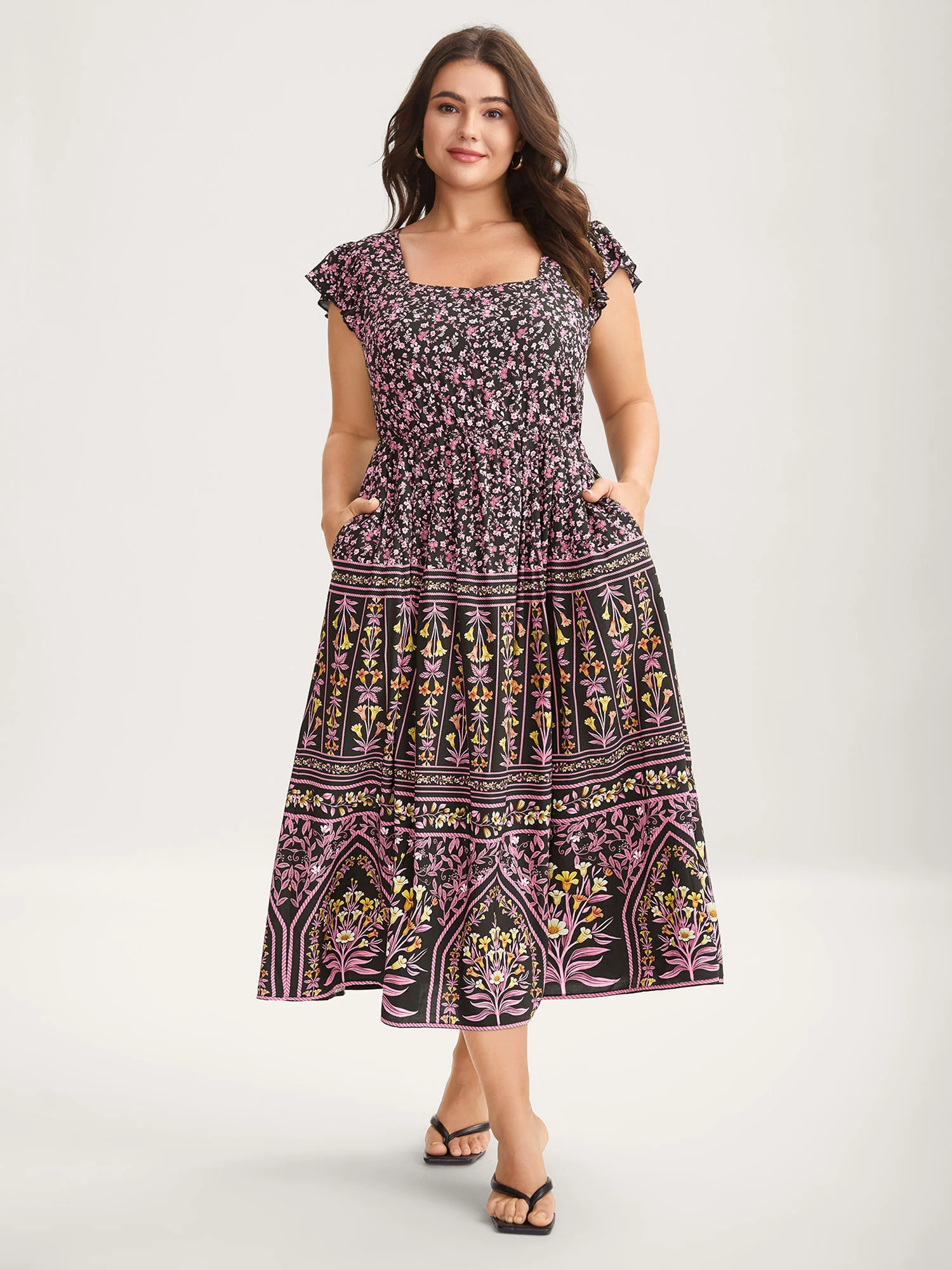 Floral Square Neck Ruffles Pocket Shirred Split Dress