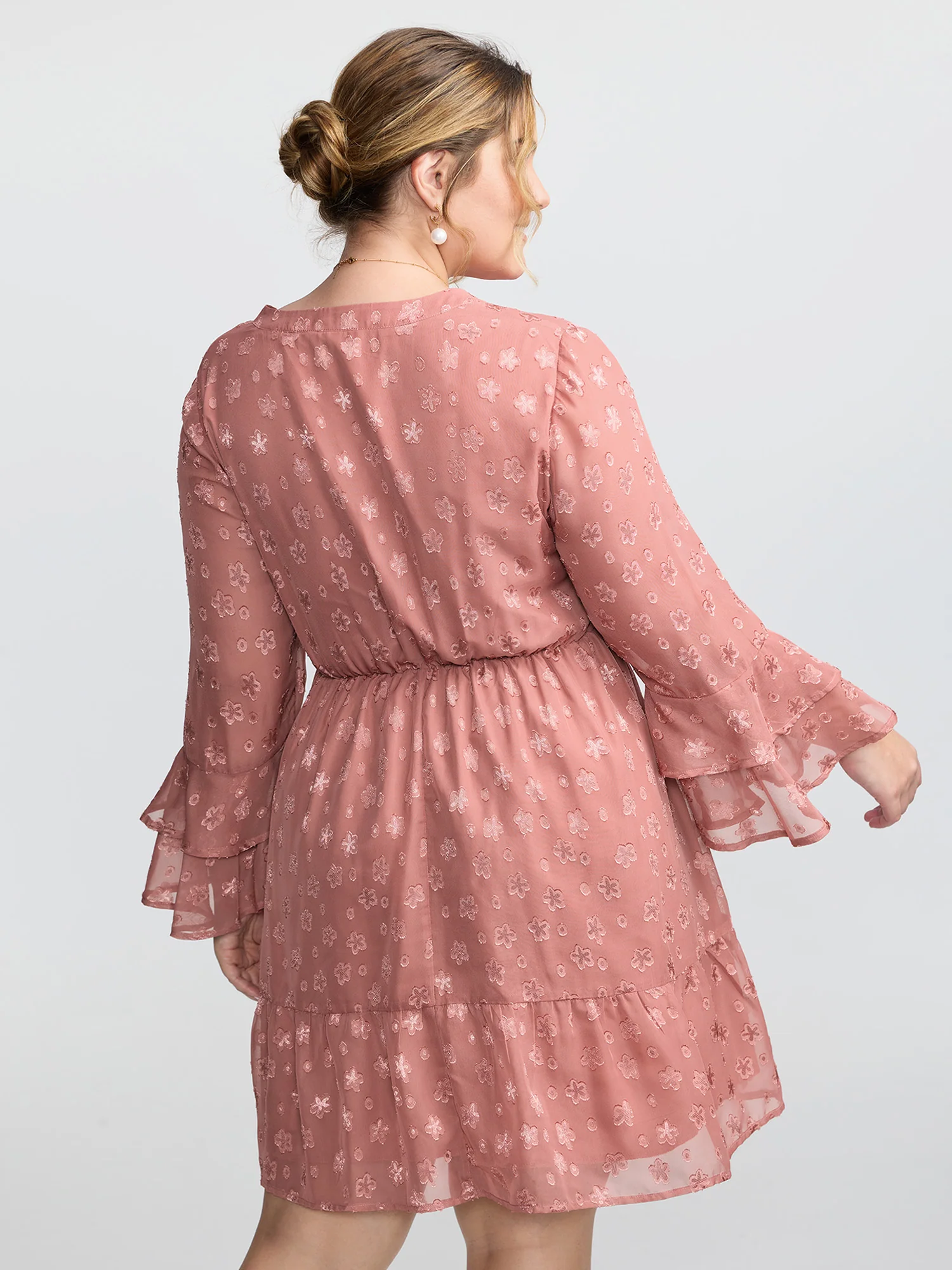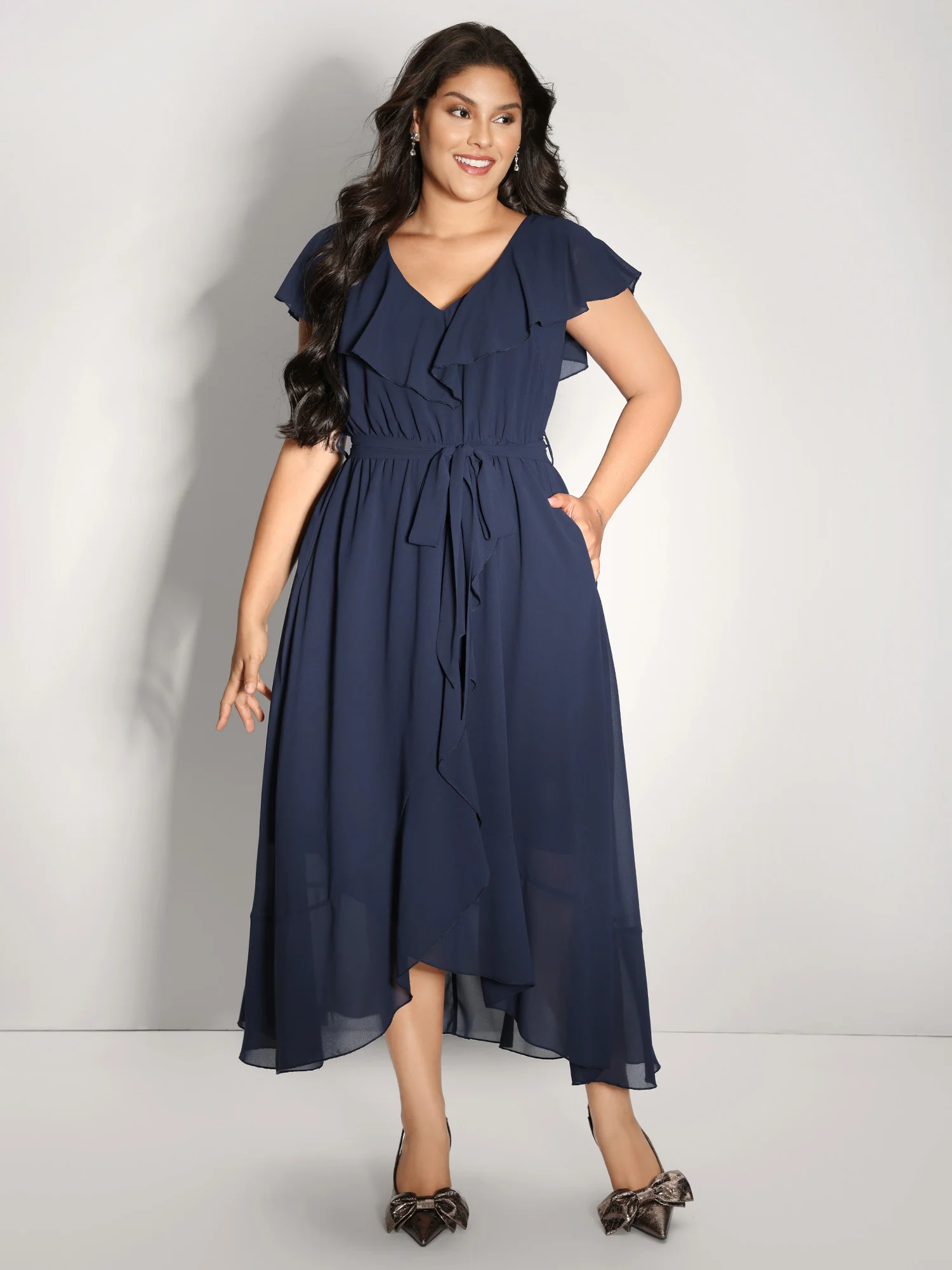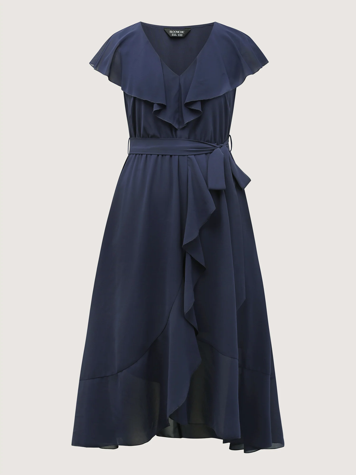 Chiffon Overlap Collar Ruffle Sleeve Dress