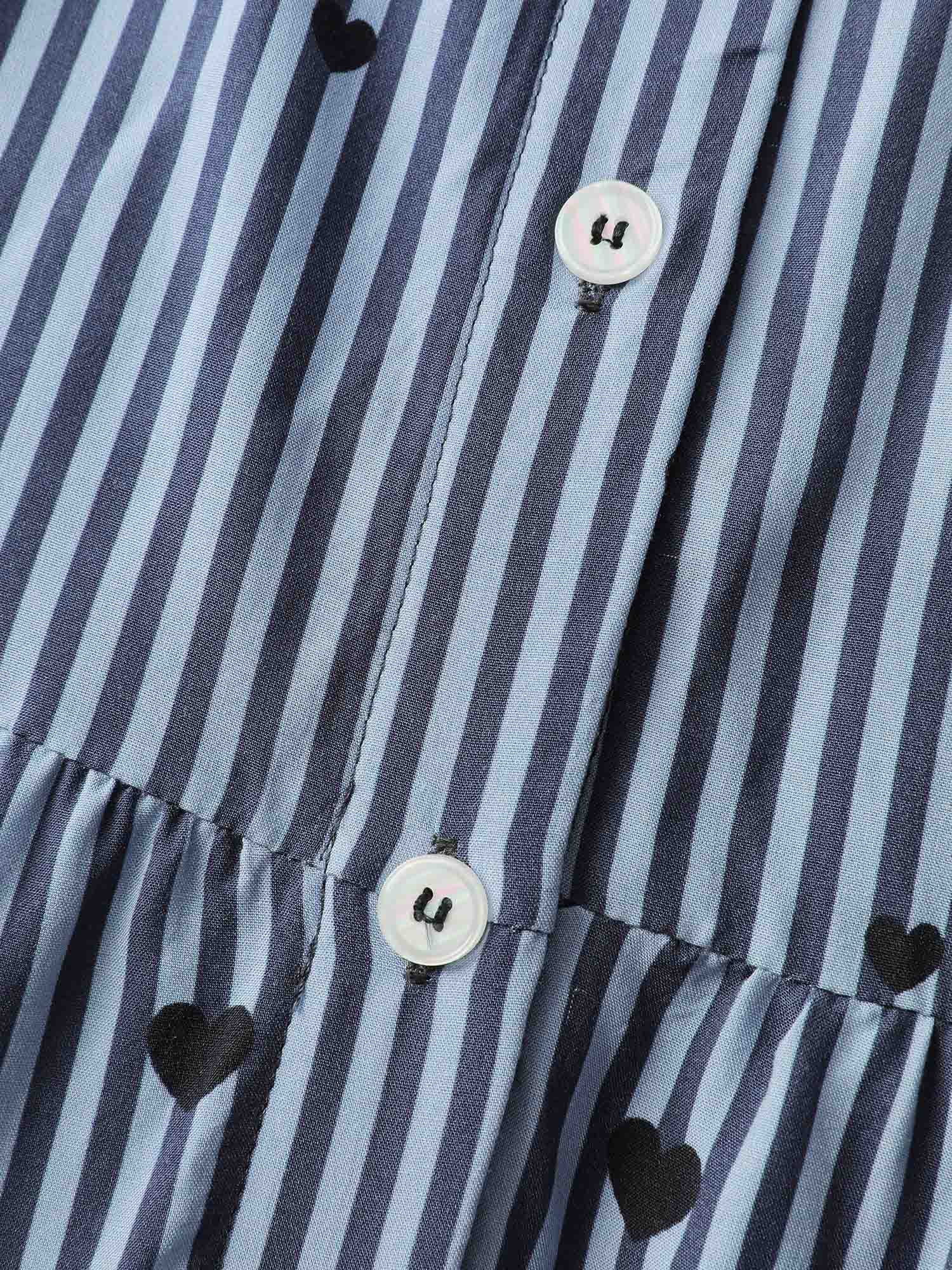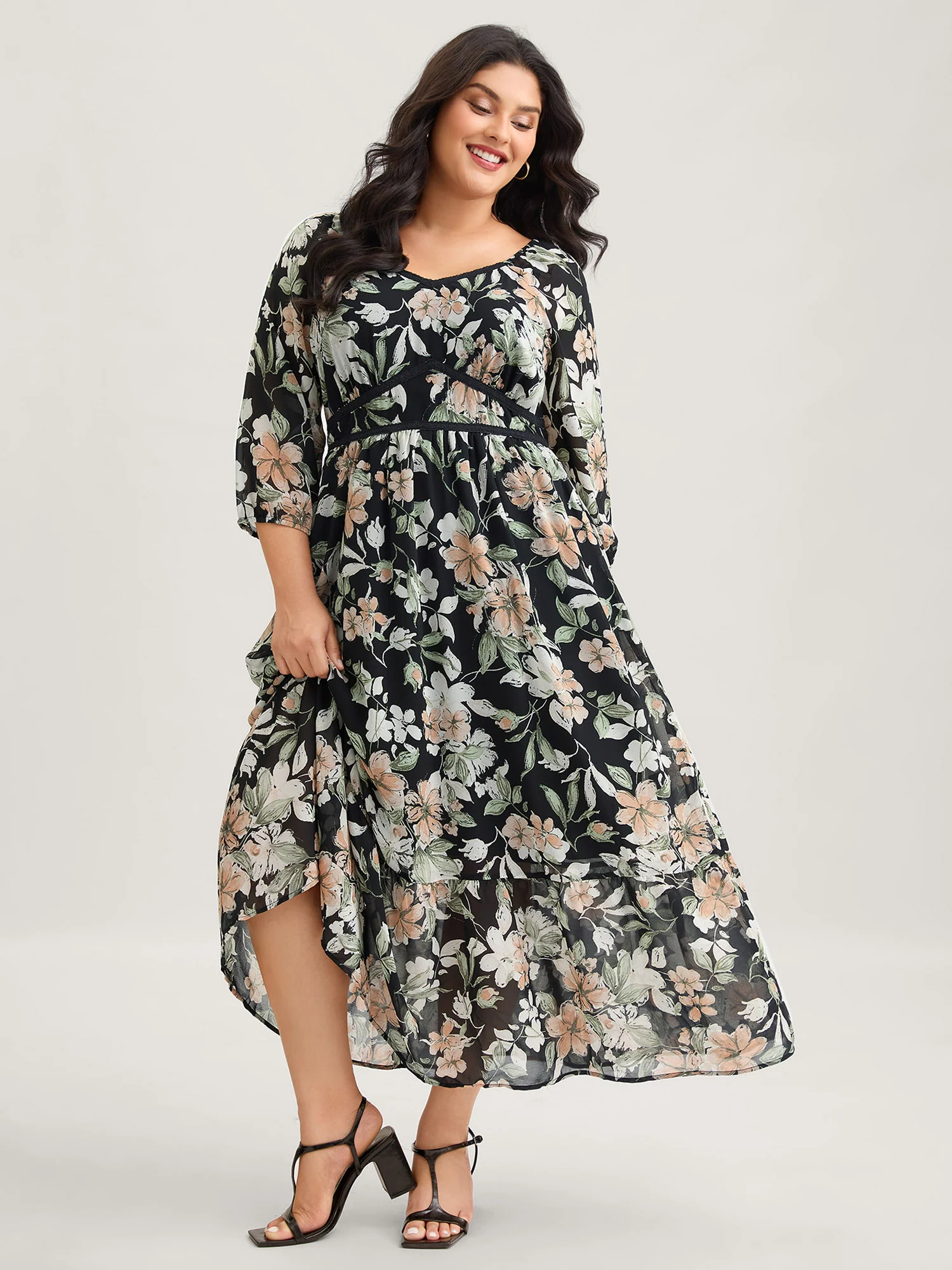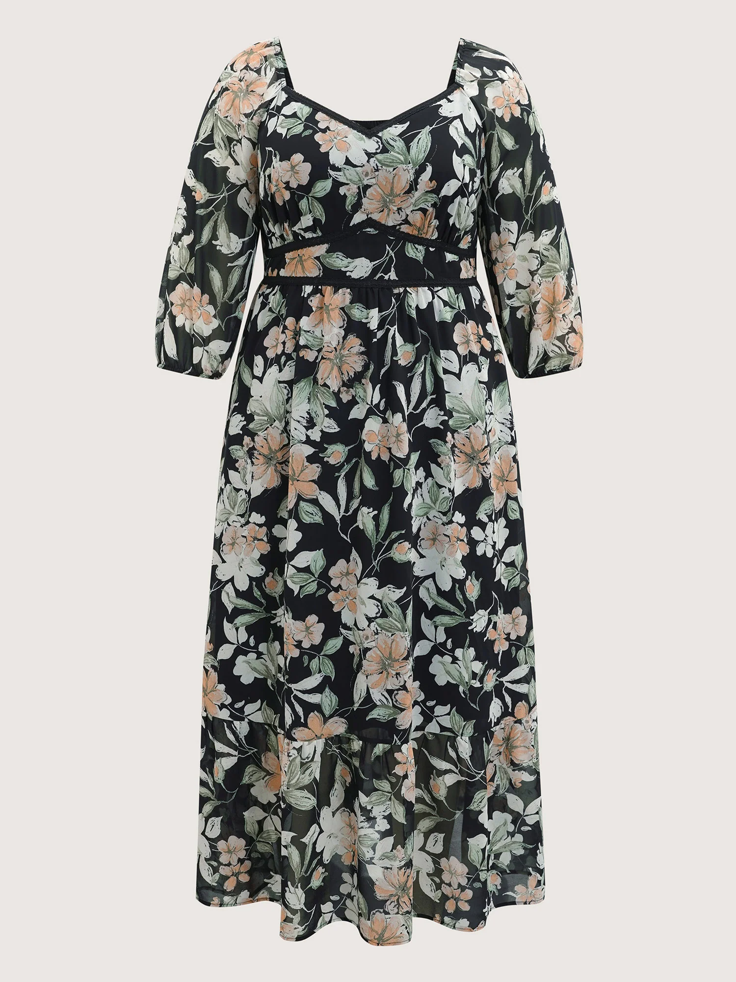 Floral Heart Neckline Woven Ribbon Gathered Dress