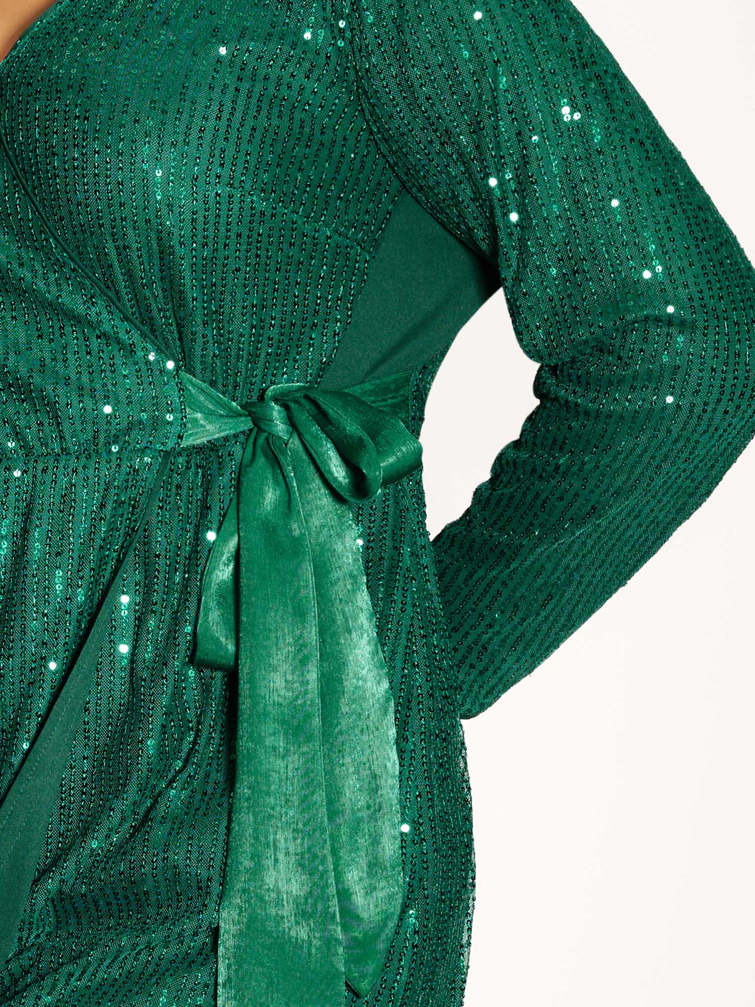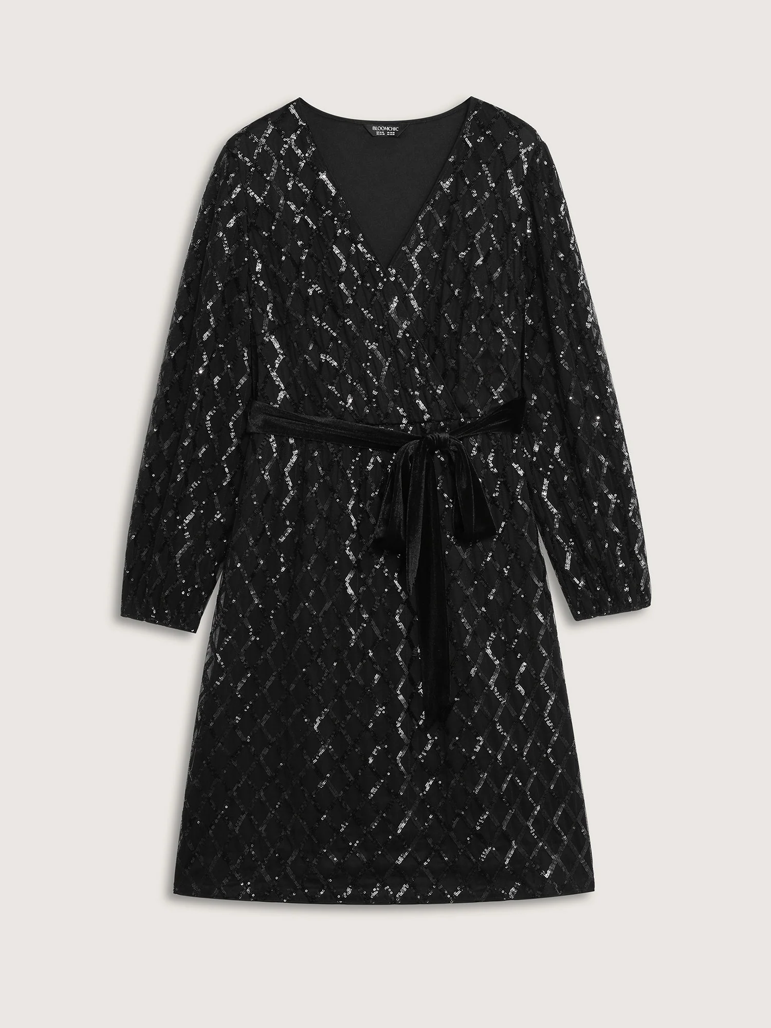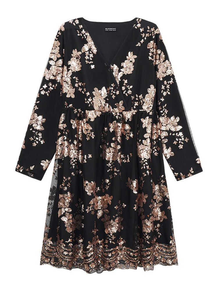 Floral Sequin Elastic Waist Mesh Wrap Dress