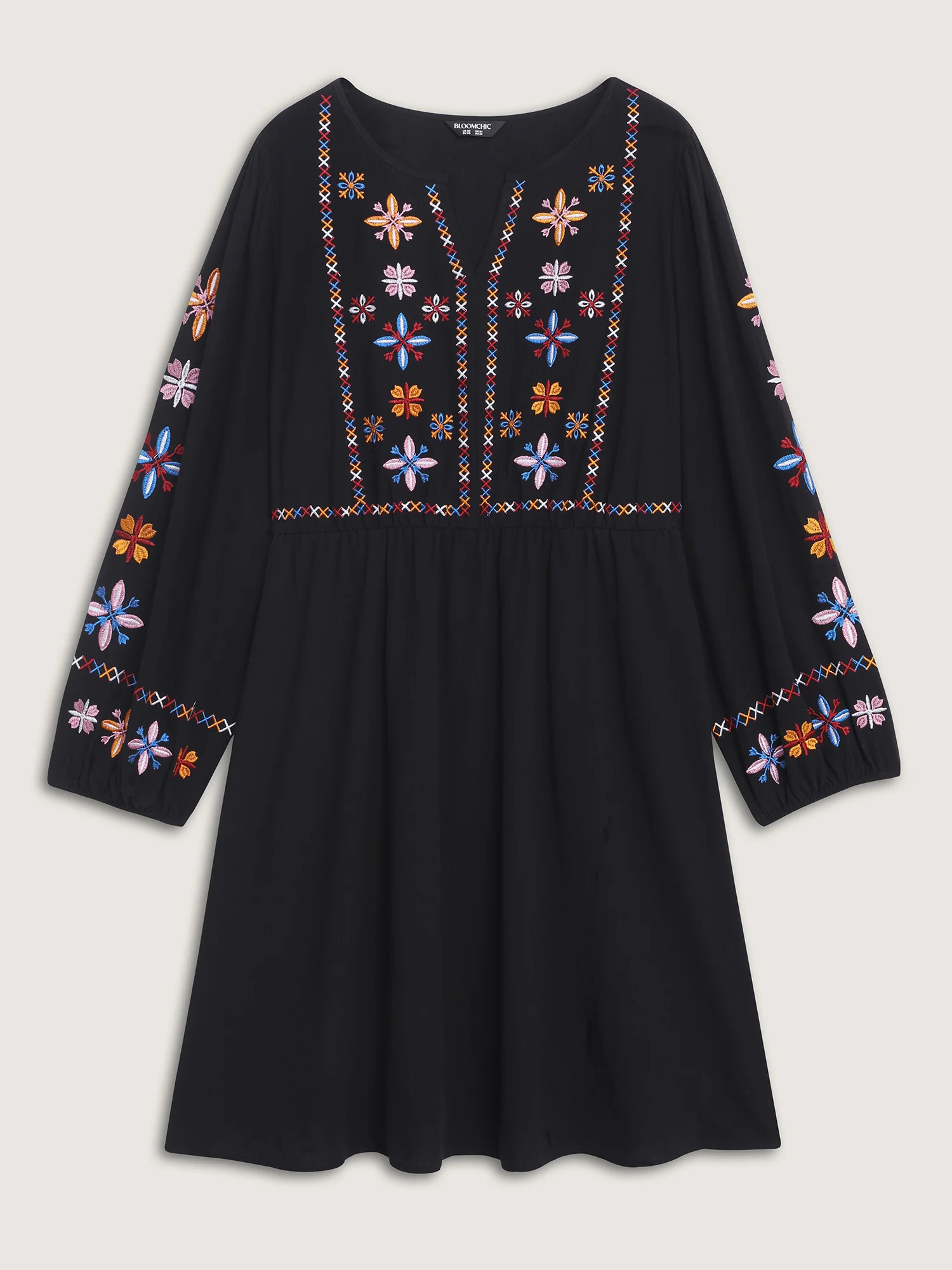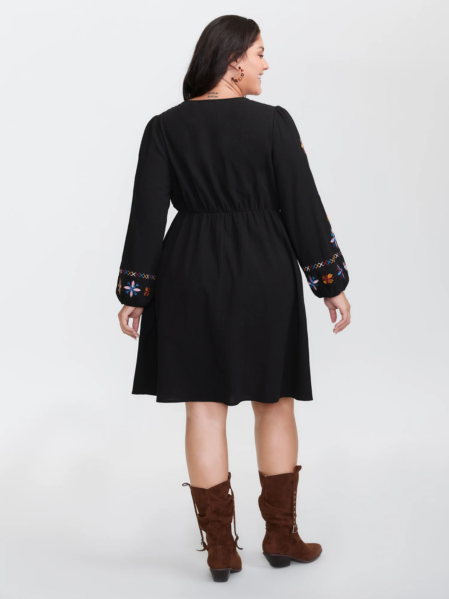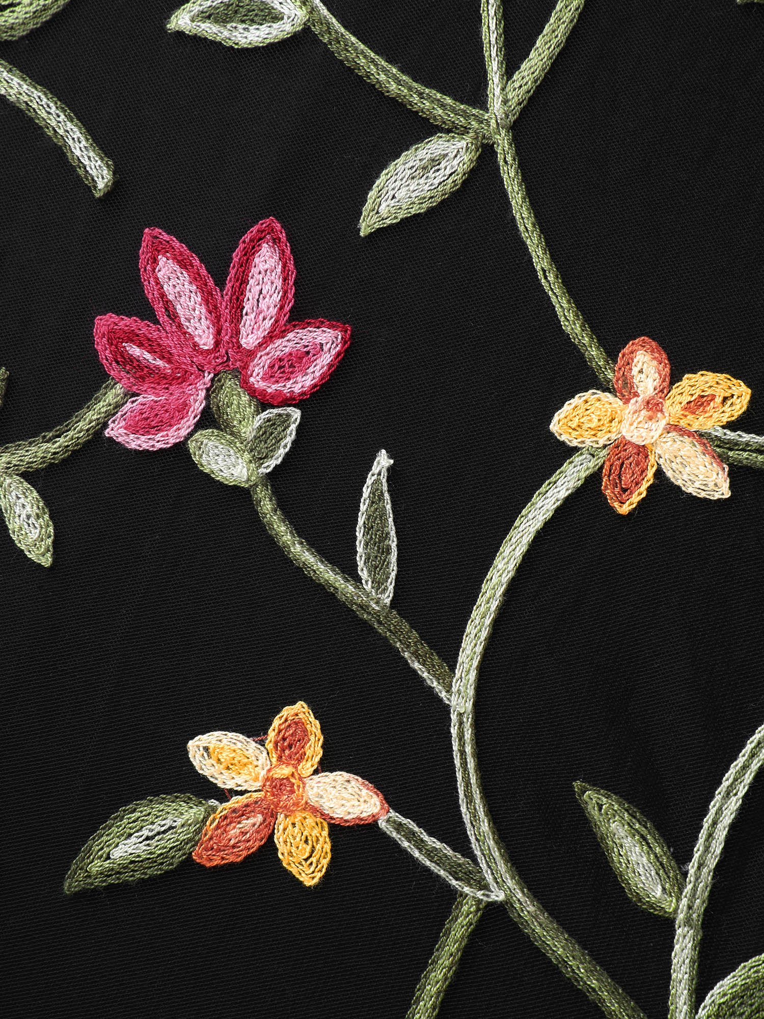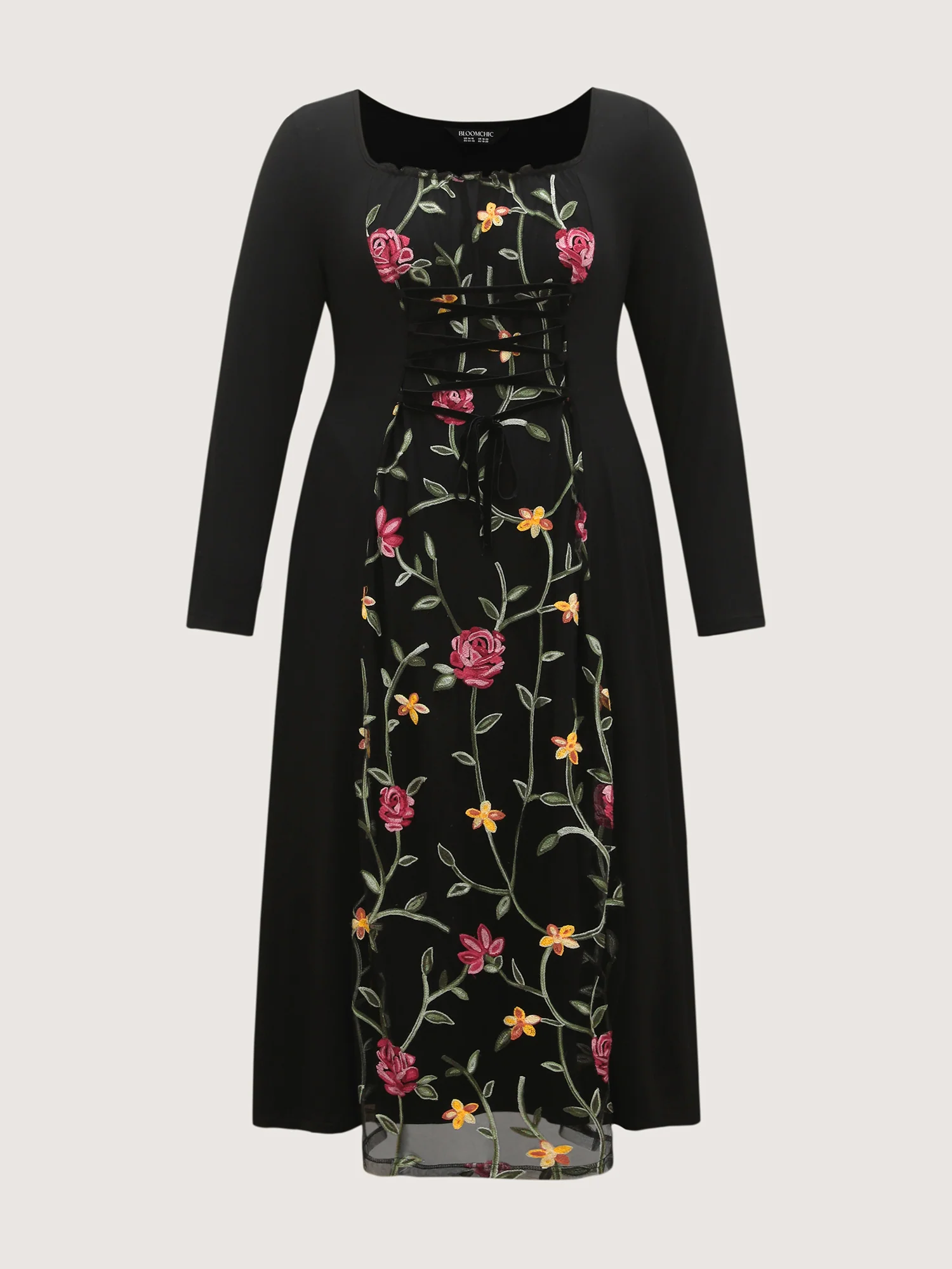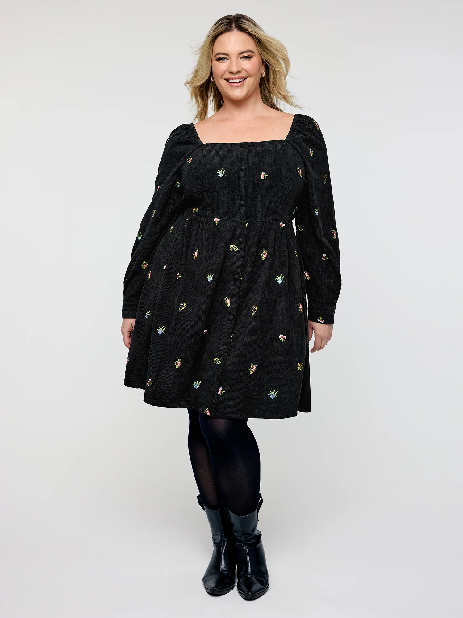 Floral Corduroy Embroidery Square Neck Knee Dress