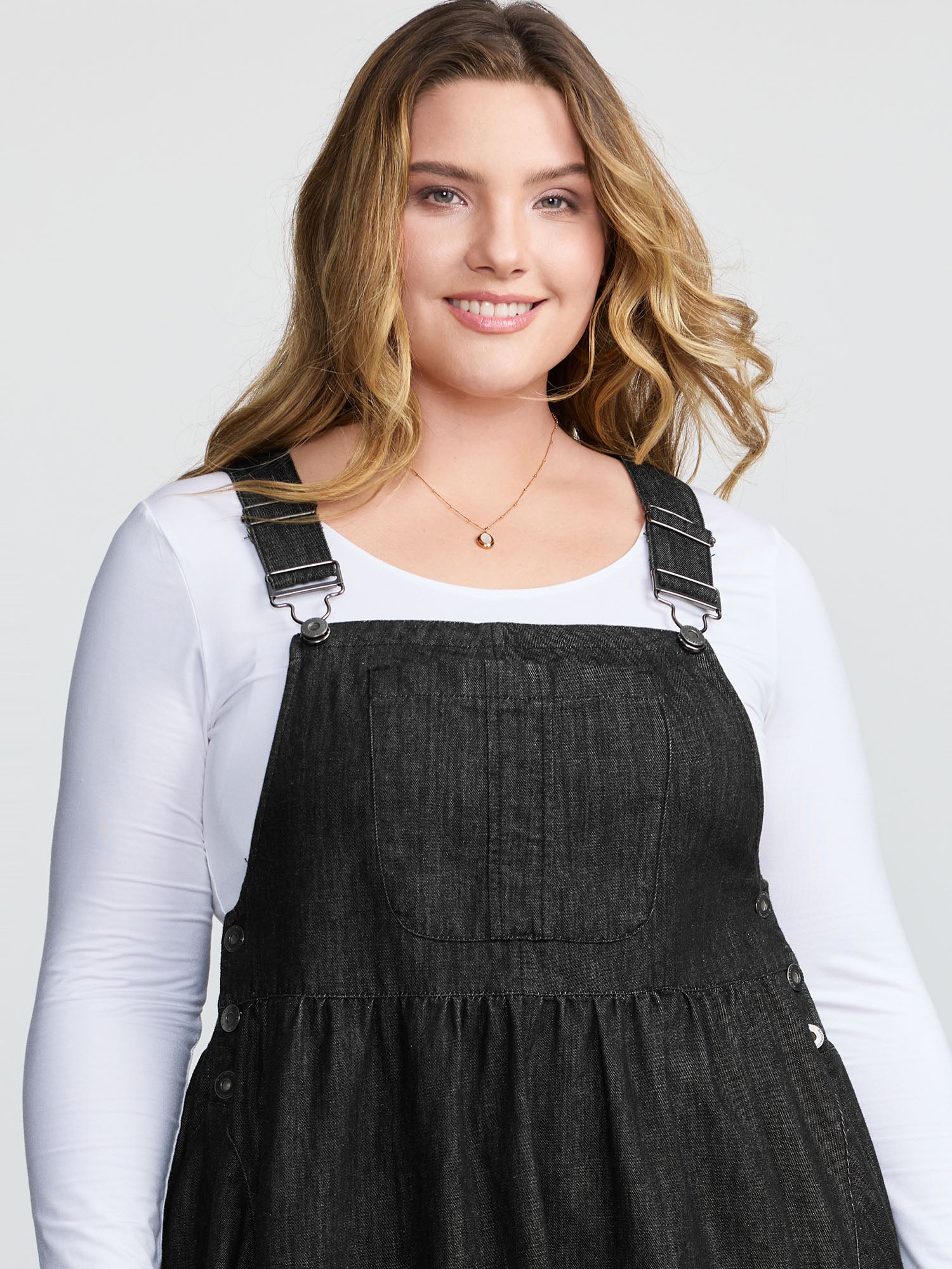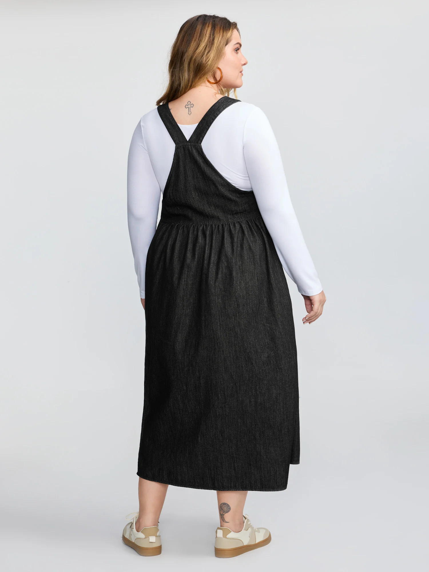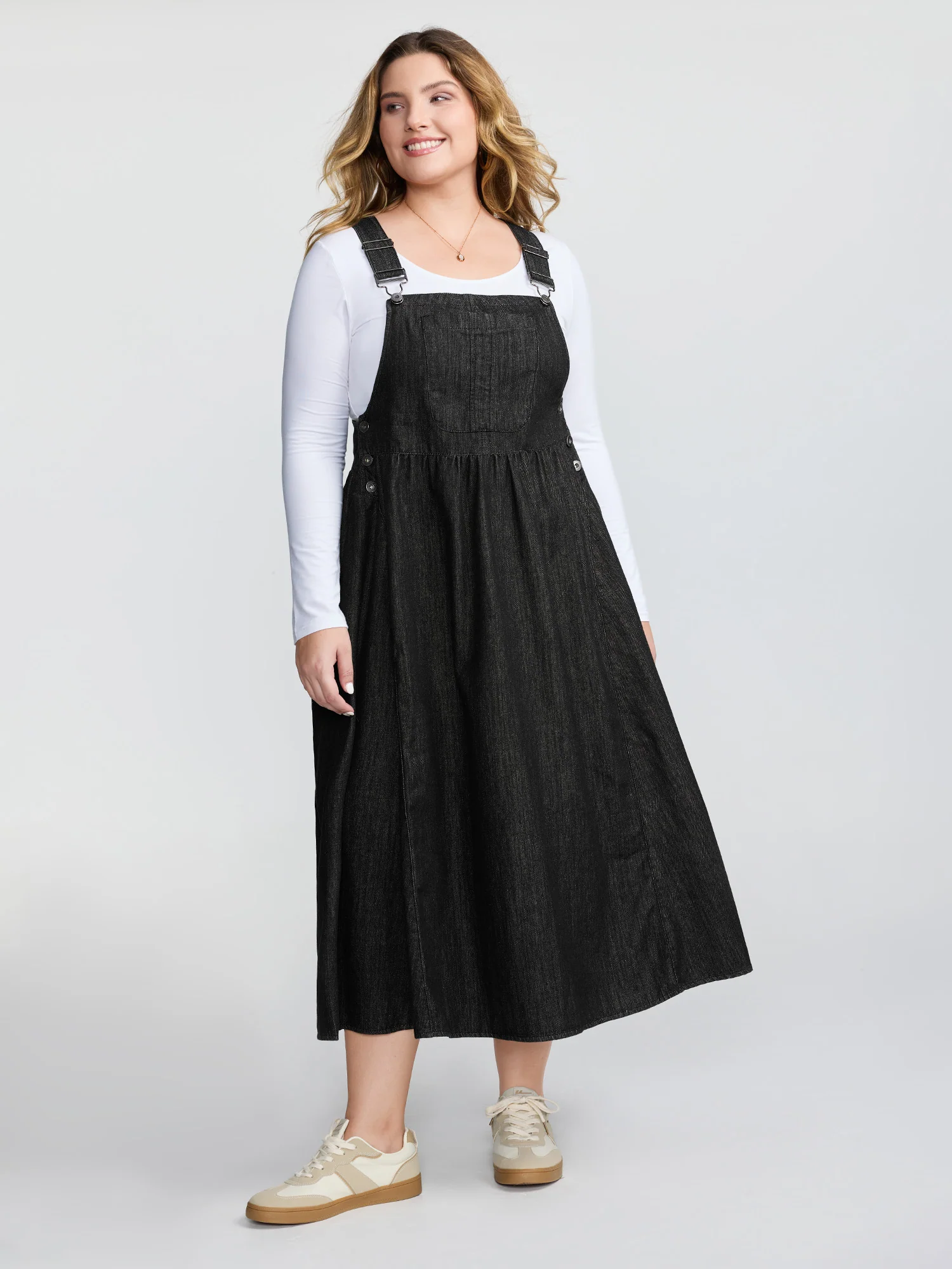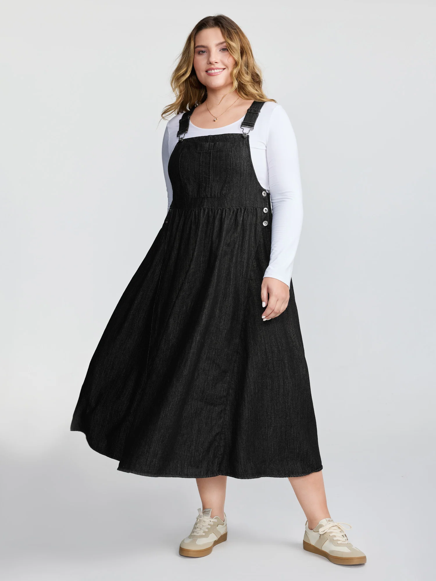 Denim Adjustable Overall Straps Pockets Midi Dress