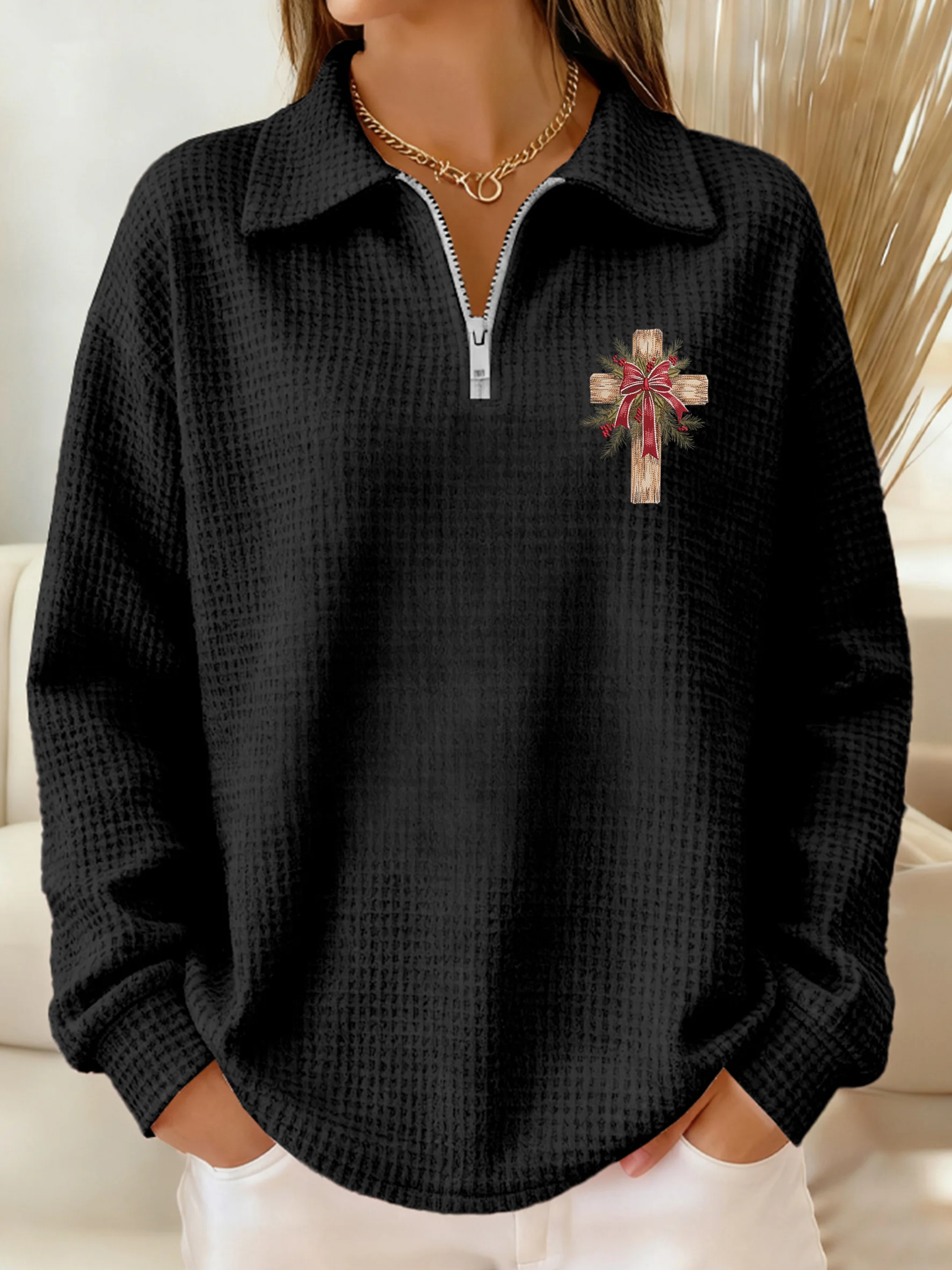 Women's Winter Bow Cross Print Waffle Lapel Top