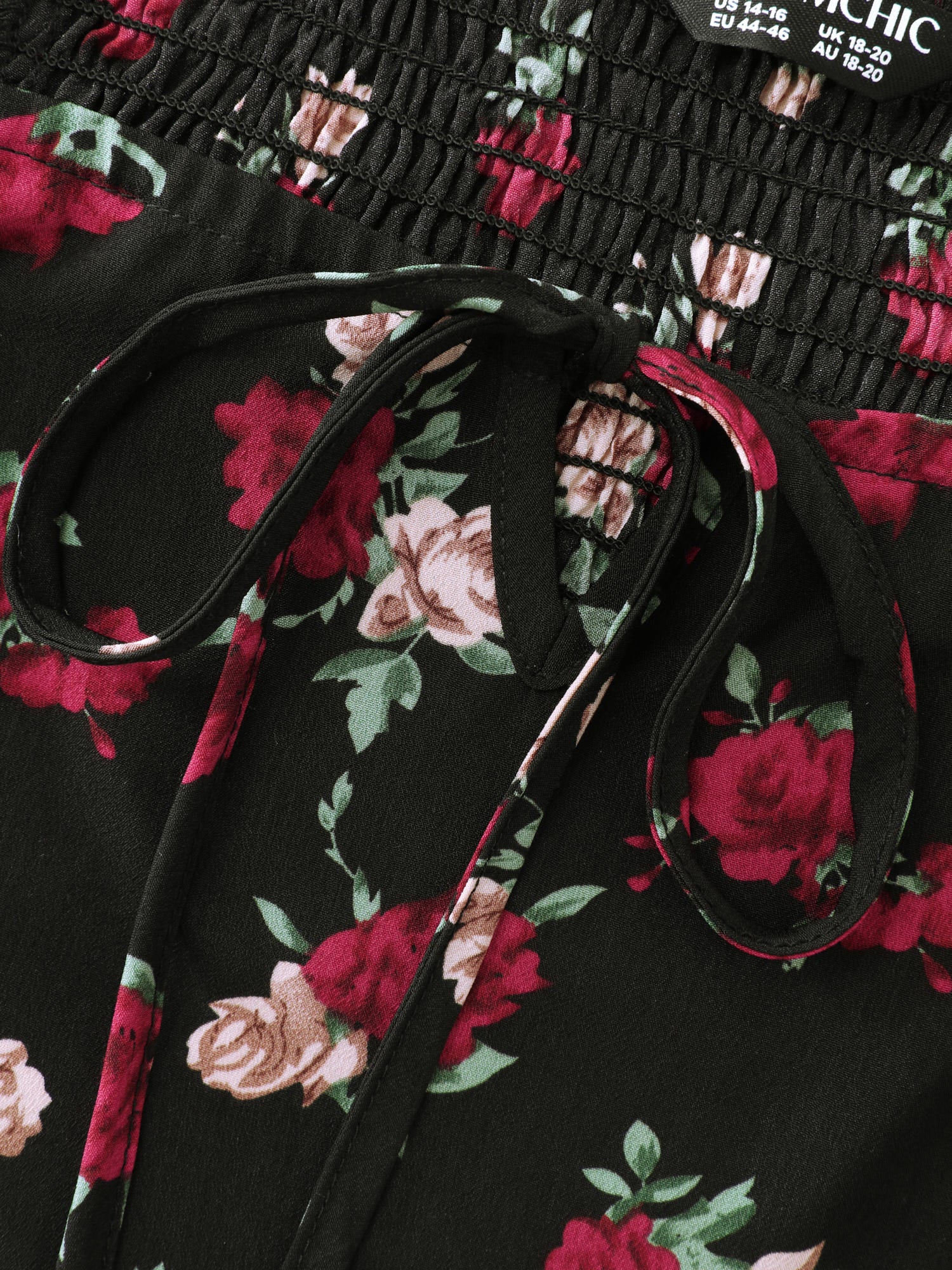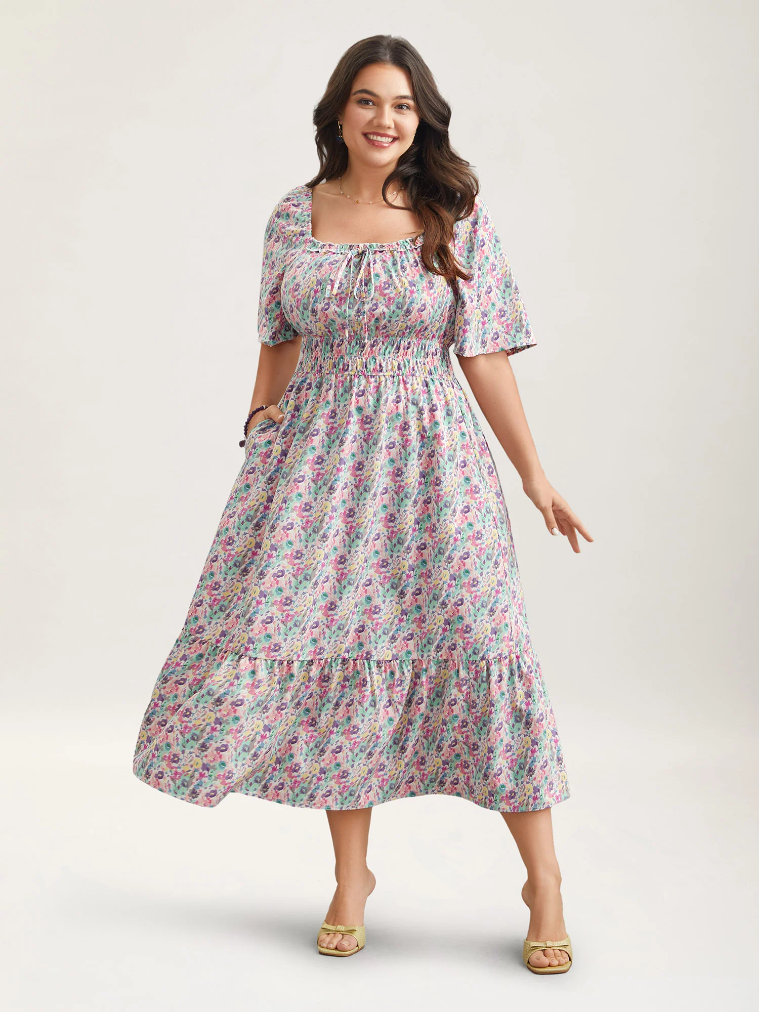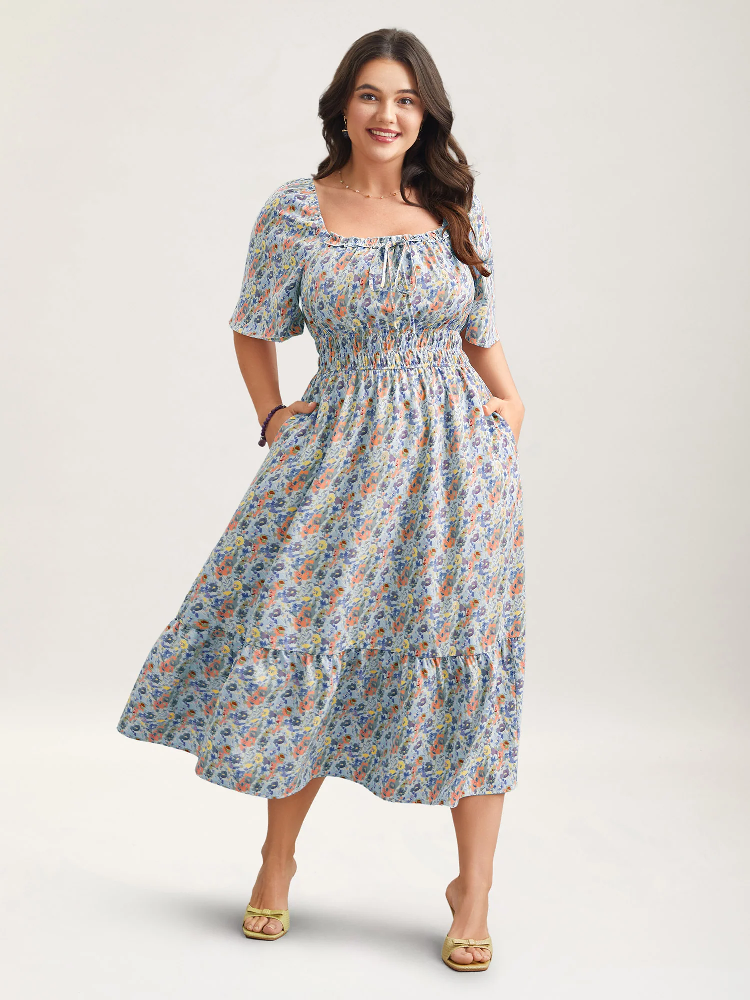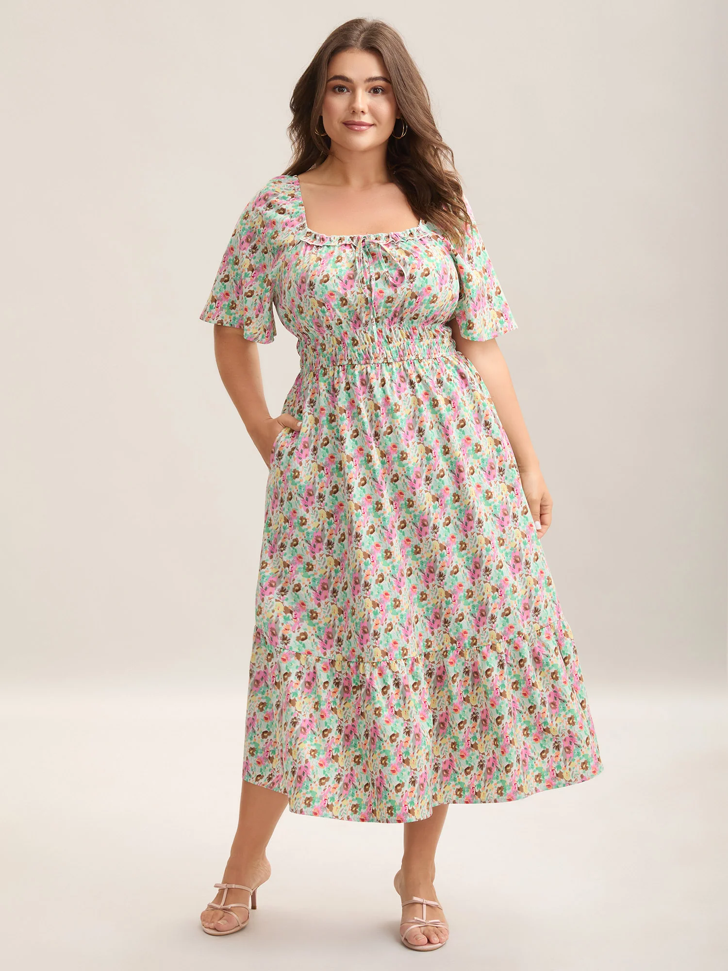 Colorful Rose Pattern Drawstring Neckline Midi Dress
