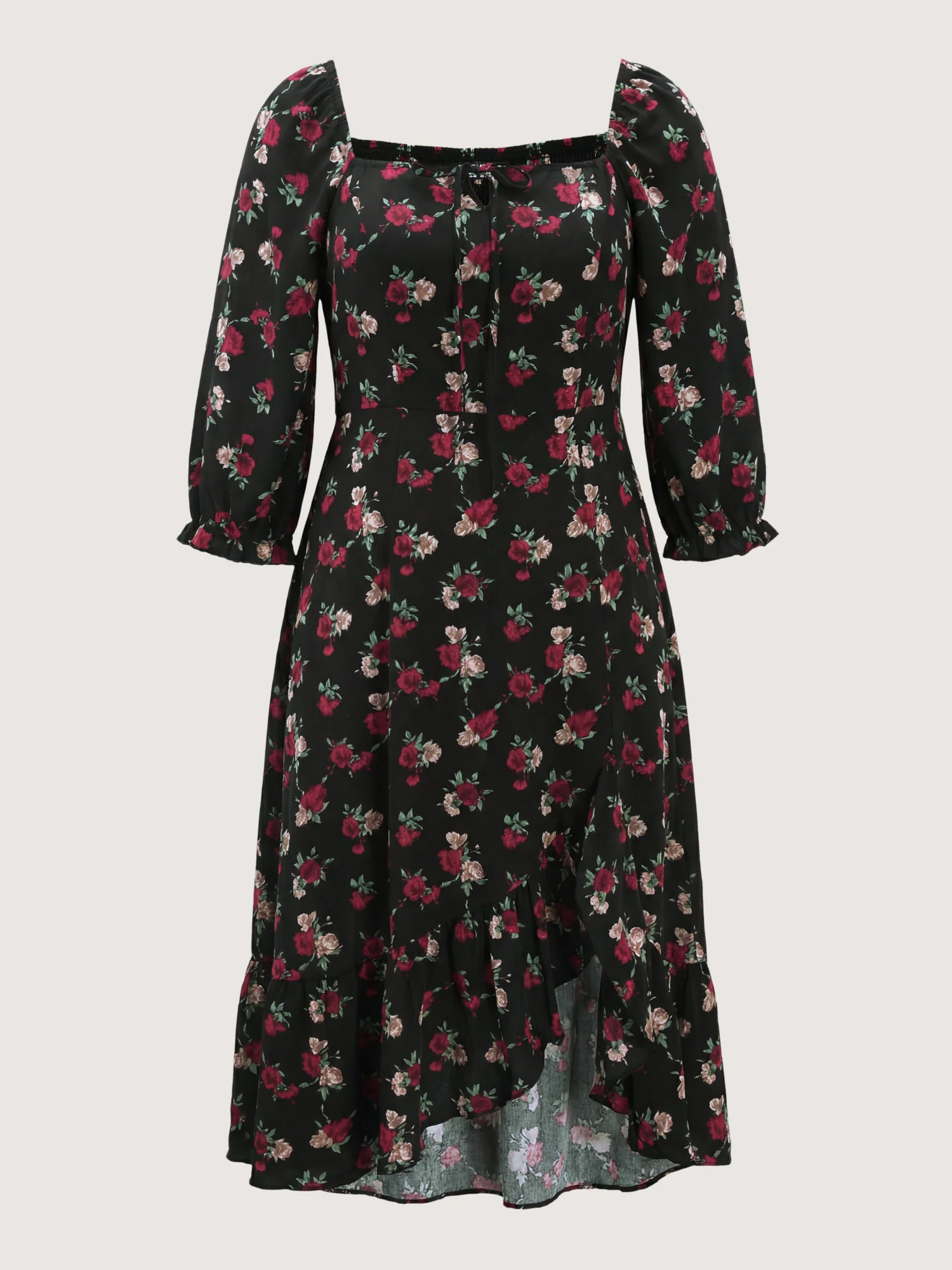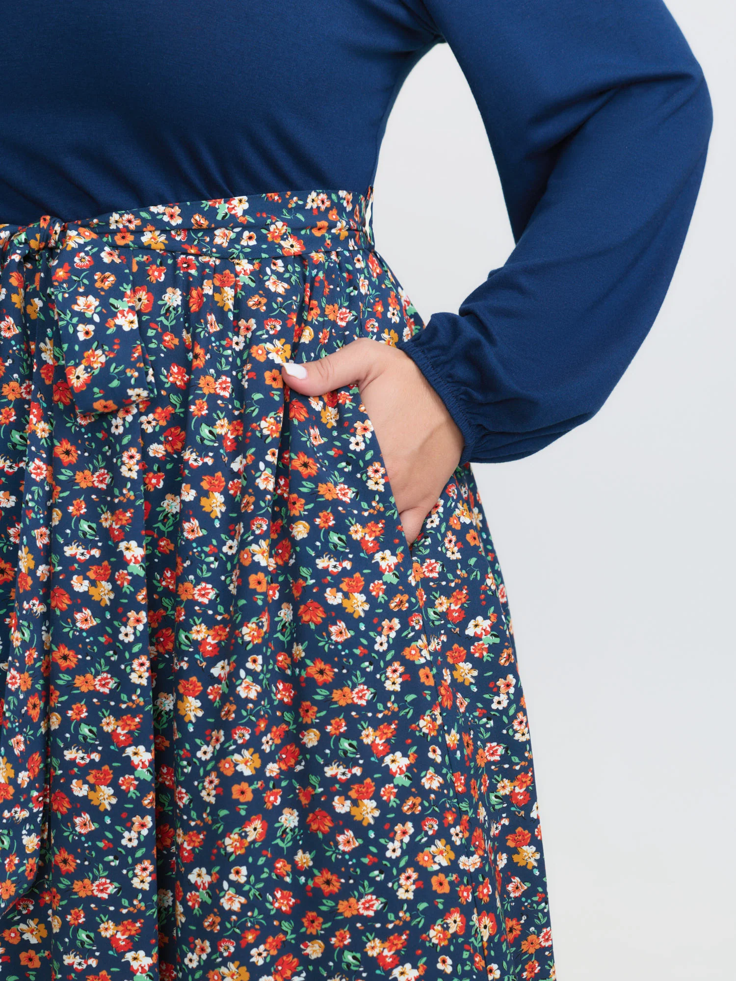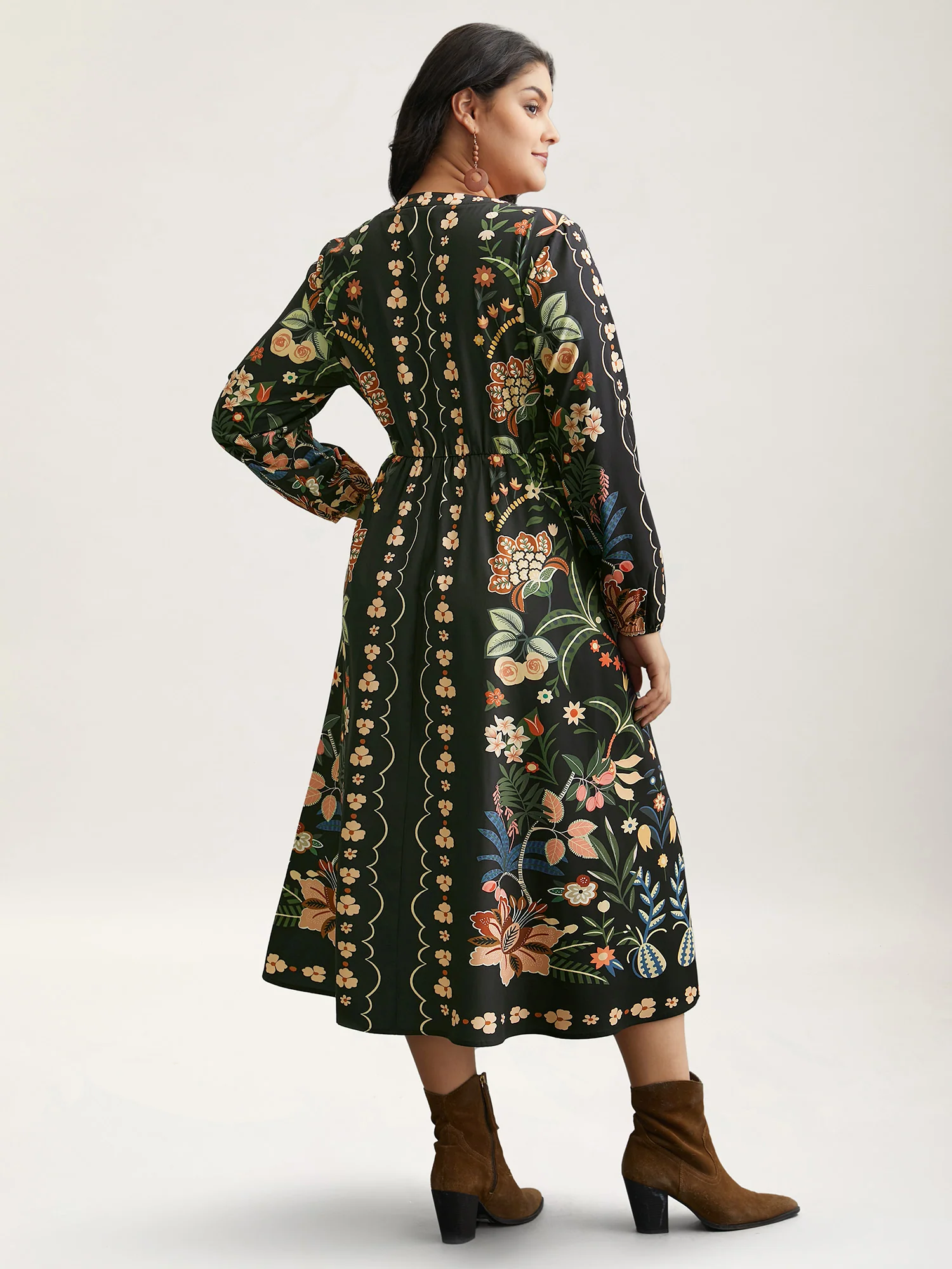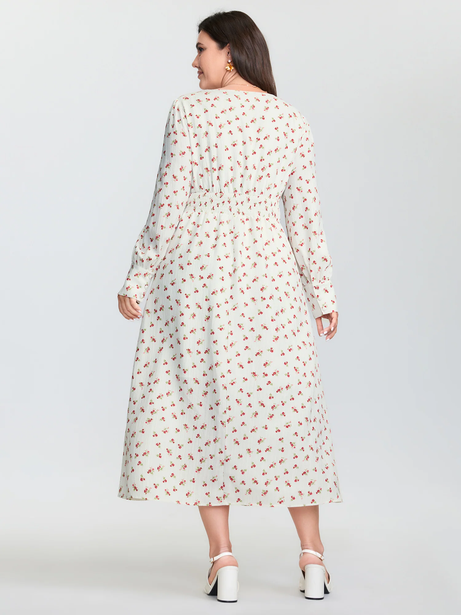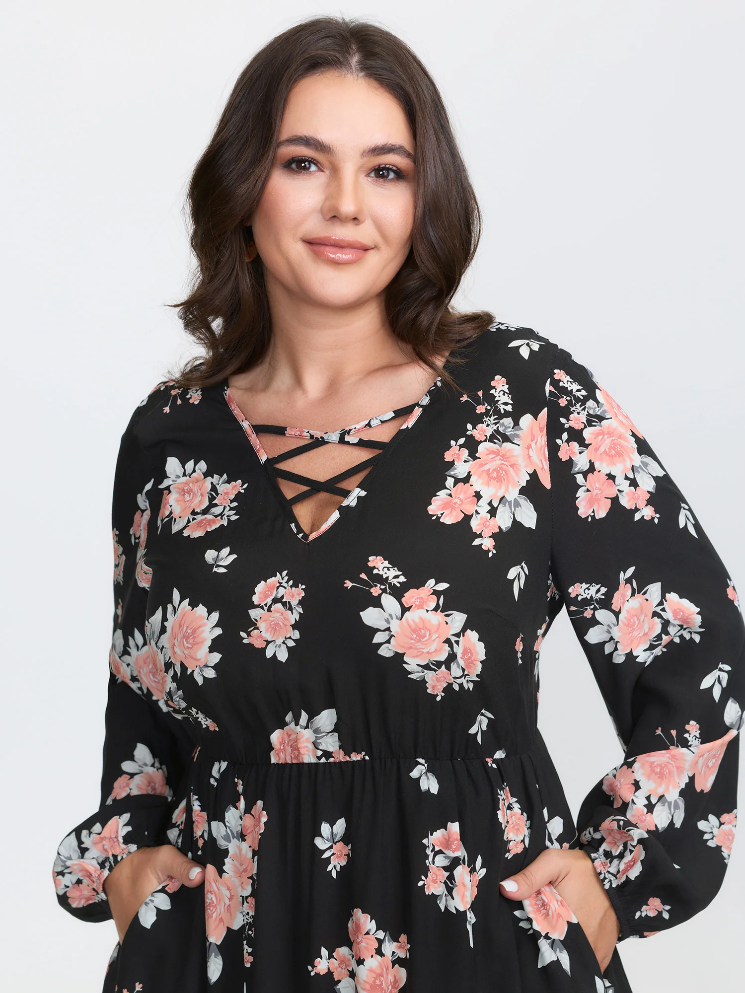 Colorful Rose Pattern Drawstring Neckline Midi Dress