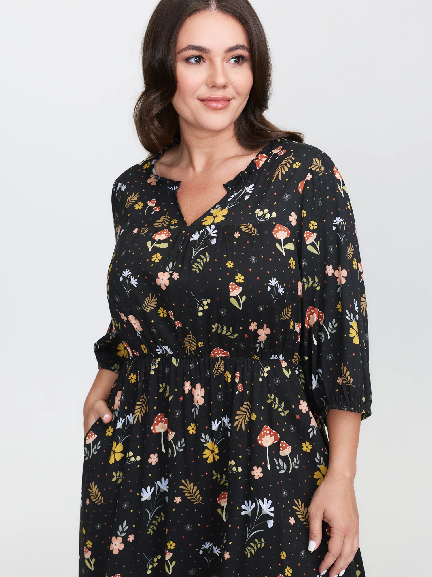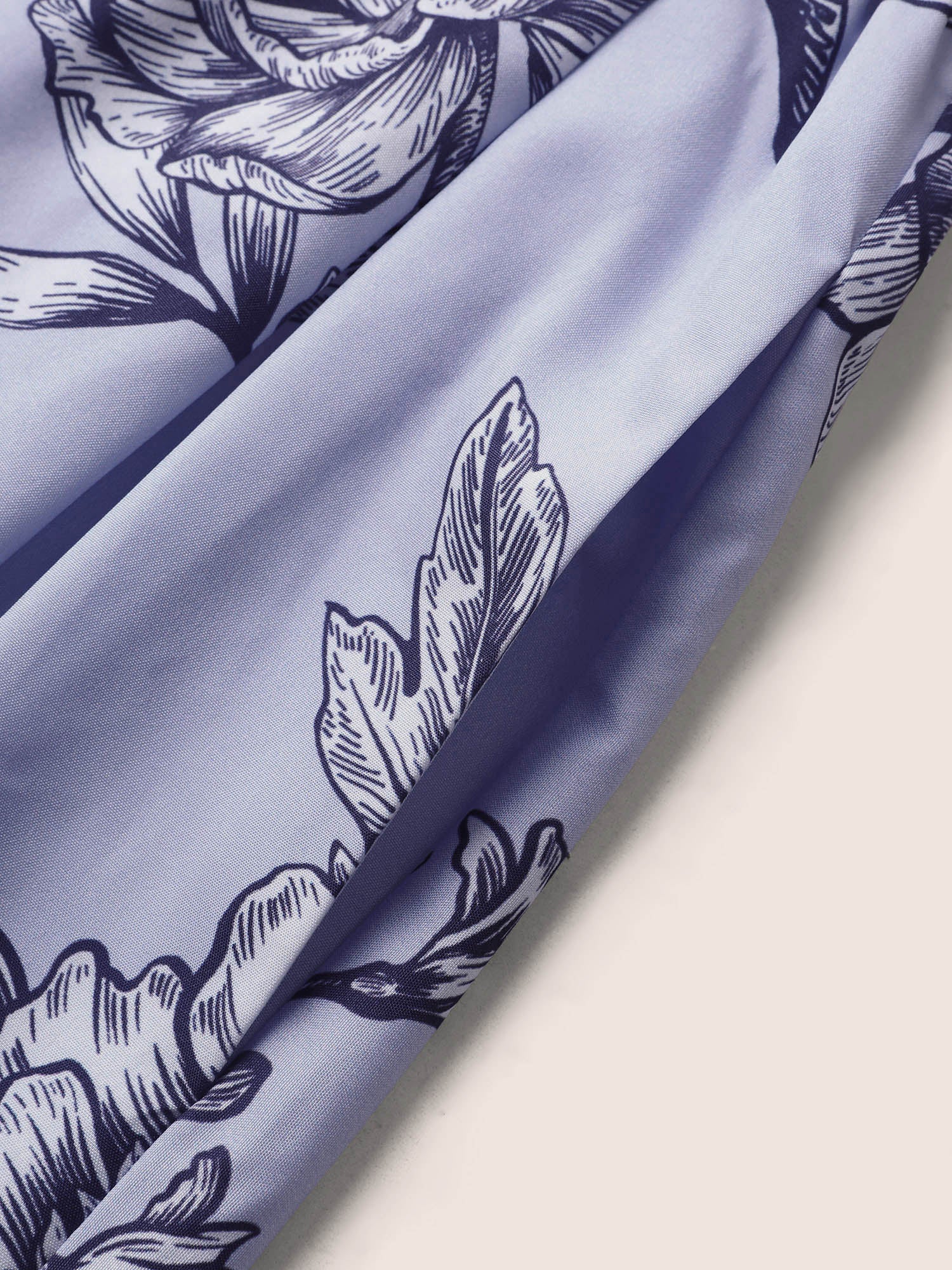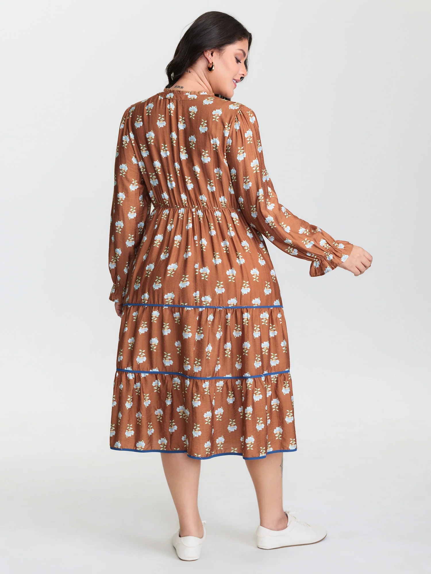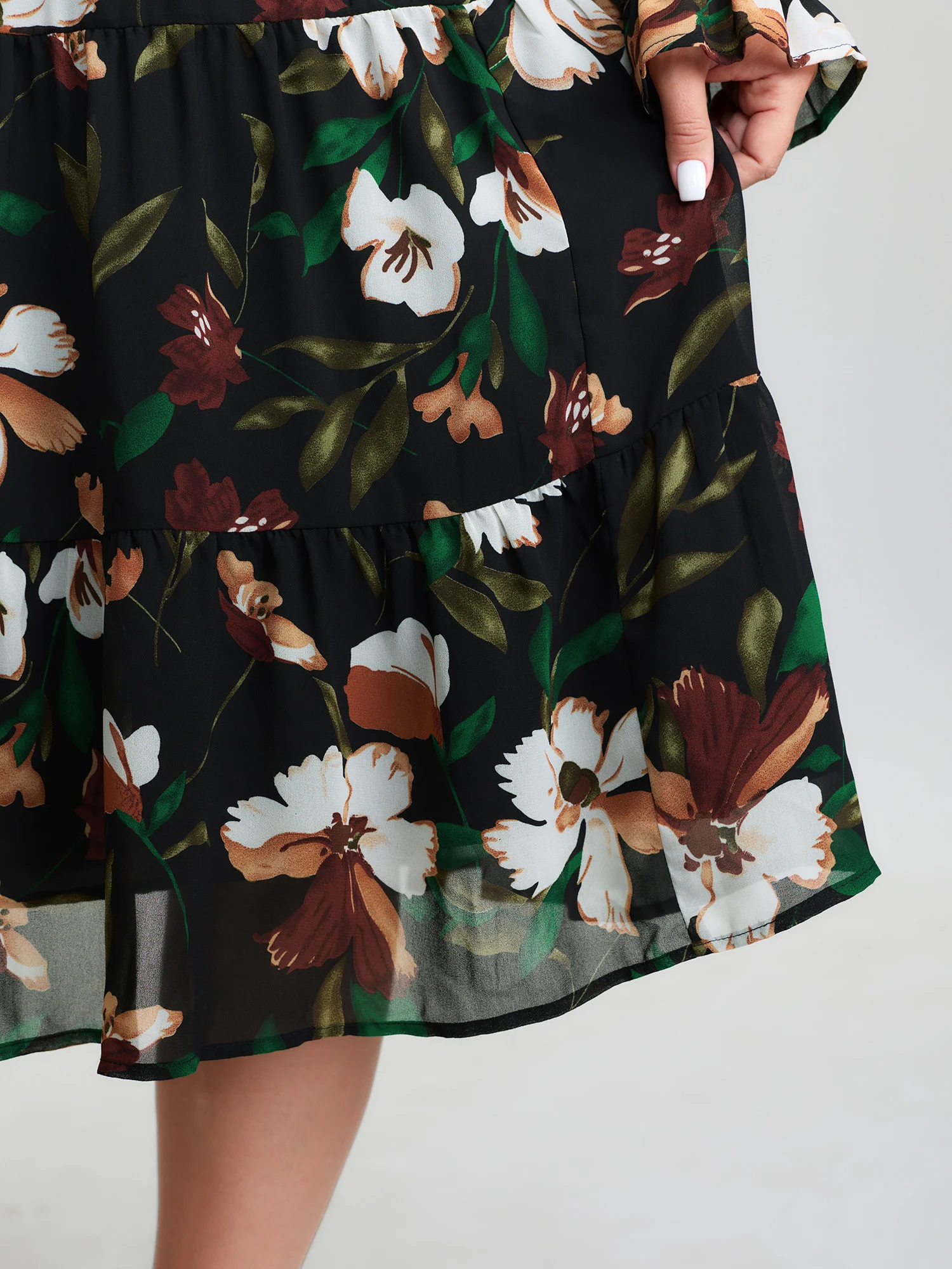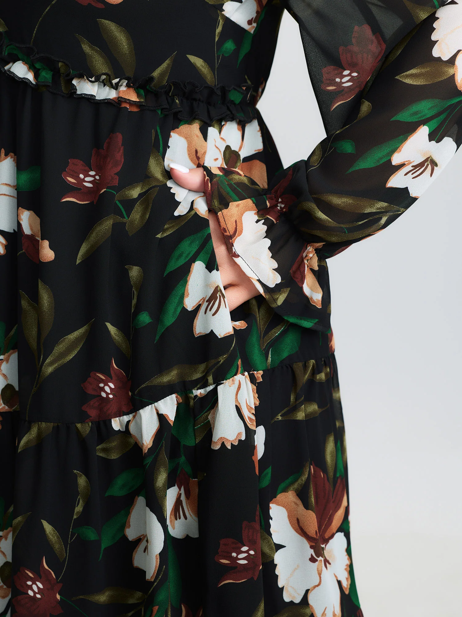 Tropical Floral Print Ruffled Neckline Midi Dress