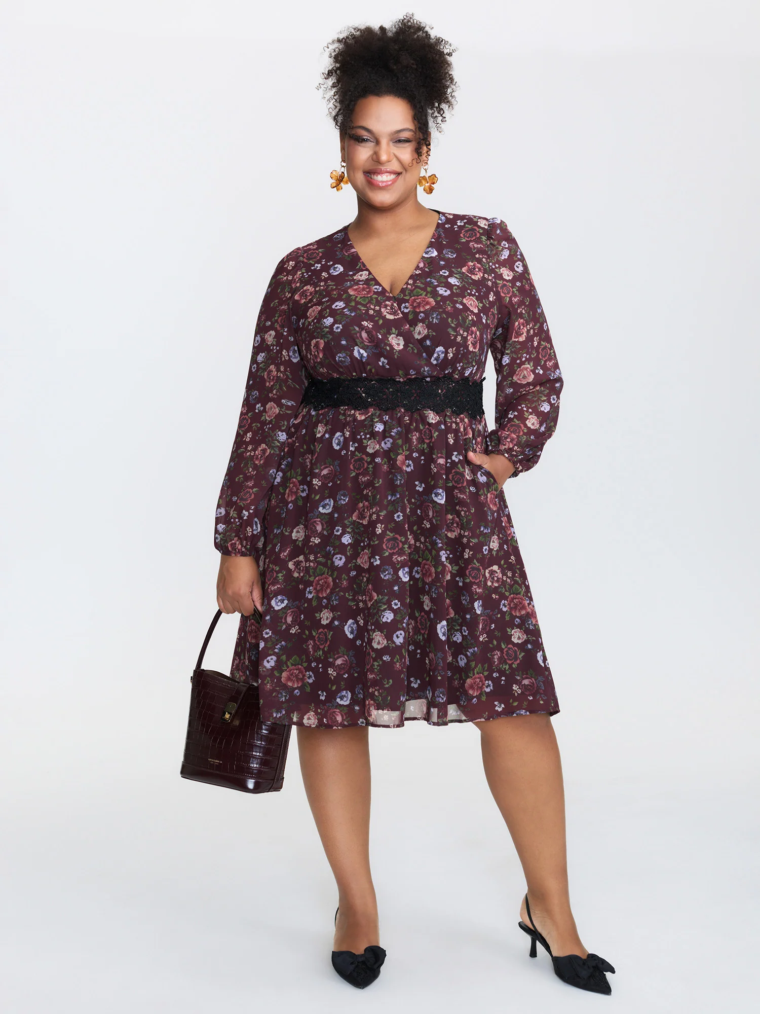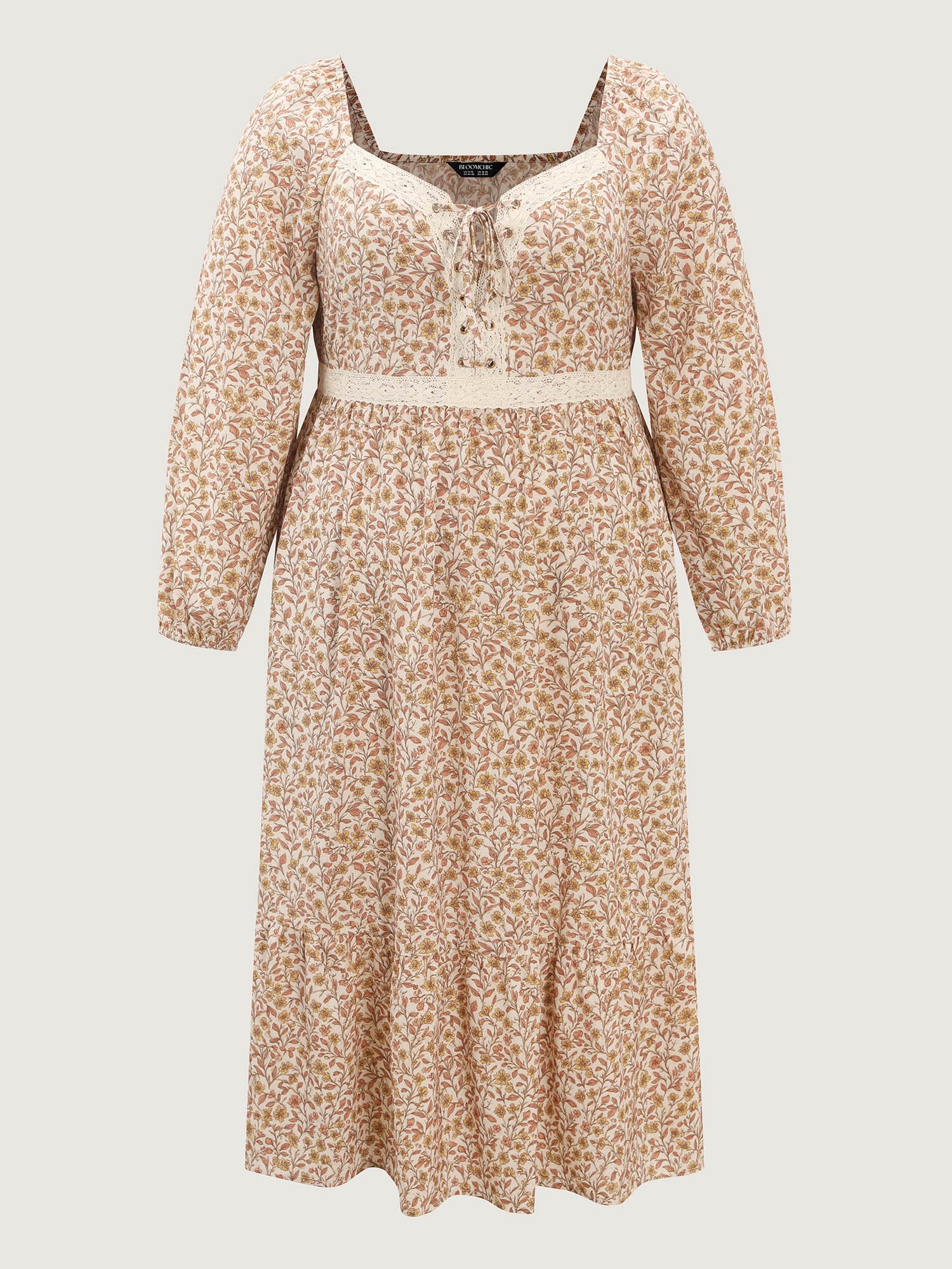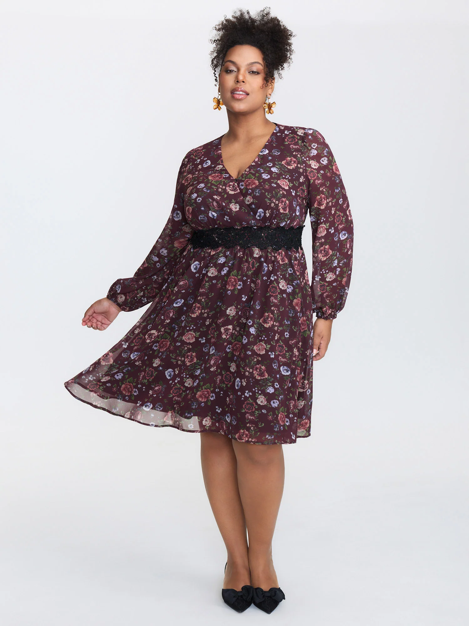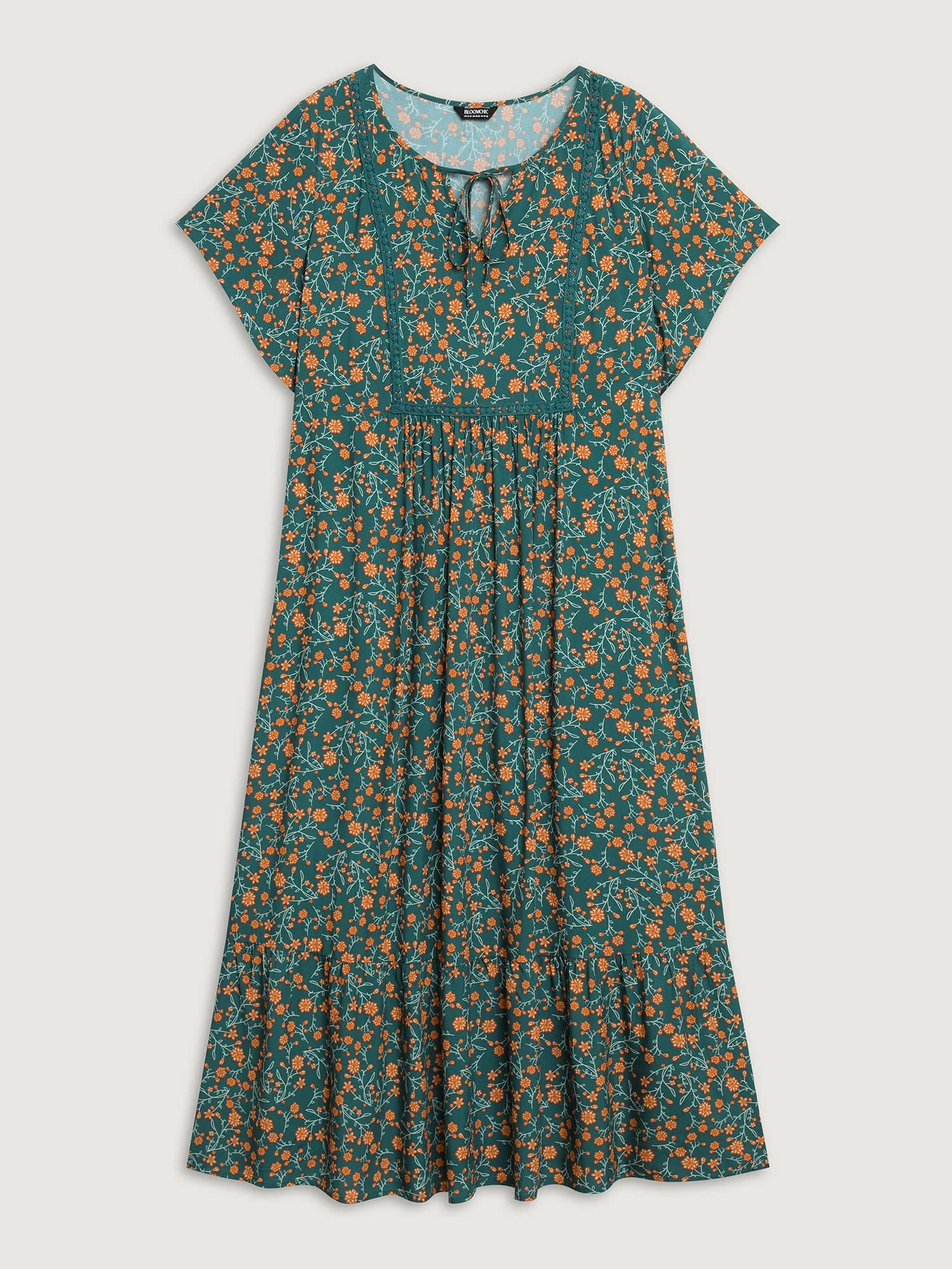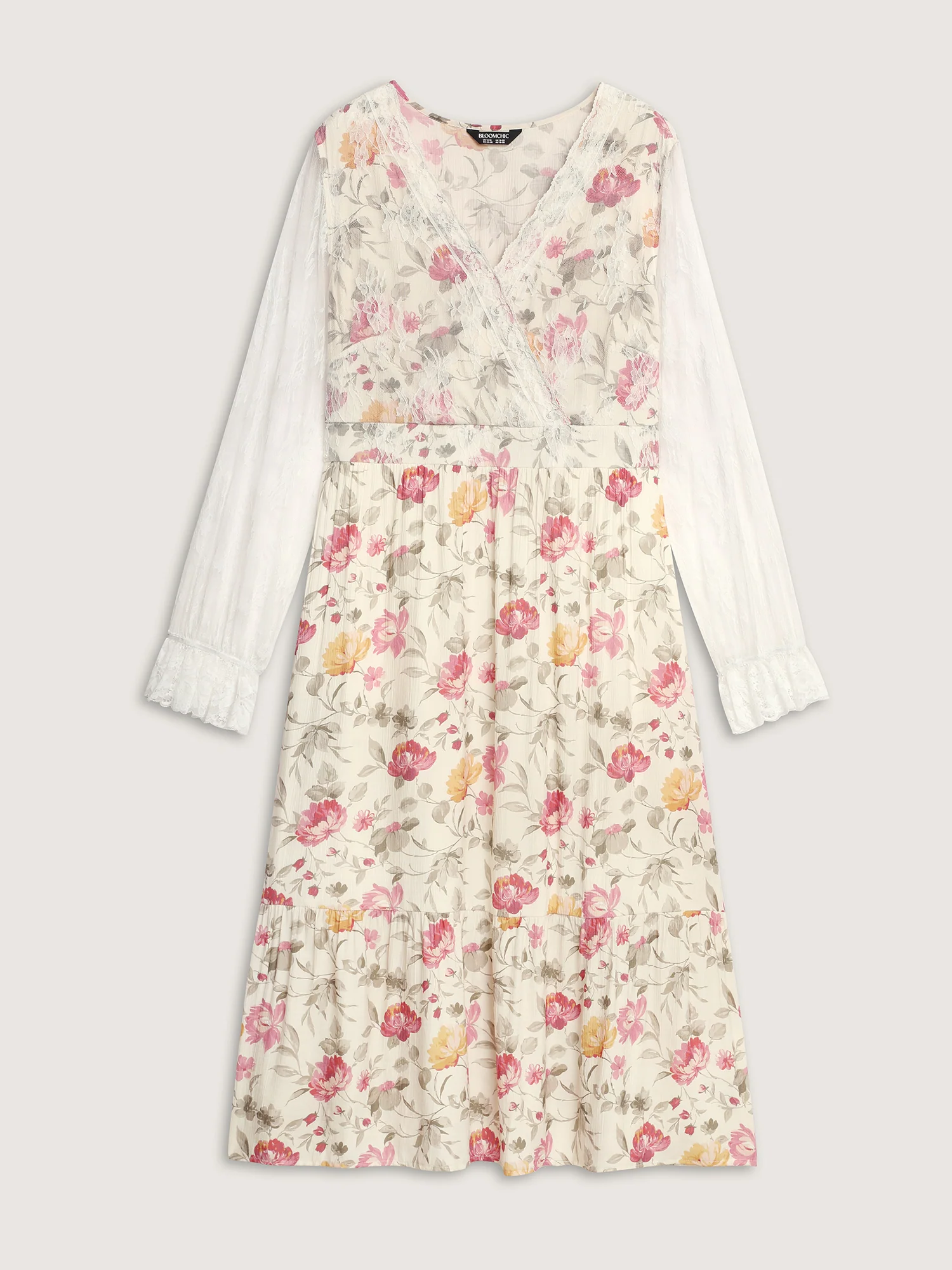 Supersoft Floral Print Lace Trim Knee-Length Dress