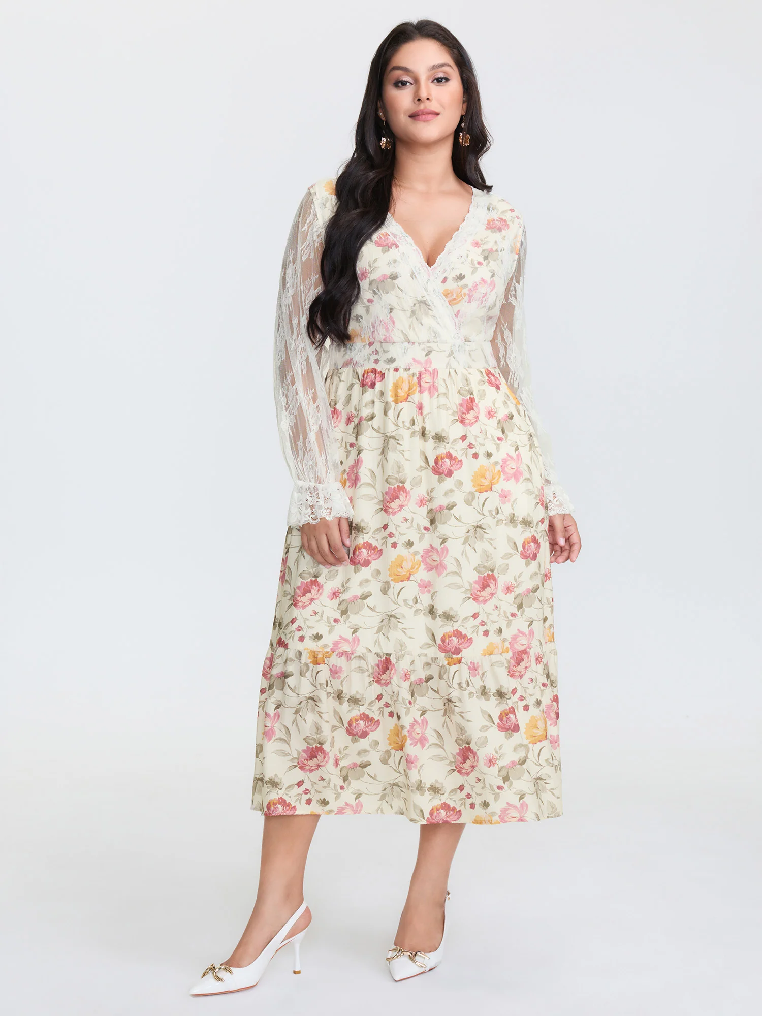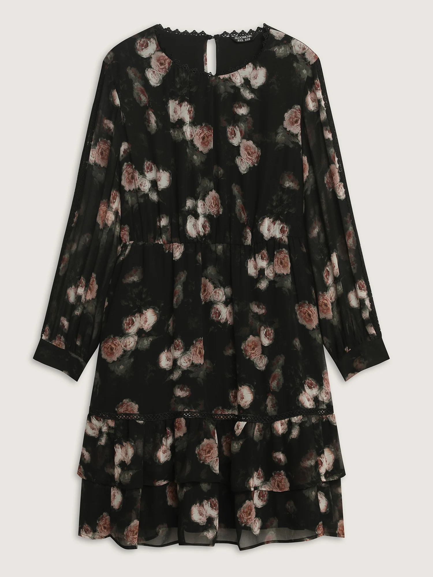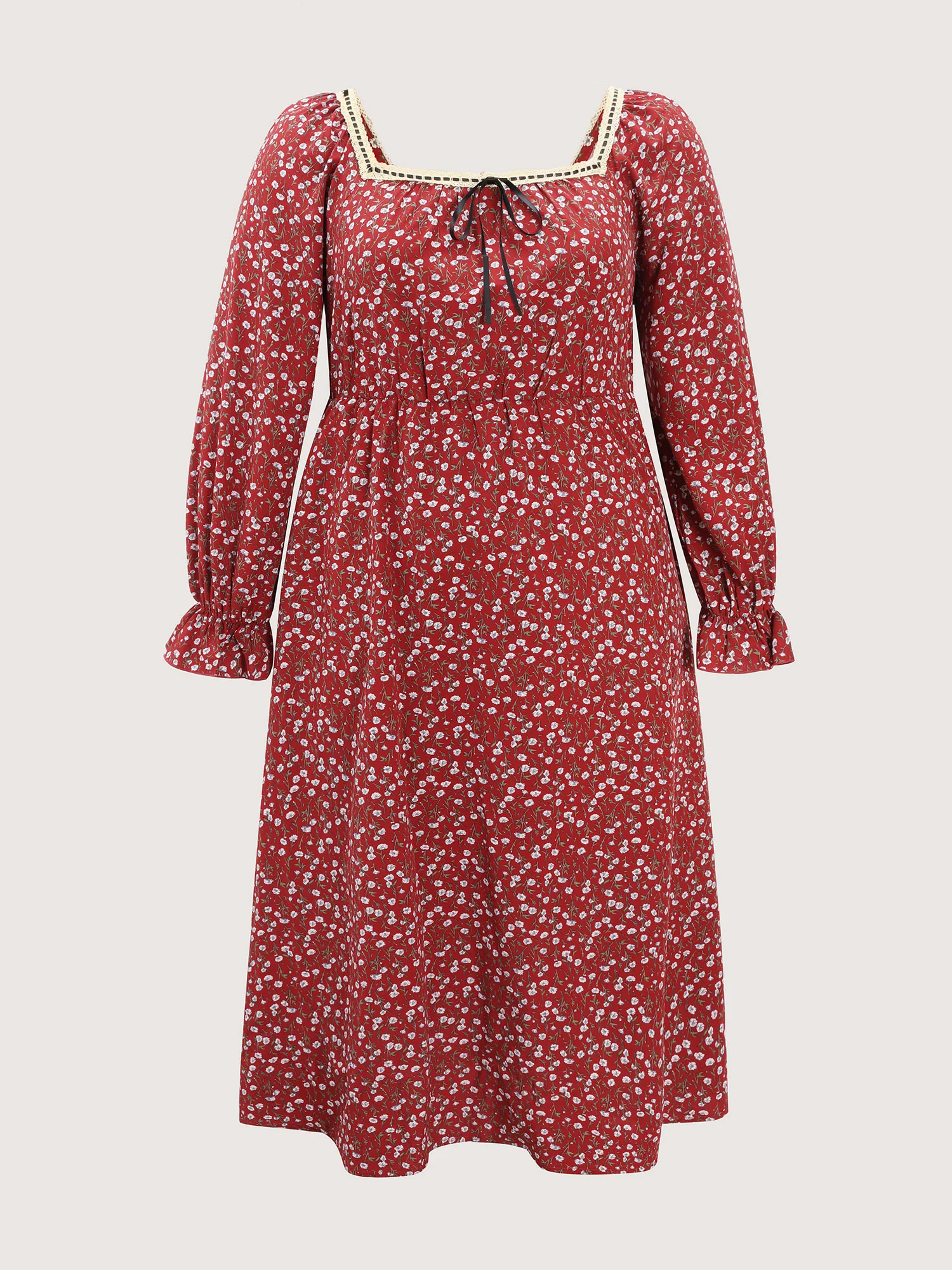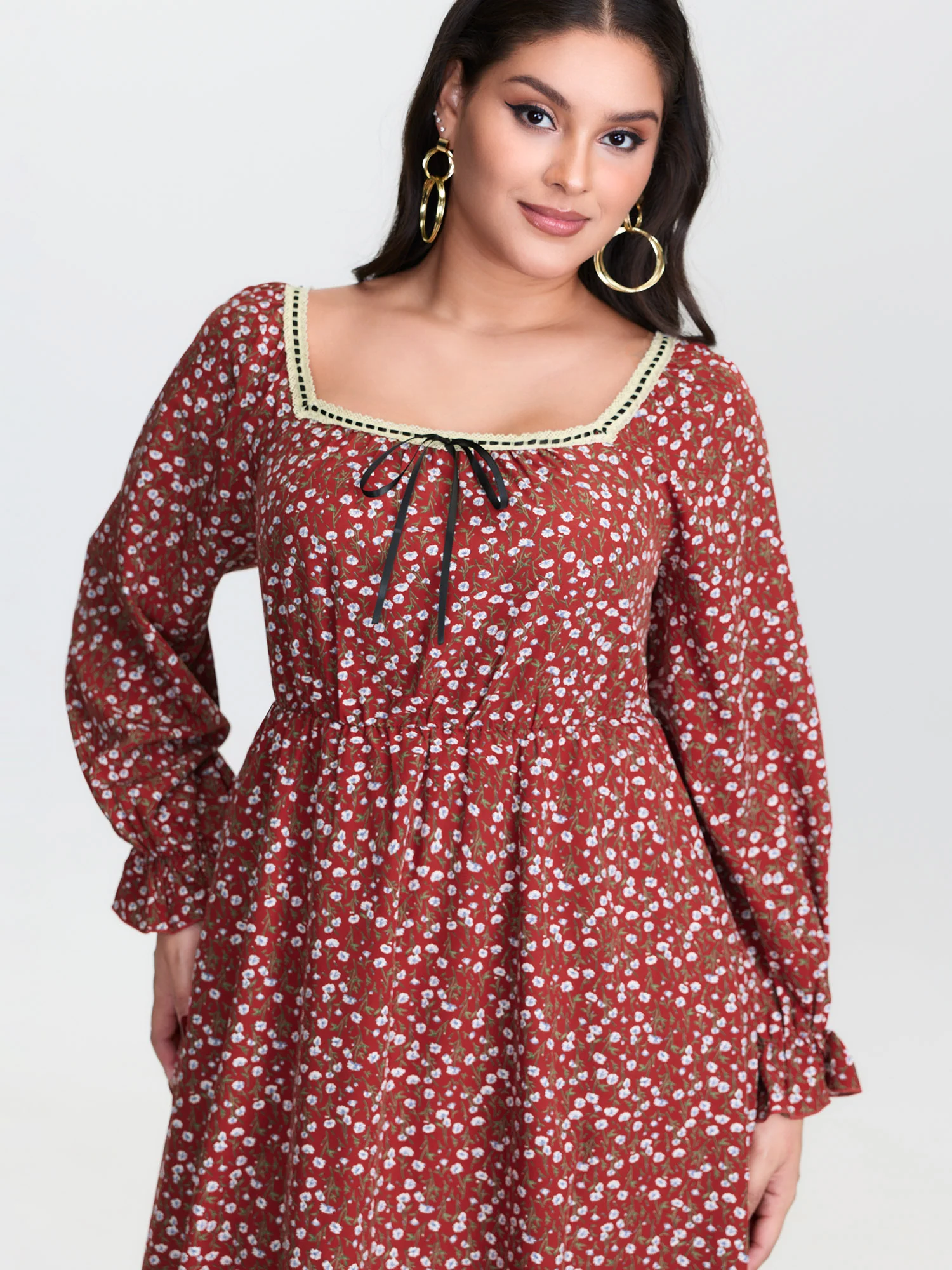 Supersoft Floral Print Lace Trim Knee-Length Dress