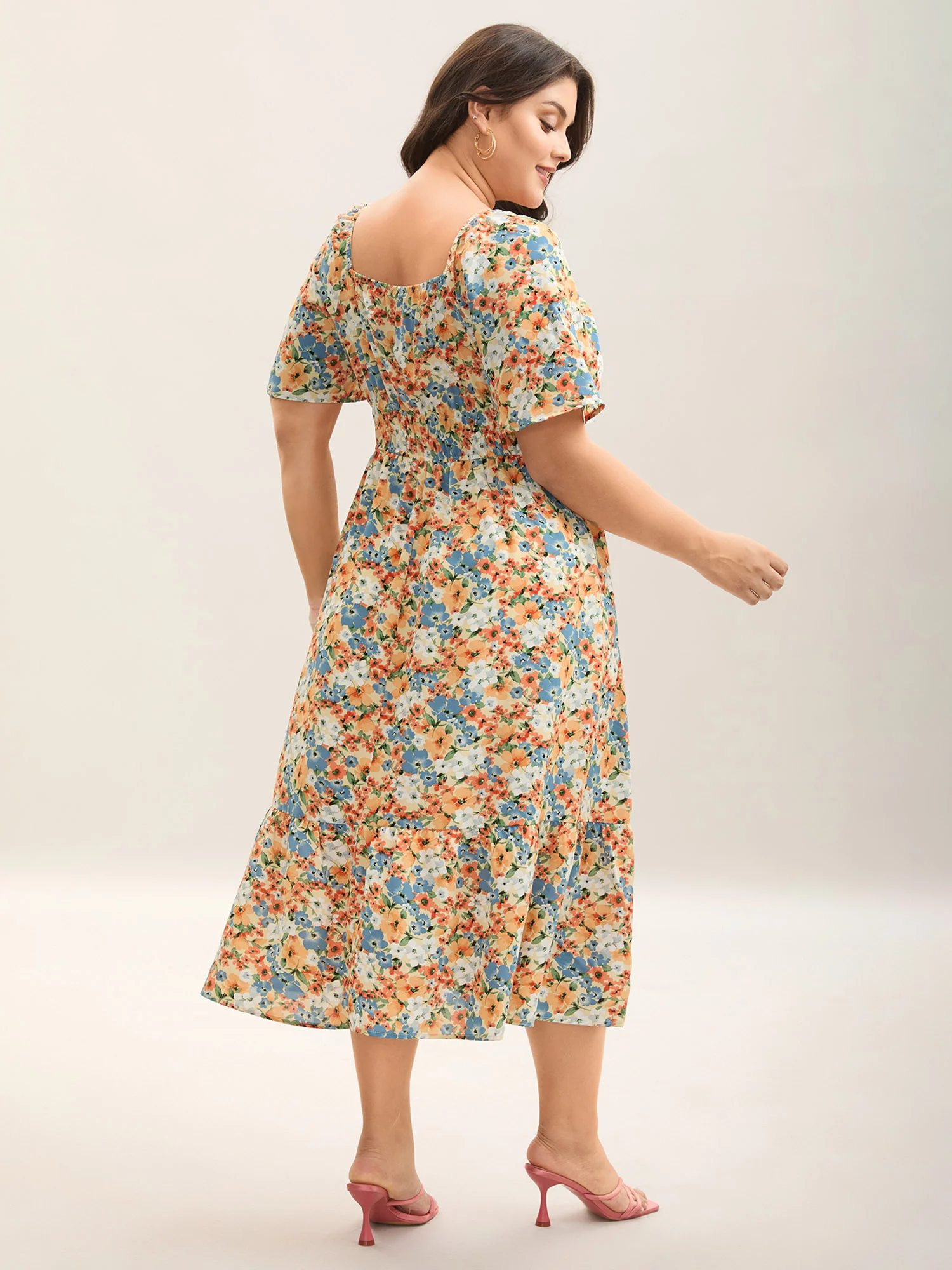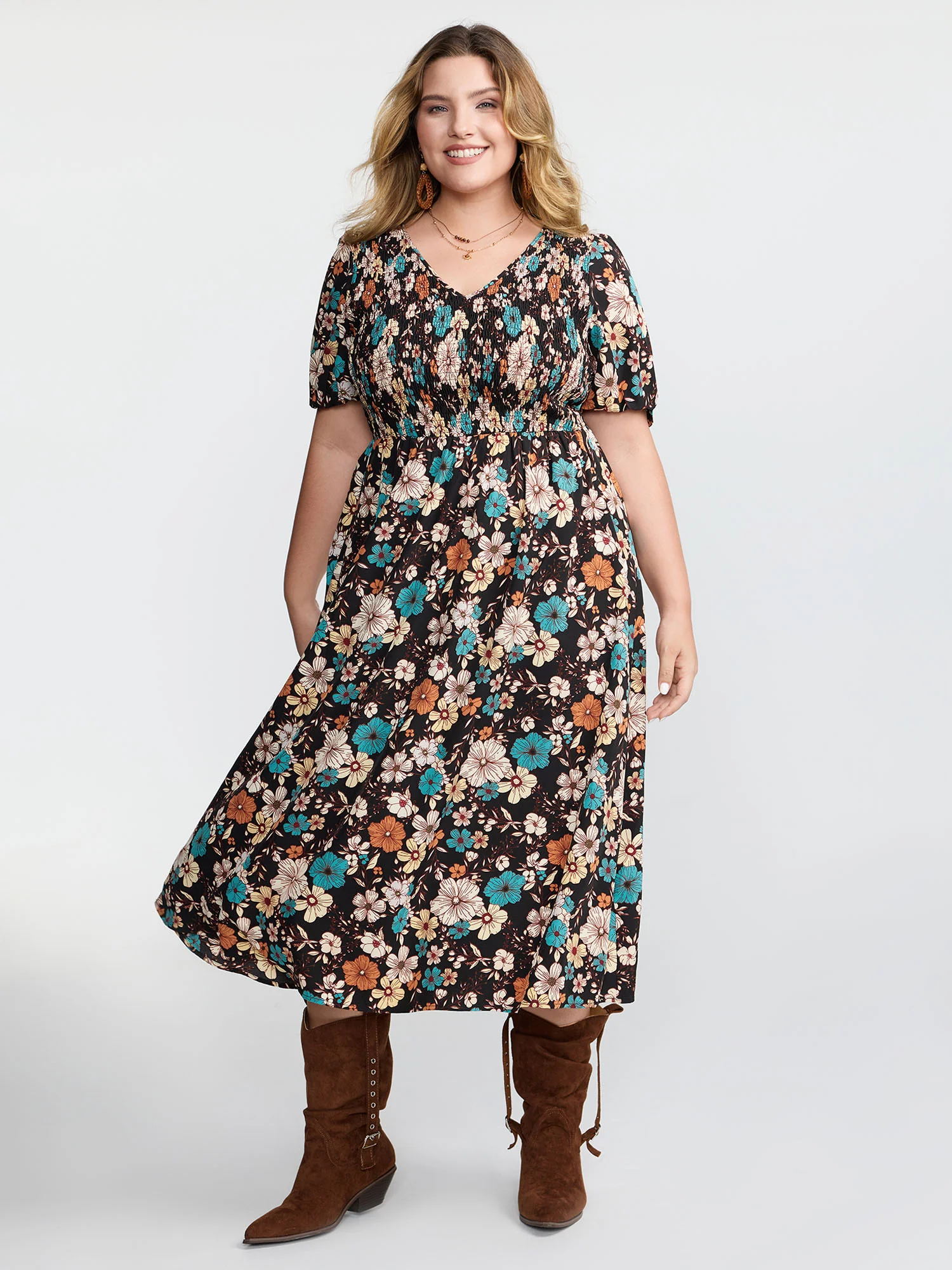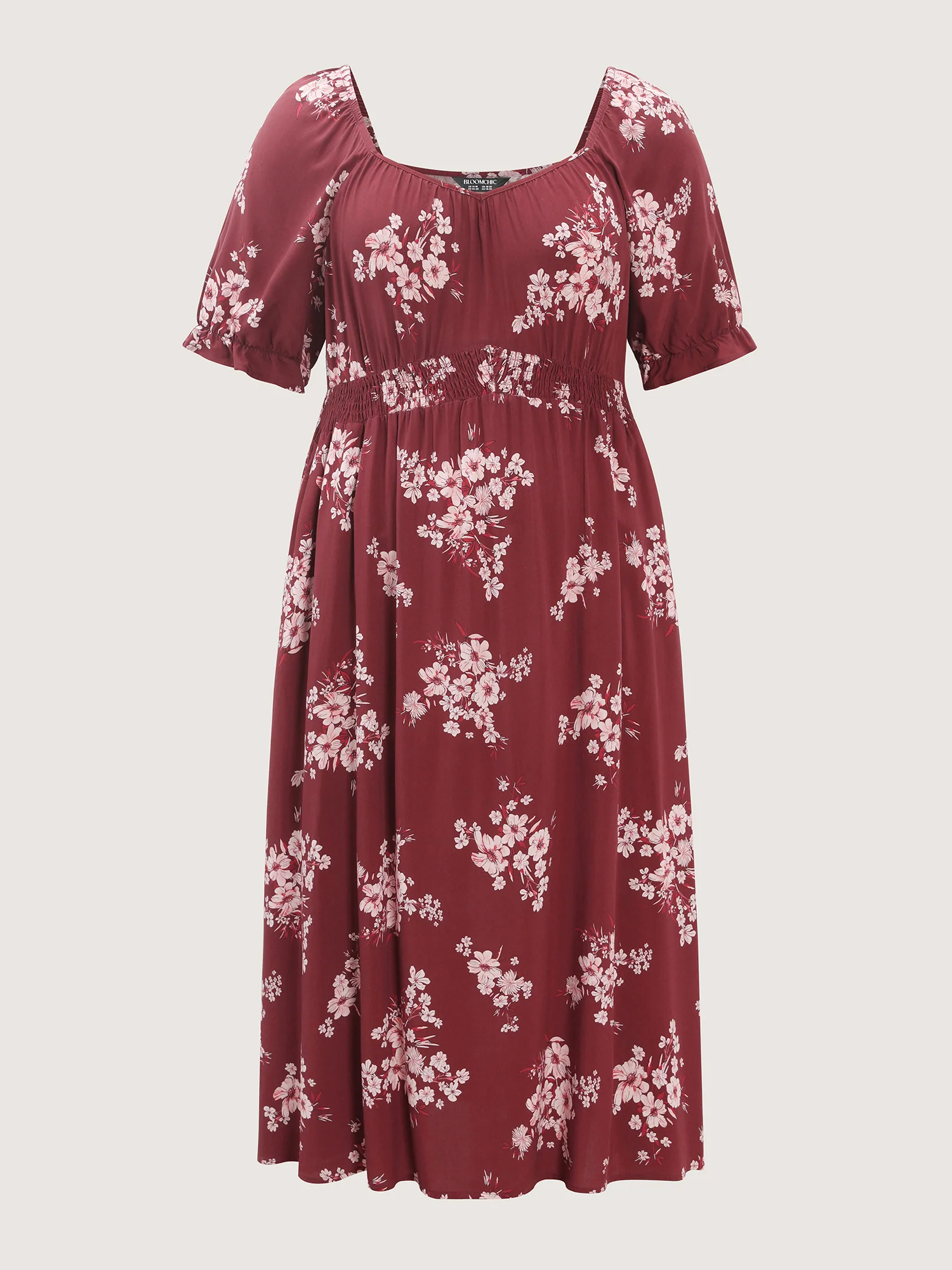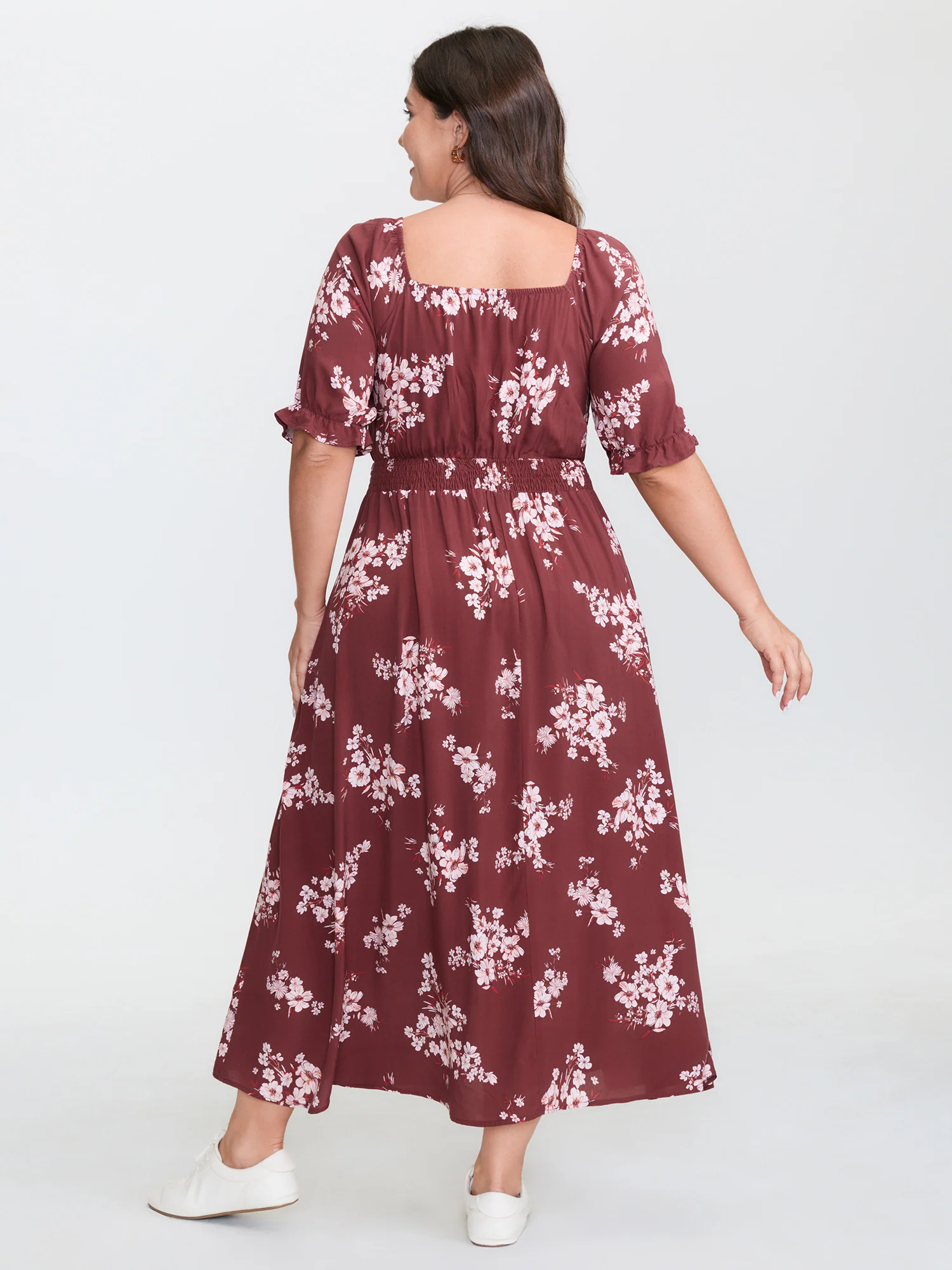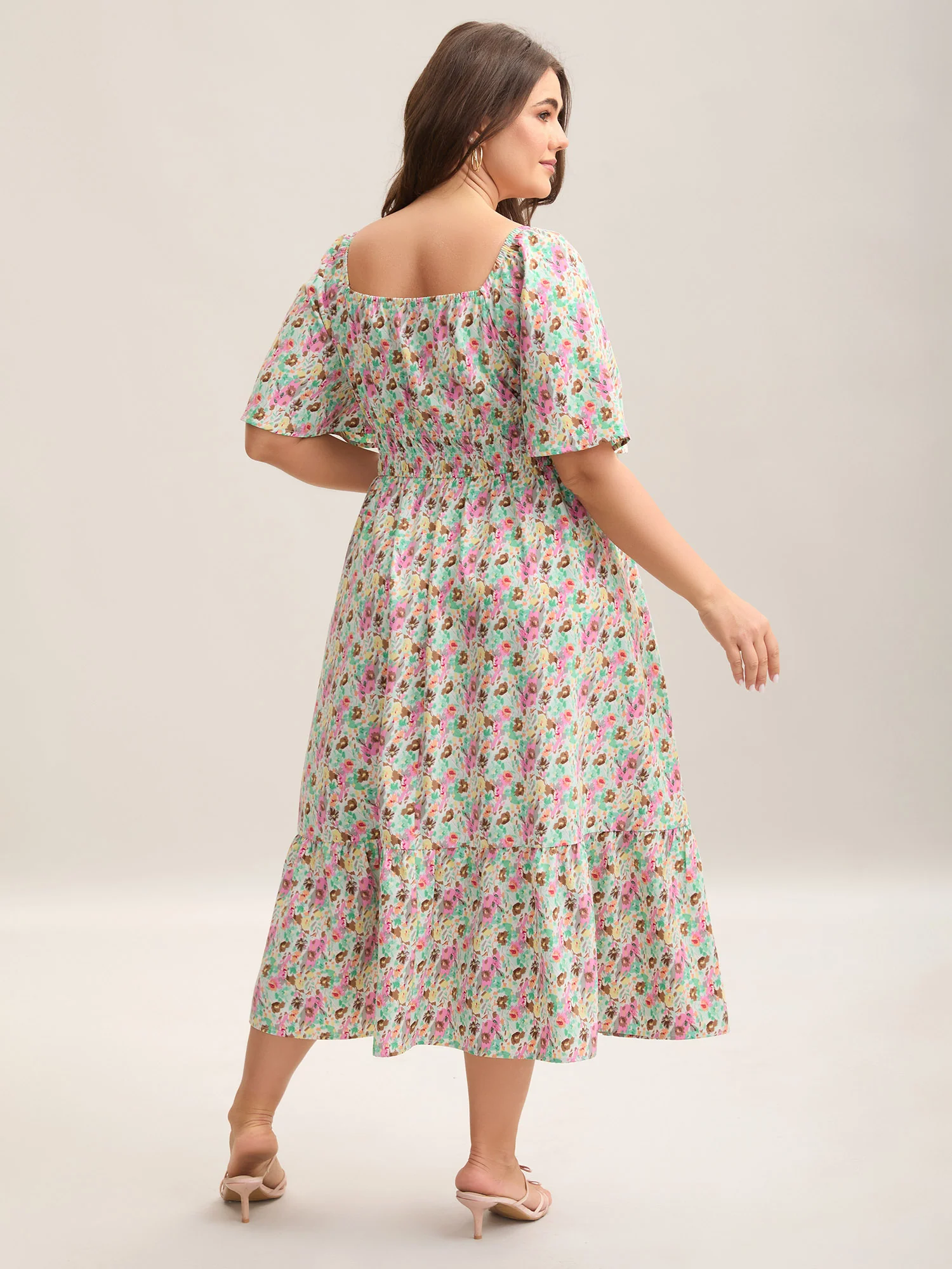 Ruffled Floral Print Stretchy-Waist Midi Dress