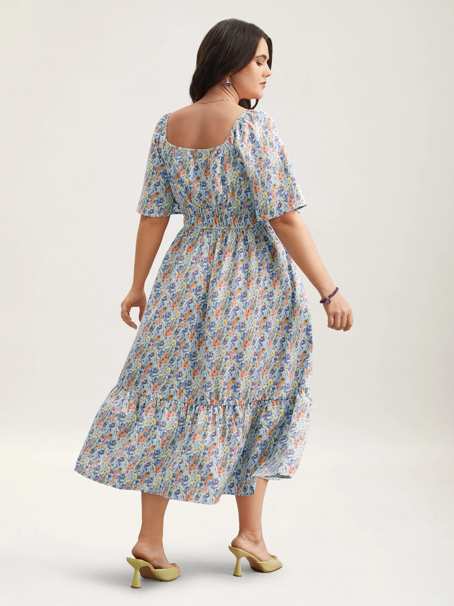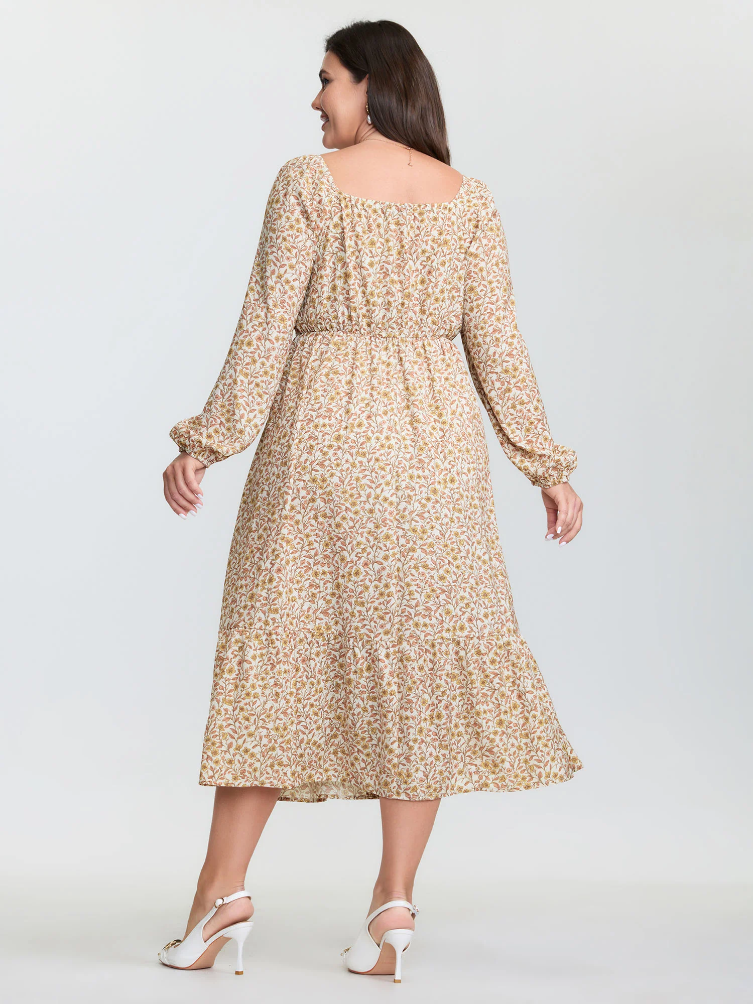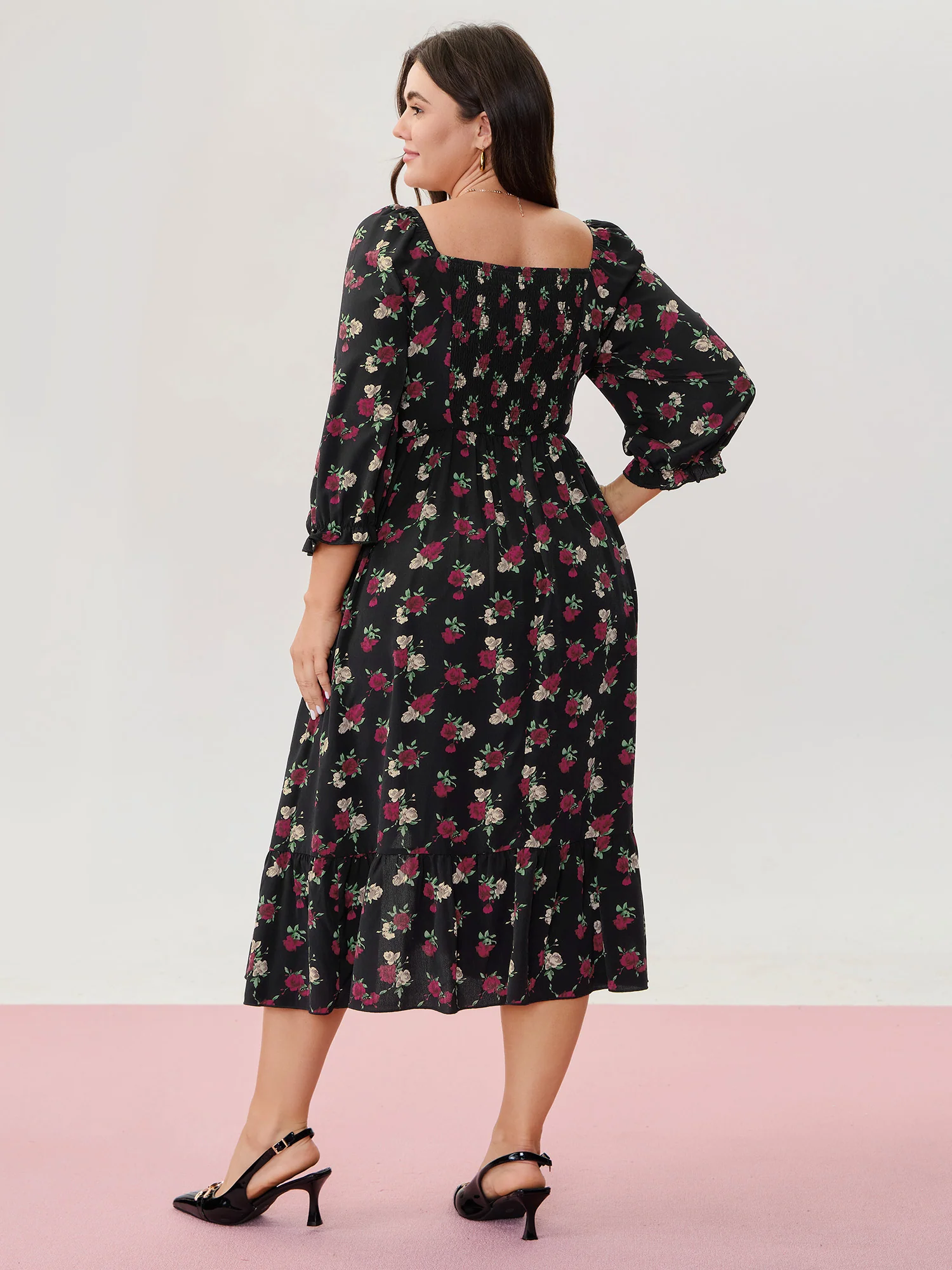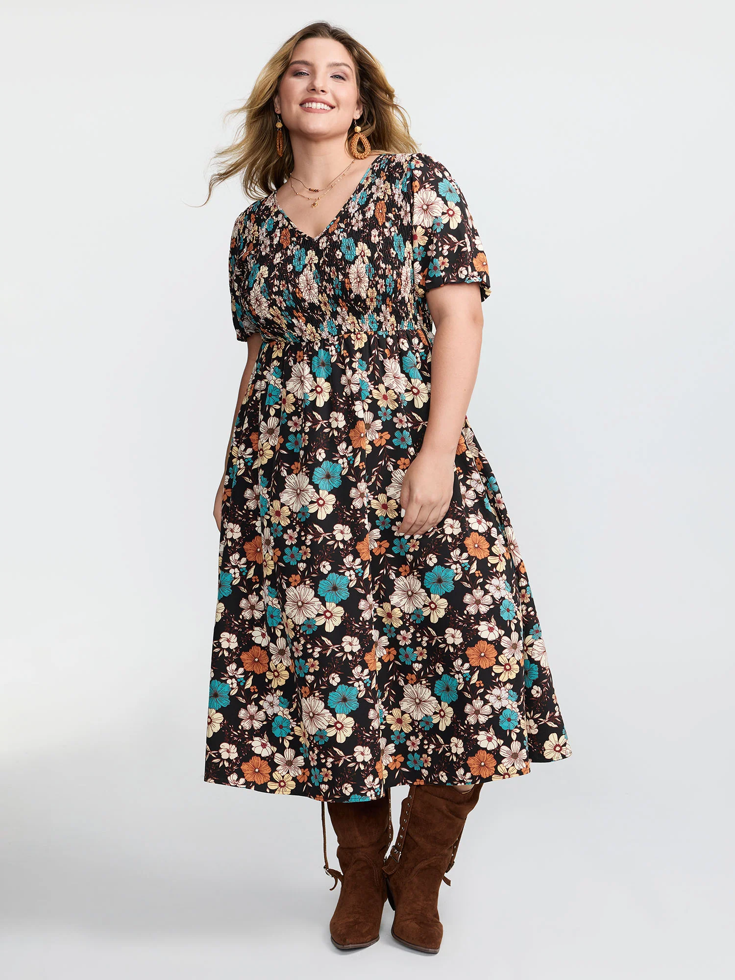 Ruffled Floral Print Stretchy-Waist Midi Dress