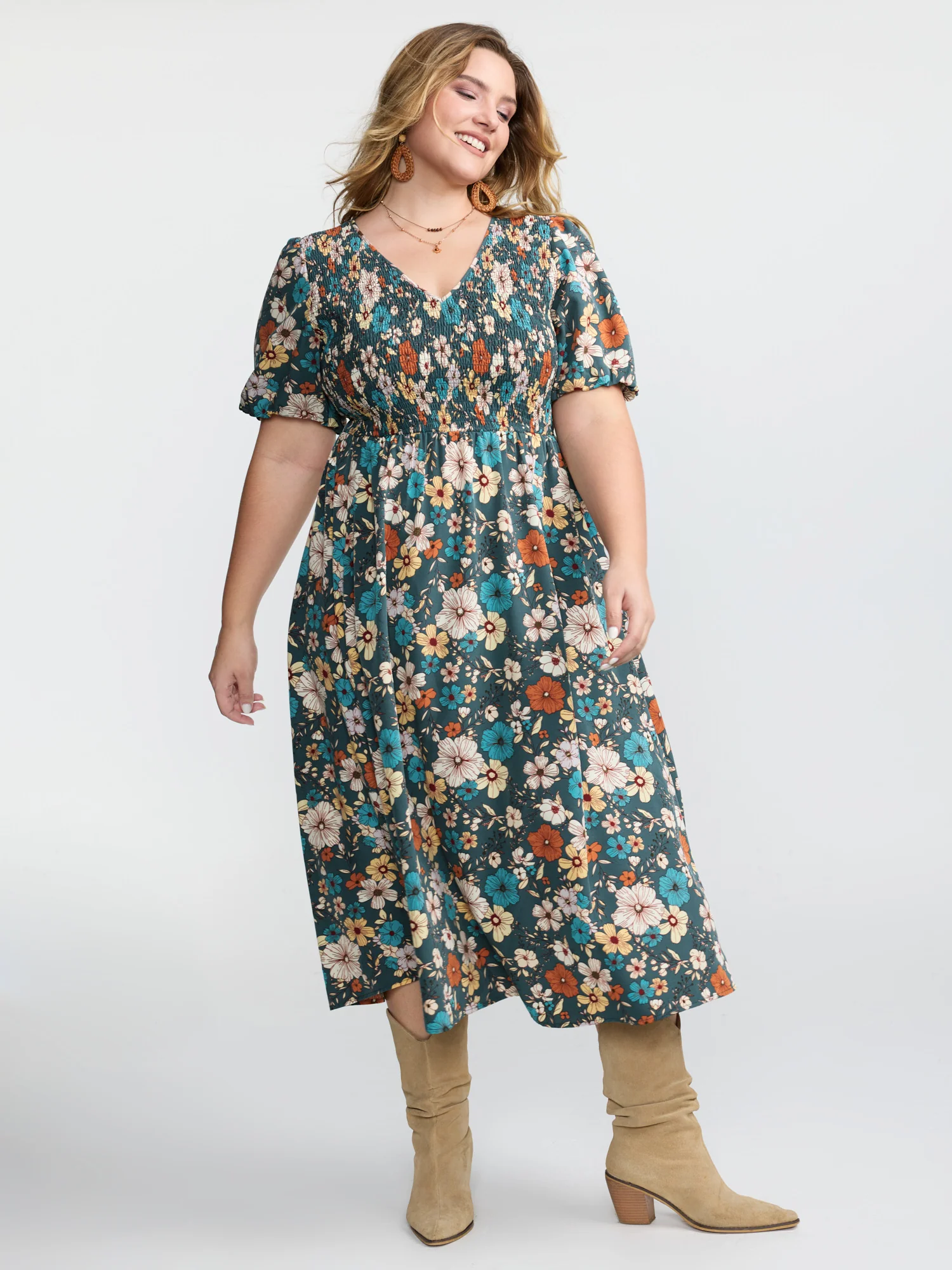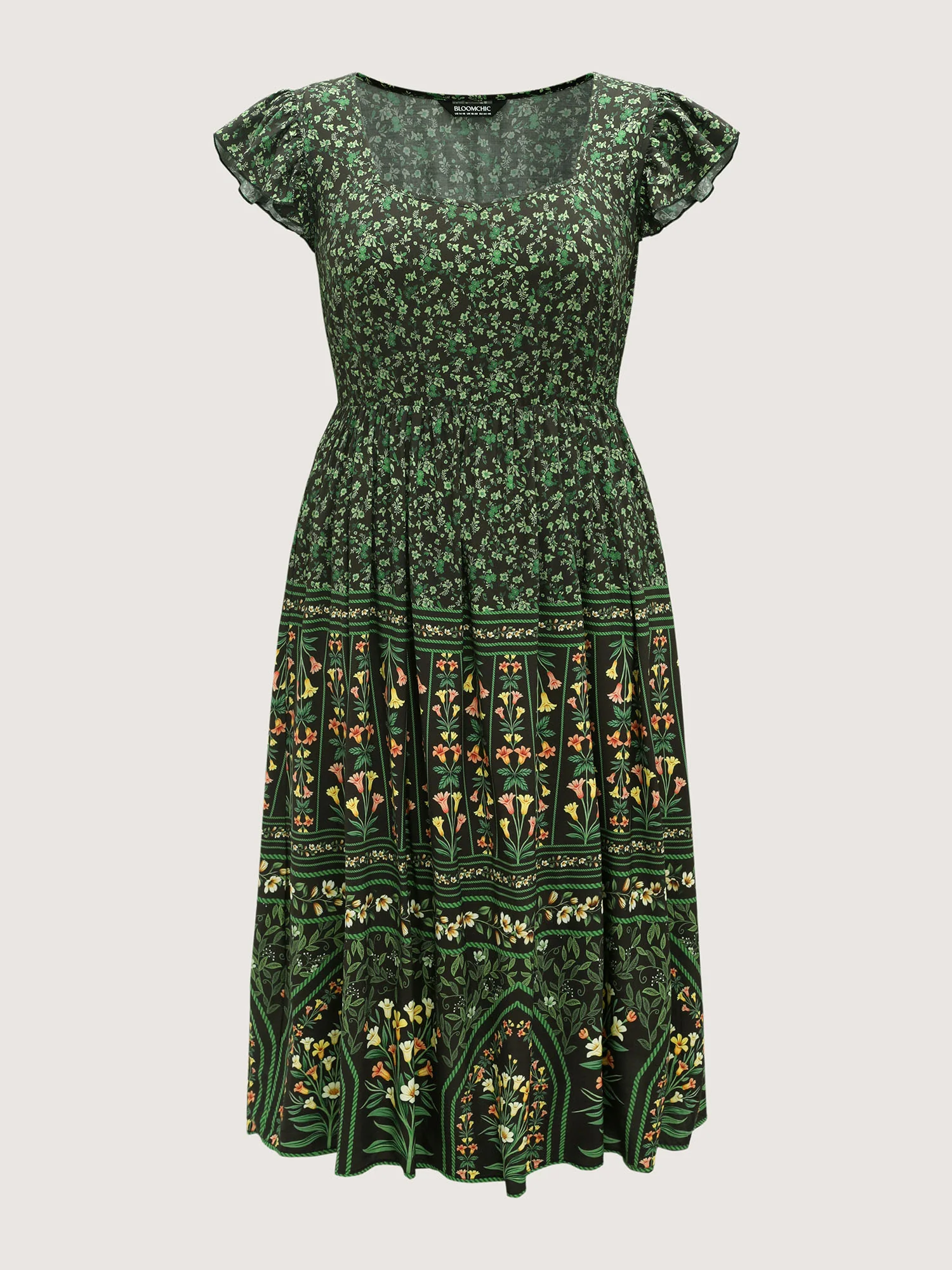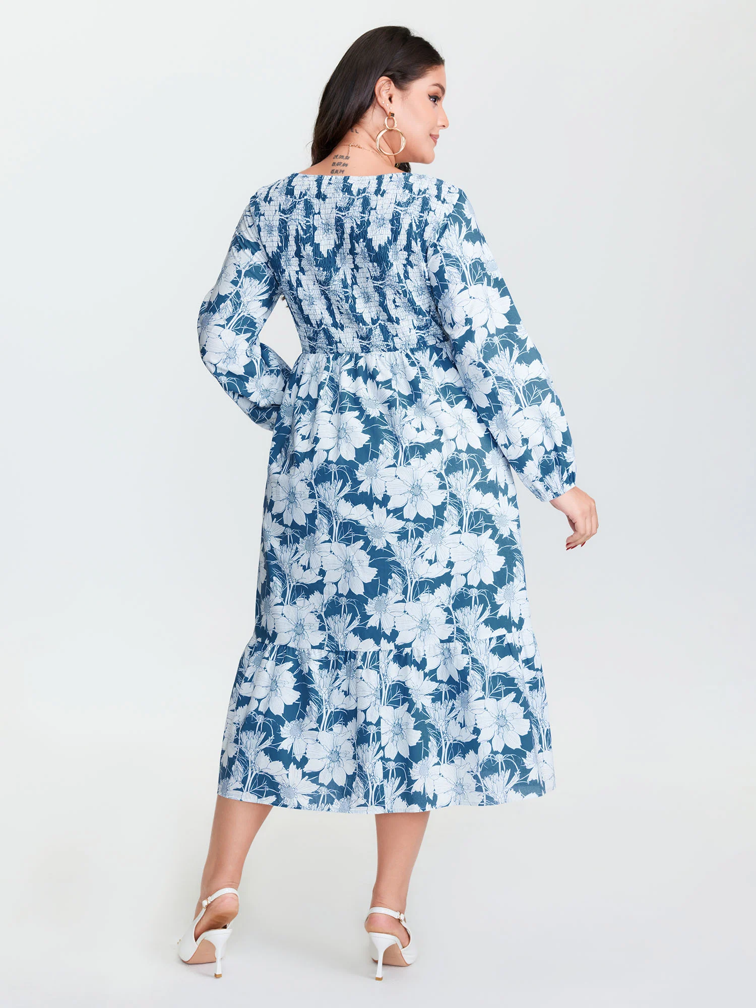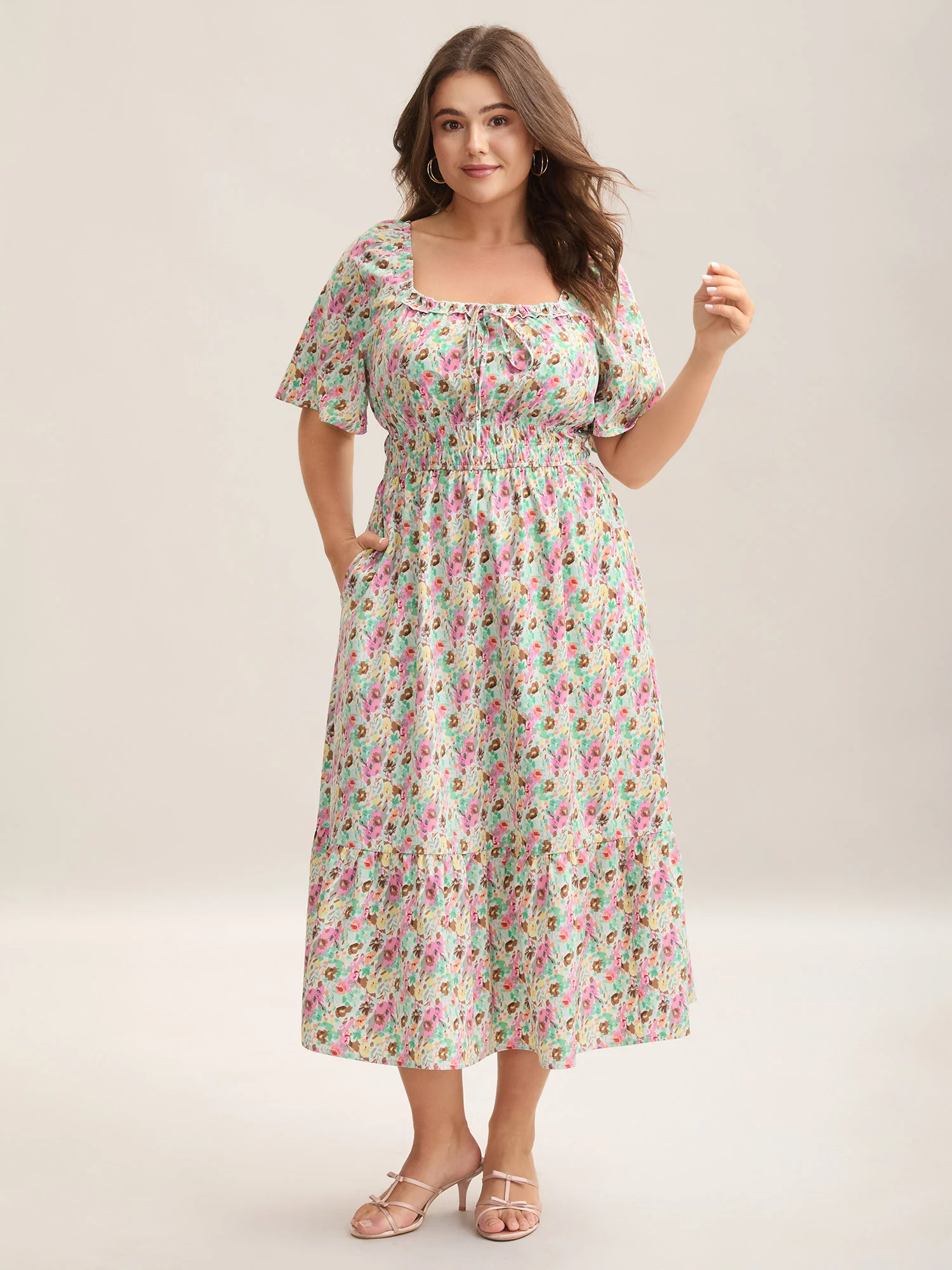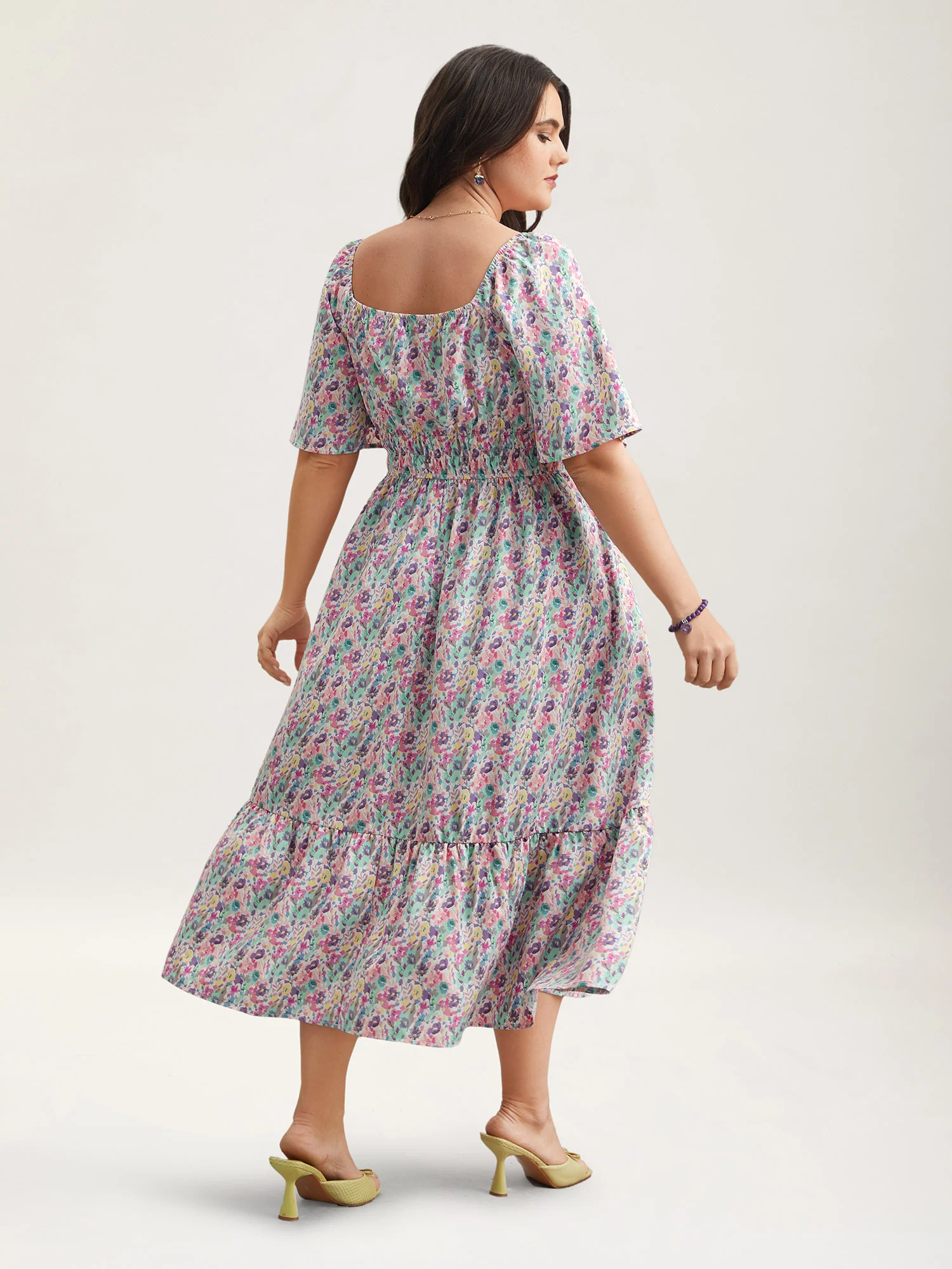 Ruffled Floral Print Stretchy-Waist Midi Dress