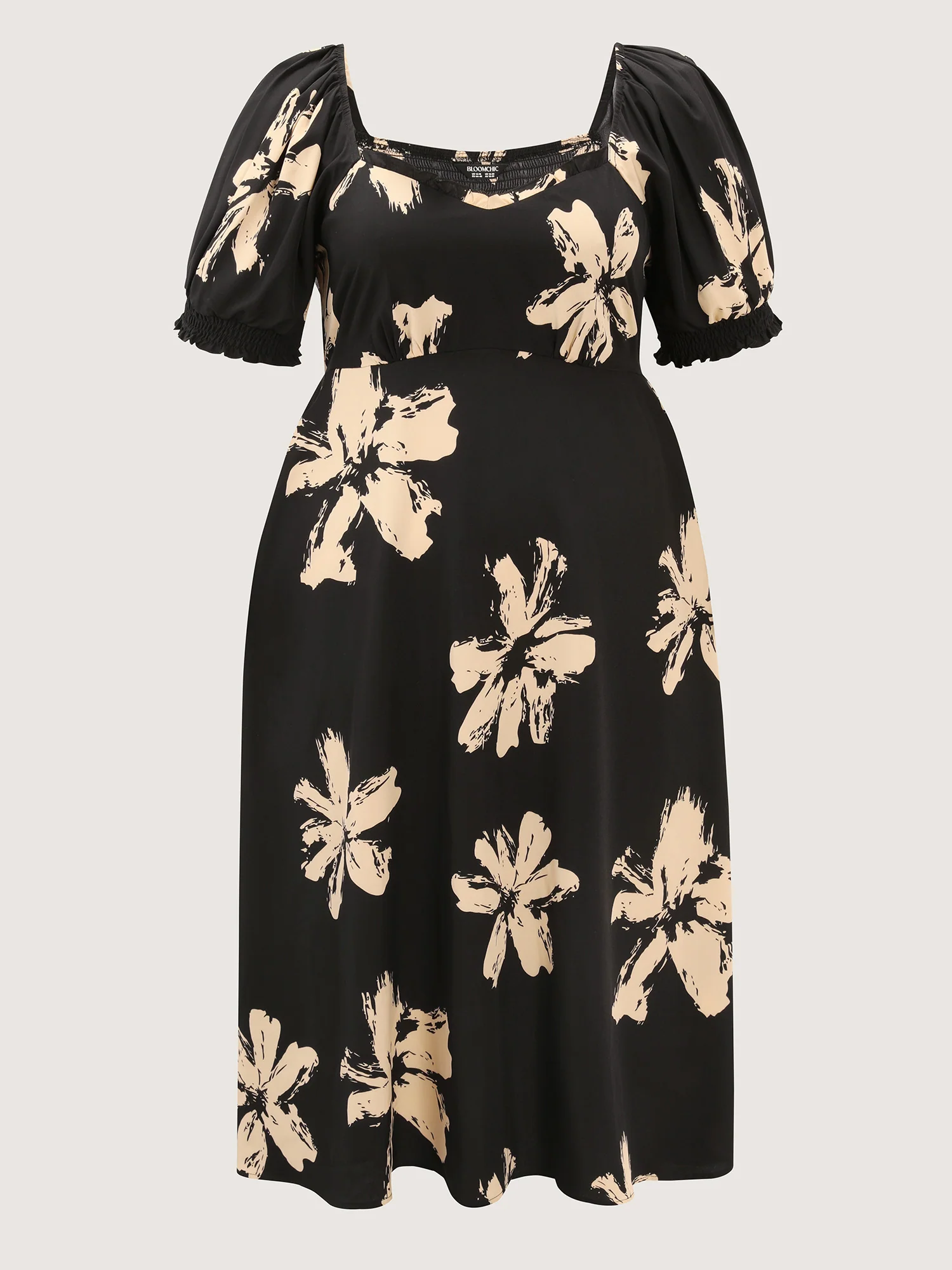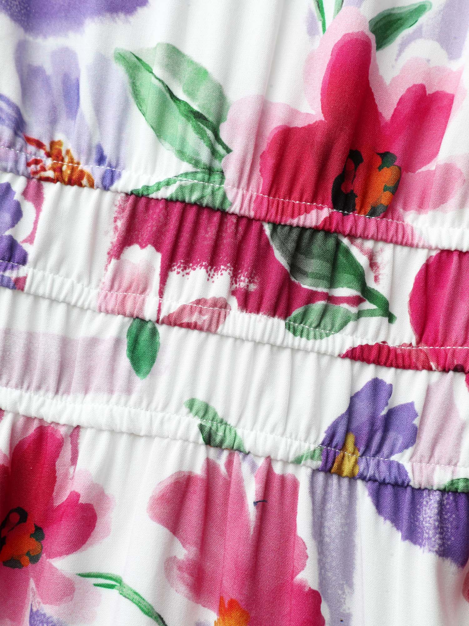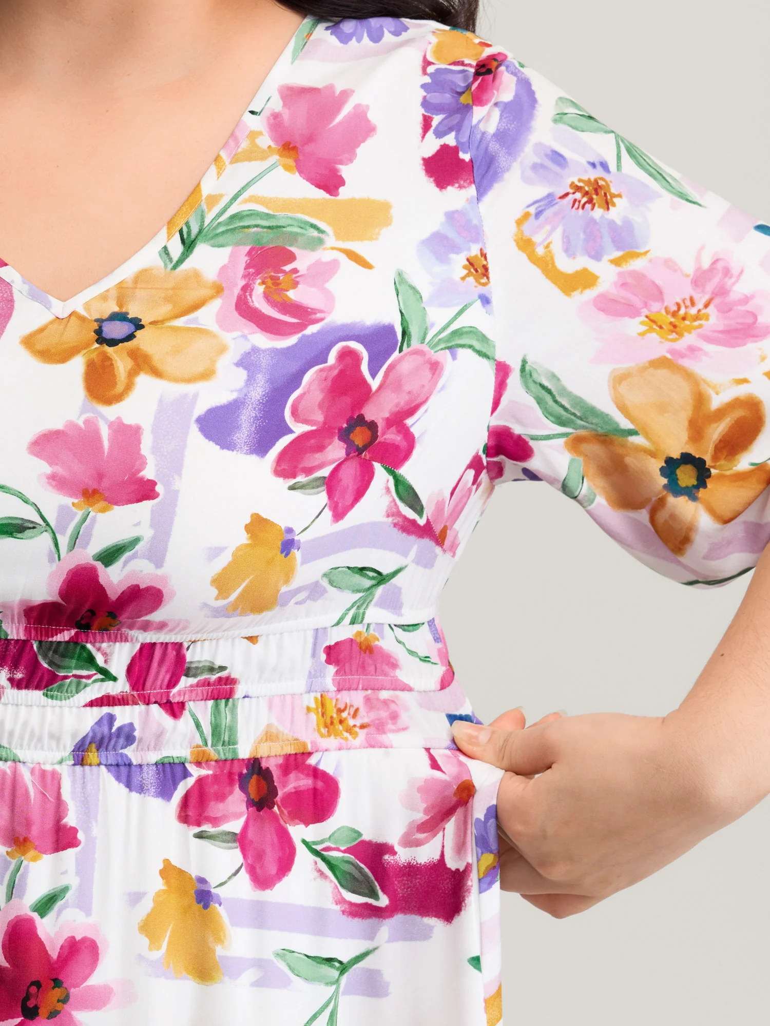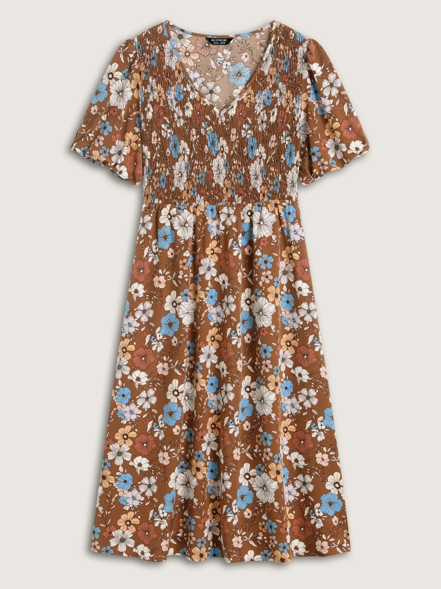 Ruffled Floral Print Stretchy-Waist Midi Dress