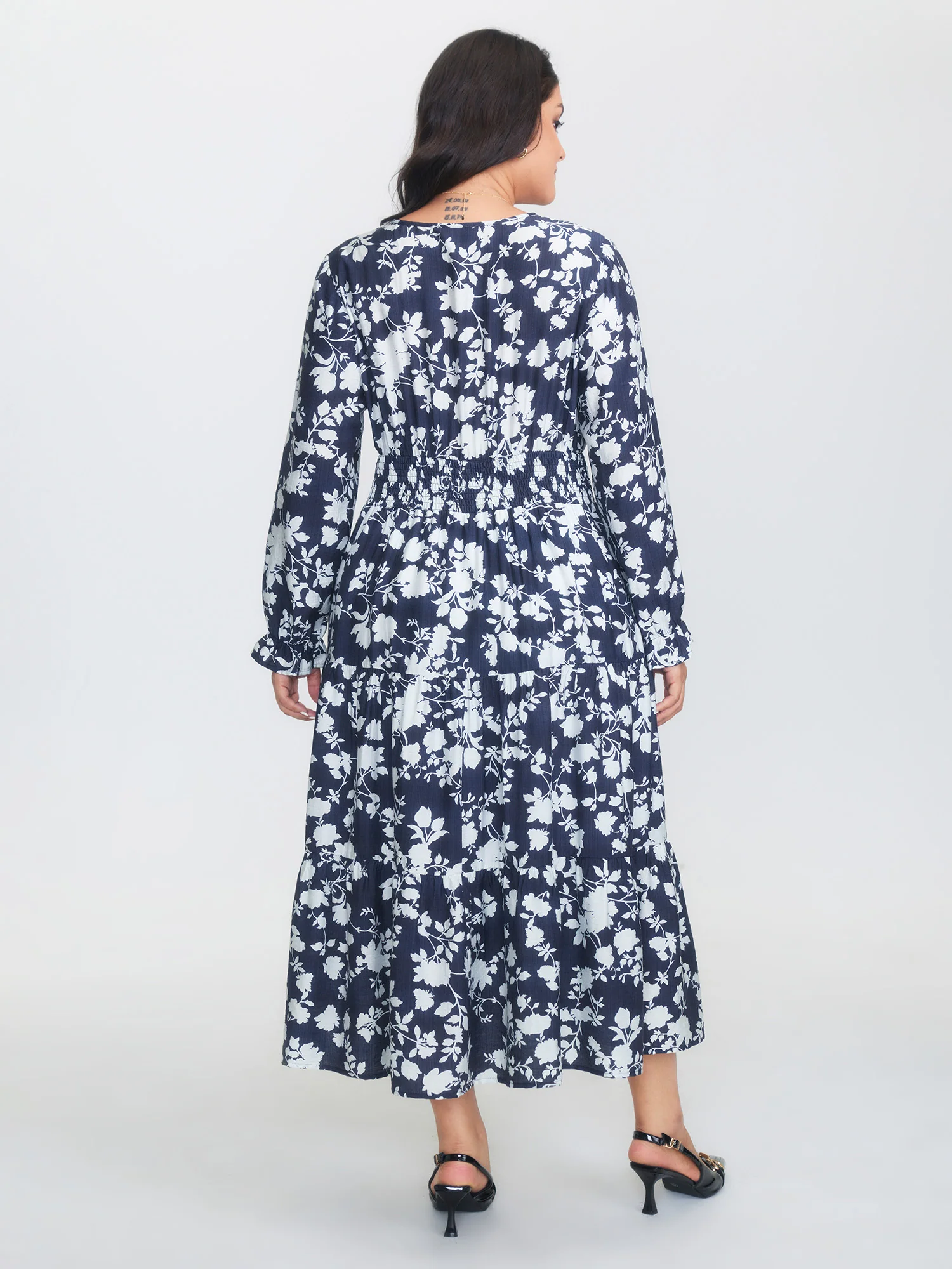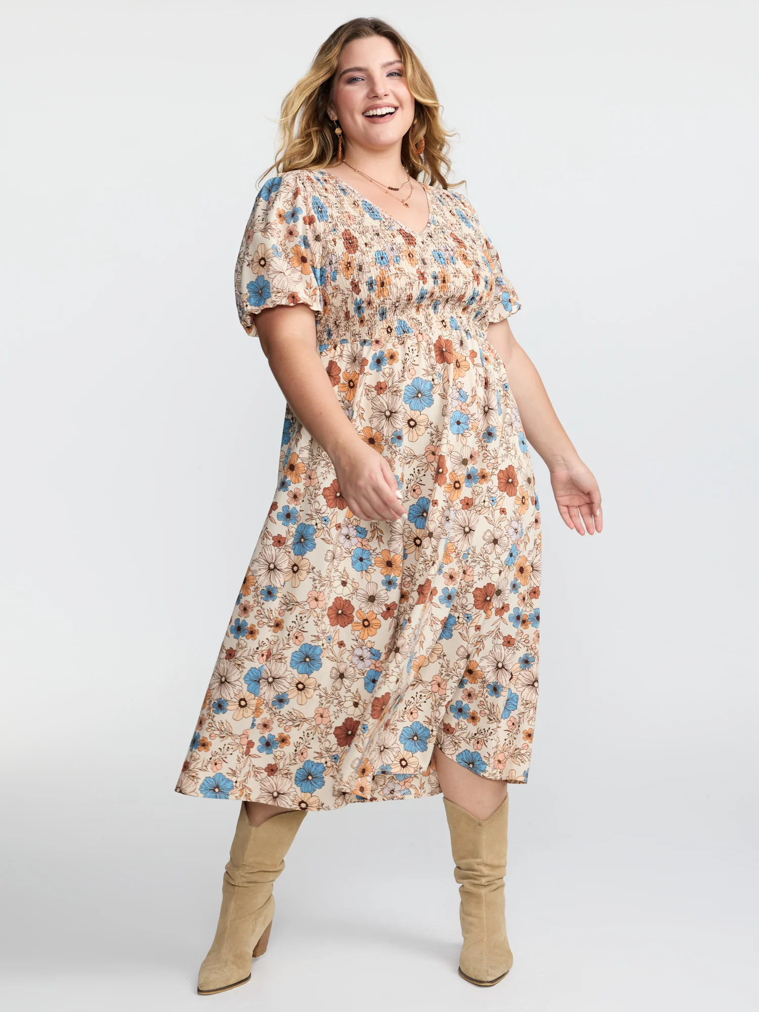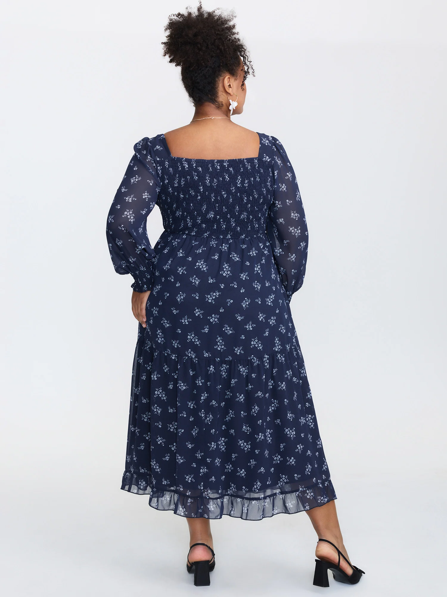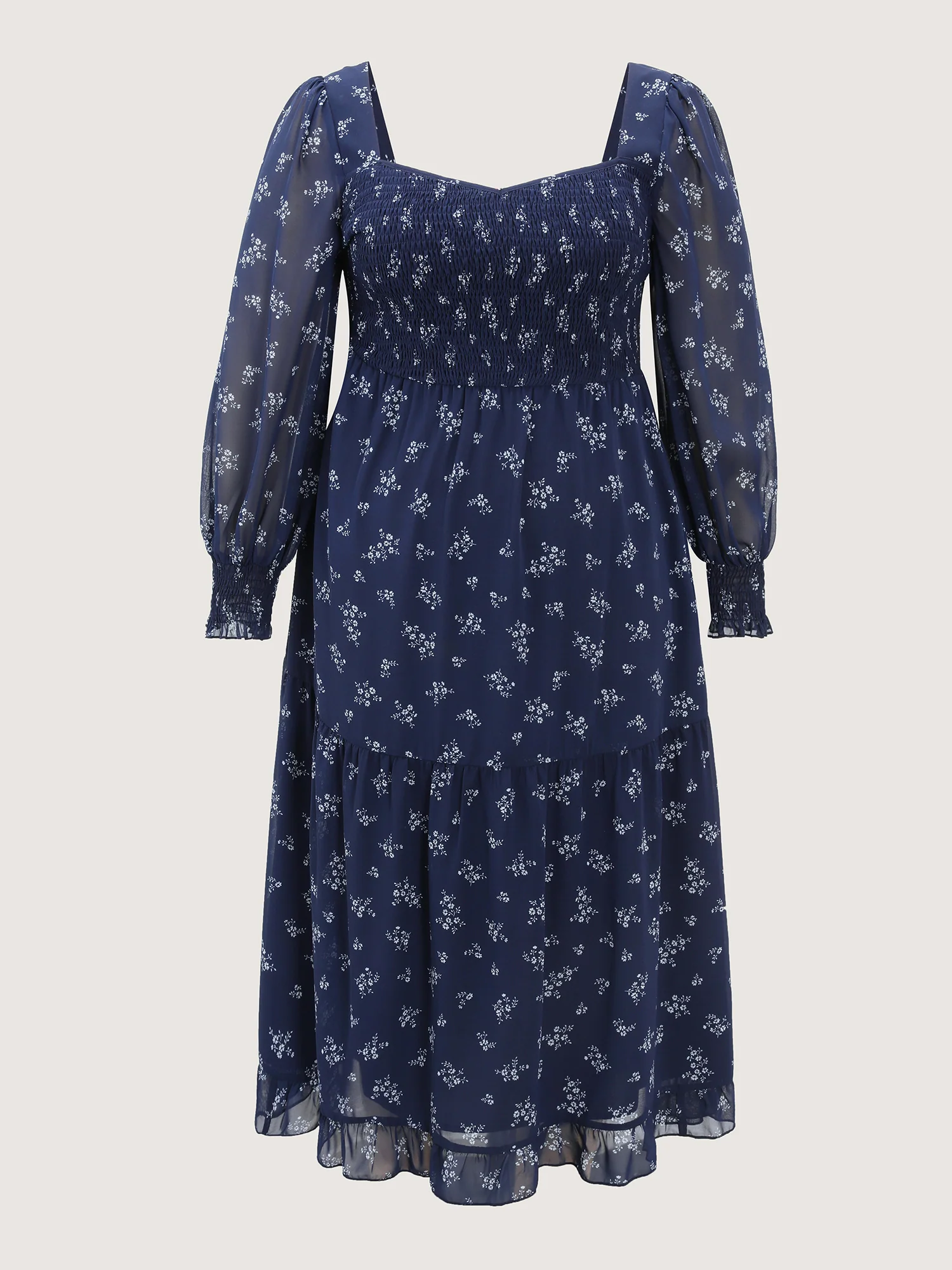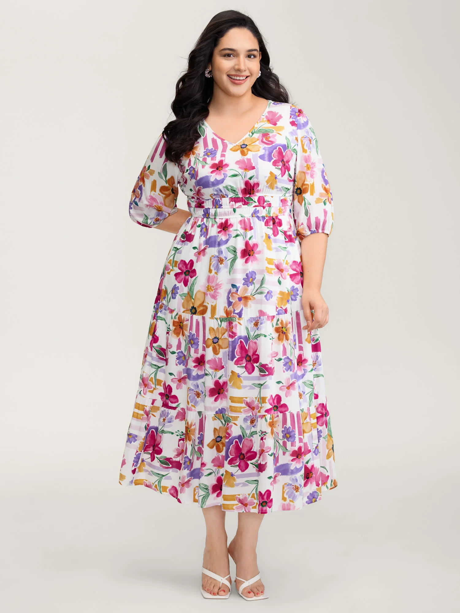Ruffled Floral Print Stretchy-Waist Midi Dress
