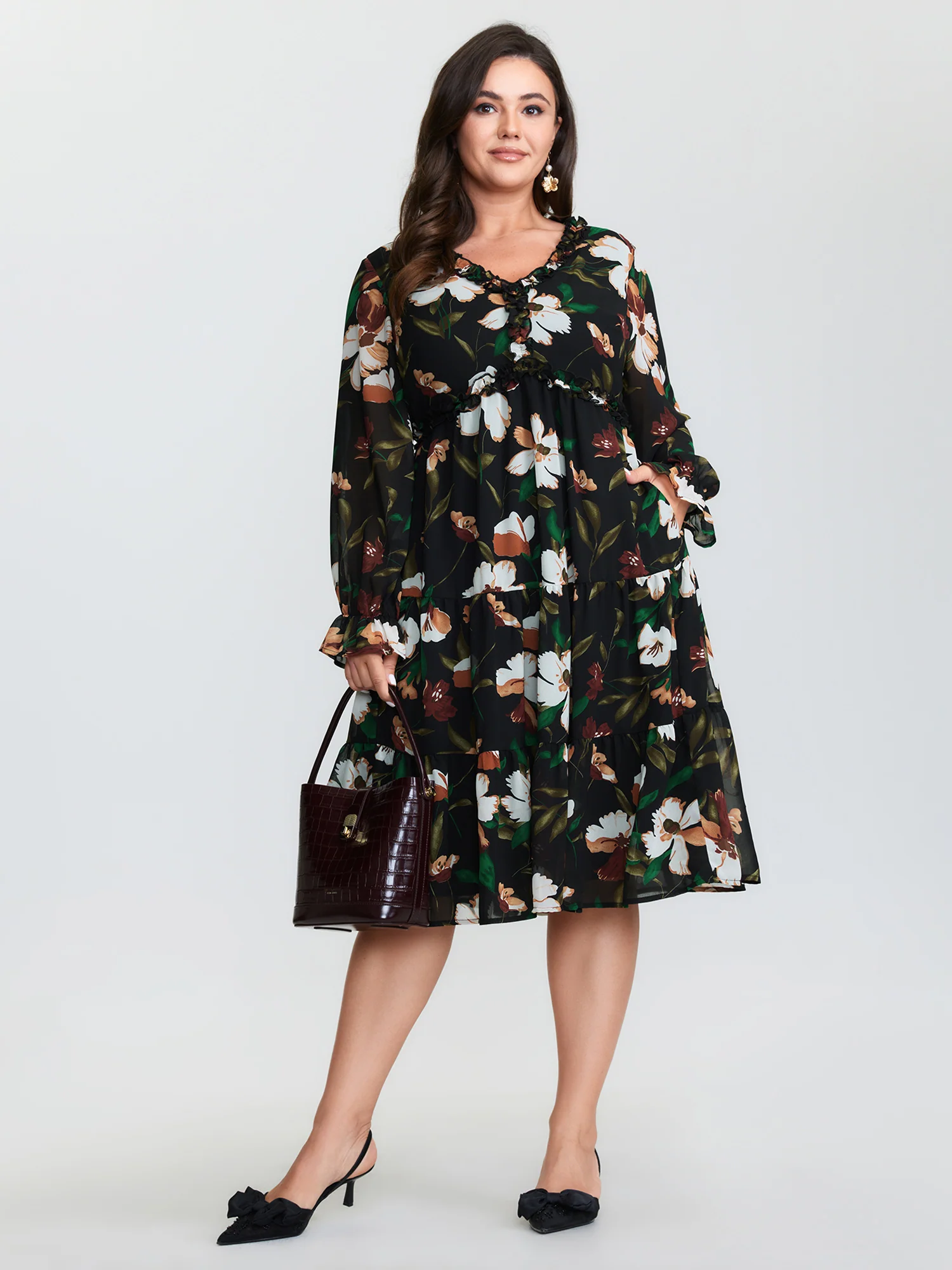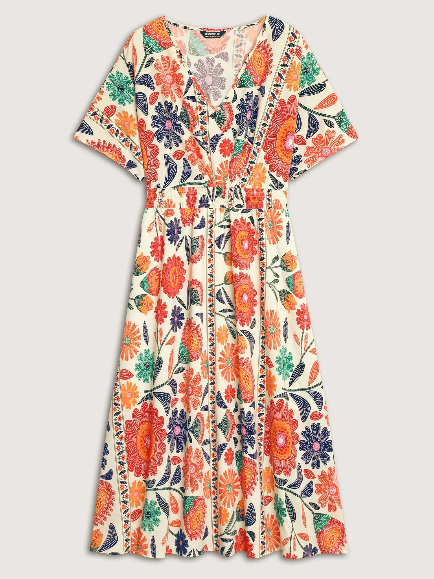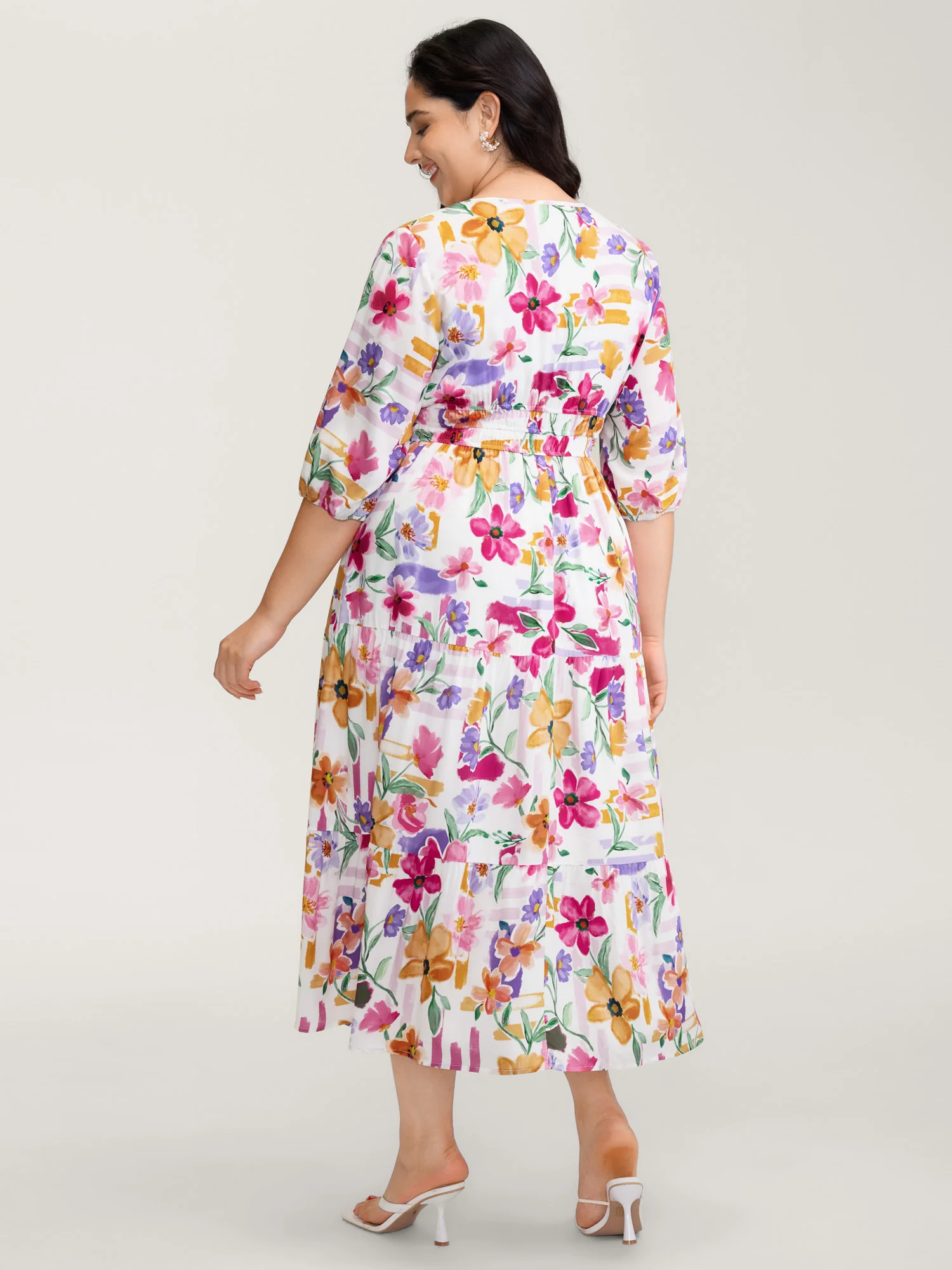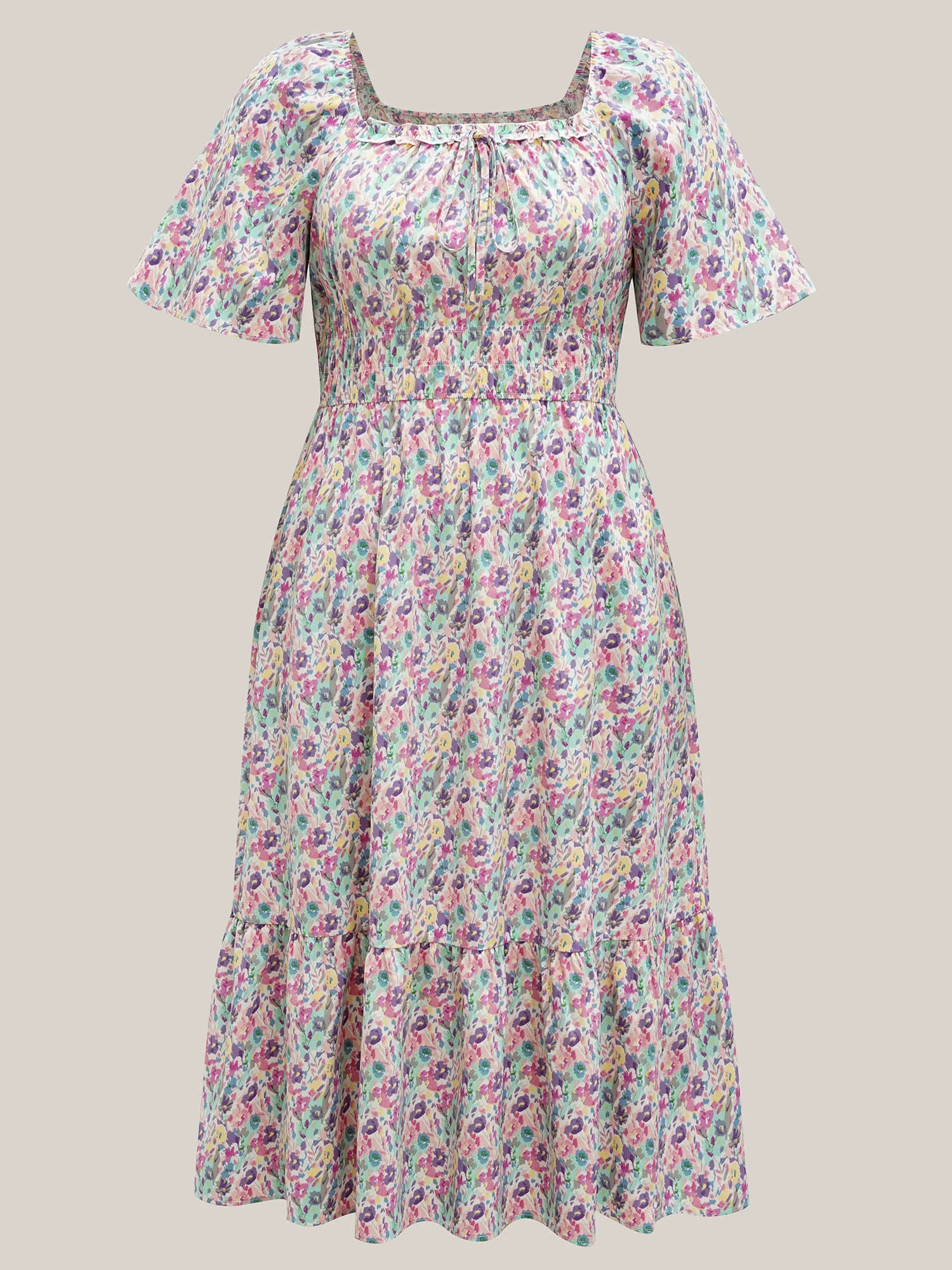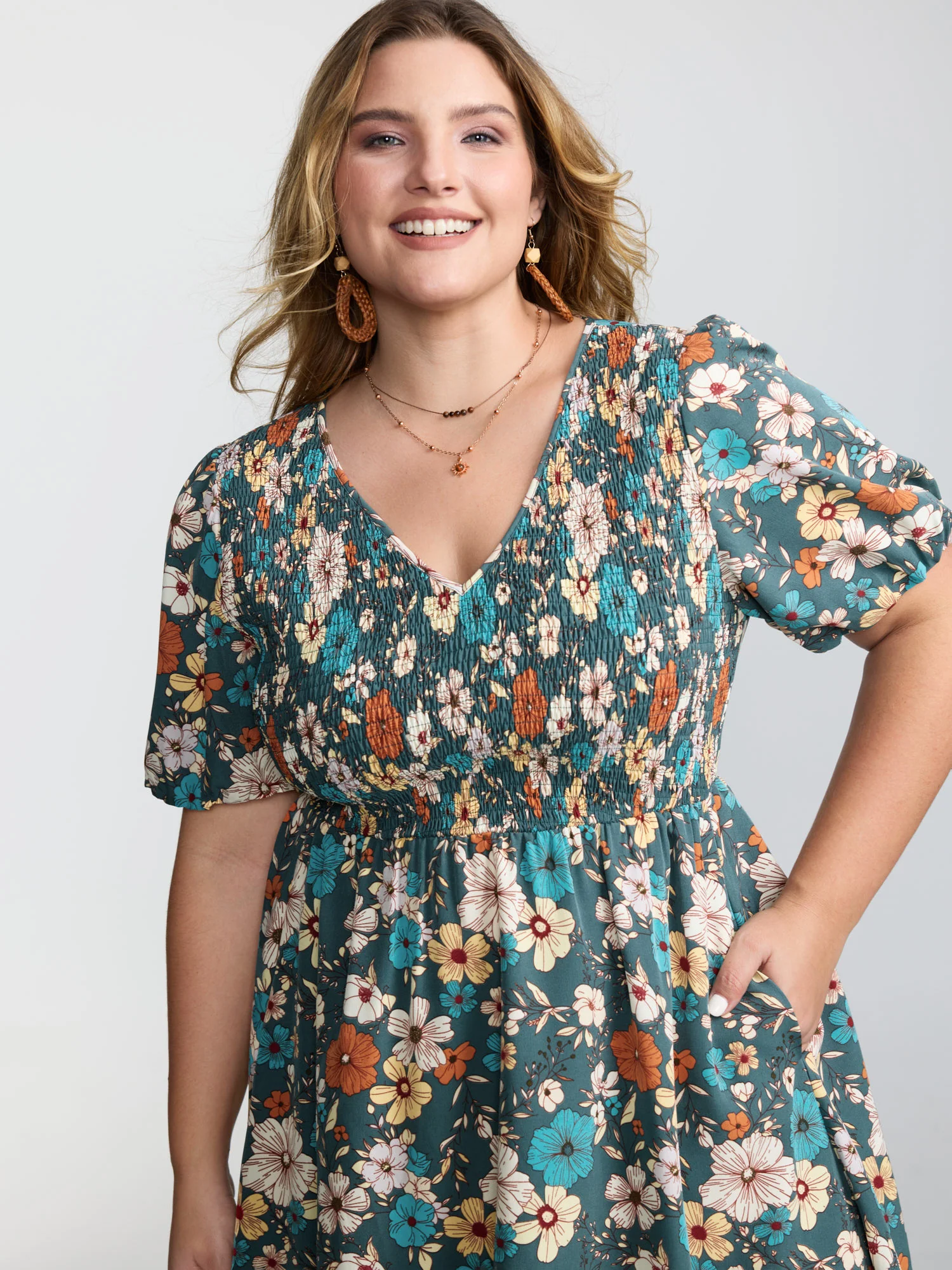 Ruffled Floral Print Stretchy-Waist Midi Dress