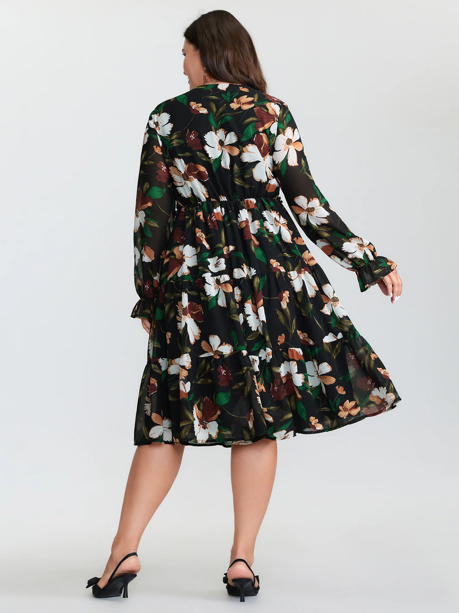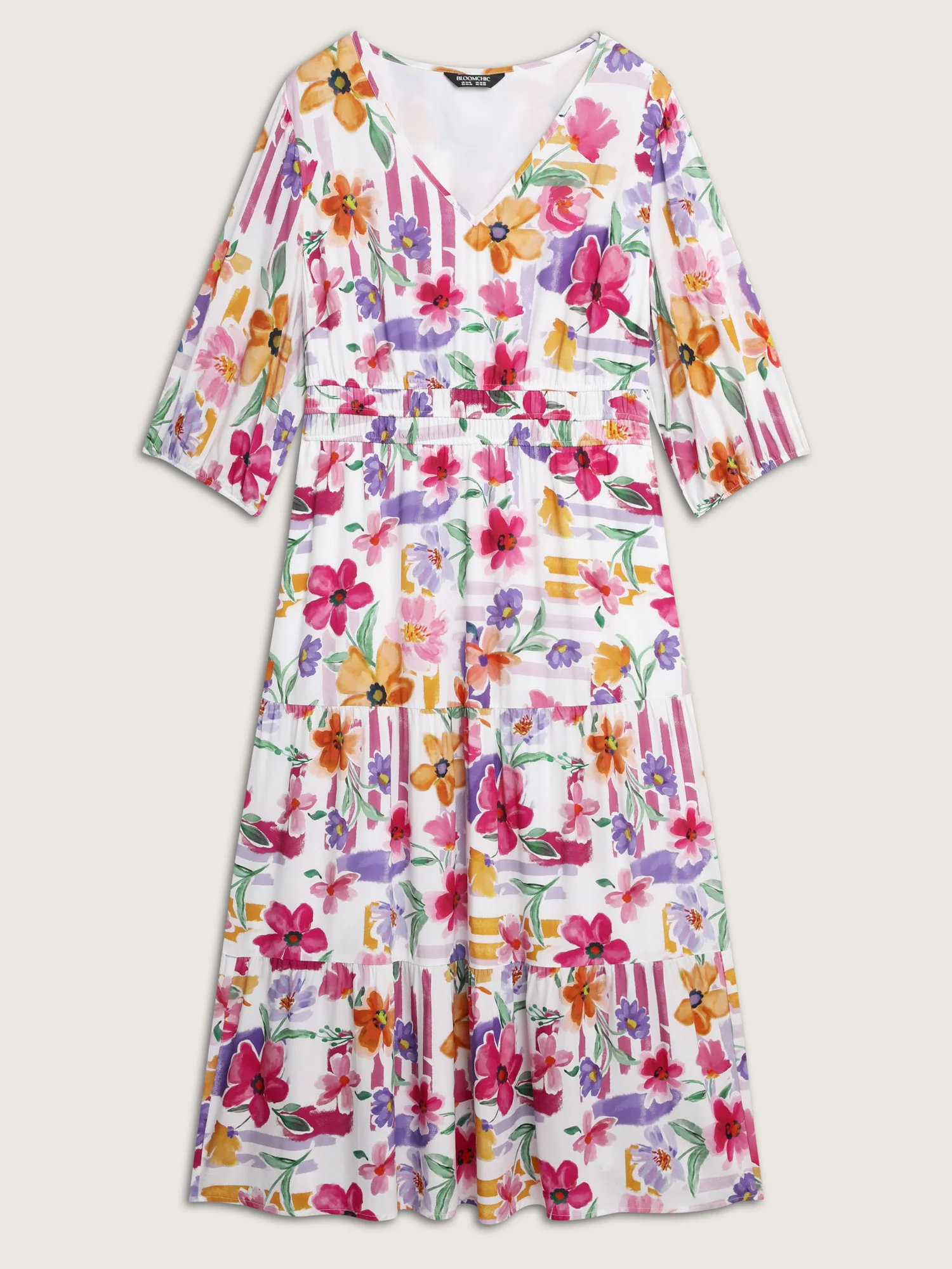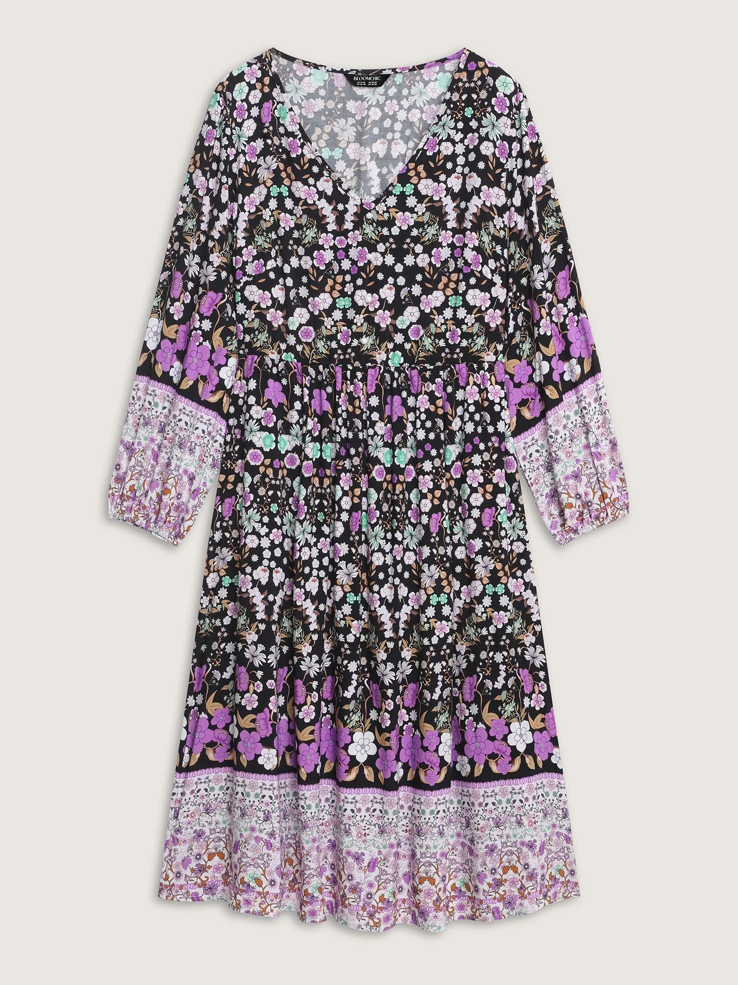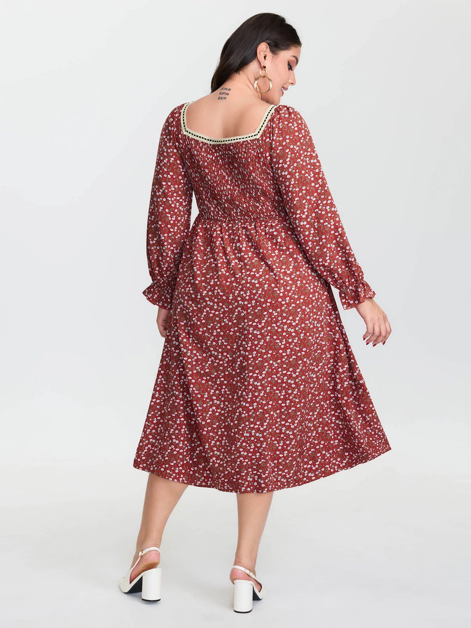 Ruffled Floral Print Stretchy-Waist Midi Dress