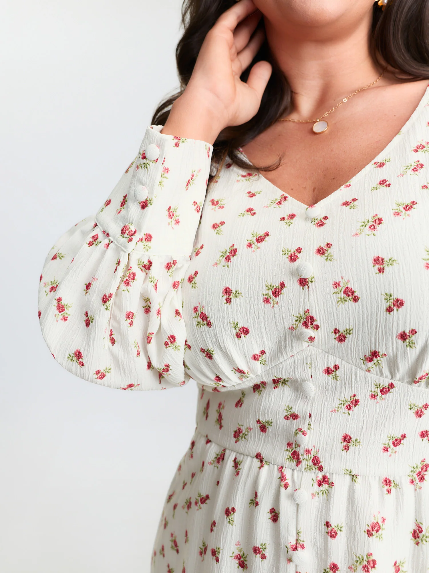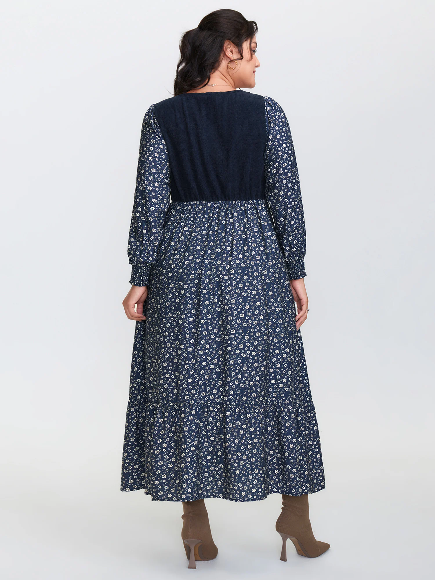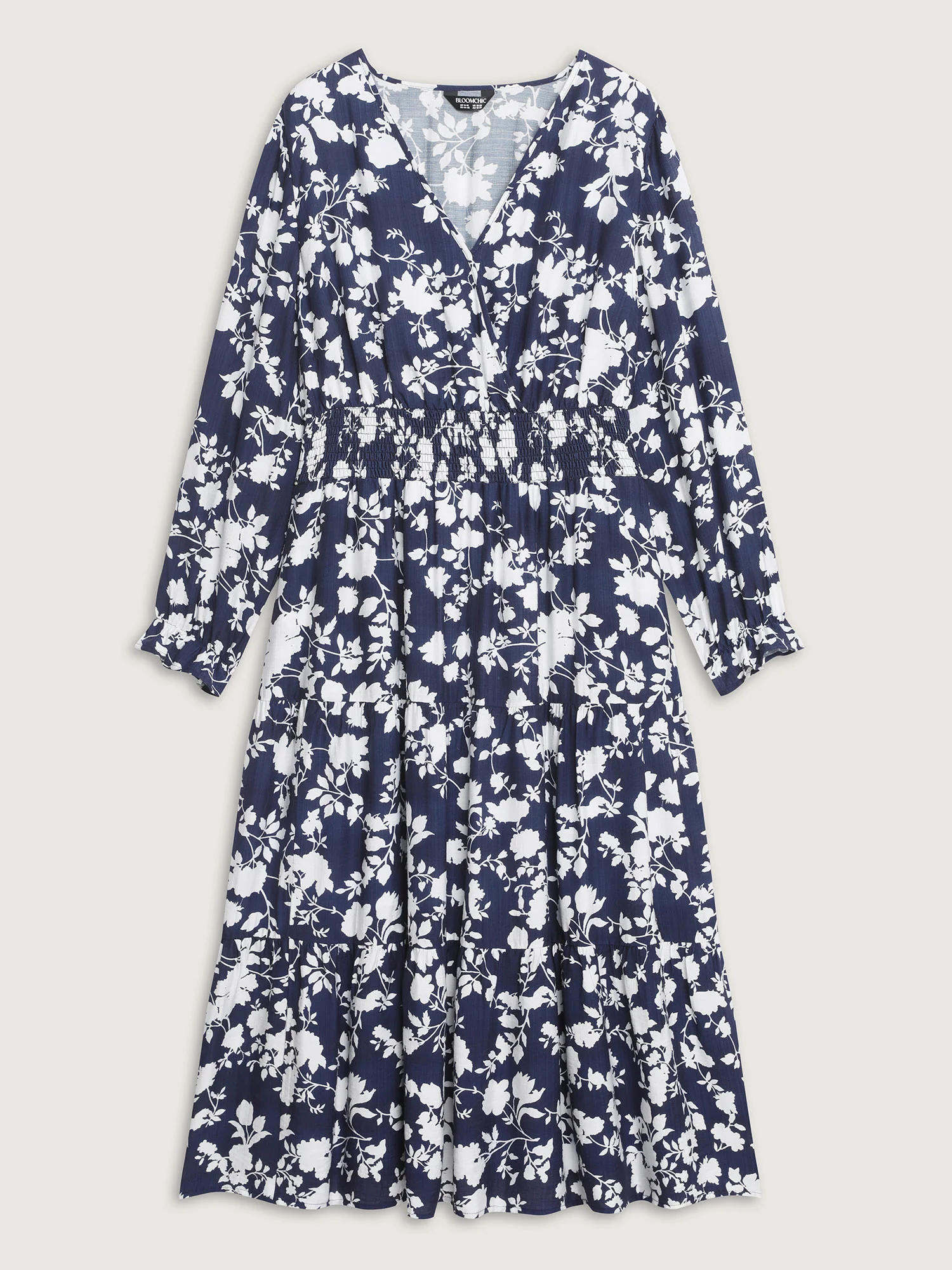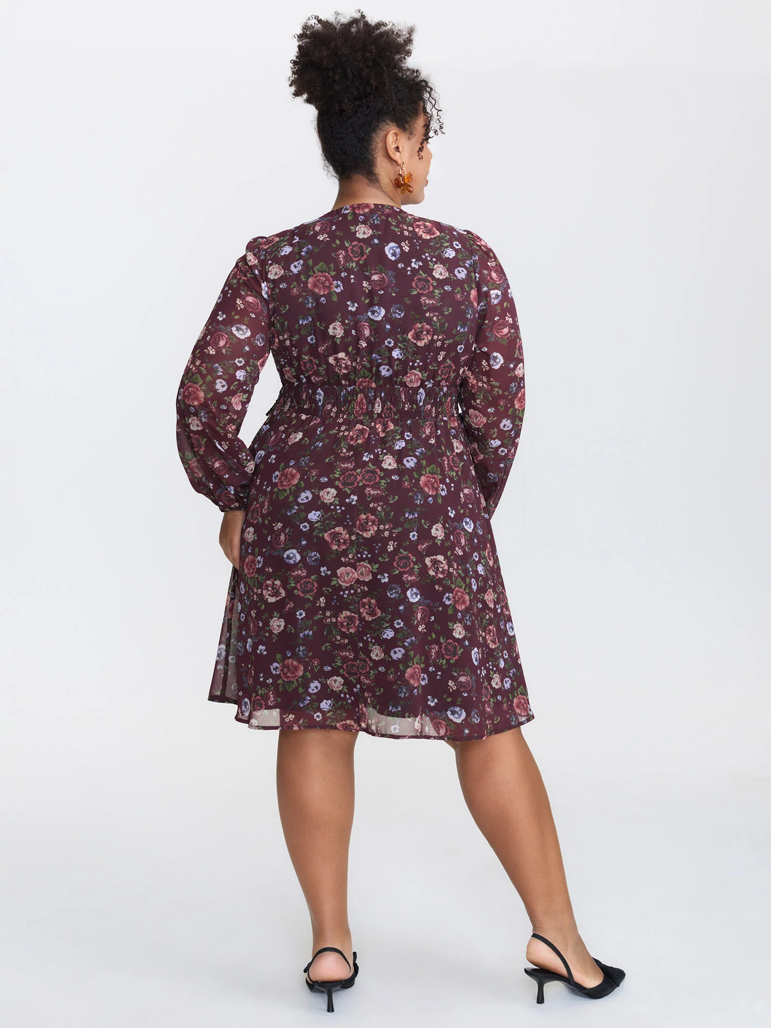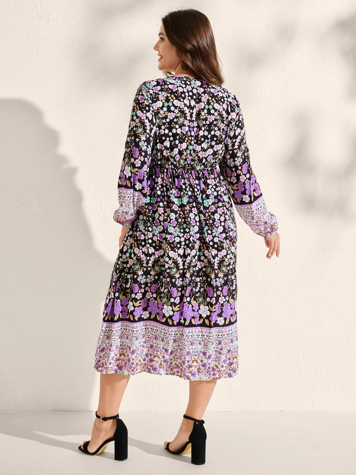 Ruffled Floral Print Stretchy-Waist Midi Dress