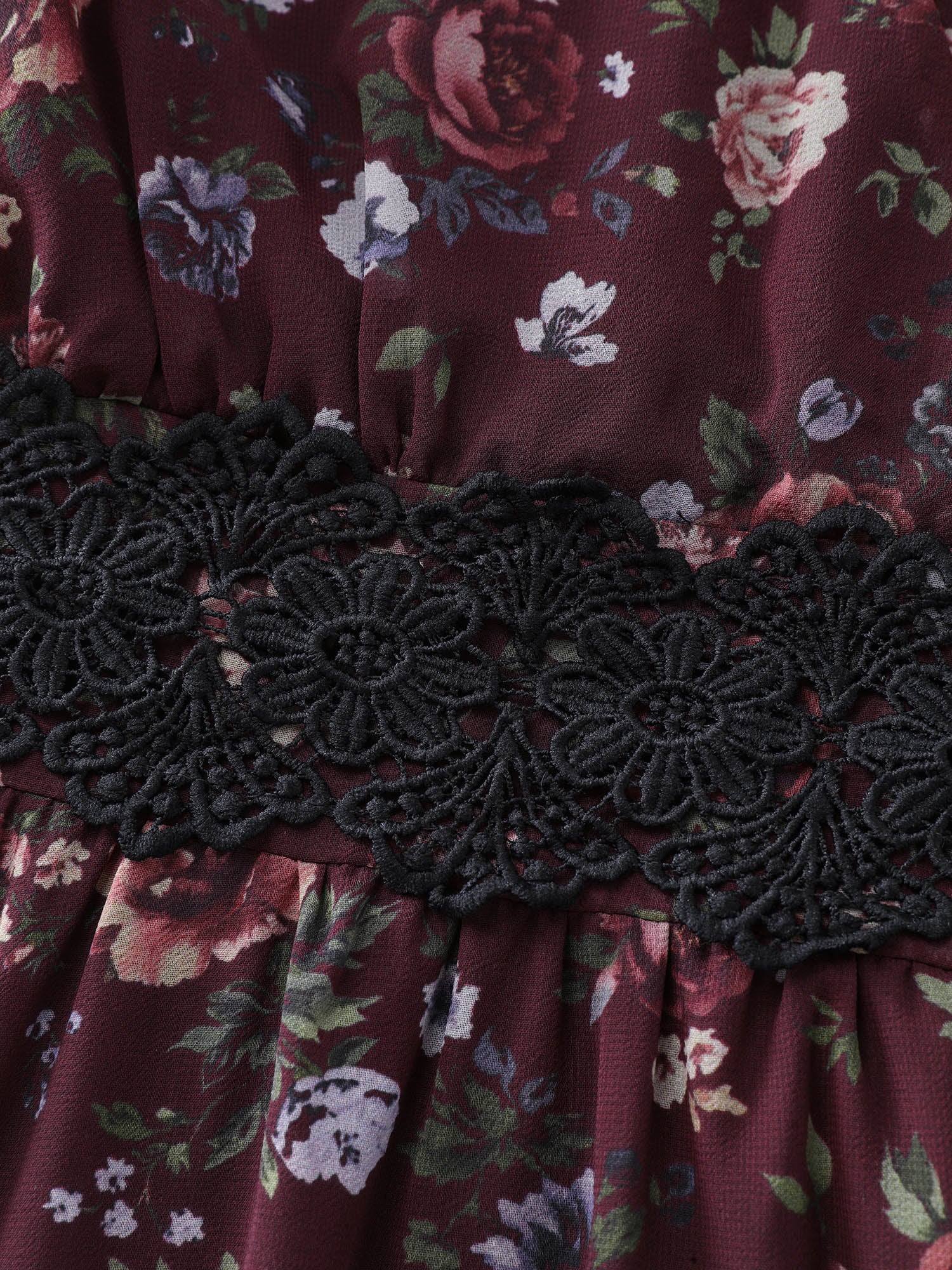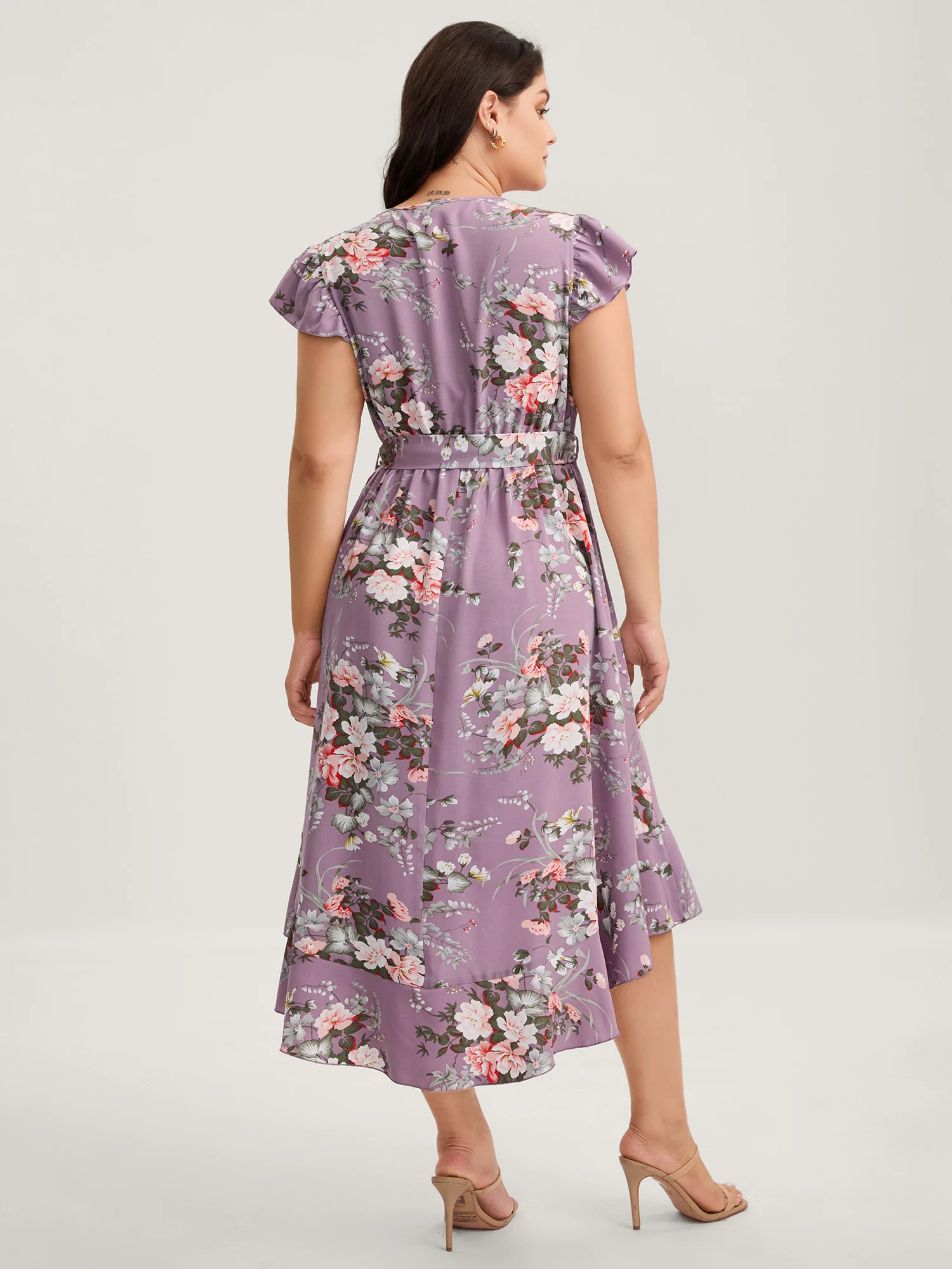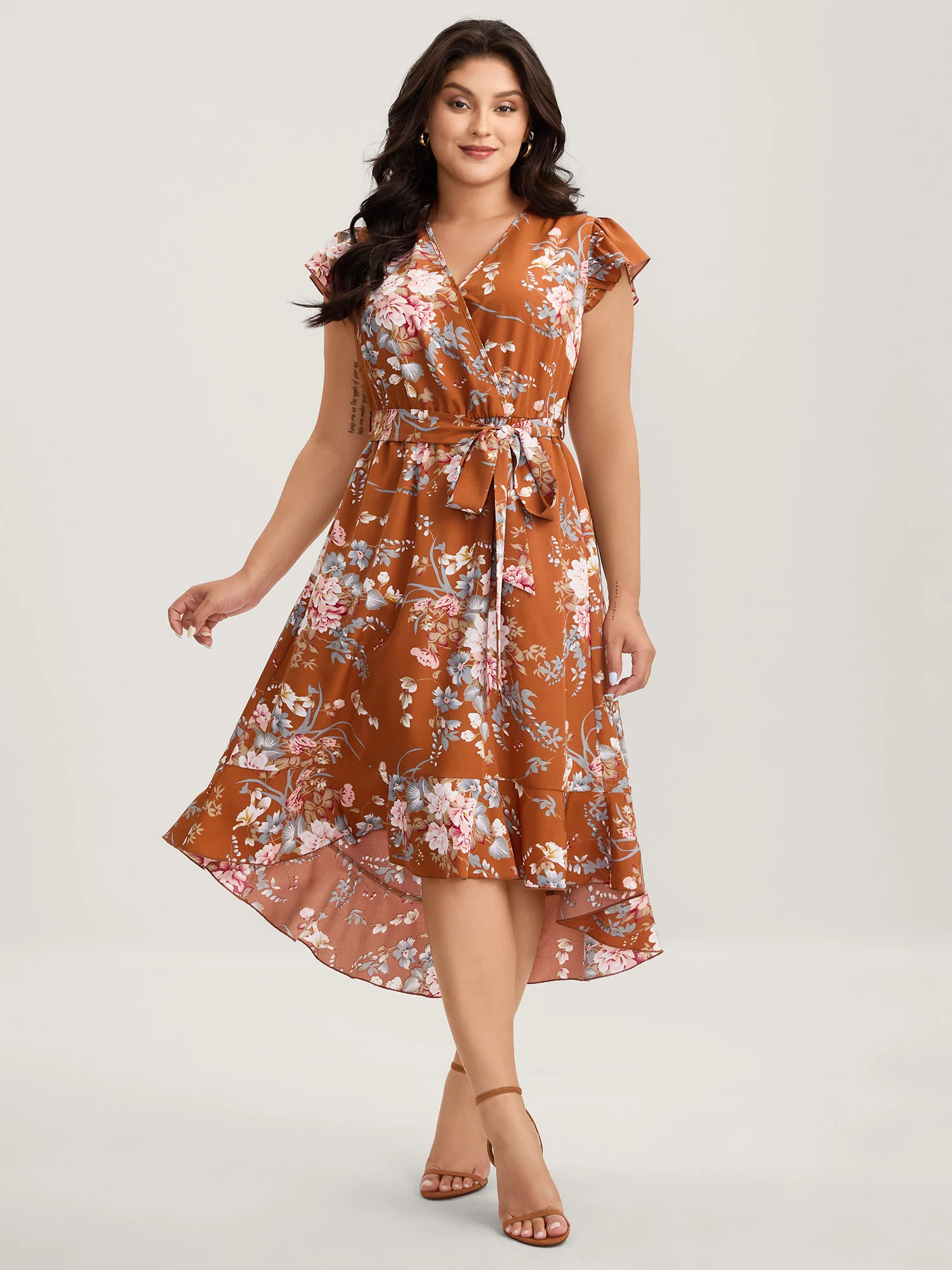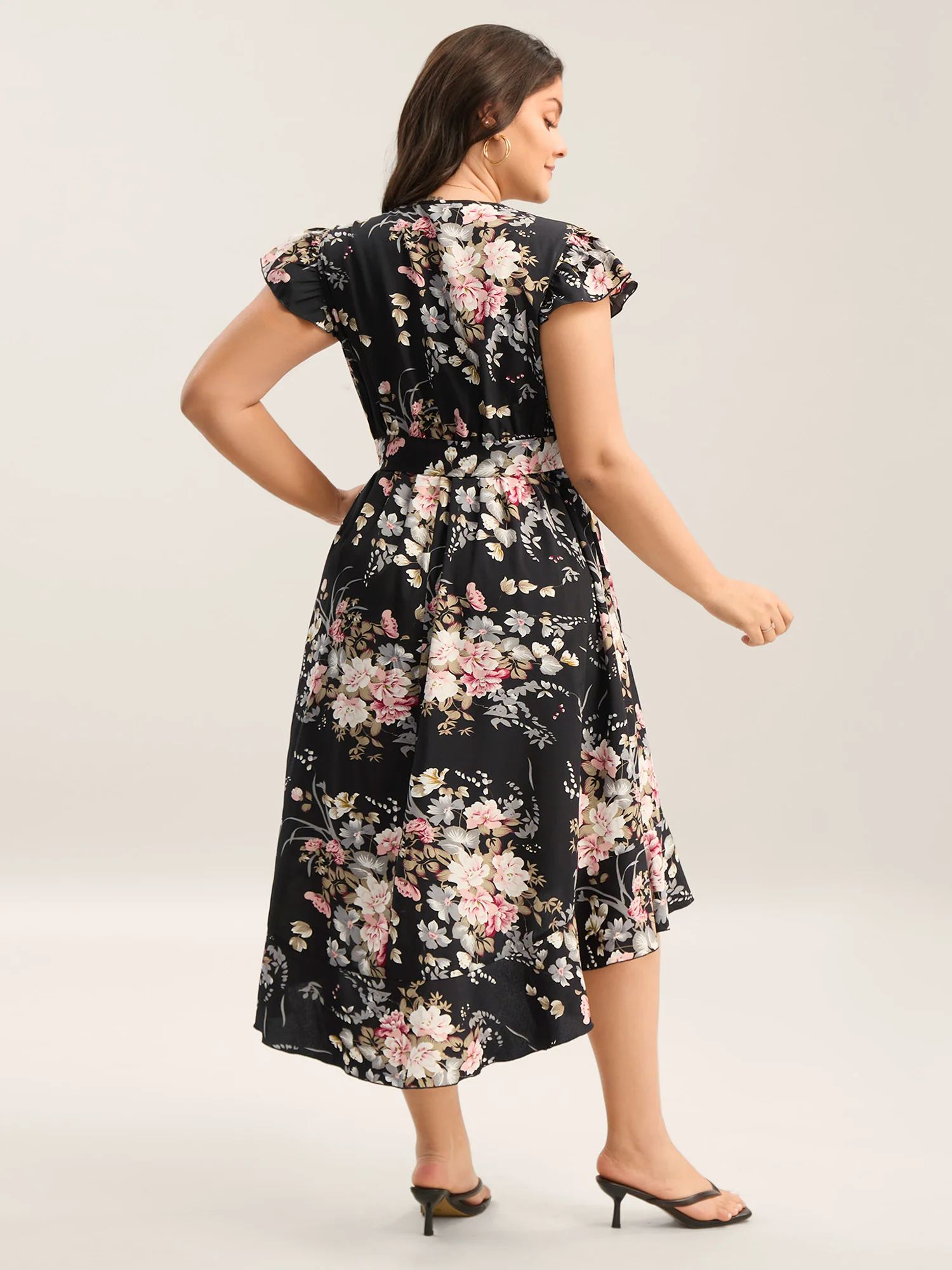 Floral Wrap Patchwork Ruffle Cap Sleeve Dress