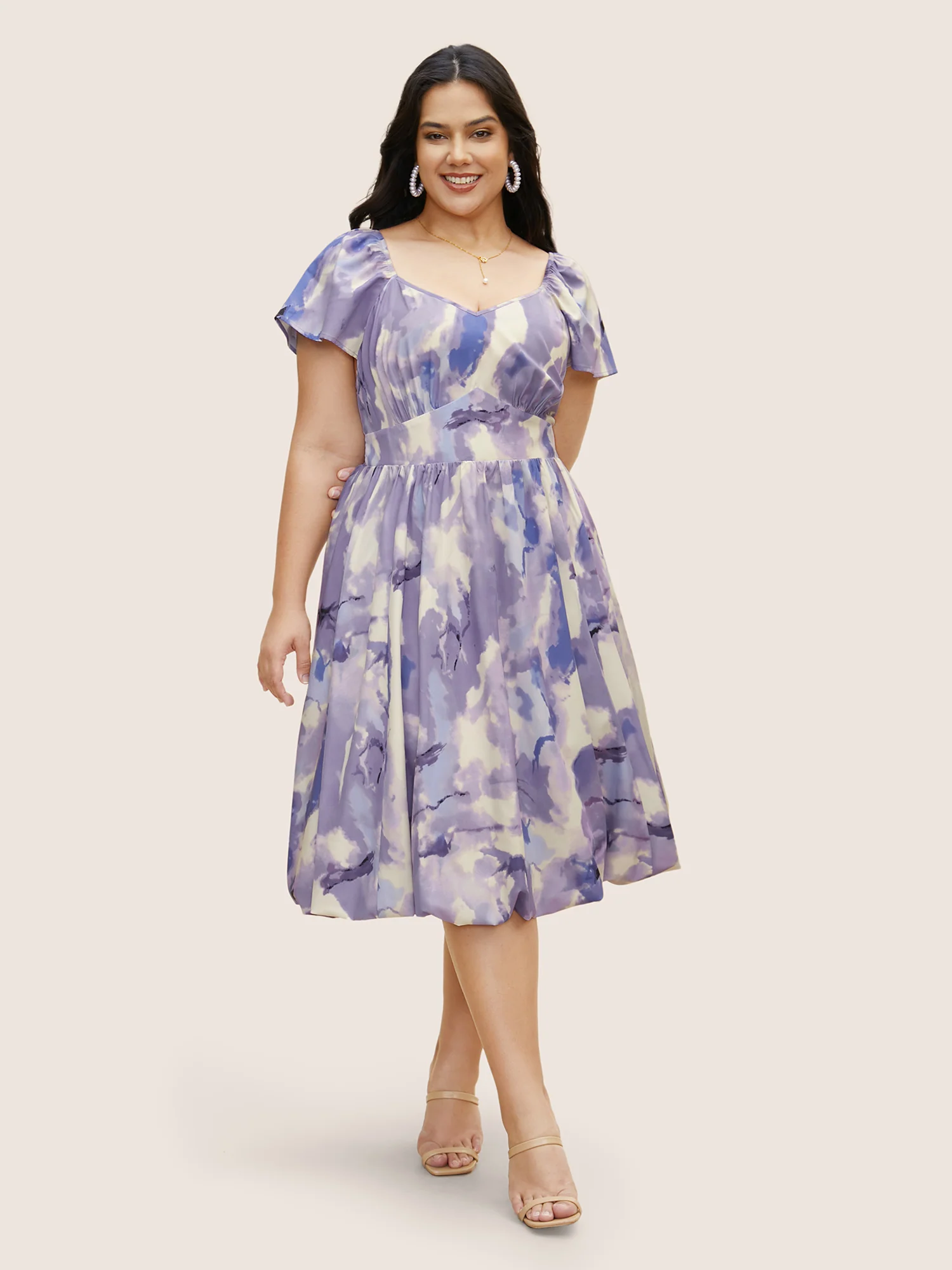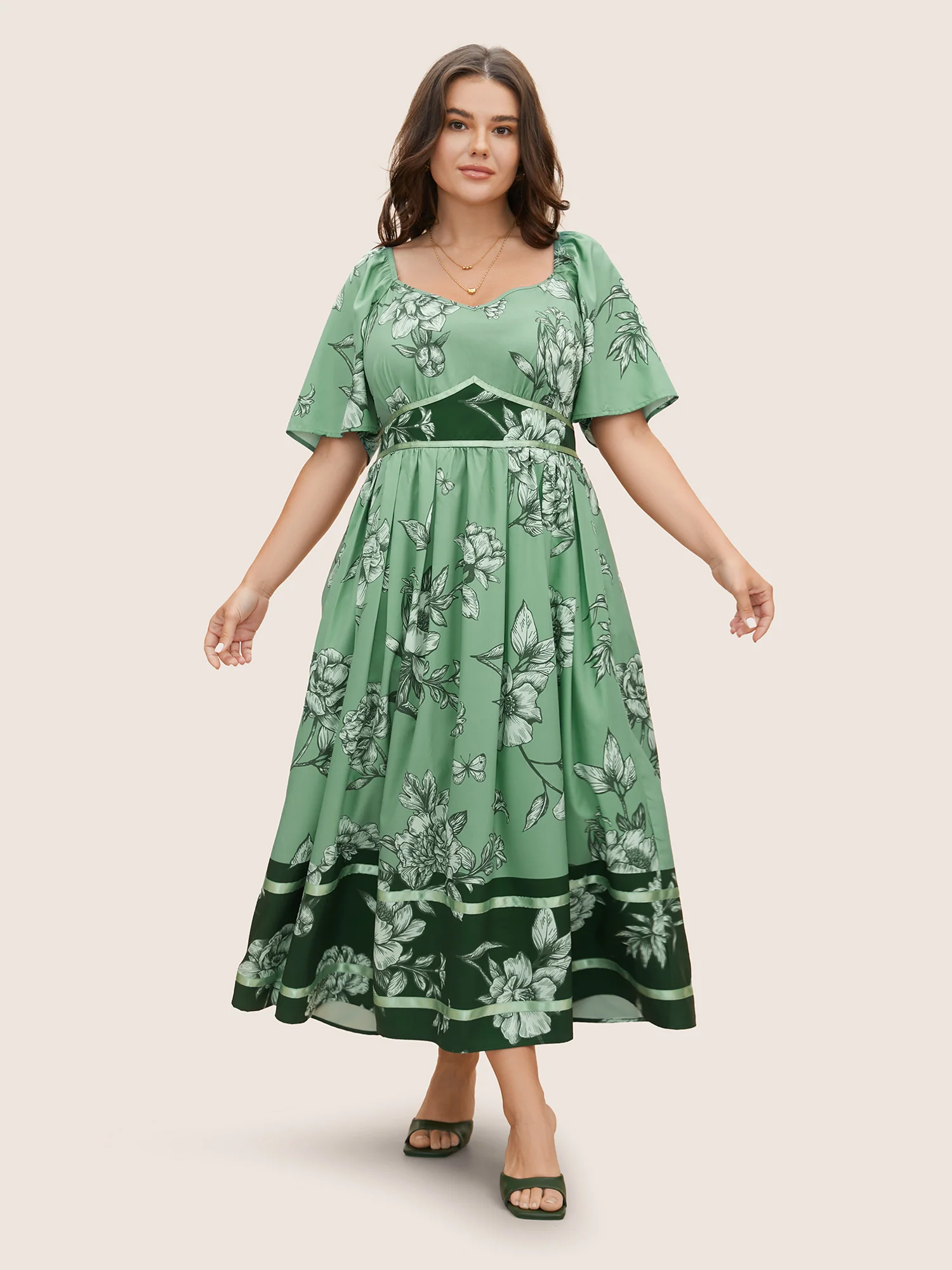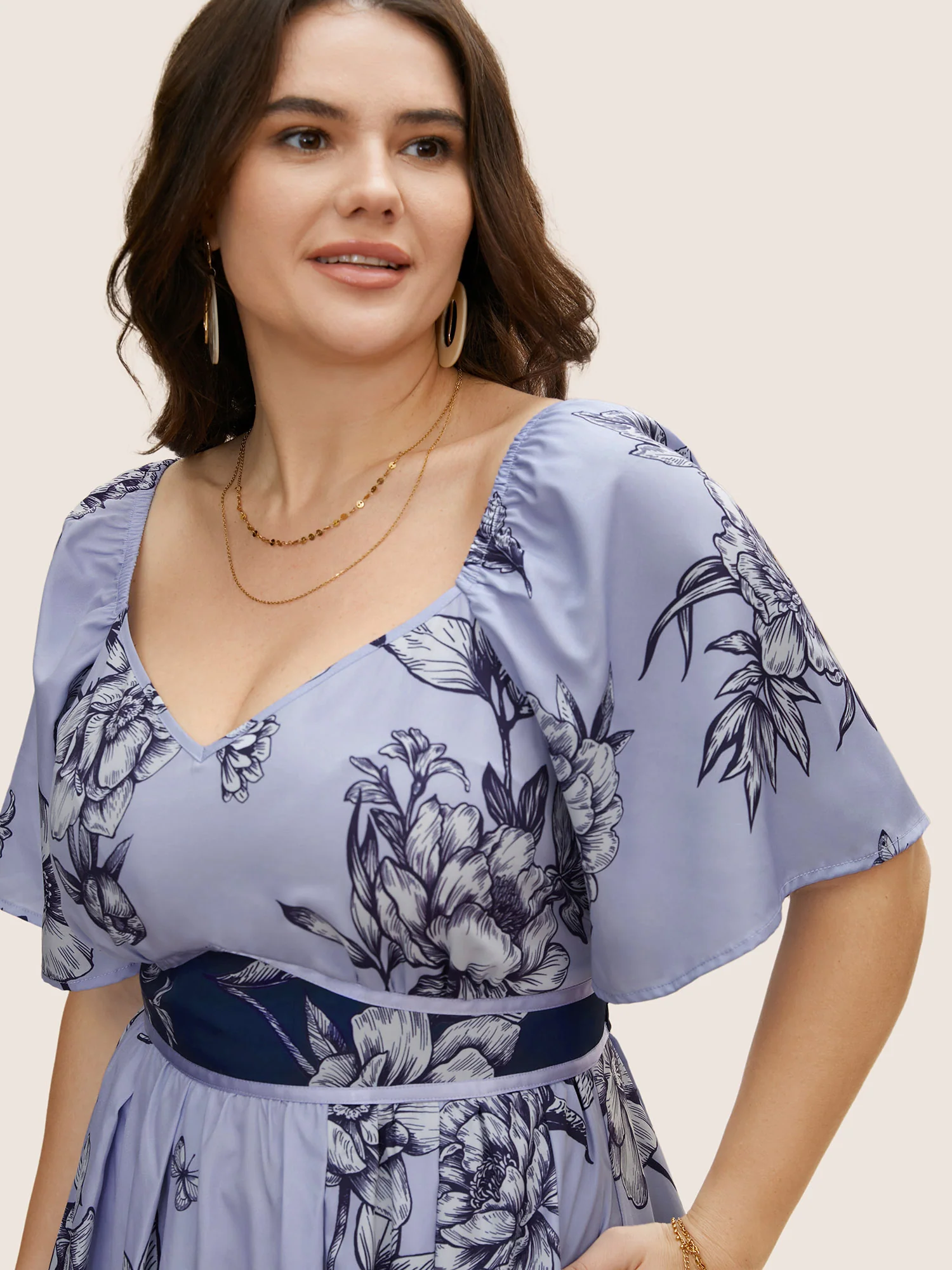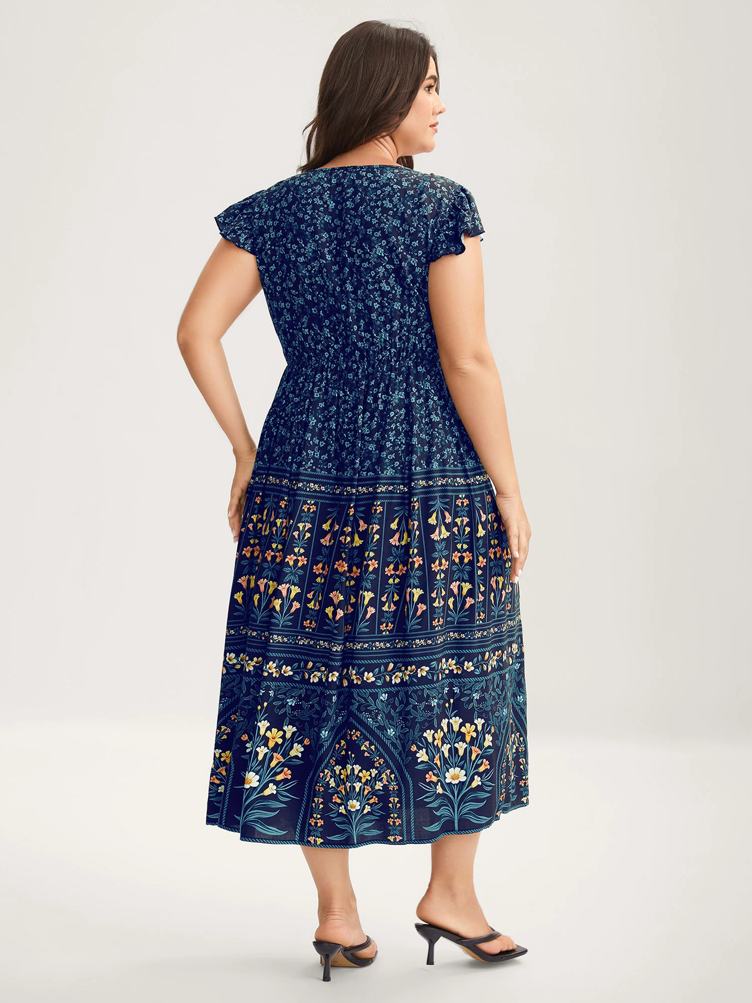 Boho Print Heart Neckline Ruffle Sleeve Maxi Dress
