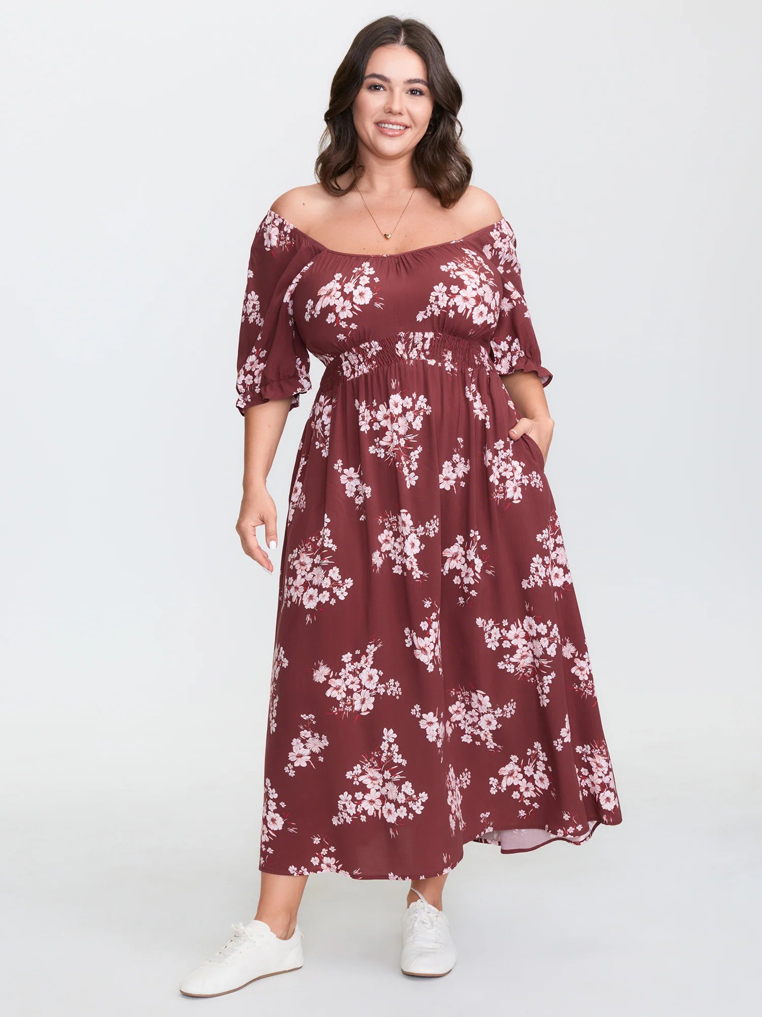 Floral Print Cold-Shoulder Pockets Midi Dress