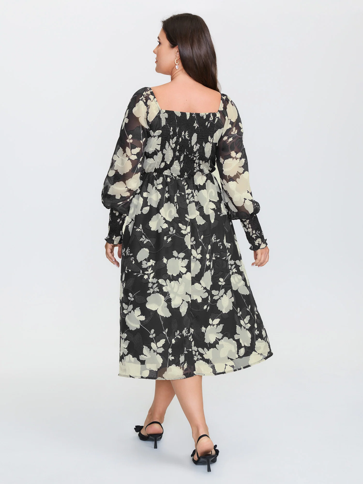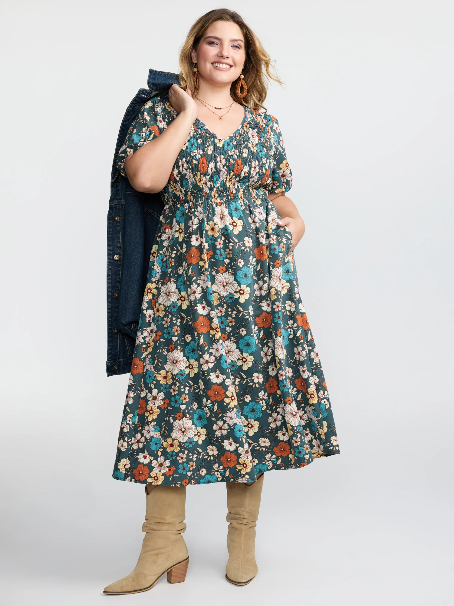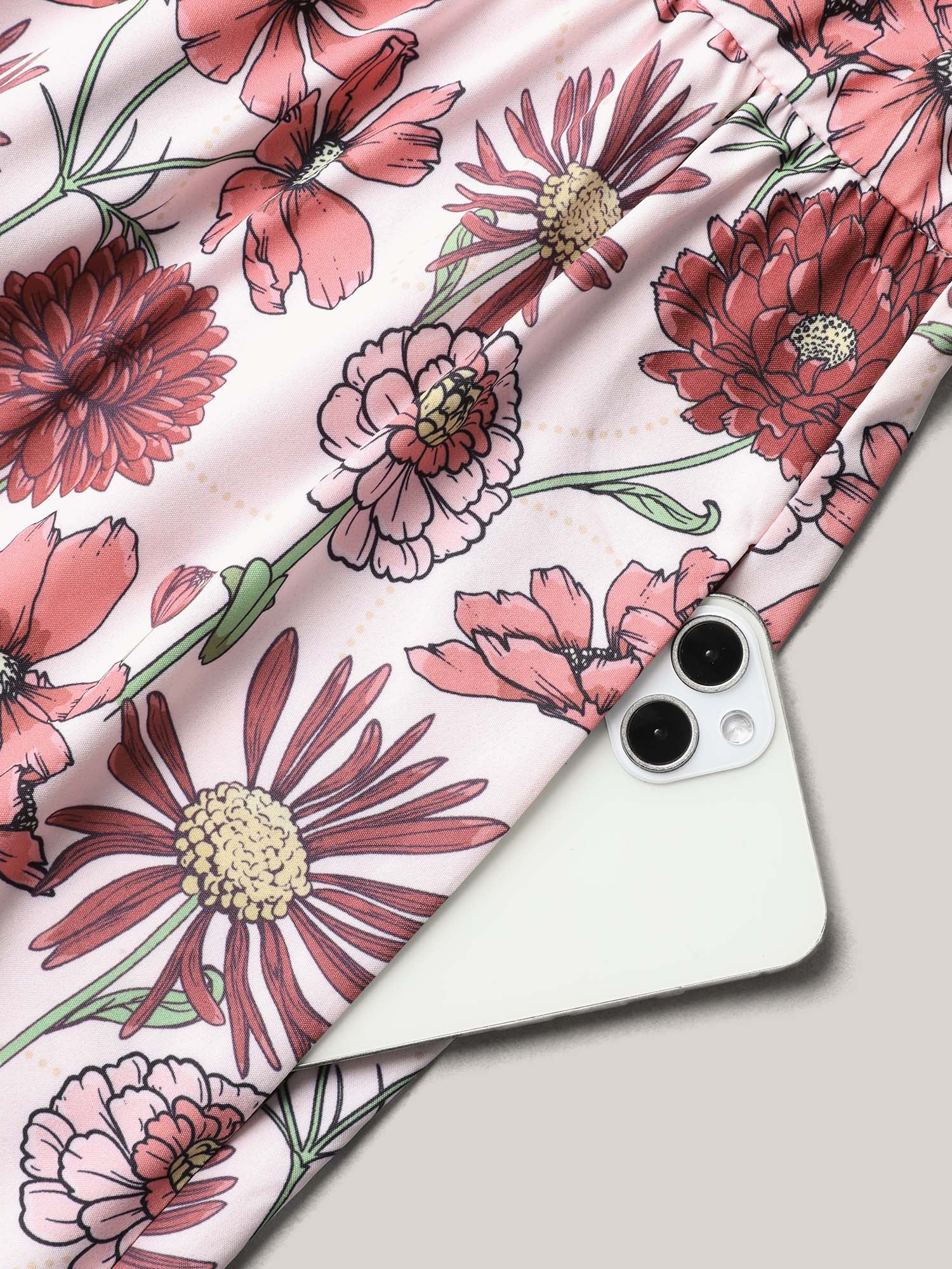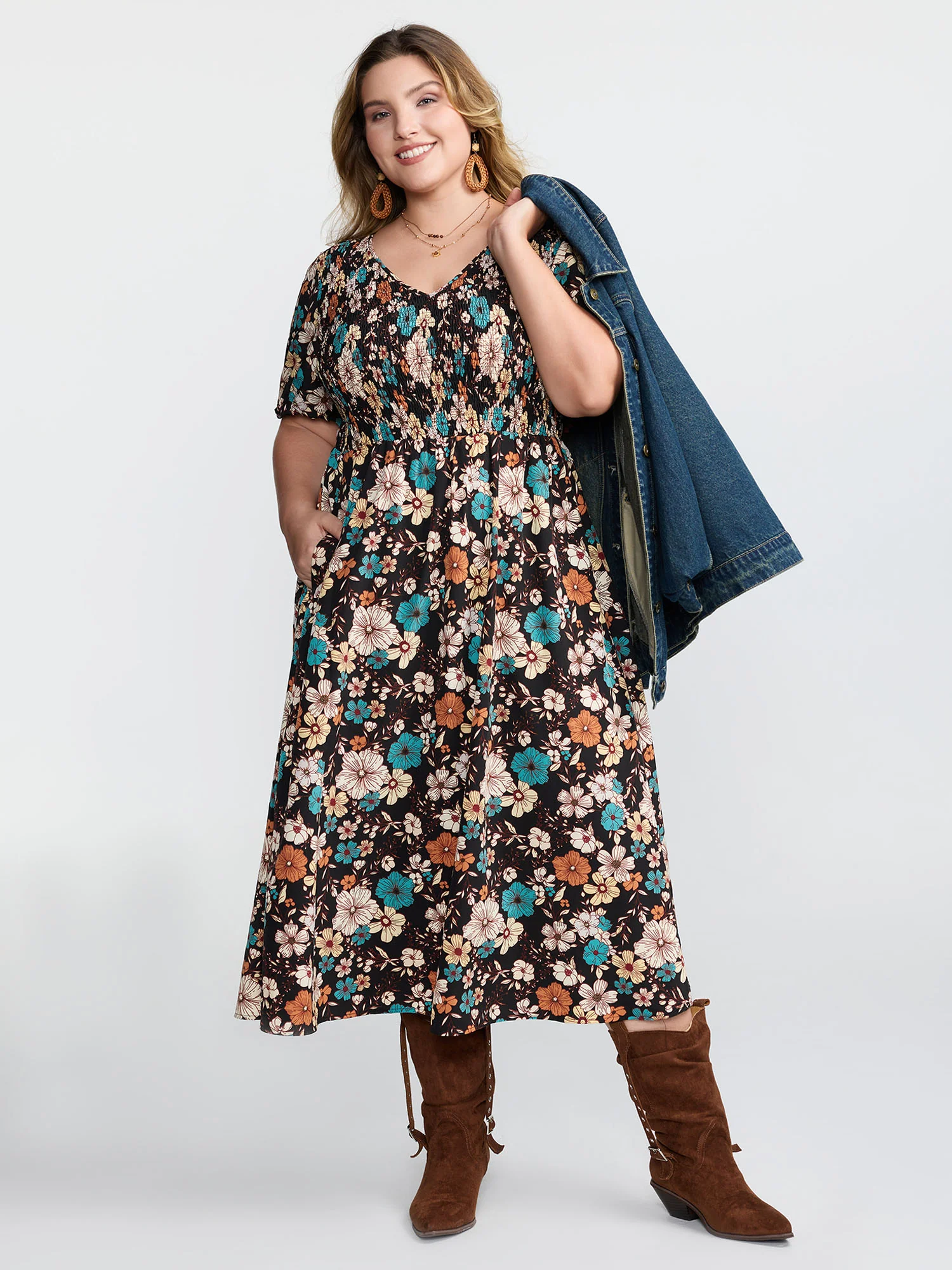 Silhouette Flower Print Shirred Pockets Midi Dress