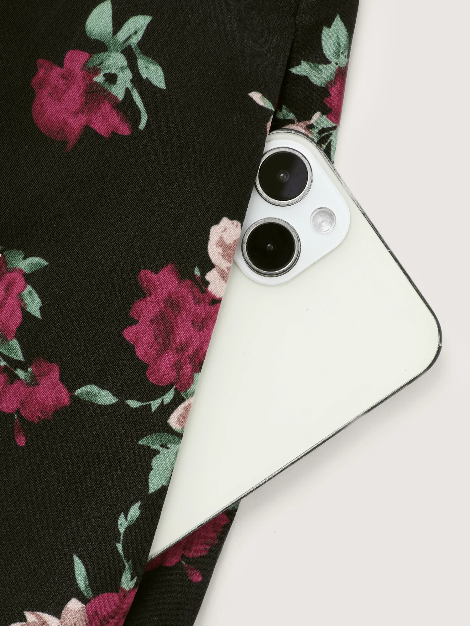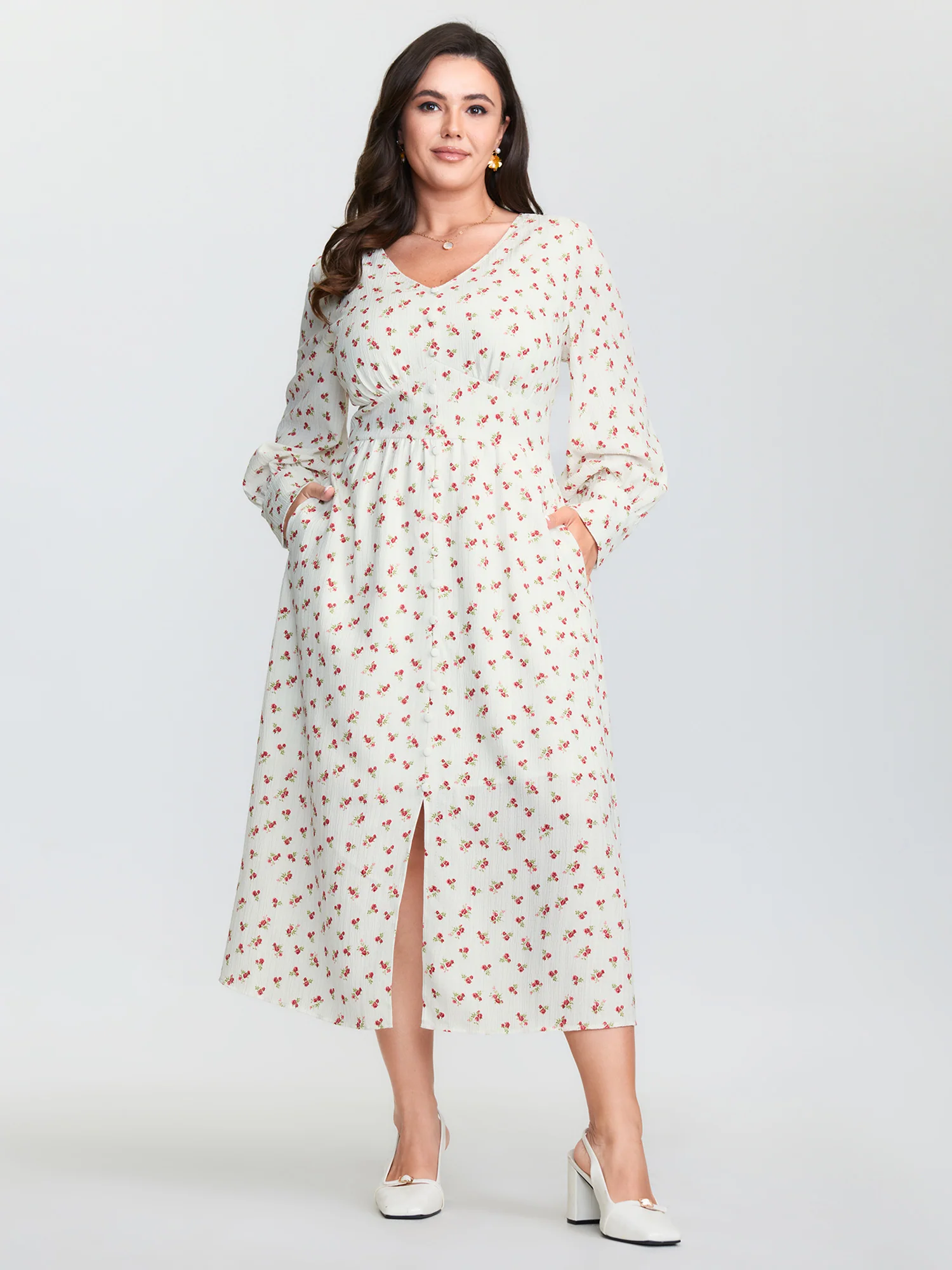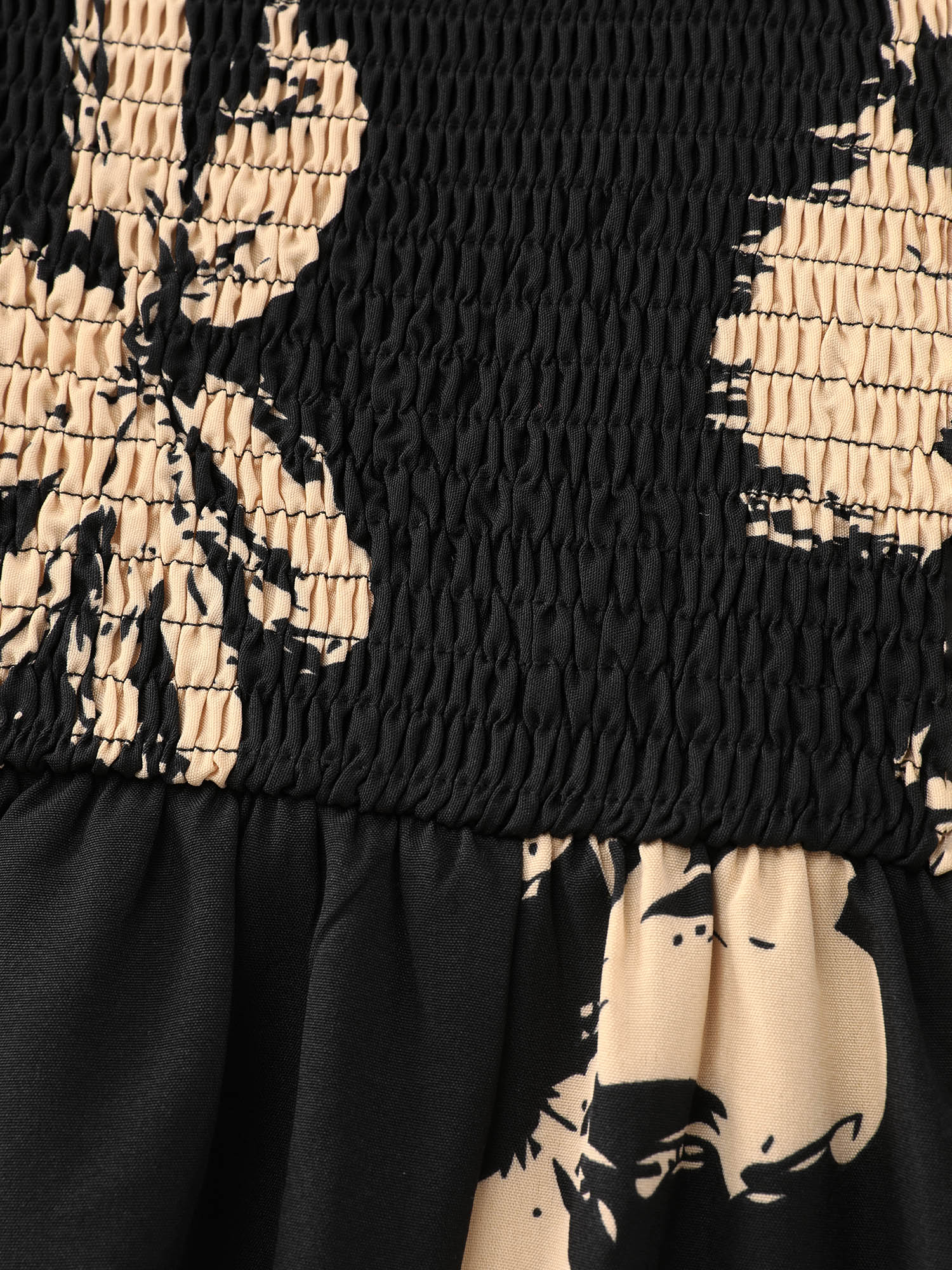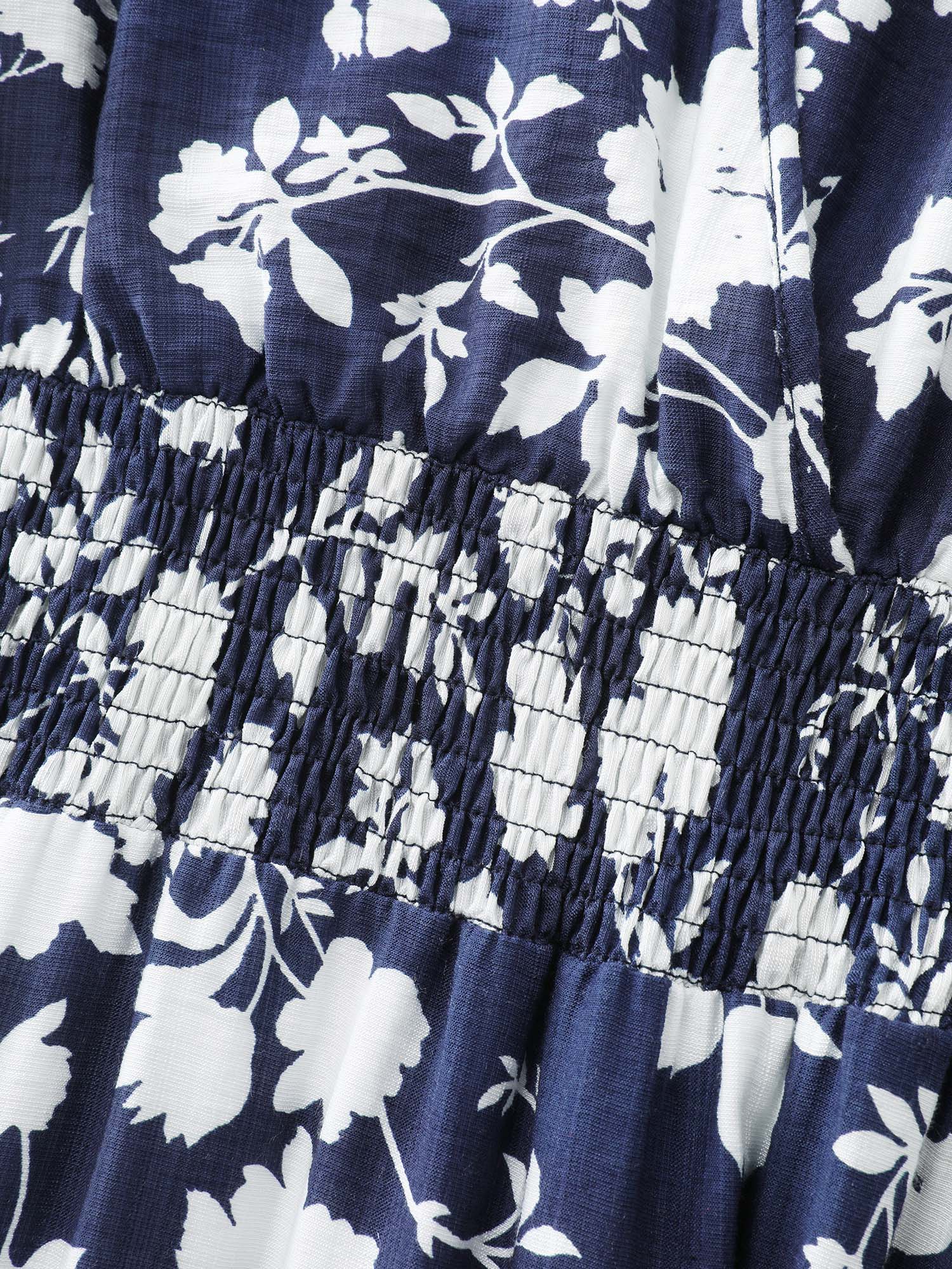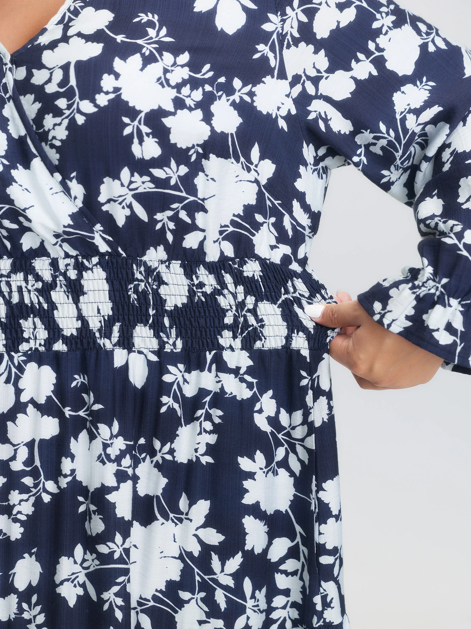 Silhouette Flower Print Shirred Pockets Midi Dress