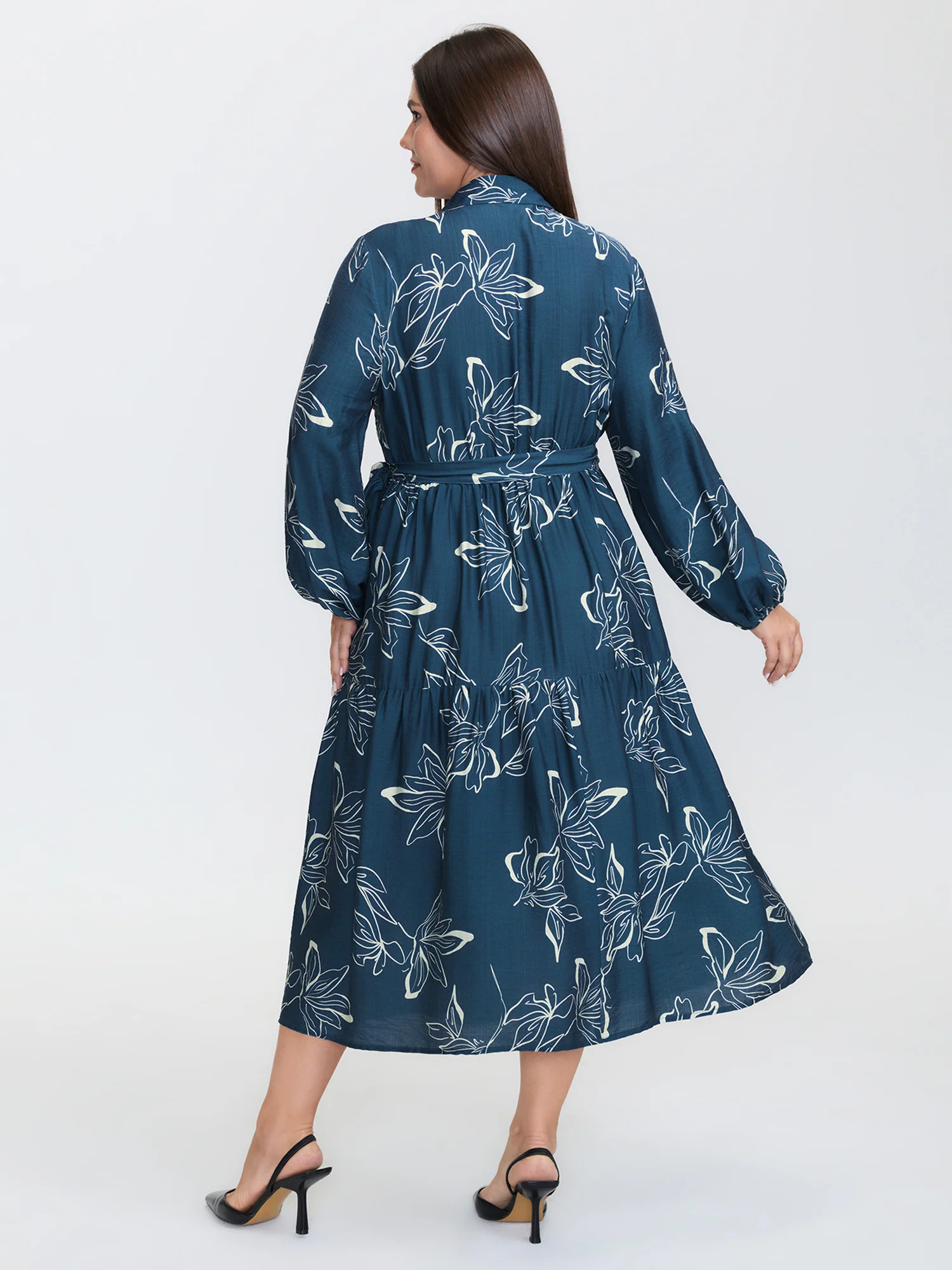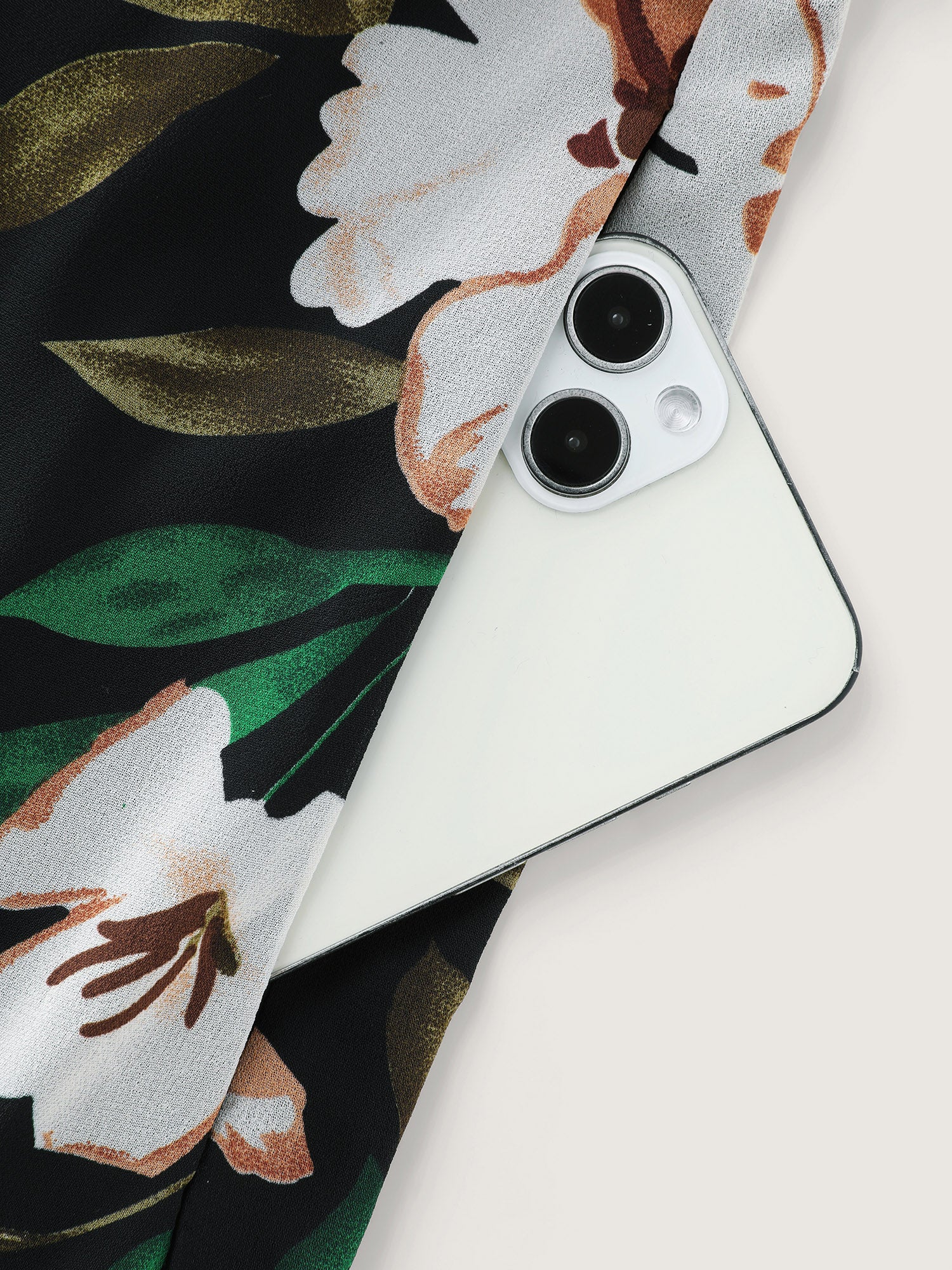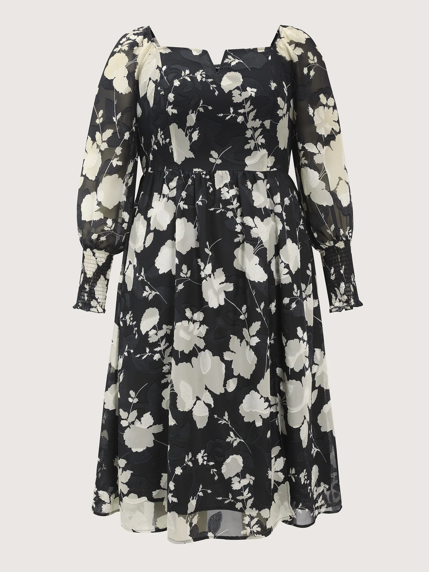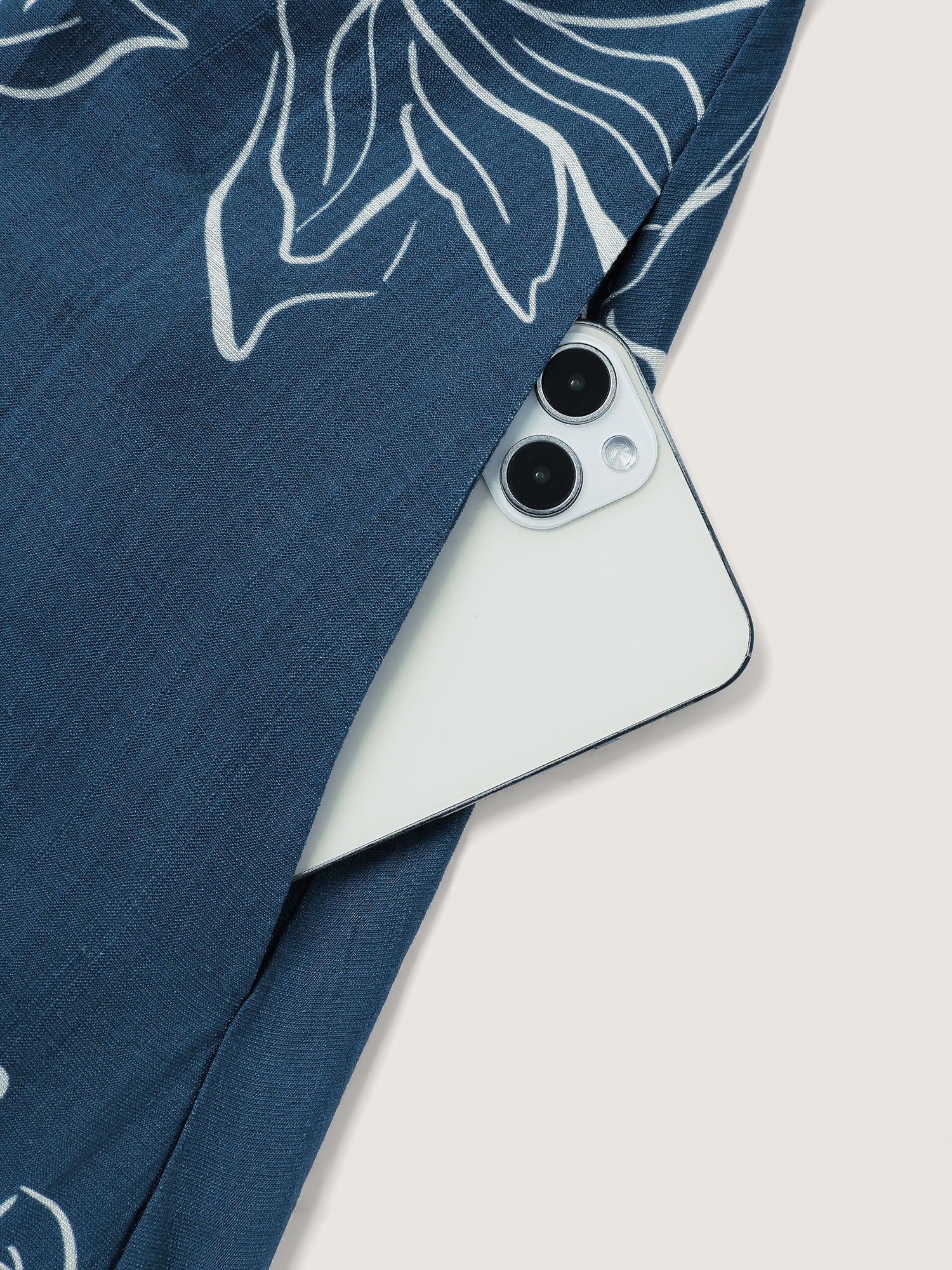 Silhouette Flower Print Shirred Pockets Midi Dress