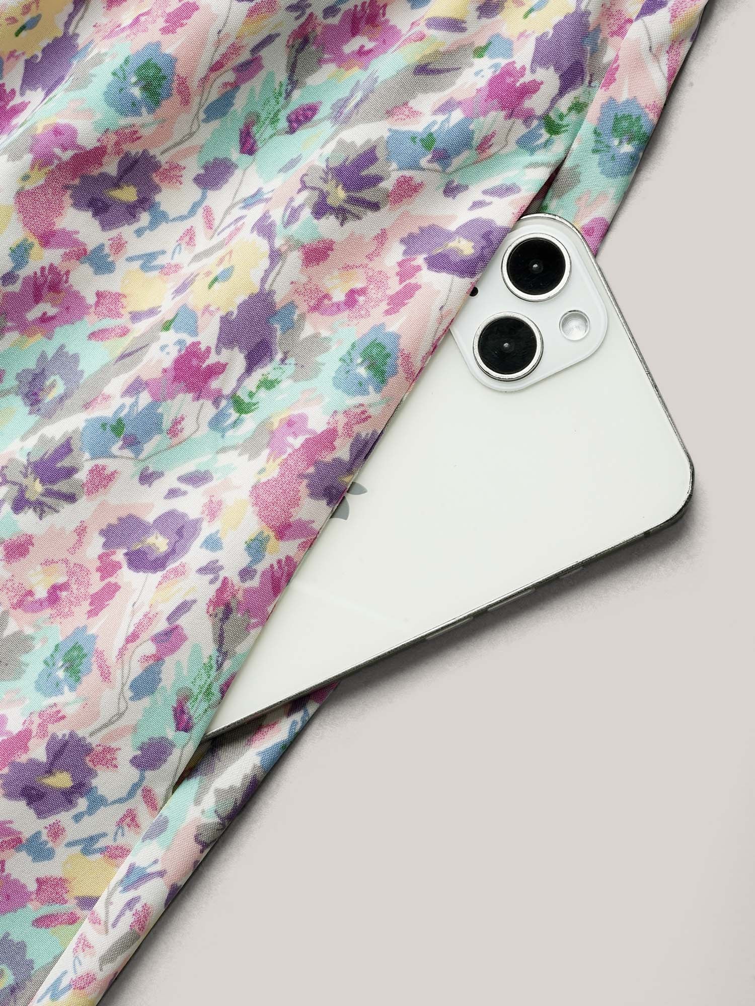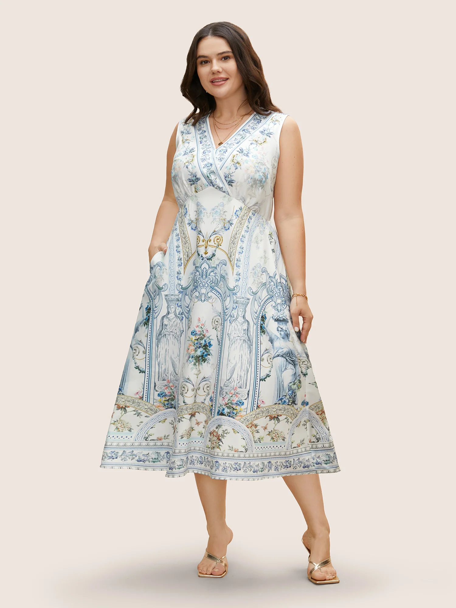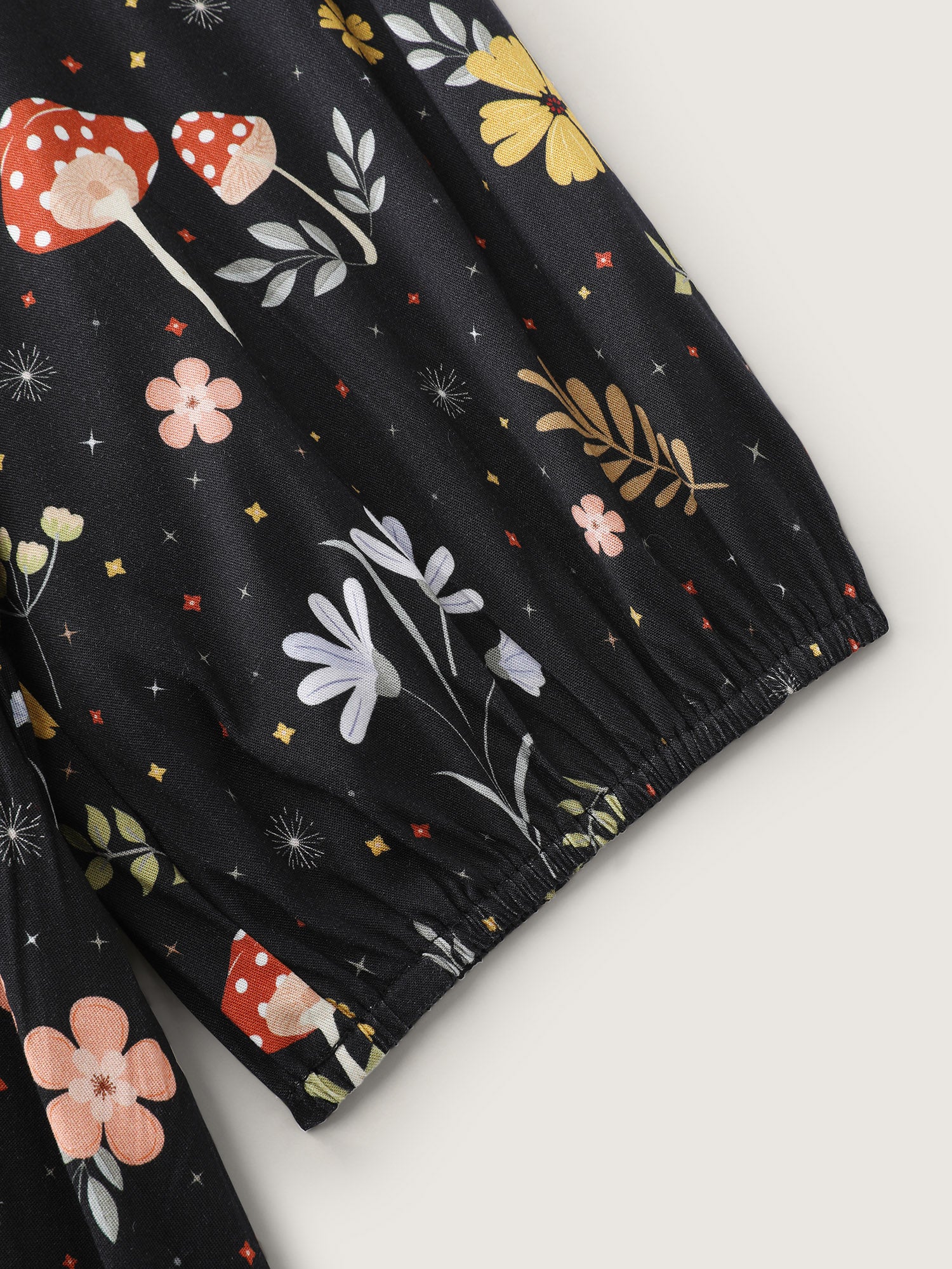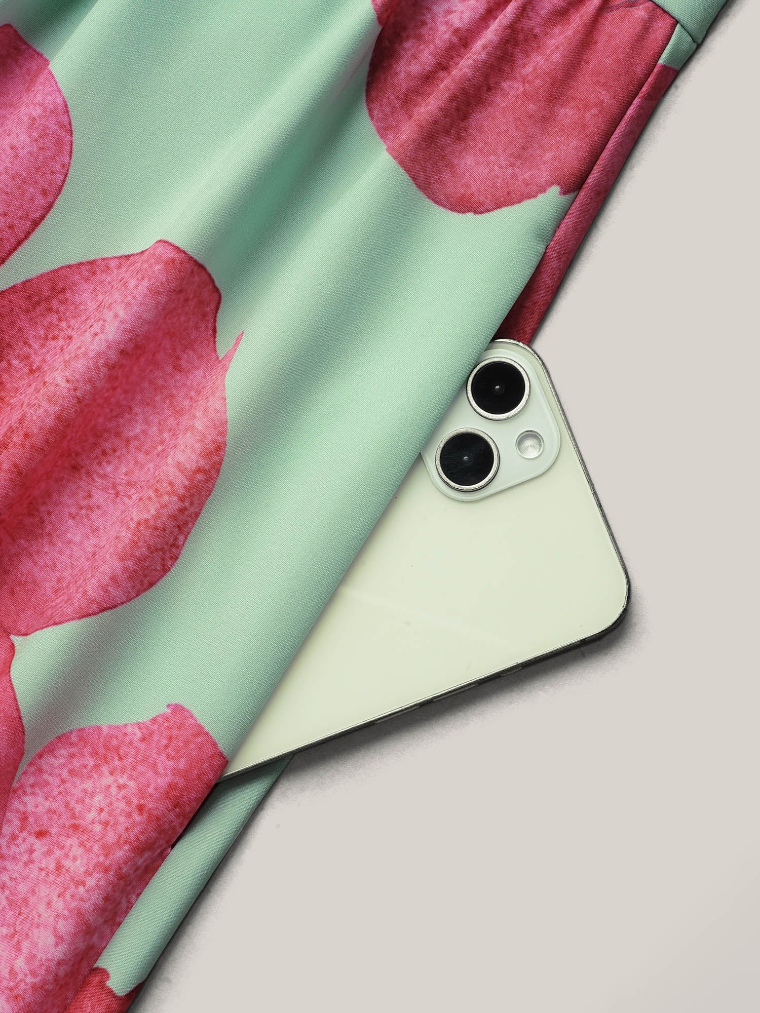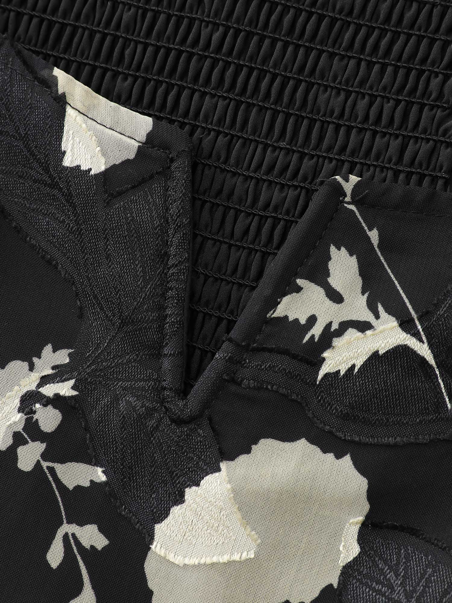 Silhouette Flower Print Shirred Pockets Midi Dress