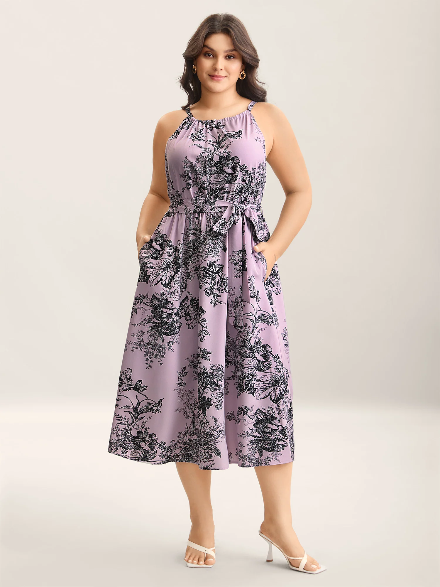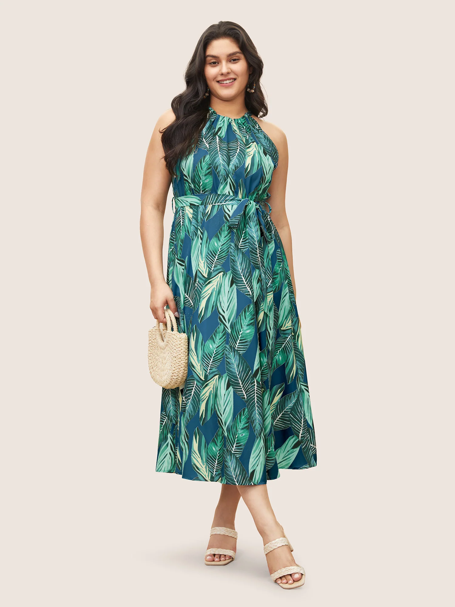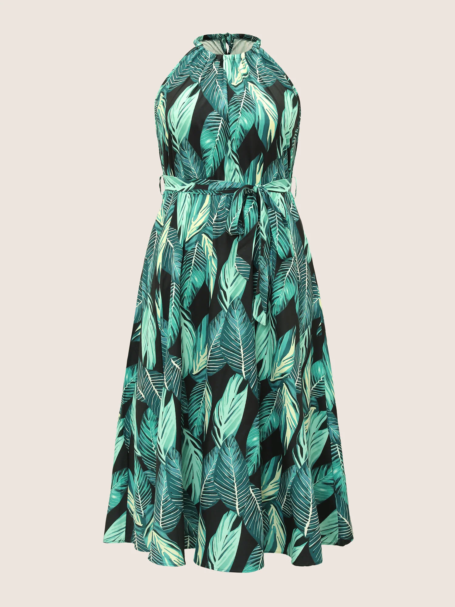 Tropical Print Knotted Pocket Ruffles Belted Halter Dress
