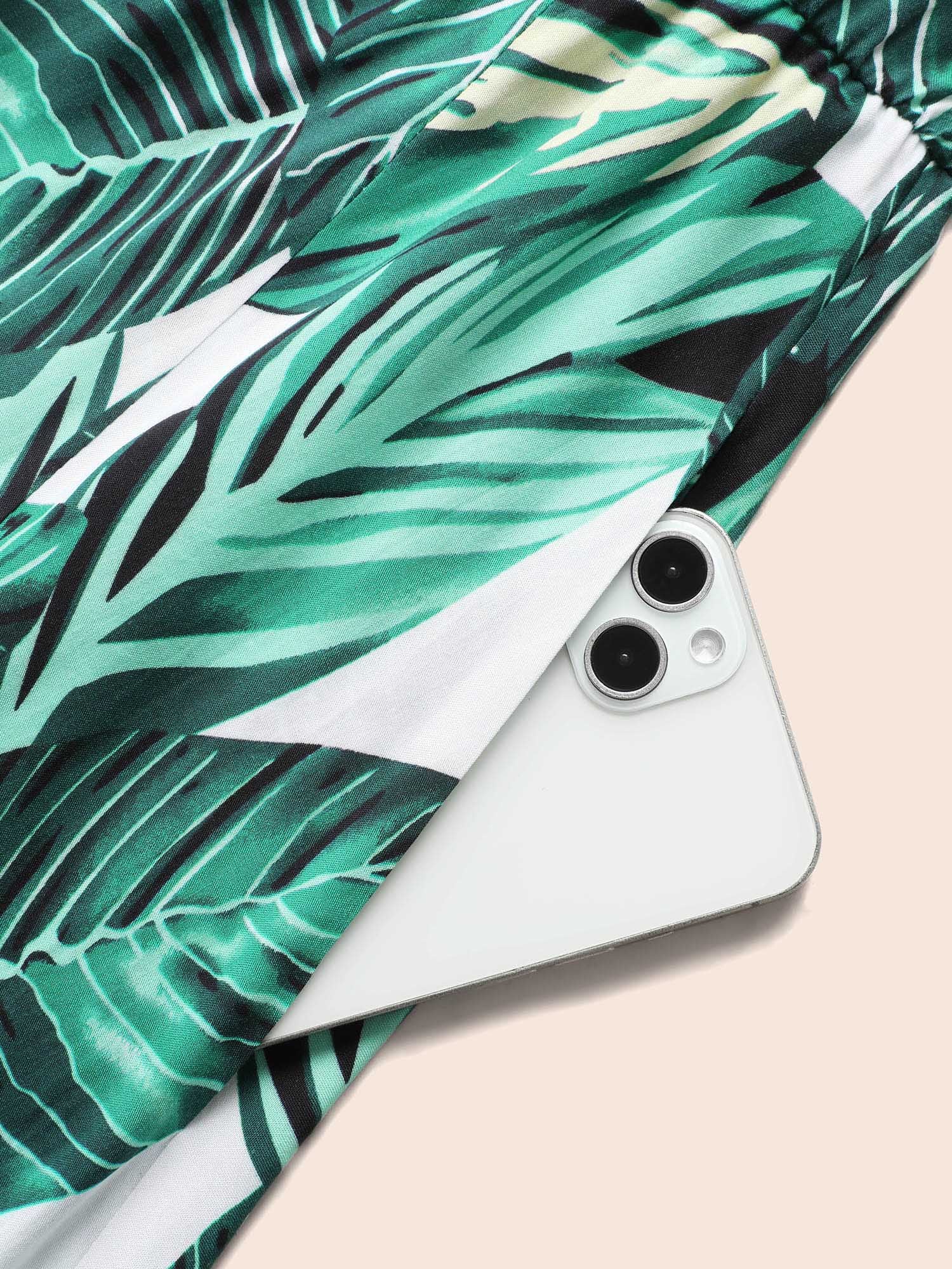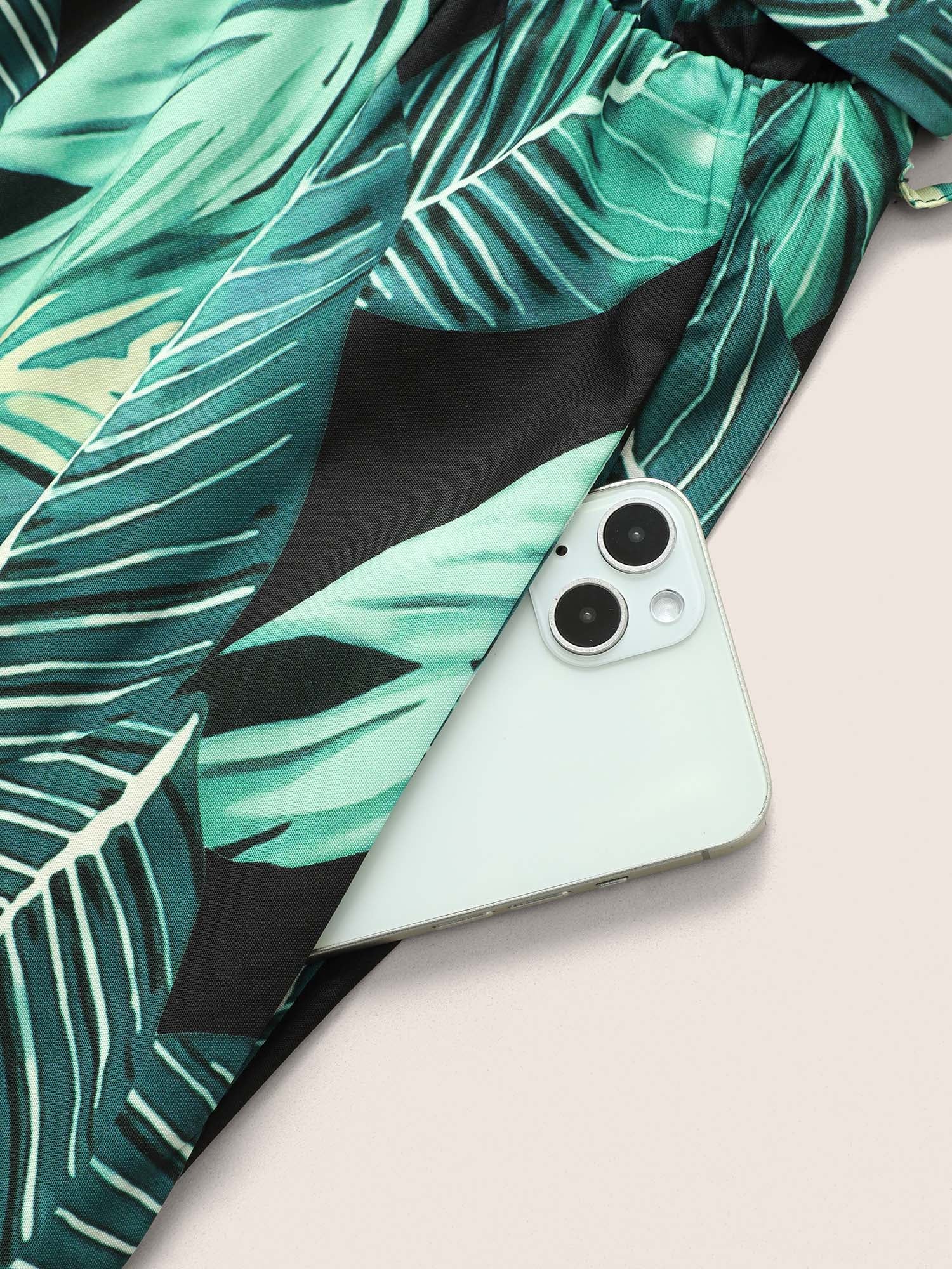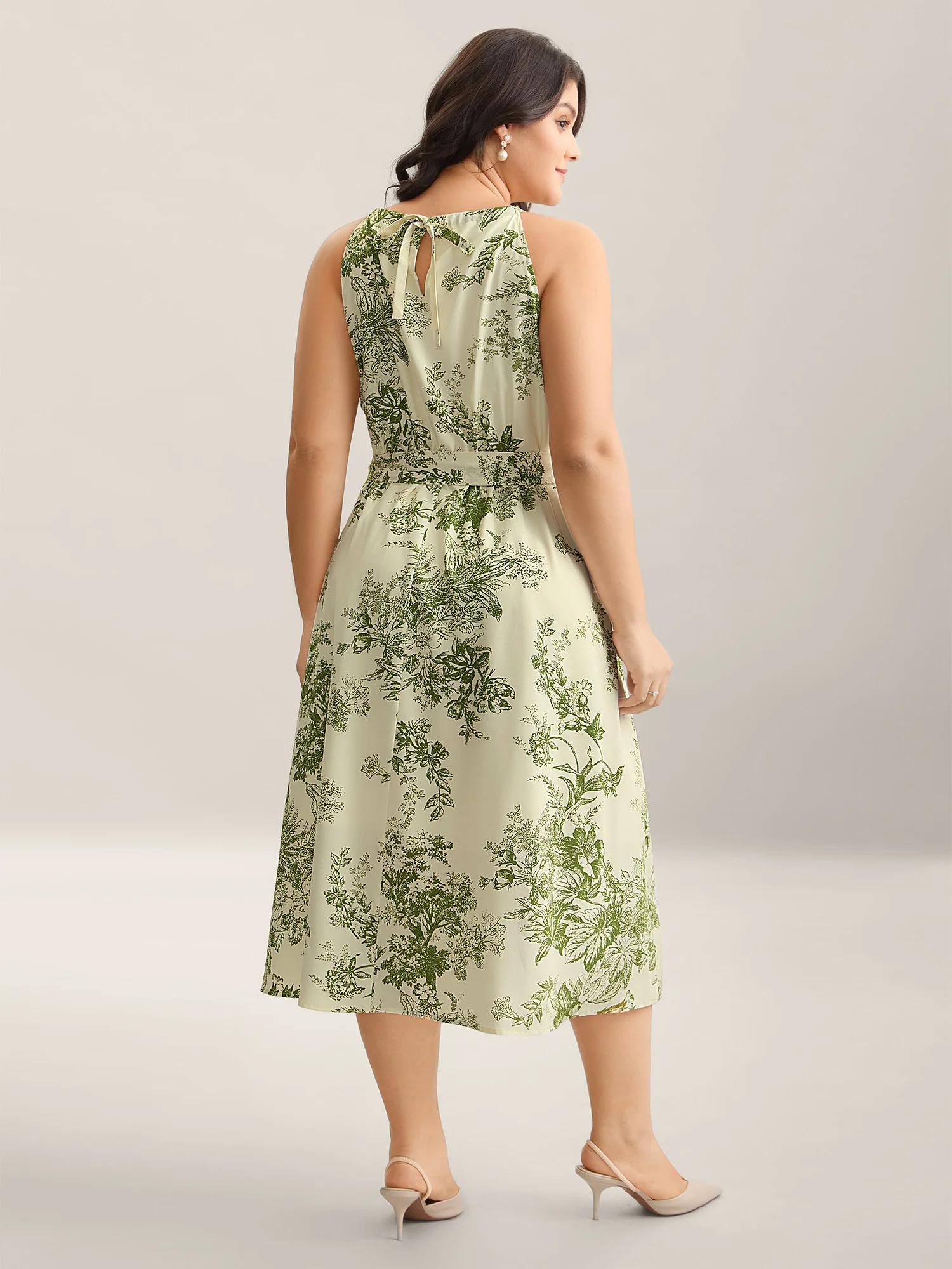 Tropical Print Knotted Pocket Ruffles Belted Halter Dress