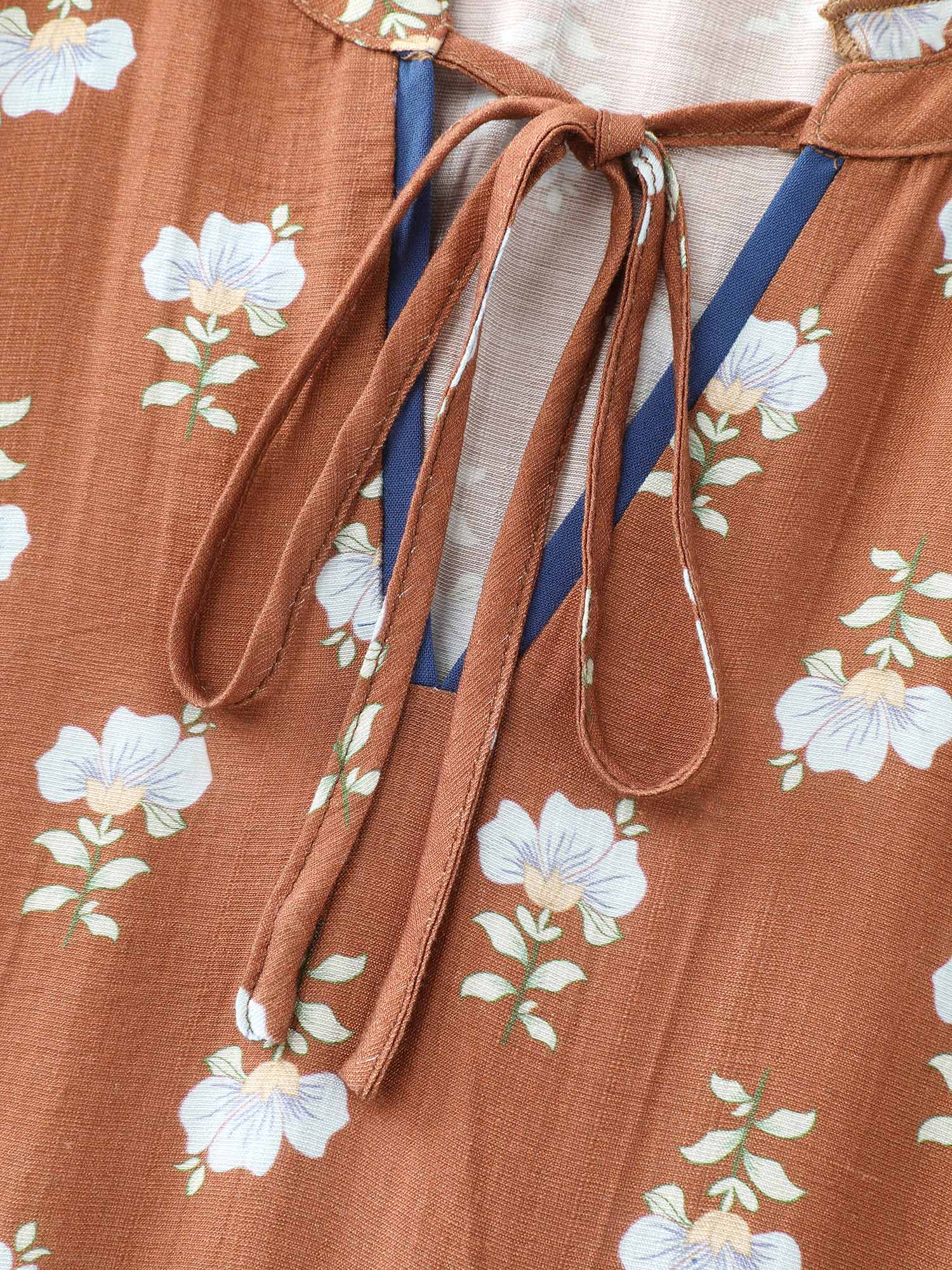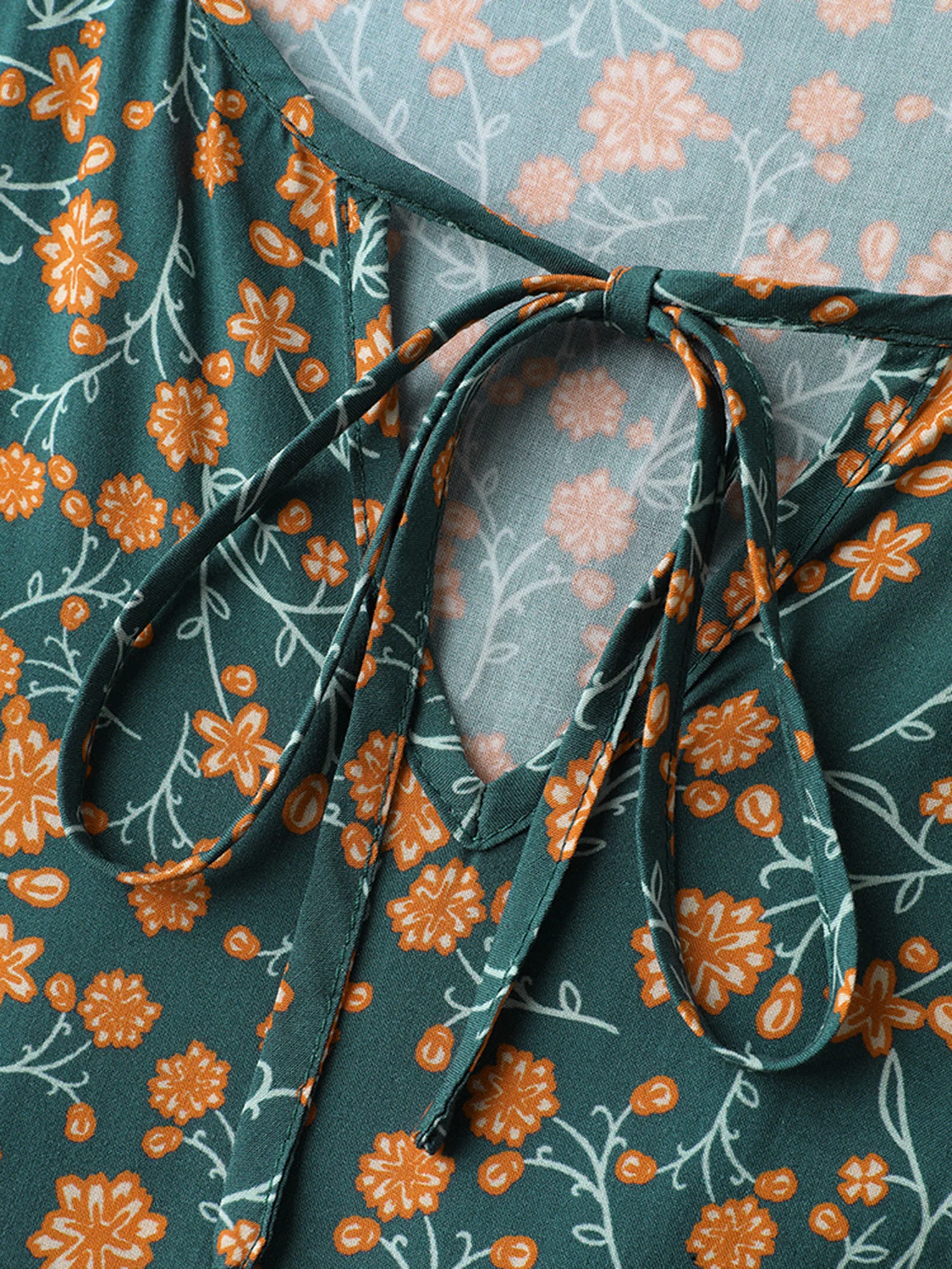Rayon Floral Print Neck Tie Pockets Maxi Dress