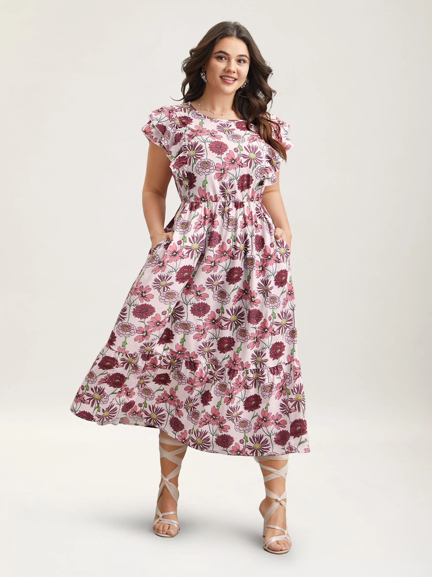 Rayon Stretchy Waist Pockets Flutter Midi Dress